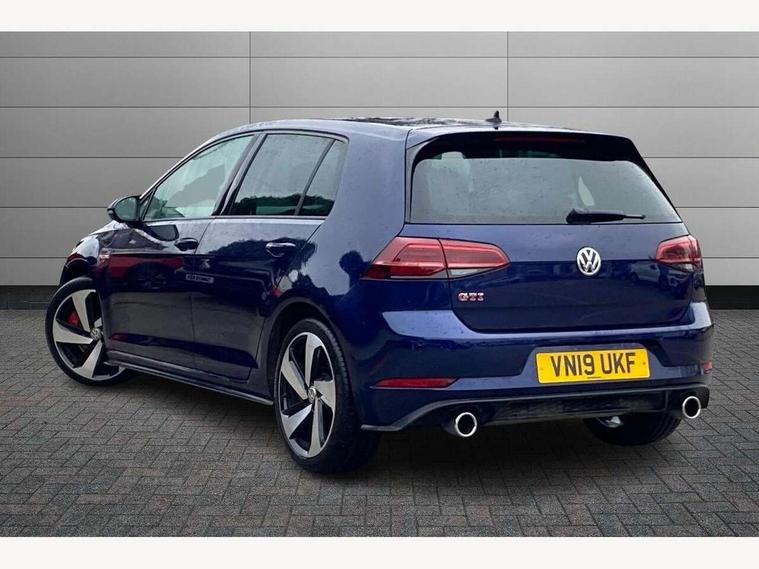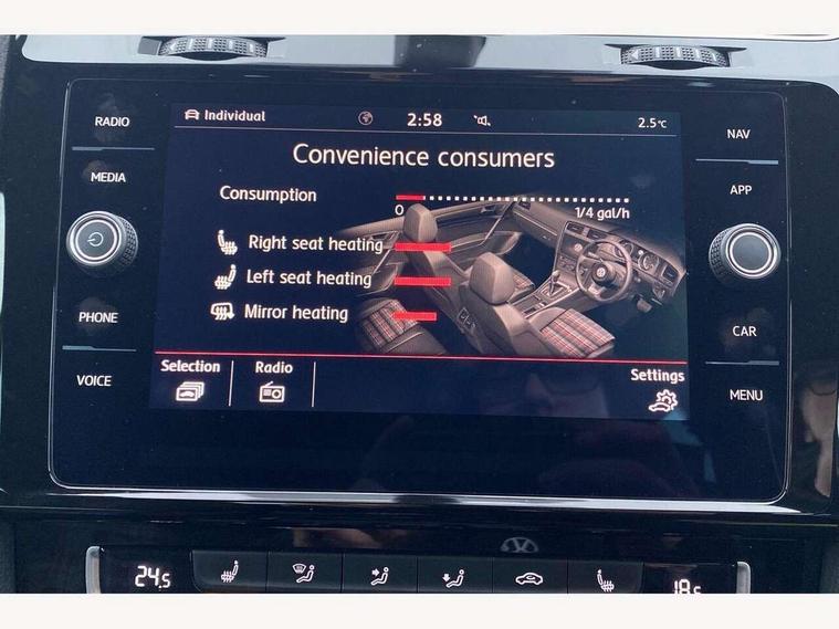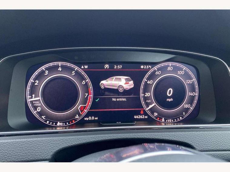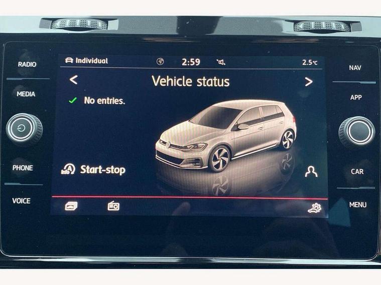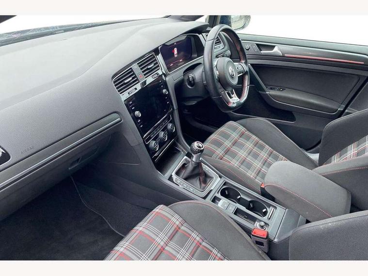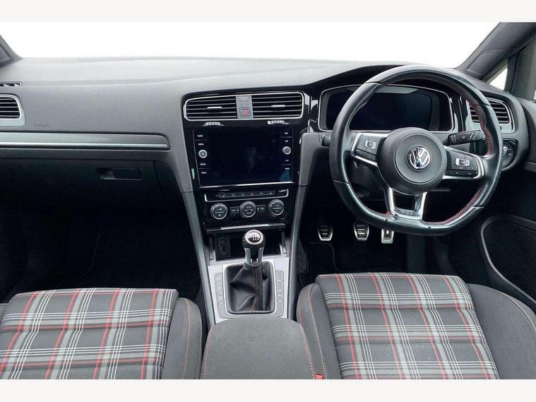 'Lights On' Reminder warning buzzer, ACC - Adaptive cruise control with front assist, forward collision warning, distance monitoring, city emergency brake and speed limiter, Bluetooth telephone and audio connection for compatible devices, Brake pad wear indicator warning light, Driver alert system, Driver profile selection, Driving Mode Selection with four preset modes - Eco, normal, sport or individual modes, Instrument cluster in white, Lane assist with dynamic light assist and traffic sign recognition, Multifunction computer with visual gear change recommendation for fuel consumption, Power assisted speed sensitive electro-mechanical steering, Push tank flap, Rear view camera, Speedo, rev counter, electronic odometer, trip, service interval display, exterior temperature and fuel gauge, Stop/start system, Warning buzzer and light for front seatbelts unfastened, Battery regeneration during braking, Limited slip differential, Lowered sports suspension, XDS electronic differential lock, Composition media system, DAB Digital radio receiver, MP3/WMA compatability, Multi device interface (MDI) with USB connection, Premium USB cable in choice of either Apple or Android smartphone compatibility, SD card slot, SMS Functionality, USB and SD card connectivity, Volkswagen media control, 3D-LED tinted rear light clusters with indicator sweep function, Black rear diffuser, Body colour door handles, Body colour door mirrors with integrated indicators, Body colour rear roof spoiler, Body colour sports bumpers, Dusk sensor + automatic driving lights, Electric front windows, Electric rear windows, Electrically adjustable and heated door mirrors, Fully galvanised body, GTI logo in red on front and back, GTI logo lettering on front wings on right and left, Heated rear windscreen, High level 3rd brake light incorporating LED Technology, Honeycomb radiator grille - black, LED daytime running lights, LED front fog lights with static cornering light function, Rear fog lamp, Rear window aerial, Rear window wash/wipe with intermittent wipe, Reflectors in all doors, Shiny black aerofoil downside, Sill extensions, Twin exhaust tailpipe, Windscreen wipers/ intermittent wipe + 4 position delay, 12V socket in luggage compartment, 3 rear headrests, 4 load lashing points in luggage compartment, 60/40 split folding rear seat backrest, Bag hook in luggage compartment x 2, Black headlining, Climate control - 2 zone electronic air conditioning with automatic air recirculation and allergy filter, Cooled glovebox, Dust/pollen filter, Front + rear carpet mats, Front centre armrest with storage compartment and two rear air vents, Front seat back storage pockets, Grab handles front x 2, rear x 2 with integrated coat hooks, Height and reach adjustable steering wheel, Illuminated door sills, Illuminated vanity mirrors, Instrument lighting white adjustable panel illumination, Interior light delay, Isofix preparation for 2 rear child seats, Leather gear knob and handbrake grip, Load through provision with rear centre armrest and cupholders x2, Luggage compartment lighting, Multifunction leather steering wheel with GTI logo and selector lever boot grip with red stitching, Overhead storage box, Stainless steel pedals, Storage box in luggage compartment, Storage compartment in roof console with cover, Storage compartments in front doors, Storage compartments in rear doors, Stowable luggage compartment cover, Sun visors, Variable boot floor, height adjustable and removable, Ambient lighting pack - Golf, Convenience Pack - Golf, Light and Sight pack - Golf, Mirror pack - Golf, 3 rear three point seatbelts, Airbags - Driver's and front passenger's, curtain airbag, Driver's knee, front side impact and passenger's airbag deactivation switch, Anti-lock Braking System (ABS) with Hydraulic Brake Assist (HBA), Automatic post collision braking system, Child locks on rear doors, Driver/Passenger optimised head restraints, Electronic parking brake with auto hold, Electronic stability control (ESC) including Electronic differential lock (EDL) and ASR (Traction control) with deactivation via infotainment system, Front ventilated disc brakes and rear disc brakes, Pre crash preventive occupant protection, Red brake calipers, Three point height adjustable front seatbelts with tensioners, Tyre pressure loss indicator, Alarm with interior protection and deactivation via infotainment system, Electronic engine immobiliser, Keyless entry with start/stop button on centre console, Remote central locking with 2 remote folding keys, Chrome plated air vent surround, Chrome plated electric mirror adjustment light switch surround, Honeycomb black decorative inserts, Piano black centre console, Steel space saver spare wheel,