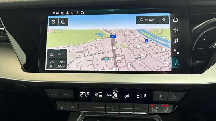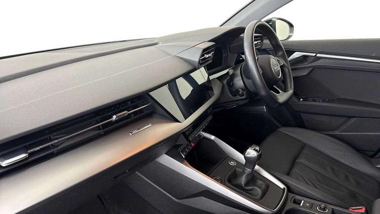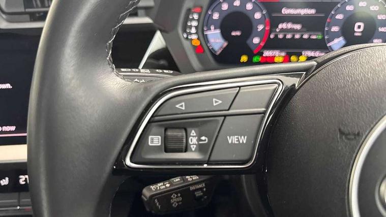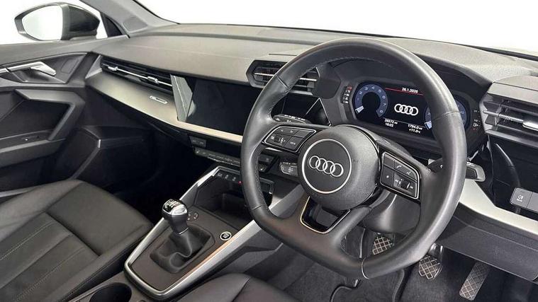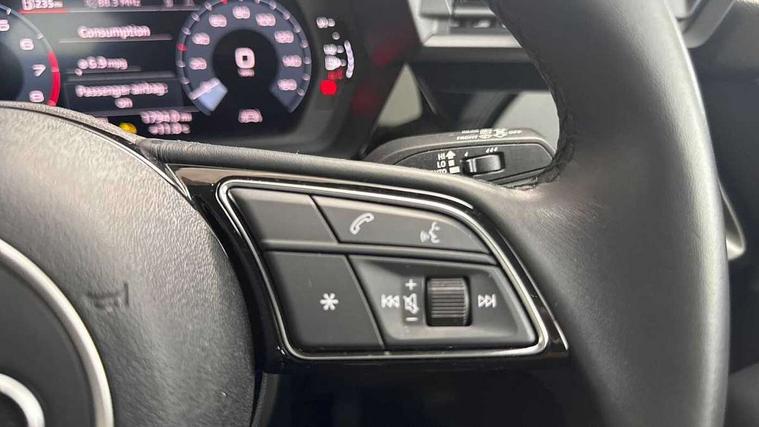 Audi drive select (Auto, Comfort, Dynamic, Efficiency and Individual), Audi smartphone interface, Audi Virtual Cockpit - 10.25" digital and colour instrument cluster, Automatic start/stop system with recuperation, Bluetooth interface, Collision avoidance assistant, Cruise control, e-Call (emergency call), Electromechanical power speed sensitive steering, Lane departure warning system, MMI Navigation Plus with high resolution 10.1" colour touch screen display, Rear parking sensors, Service indicator, Trip computer, Voice control system with natural language interaction, Standard suspension, 2xUSB-C connection with data and charging functions, 6 passive loudspeakers, DAB Digital radio, 3rd brake light, Acoustic glass windscreen, Aluminium window trim, Auto dimming frameless rear view mirror, Body colour exterior mirrors, Body colour roof spoiler, Electrically adjustable/heated/folding/auto dimming door mirrors with integrated LED indications + kerb view function for passenger side, Front electric windows, LED daytime running lights, LED headlights and halogen rear lights, Light and rain sensors, Rear electric windows, Rear side wing doors, Rear window, rear door windows and rear side windows in clear glass, Rear wiper, 12V socket and storage compartment in front centre console, 3 seat bench in 2nd row, 40/20/40 split folding rear seat bench with cupholder, Dual zone electronic climate control, Front and rear centre armrest, Front and rear headrests, Front door sill trims with aluminium inlay, Front/rear floor mats, Height and reach adjustable steering wheel, Interior lighting - Front and rear roof module including reading lights, glove compartment light and right hand side, Luggage compartment floor covering, Manual boot compartment lid, Manually adjustable front seats, Seat side bolsters, Single front passenger seat, Steel grey cloth headlining, Twin leather upholstery, Aluminium interior elements pack - A3 Sportback, Sport styling pack - A3 Sportback, 3x3 point rear seat belts, Audi pre sense front, Driver and front passenger airbag with passenger airbag deactivation, Electronic Stabilisation Control (ESC) including ABS, ASR and EDL, First aid kit with warning triangle and 2 safety vests, Front side airbags with head airbags and interaction airbag, Pre-sense front with pedestrian and cyclist detection, Seatbelt monitoring, Tyre pressure loss indicator, Anti theft alarm, Anti-theft wheel bolts, Electronically operated child lock, Immobiliser, Remote control central locking, Inlays with silk effect paint in platinum grey,