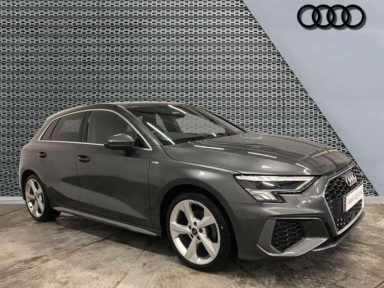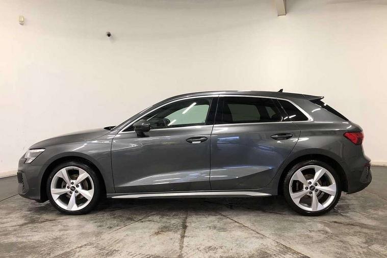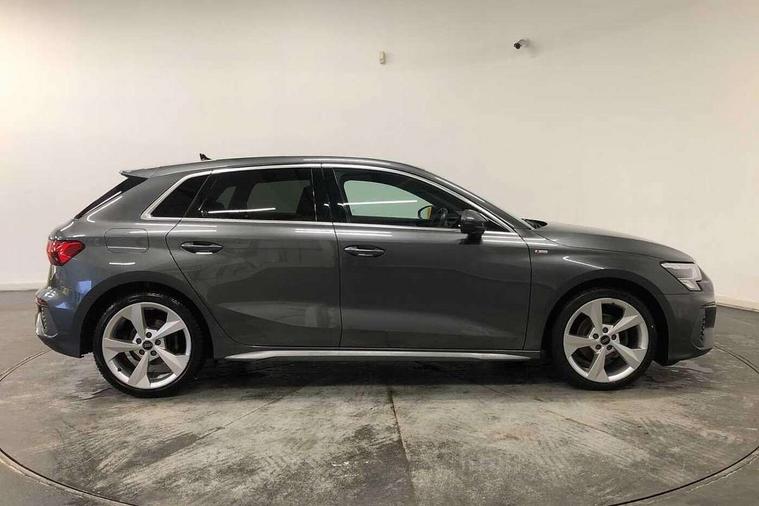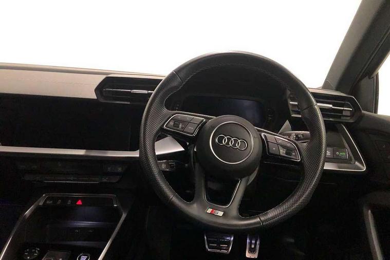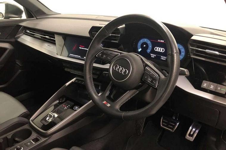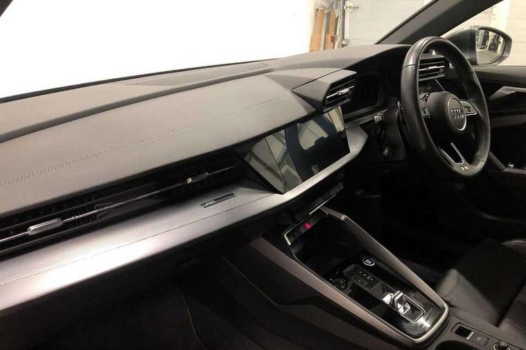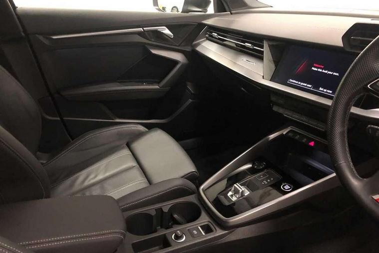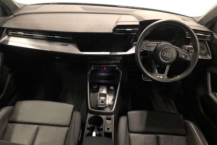 Audi drive select (Auto, Comfort, Dynamic, Efficiency and Individual), Audi smartphone interface, Audi Virtual Cockpit - 10.25" digital and colour instrument cluster, Automatic start/stop system with recuperation, Bluetooth interface, Camera based traffic sign recognition, Collision avoidance assistant, e-Call (emergency call), Electromechanical power speed sensitive steering, Lane departure warning system, MMI Navigation Plus with high resolution 10.1" colour touch screen display, Service indicator, Trip computer, Voice control system with natural language interaction, Sports suspension, 2xUSB-C connection with data and charging functions, 6 passive loudspeakers, DAB Digital radio, 3rd brake light, Acoustic glass windscreen, Aluminium window trim, Auto dimming frameless rear view mirror, Body colour exterior mirrors, Electrically adjustable/heated/folding/auto dimming door mirrors with integrated LED indications + kerb view function for passenger side, Front electric windows, Illuminated aluminium inserts front door sills with S logo, LED daytime running lights, LED headlights with LED rear lights and dynamic rear indicators, Light and rain sensors, Privacy glass - dark tinted rear window, rear door and side windows, Rear electric windows, Rear side air outlets in grained matt black, Rear side wing doors, Rear wiper, S line bumpers, S roof spoiler, 12V socket and storage compartment in front centre console, 3 seat bench in 2nd row, 3 spoke leather multifunction steering wheel with paddle shift, 4 way electrically adjustable lumbar support for driver and front passenger, 60/40 split folding rear seat bench, Black cloth headlining, Dual zone electronic climate control, Front and rear centre armrest in leather, Front and rear headrests, Front/rear floor mats, Height and reach adjustable steering wheel, Interior lighting - glove compartment light and right hand side, Luggage compartment floor covering, Manual boot compartment lid, Manually adjustable front seats, Seat side bolsters, Single front passenger seat, Stainless steel pedals and front footrest in black, Twin leather upholstery with front sports seats S embossed logo, Aluminium interior elements pack - A3 Sportback, LED interior lighting pack - A3 Sportback, S line styling pack - A3 Sportback, 3x3 point rear seat belts, Driver and front passenger airbag with passenger airbag deactivation, Electronic Stabilisation Control (ESC) including ABS, ASR and EDL, First aid kit with warning triangle and 2 safety vests, Front side airbags with head airbags and interaction airbag, Pre-sense front with pedestrian and cyclist detection, Seatbelt monitoring, Tyre pressure loss indicator, Anti theft alarm, Anti-theft wheel bolts, Electronically operated child lock, Immobiliser, Remote control central locking, Dark spectrum aluminium inlays, accent surfaces in the dashboard and centre console in platinum grey silk effect paint finish,
