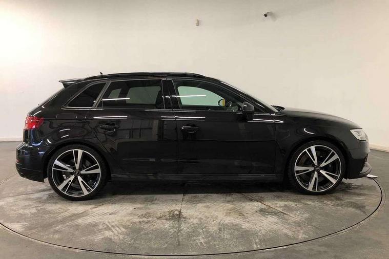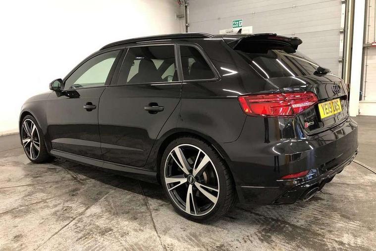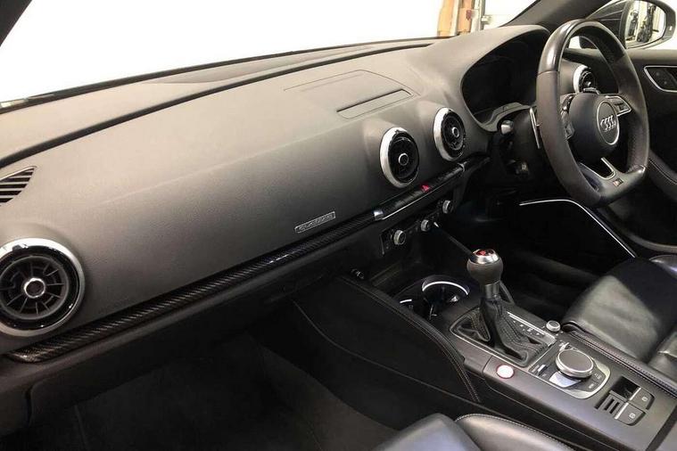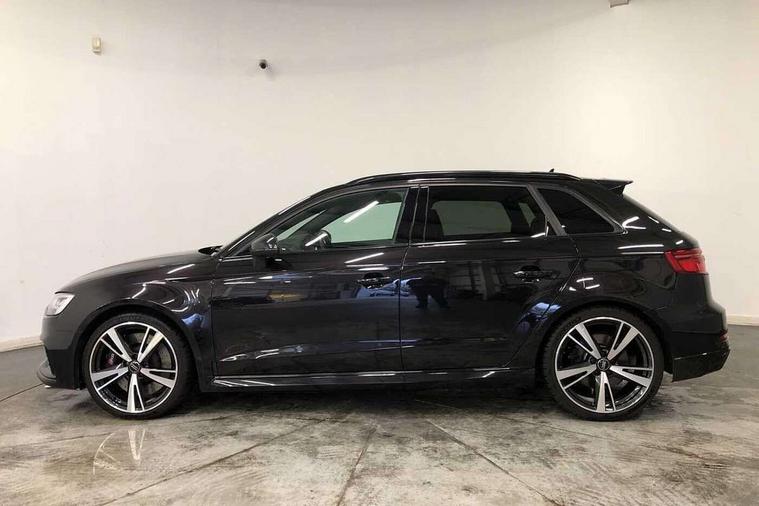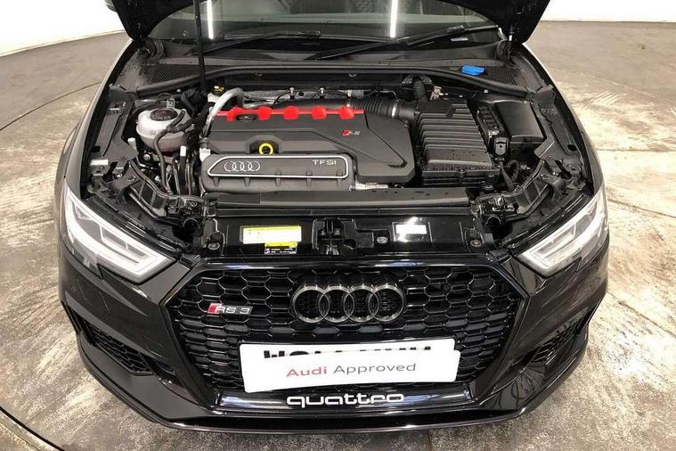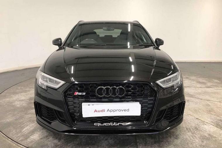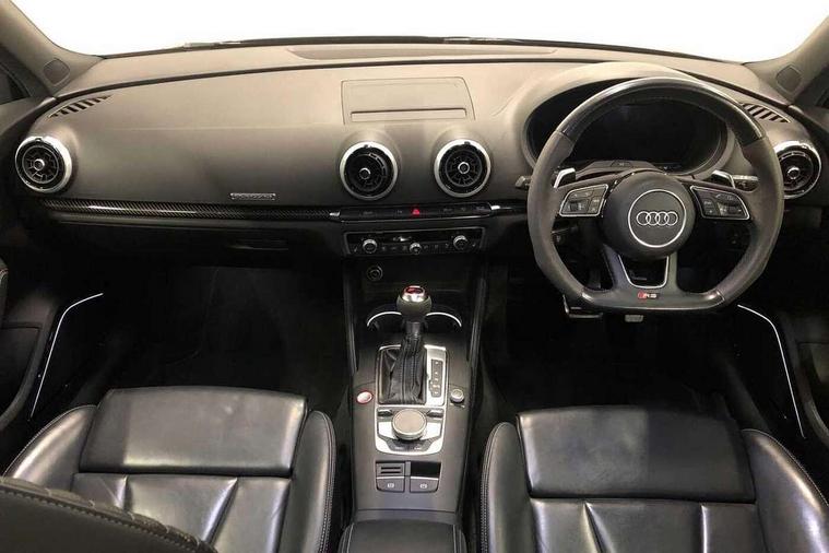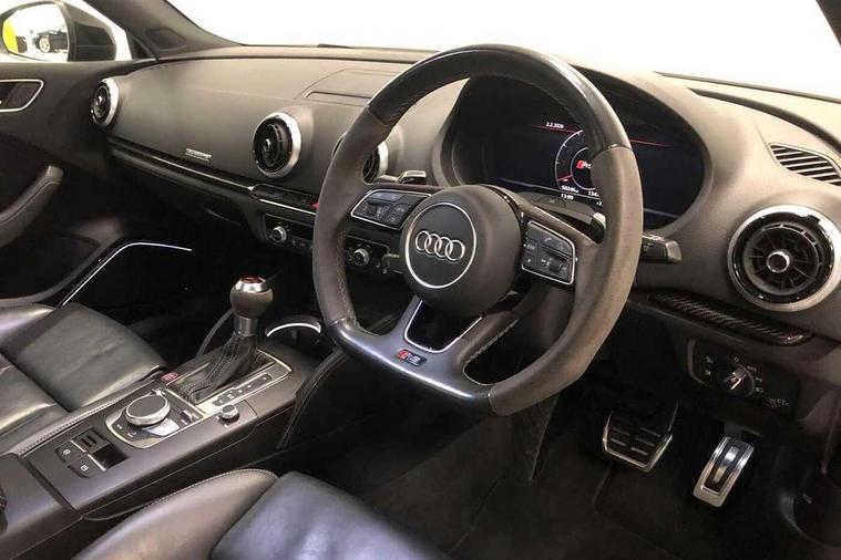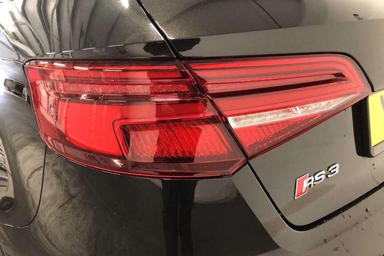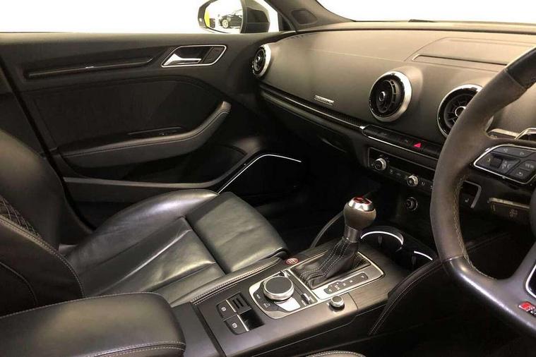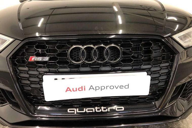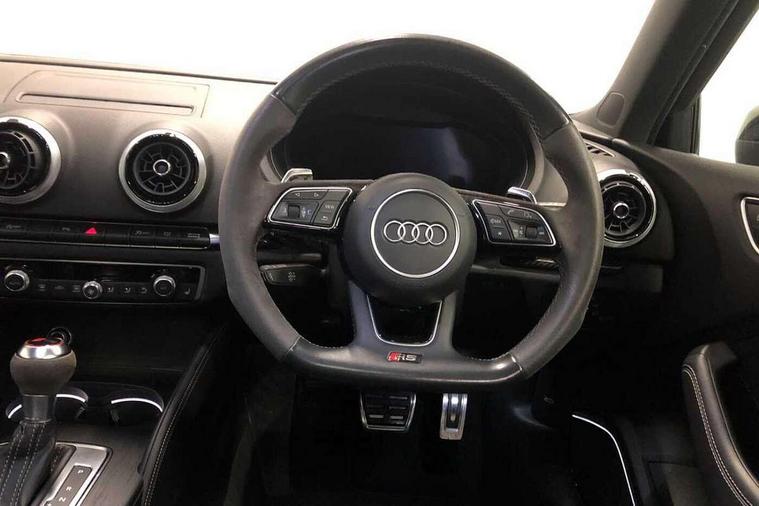 Audi connect, Audi drive select, Audi phone box with wireless charging, Audi smartphone interface, Audi virtual cockpit with RS specific display, Automatic start/stop system, Colour driver's information system display, MMI navigation plus with MMI touch, Mobile telephone preparation - bluetooth interface, Progressive power assisted steering, Service interval indicator, Speed limit display, Voice control system, Voice recognition for navigation system, 10 GB hard disk, 2 USB interfaces and Aux-In jack, 2 x SDXC card reader, Audi music interface, CD/DVD player, DAB Digital radio, MMI radio plus with 7" colour MMI screen and MMI controller, Online entertainment, Audi Beam uses LEDs to project the Audi Sport logo, Auto dimming rear view mirror with light and rain sensors, Black Audi rings, Body coloured side sills extension, Electric front windows, Electric panoramic glass sunroof with sunblind and auto-closure function, Electric rear windows, Electrically adjustable and heated door mirrors with integrated LED side indicators, Flared front wheel arches, Headlight washers, Heated windscreen washer jets, LED daytime running lights, Matt aluminium radiator grille frame including matt black quattro logo, Privacy glass - dark tinted rear and rear side windows from B-pillar backwards, Rear wiper, RS front bumper with large air inlets in gloss black and horizontal blade painted in body colour, RS roof edge spoiler painted in body colour with side aerodynamic inserts in high gloss black, RS3 badge on grille and luggage compartment lid, 3 adjustable rear headrests, 3 Spoke flat bottomed leather/alcantara multi-function sport steering wheel + gear shift paddles in aluminium look, contrast stitching and RS badging, 4 lashing points to secure luggage, 4 way lumbar support, 60/40 split folding rear seat, Adjustable front centre armrest, Dual zone electronic climate control, Fine nappa leather uphostery with front super sports seats RS embossed logo in rhombus pattern, Front and rear interior lights with delay, Front/rear floor mats, Glovebox light, Heated front seats, Height and reach adjustable steering wheel, Illuminated door sill trims inlays in aluminium with RS 3 logo, Isofix child seat preparation for front passenger/outer rear seats inc passenger airbag deactivation, RS gear lever knob in alcantara/leather gaiter with contrast stitching, Stainless steel pedals, Storage compartments in doors side trims, centre console and under front drivers seat, Black Styling pack - RS3, LED interior light pack - A3/RS3, Non smoking pack - A3, Storage and luggage pack - A3/RS3, 3 point seatbelts on all seats, ABS/EBD, Active bonnet, Active front headrests, Airbags - front driver/passenger, front & rear side, curtain, drivers knee, ASR, Black painted brake calipers with RS logo at the front, EDL, Electromechanical parking brake, ESC - Electronic Stability Control + traction control, Front passenger airbag deactivation, Hill hold assist, Manual rear child locks, Multi-Collision braking, RS brake system, Seatbelt warning, Warning triangle and first aid kit, Anti theft alarm, Anti-theft wheel bolts, Remote control central locking, Thatcham category 1 alarm + immobiliser, Aluminium air vent surrounds, Aluminium trim elements, Carbon inlays, Carbon twill inserts, 19" 5 arm blade style audi sport design alloy wheels in glossy anthracite black look with diamond cut finish, Tool kit, Tyre repair kit,