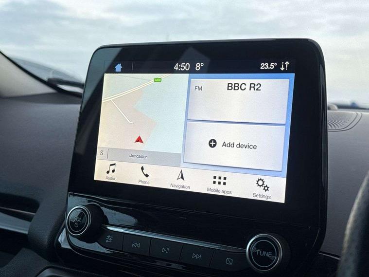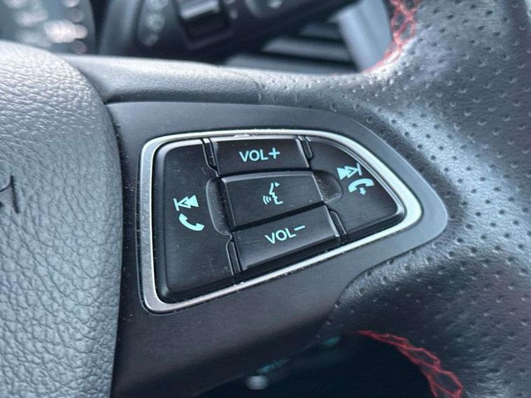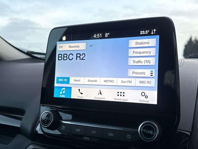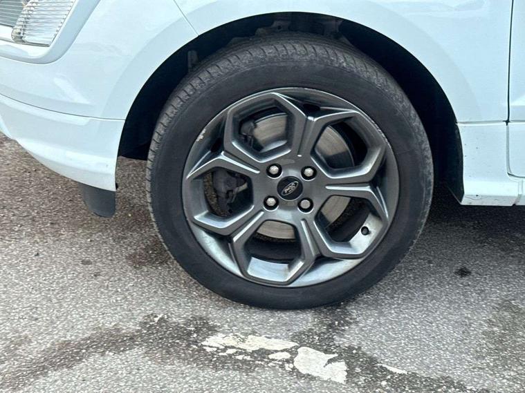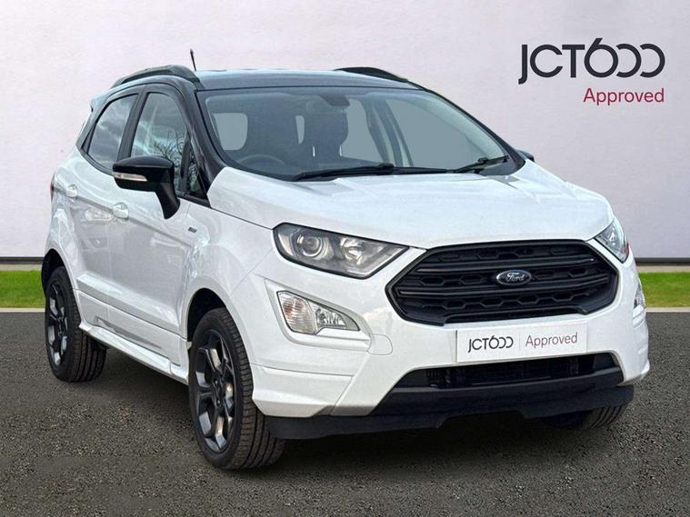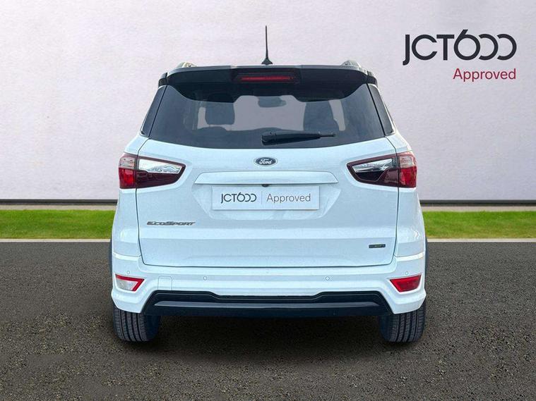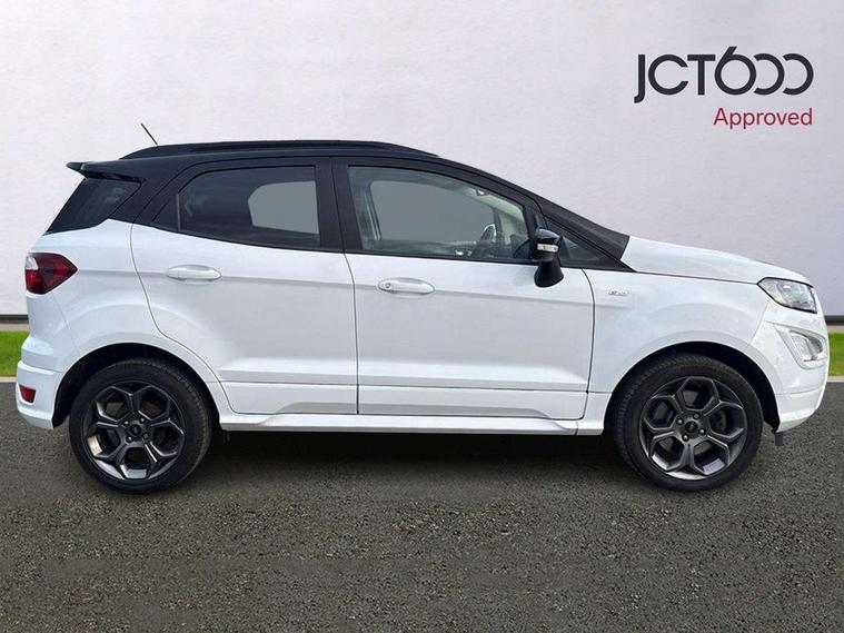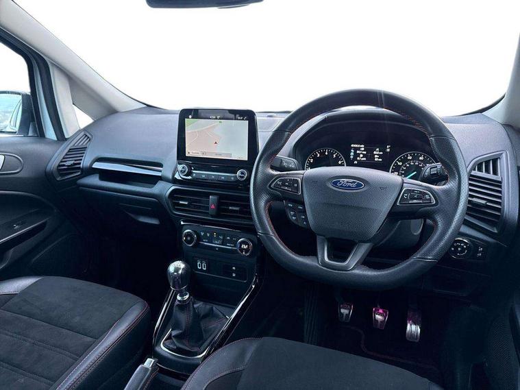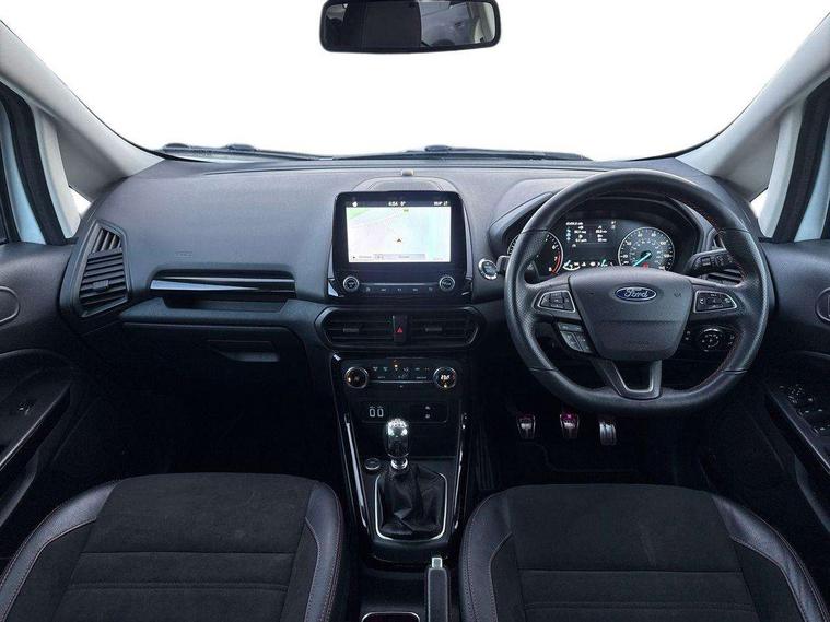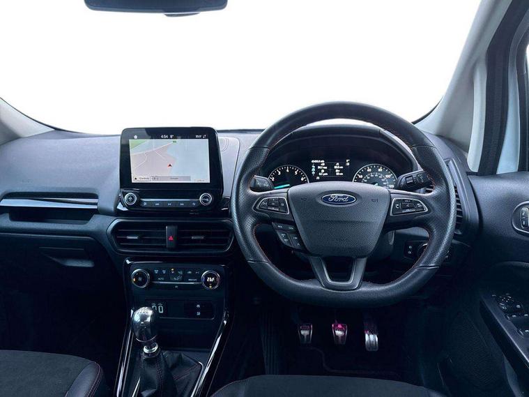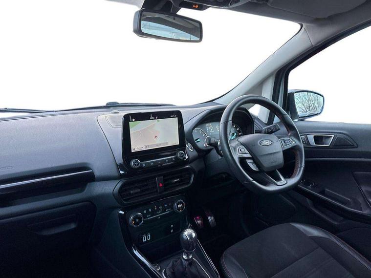Cruise control, Easy fuel capless refuelling system, PAS, Trip computer, Sports suspension, Steering wheel mounted audio controls, 'Quickclear' heated windscreen/heated washer jets, Auto dimming rear view mirror, Automatic headlights, Black roof rails, Body colour door handles, Body coloured bumpers, Electrically adjustable and heated door mirrors, Front door threshold plates with ST-Line logo, Front fog lights, Headlamps with LED day running lights, Headlight levelling control, Large rear spoiler, Power foldable door mirrors with puddle lights, Power front and rear windows with global opening/closing, Rain sensing front wipers, Rear wiper, ST-Line body styling kit, ST-Line front grille, 12V socket in front and rear, 60/40 split rear seats, 7 shade adjustable ambient lighting, Ambient light, Centre console with sliding front armrest, Cooled glovebox, Courtesy lights with map reading light, Driver seat height/lumbar adjust, Driver's side glovebox, Driver/passenger sunvisors and lidded vanity mirrors, EATC - Electronic Auto Temperature control, Folding grab handles, Footwell ambient lighting, Front head restraints, Front seat back map pockets, Front/rear floor mats, Illuminated glovebox, Illuminated luggage compartment, Isofix system on outer rear seats, Leather steering wheel/gearshift/handbrake lever with red stitching, Luggage compartment carpet, Overhead console with sunglasses holder, Partial leather upholstery, Rake adjustable rear seats, Reach + rake adjustable steering column, Rear headrests, Stainless steel sports pedals, Steering wheel with chrome inserts, Storage drawers under front seats, Tie down hooks, Variable boot floor, Rear view camera pack - Ecosport, 3x3 point rear seatbelts, ABS, Child locks on rear doors, Curtain airbags, Driver airbag, Drivers knee airbag, Electronic Stability Programme with hill launch assist, Emergency brake assist, Front passenger airbag deactivation, Front side airbags, Passenger airbag, Seatbelt reminder for driver and front passenger, Traction control, Tyre pressure monitoring system, Immobiliser, MyKey system, Remote central locking, Thatcham 1 volume sensing alarm, Tyre inflation kit,