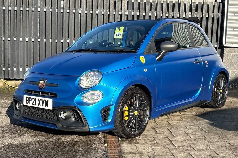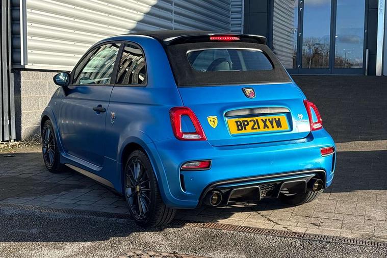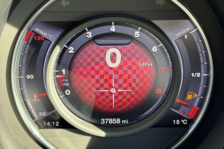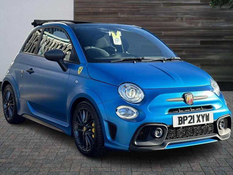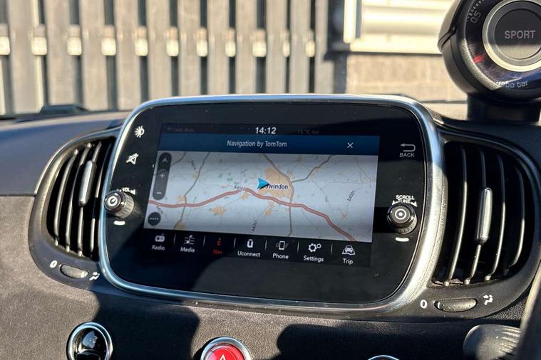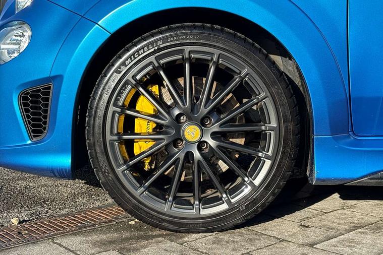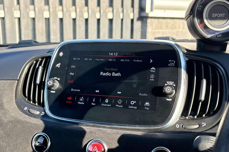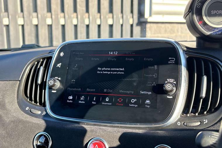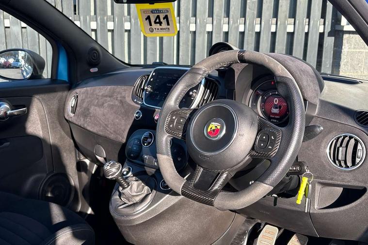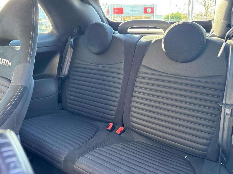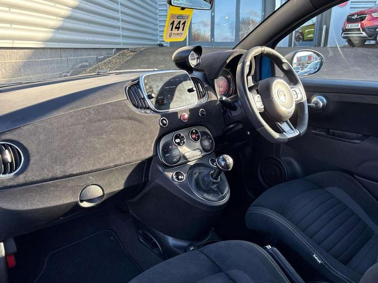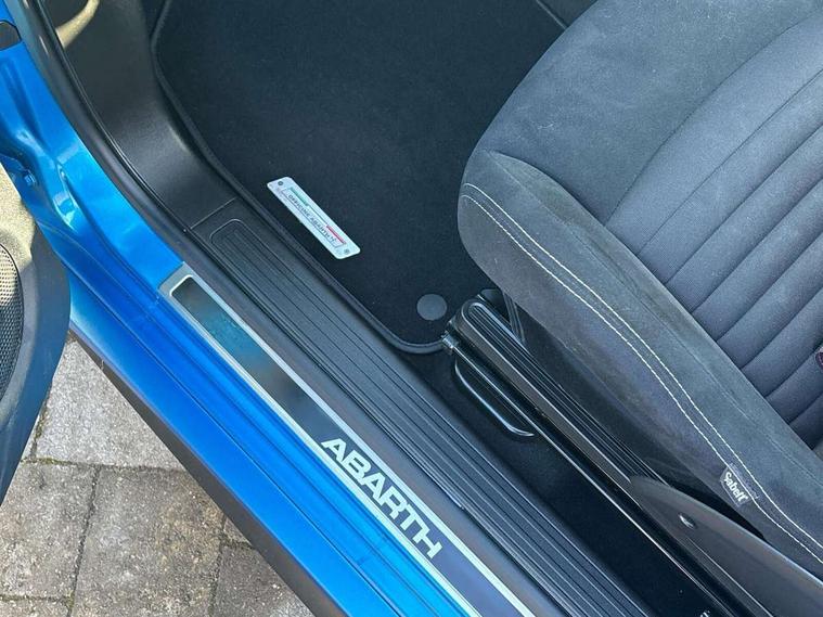 7" TFT instrument display with sports mode, 7" Touchscreen radio with navigation, Bluetooth, audio streaming, USB, Aux-in and DAB, Apple car play/Android Auto, Dualdrive PAS, Rear parking sensors, Sports button, Trip computer, U-connect access via mobile, Uconnect live service, Wakeup screen for 7" radio, Koni front and rear suspension with Frequency Selective Damping technology, Torque transfer control (TTC), Dark tinted rear windows, Dual mode record monza exhaust system with four tailpipes, Electric adjustable door mirrors, Electric front windows, Electrically operated soft top, Front fog lights, LED daytime running lights, 12V socket, Abarth corsa racing seat by sabelt, Aluminium sports pedals, Auto climate control, Front head restraints, Glovebox, Height adjustable steering wheel, High performance BMC air filter, Interior stowage net, Rear headrests, Sports alcantara leather multifunction steering wheel with carbon fibre detailing, 2 x 3-point rear seatbelts, 240x11 mm Drilled rear brake discs, 305x28 mm Drilled and ventilated front brake discs, ABS, Driver and passenger airbags, Drivers knee airbag, ESP + ASR/MSR + HBA + Hill holder, Tyre pressure monitoring system, Window airbags, Alarm, Central locking, Immobiliser, Remote central locking, Alcantara wrapped binnacle, Fix and go kit,