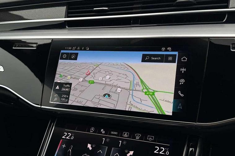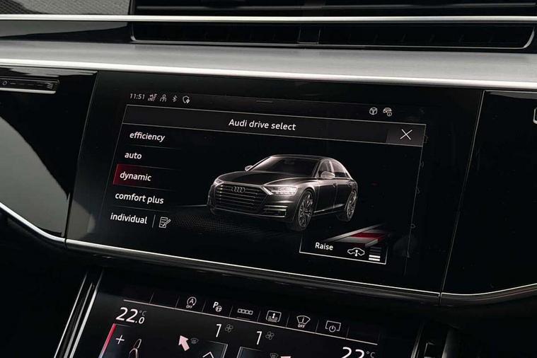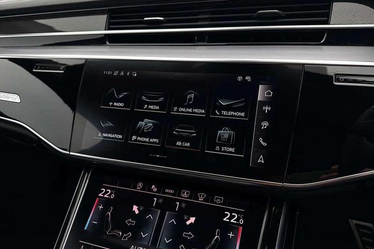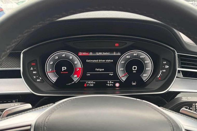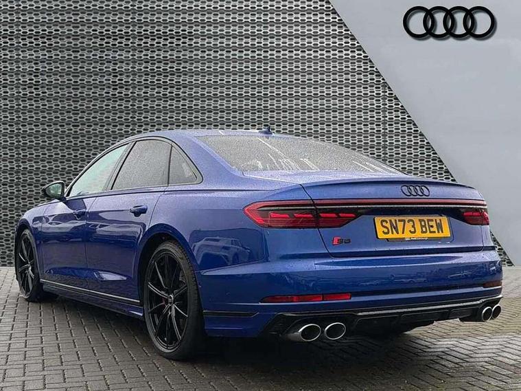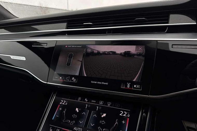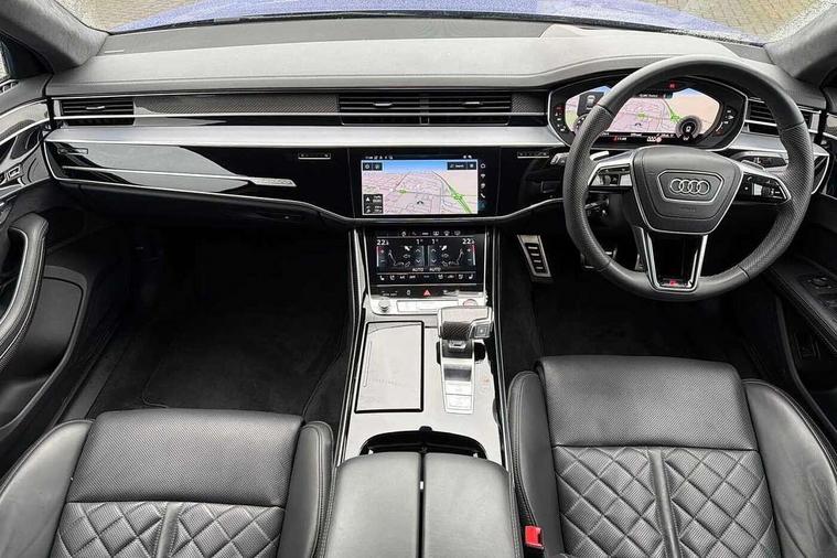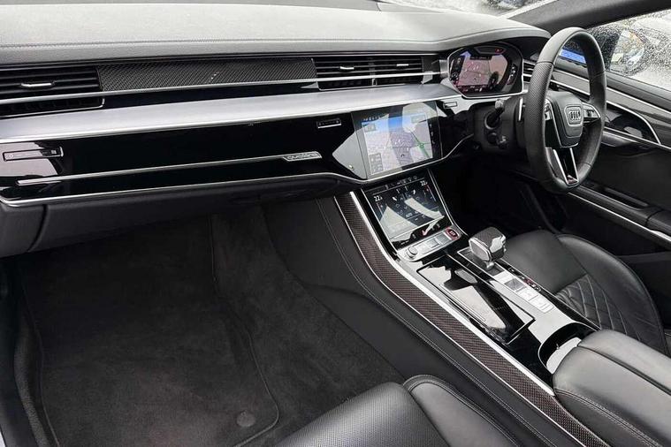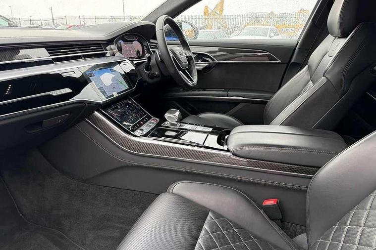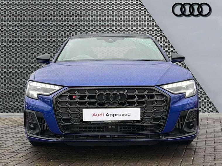 'Lights On' Reminder warning buzzer, 360 degree camera with top view, Active noise cancellation, Adaptive cruise control with cruise assist, emergency assist, efficiency assist, swerve assist, turn assist and speed limiter, Audi connect safety and service (e-call), Audi drive select, Audi smartphone interface with app store includes wireless Apple carplay, Android auto and Amazon alexa integration, Audi virtual cockpit plus, Bluetooth interface, Camera based traffic sign recognition, Convenience key, Dynamic all wheel steering, Head up Display, MMI navigation plus with MMI touch + Twin touch screens with haptic feedback, Operating buttons in black, glass look with haptic feedback including extended aluminium look, Parking assist plus with remote parking, Power door closure, Power operated tailgate, Remote fuel filler release, Service interval indicator, 48V Mild hybrid technology, 8 speed transmission with hill hold assist, 82 litre fuel tank, Predictive active suspension, Quattro all wheel drive with sport differential, Audi music interface, DAB digital radio module, DVD System, MMI radio plus, USB connection, Acoustic double glazing, All-weather, manoeuvring, position, static cornering, turning and motorway lights with automatic dynamic headlight range control, Audi space frame, Auto dimming rear view mirror, Body colour bumpers, Body colour door handles, Body colour side protection with aluminium trim strips, Digital matrix LED headlights with lane light, direction indicator, extended traffic information and extended light sequencing, Dynamic front and rear indicators, e-tron signature in DRL and dipped beam, Electric front windows, Electric rear windows with isolation switch, Electric sunblinds for rear window and rear door windows, Electrically adjustable heated folding + automatically dimming exterior mirrors with memory function and integrated LED indicators, Front wash/wipe with interval delay, Headlight cleaning system, Heat insulating darkened glass in side and rear windows, Heat insulating glass windscreen, Heated rear window, Heated windscreen washer jets, High beam assist, LED brake lights, LED daytime running lights, LED third brake light, OLED rear lights with changeable rear light signature, Privacy glass, Rear boot, Rear side wing doors, Side skirts, Welcome/leaving lighting, 12V socket, 2 zone automatic air conditioning, 3 seat rear bench with centre armrest in 2nd row, 4 way electric lumbar support for driver and front passenger, Audi phone box light, Black dinamica microfiber headlining, Carbon gear selector, Centre console with cupholders, Comfort centre armrest front, Door pockets with bottle holder, Driver and front passenger side sunvisors with illuminated vanity mirrors, Dust/pollen filters, Electric front seats with memory function, Front floor mats, Glove compartment cooling, Heated front seats, Height/reach electric steering column with easy exit function, Illuminated door sill trims with aluminium inlays and S diamond emblem, Isofix child seat mounting points on outer rear seats, Leather gearknob, Passenger footwell storage net, Reading lights, Rear floor mats, Rear headrests, Roof mounted sunglasses holder, Single front passenger seat, Stainless steel pedals and footrest, Valcona leather upholstery with front sports seats in diamond quilted with S embossed logo, Black exterior styling pack - A8 Black Edition, Extended LED Interior multi coloured light pack - A8, Exterior style pack - S8, 3 point seatbelts on all rear seats, ABS/EBD, Active front headrest system, ASR traction control, Audi pre sense basic, Audi pre sense front, Driver/Front Passenger airbags, EDL traction control, Electromechanical parking brake, ESP, Extended pedestrian protection measures, Front and rear disc brakes, Front and rear side airbags with head airbag system, Front passenger airbag deactivation, Rear child proof door locks, Seatbelt reminder + electric contact in buckle + advanced safety equipment, Tyre pressure loss indicator, Warning triangle and first aid kit, Anti theft alarm tow away protection, Anti-theft wheel bolts and wheel loosening detection, Remote central locking, Carbon vector upper inlays, Dark matt brushed aluminium lower inlays, Tyre repair kit,