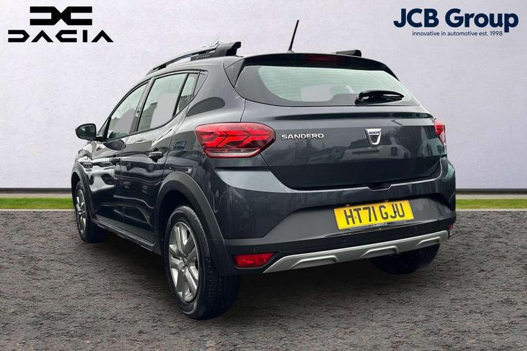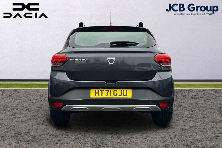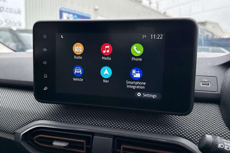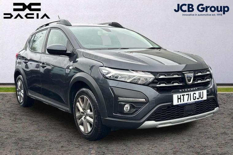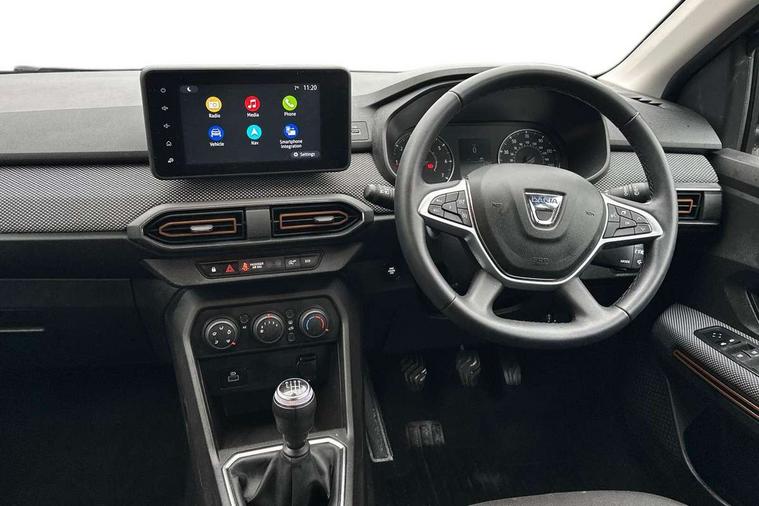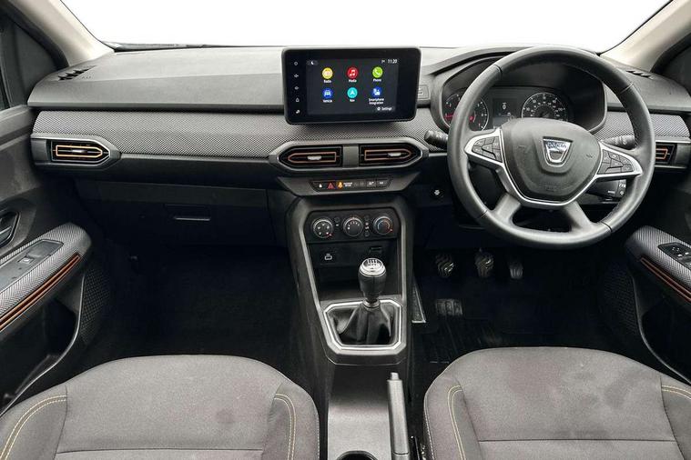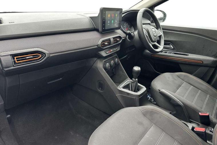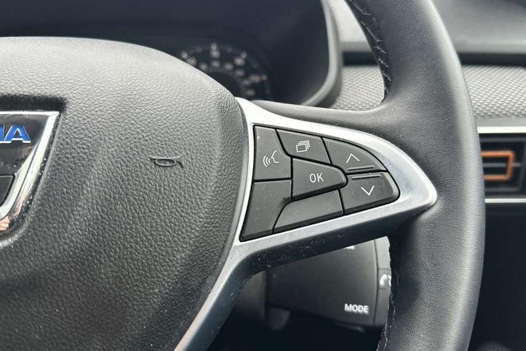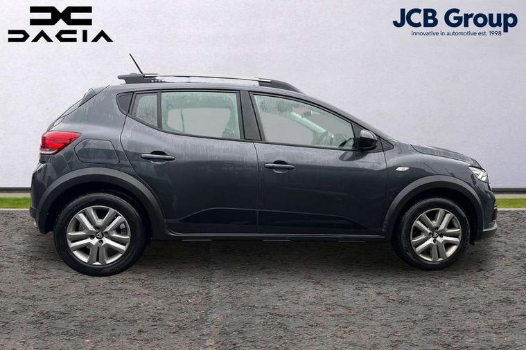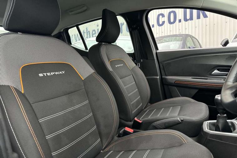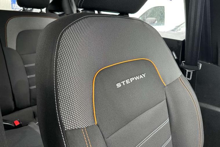 3.5" TFT instrument panel with on-board computer, Cruise control with speed limiter, eCall emergency call system, Eco mode, Electric power assisted steering, Rear parking sensors, Rev counter, Reversing camera, Stop/start system, 8" Media display - DAB radio, smartphone replication, bluetooth, 4 speakers, Apple CarPlay and Android Auto, USB connection for data transfer and charging, USB socket, 3 speed windscreen wipers, Auto lighting, Automatic wipers, Body colour door handles, Body colour door mirrors, Body coloured bumpers, Chrome longitudinal roof bars, Chrome radiator grille, Electrically adjustable and heated door mirrors, Front fog lights, Heated rear window, High level third brake light, LED automatic daytime running lights, LED Y-shape Dacia signature lighting, Modular roof bars, One touch electric front windows, Rear electric windows, Rear wash/wipe, Stepway inscription on radiator grille and roof bars, Tinted windows, 1/3 to 2/3 split folding rear seats, 12 volt front socket, 12 volt rear socket, 3 height adjustable rear headrests, Driver + passenger vanity mirrors, Fabric upholstery, Fixed smartphone holder on dashboard, Front armrest, Gear shift indicator, Height adjustable driver seat, Height adjustable front headrests, Height/depth adjustable steering wheel, Isofix points for child seats in both outer rear seats, Manual air conditioning, Satin chrome interior door handles, Satin Chrome/Copper orange air vents, Soft feel steering wheel, Steering wheel controls, 3x3 point rear seatbelts, ABS and Emergency brake assist, Automatic emergency braking system, Child locks on rear doors, Door open warning, Driver airbag, ESC (Electronic Stability Control), ESP + Hill Start Assist, Front curtain airbags, Front seatbelt pretensioners, Front side airbags, Height adjustable front seatbelts, Passenger airbag, Seatbelt reminder for driver and front passenger, Tyre pressure monitor, Automatic central locking, Immobiliser, Keyless entry, Remote central locking, Decopart on instrument panel and door with textile, 16" Flex wheels with full wheel cap,