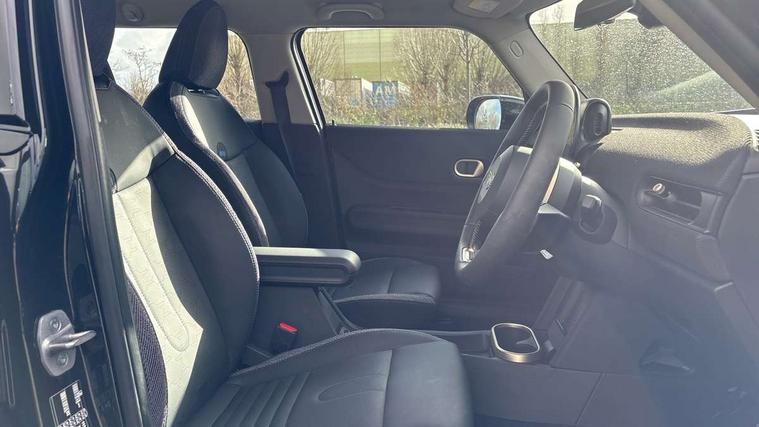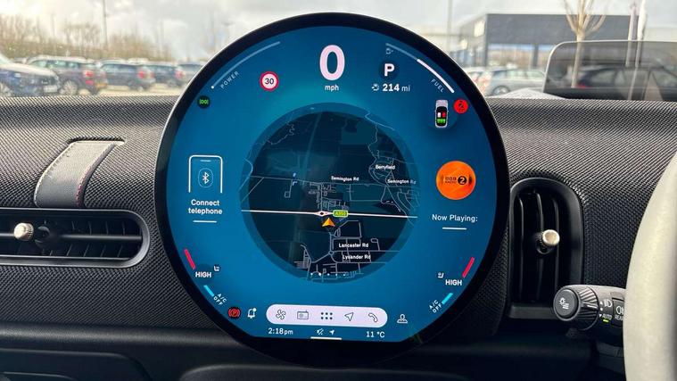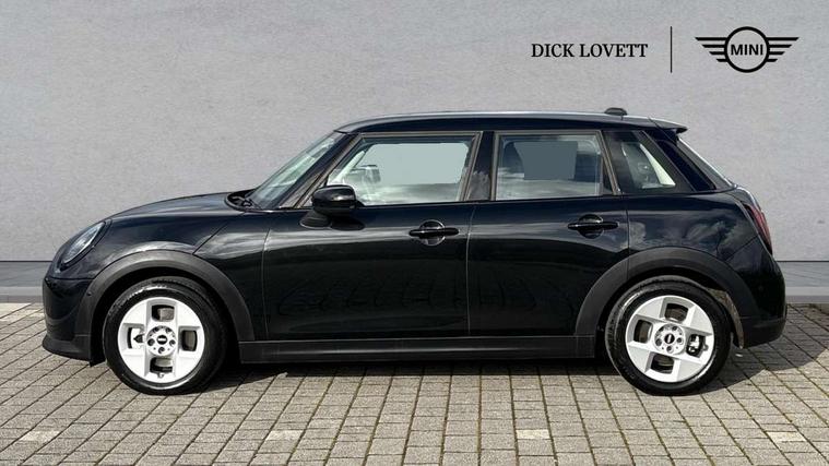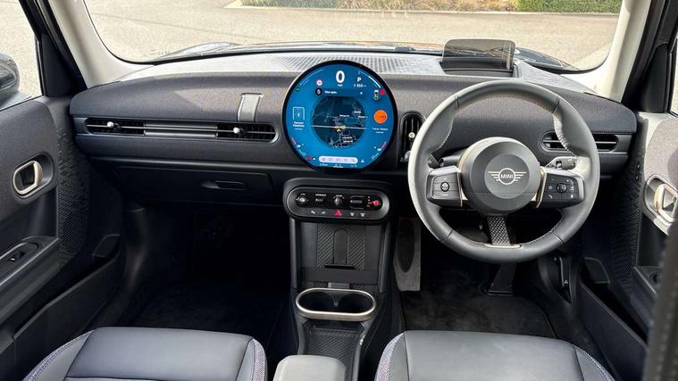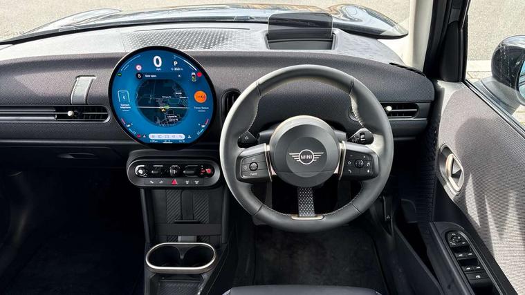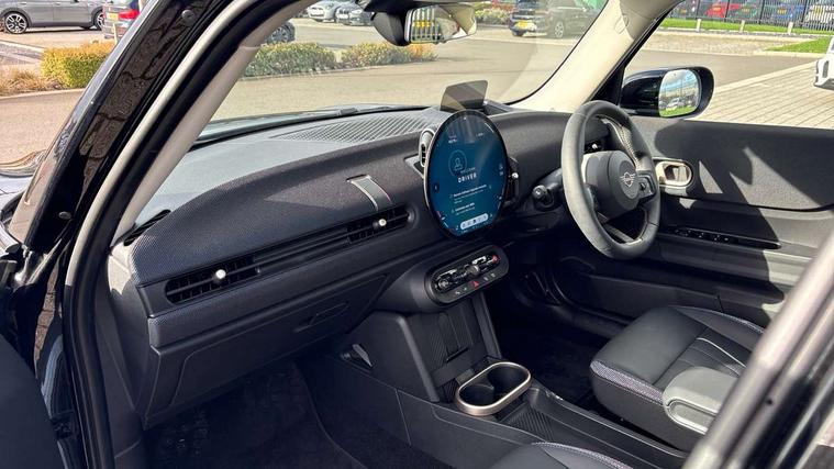 Central toggle bar, Circular OLED Screen, Compatible mobile phone bluetooth with audio streaming, Cruise control, Digital instrument cluster, Electro-mechanical speed dependant steering assistance, Emergency call service, MINI Experience Modes, Mini navigation system, On board computer, Service interval indicator, Tailgate, 7 speed steptronic transmission with double clutch, DAB Digital radio, Personal eSim, Auto headlights, Electric adjustable heated door mirrors, Electric front+rear windows, Heated rear window, Heated windscreen washer jets, LED 3rd brake light, LED daytime running lights, LED Headlights, LED indicator lights, LED rear lights, Rain sensor window wipers, Rear fog lights, Rear side wing doors, Rear window wiper, 2 zone automatic air conditioning, 3 seat bench in 2nd row, 60/40 rear seat bench, Ambient lighting, Cupholders, Front and rear floor mats, Front and rear head restraints, Front compact armrest, Heated steering wheel, Height adjustable passenger seat, Light headliner, Luggage compartment lighting, Single front passenger seat, Sport Vescin Steering Wheel black with vibrant silver accents, Sunvisors with vanity mirrors, Vescin/Cloth upholstery includes dash knit in black with blue accents, Driving assistant pack - Cooper Hatchback, Park assistant pack - Cooper Hatchback, 3 point seatbelts on all five seats, 6 Airbags - front, side, head and seat belt tensioners, Anti-lock braking system (ABS), Child locks on rear doors, DSC - Dynamic Stability Control, Electronic parking brake, Front and rear disc brakes, Front ISOFIX (iSize), Front passenger airbag deactivation, Traction control, Tyre pressure monitoring system, Alarm, Immobiliser, Remote central locking, Tyre repair kit,