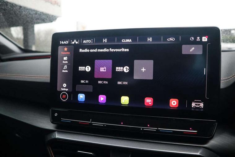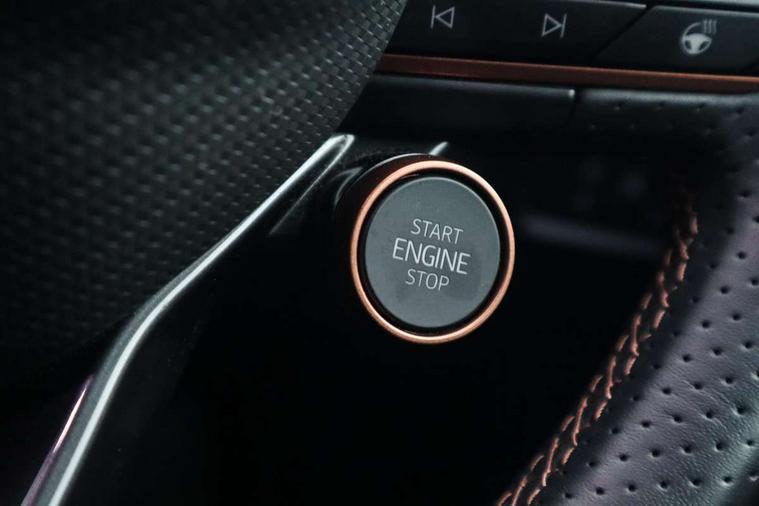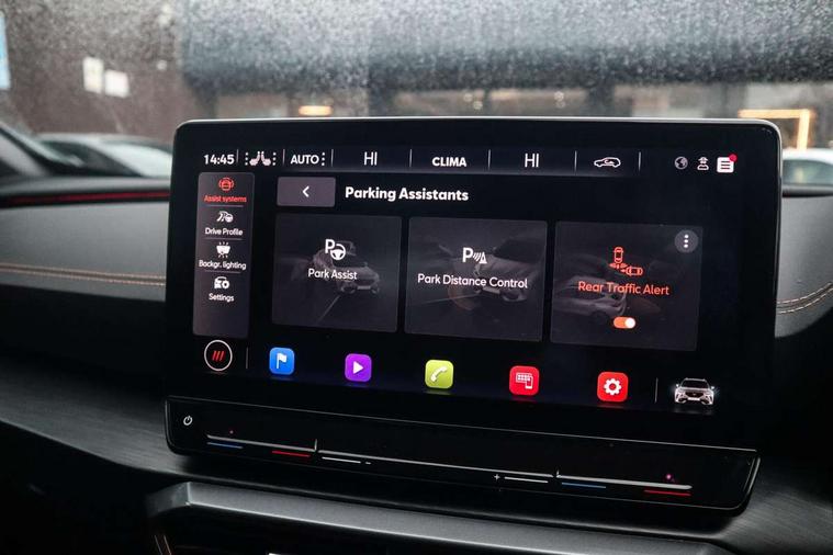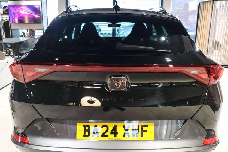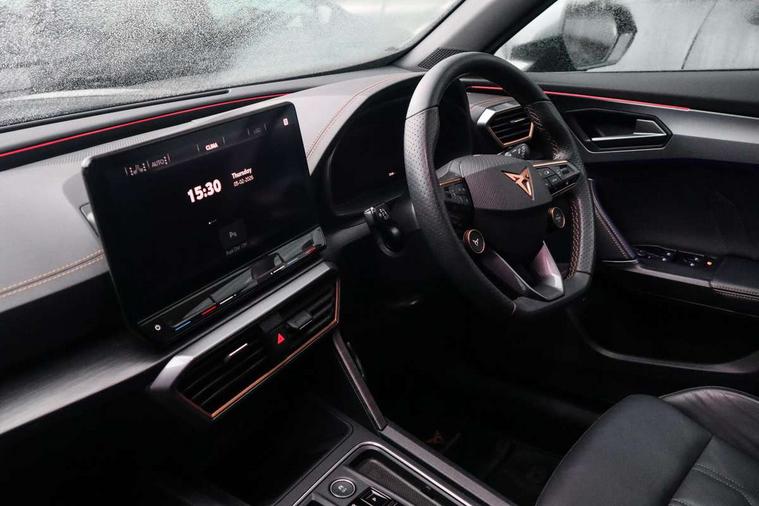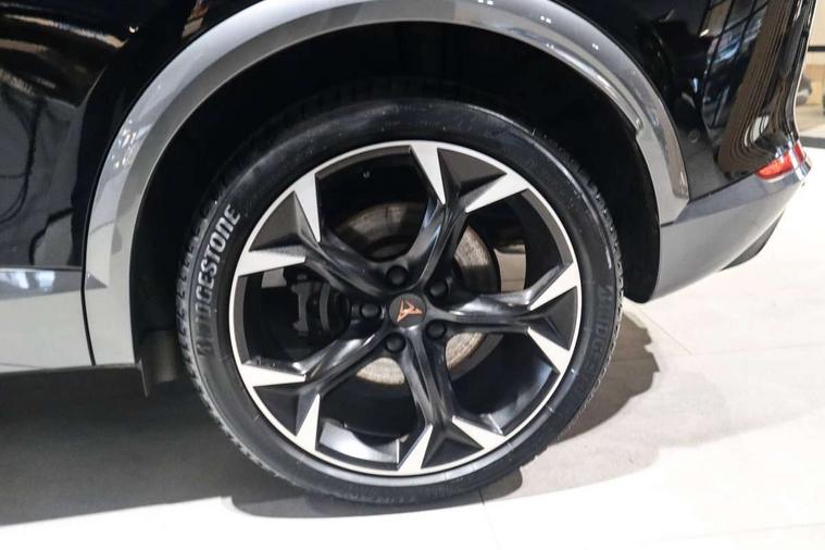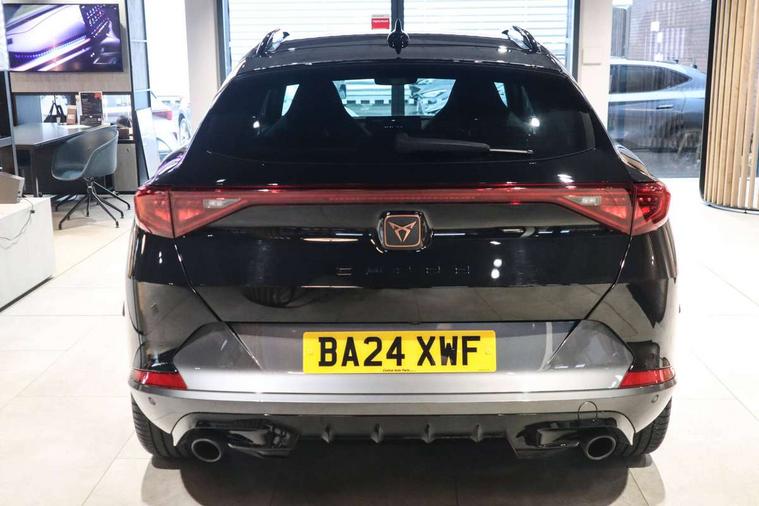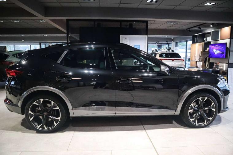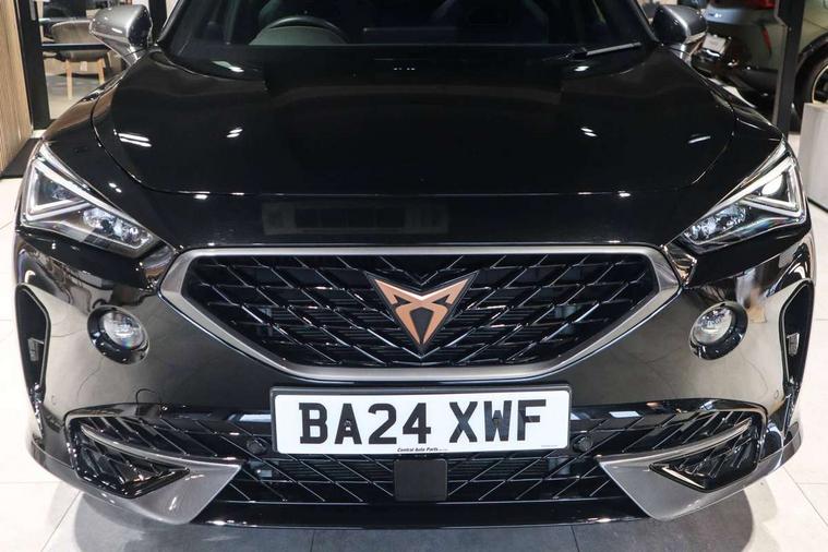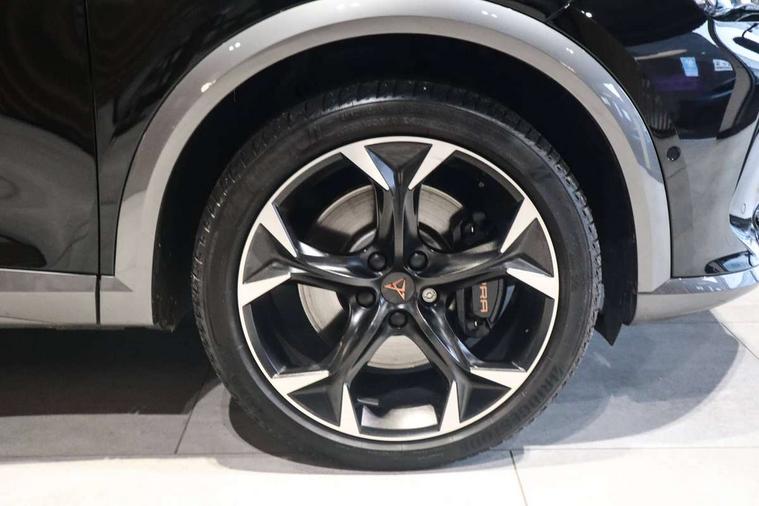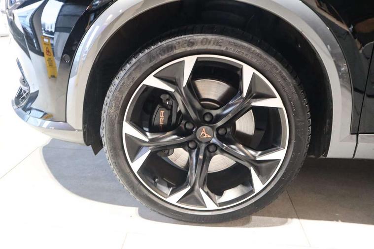 Digital cockpit and configurable dashboard, Driver alert system, Dynamic chassis control with driving profile selection (Comfort, Sport, CUPRA, Individual), Forward collision warning with automatic braking, Lane assist, Navigation system with 12'' Touchscreen Display, Park assist (inc front/rear parking sensors), Predictive adaptive cruise control with speed limiter, RPM, trip computer, outside temp gauge, instrument light brightness, low fuel warning light, lights on reminder, gearshift indicator, Service interval indicator, Speed sensitive power steering, Start/stop system with regenerative braking, Virtual pedal and electric tailgate, Voice control system, Wired Android Auto, Wireless apple carplay, Wireless phone charger, Electronic locking differential and dynamic traction support, Sports suspension with front shock absoption, 2 front and 2 rear USB type C sockets, Auxiliary input socket, DAB radio, Auto dimming rear view mirror, Body colour door handles, Body coloured bumpers, Dark grey wing mirror, Daytime running light with automatic headlight control and coming home feature, Dynamic headlight range control, Electric front/rear windows, Electrically adjustable heated and folding door mirrors with memory function, Front fog lamps with cornering function, Gloss black roof rails and window surrounds, LED Headlights, LED Taillights with dynamic indicator, Rain sensing wipers, Rear diffuser with twin exhaust pipe on each side, Rear side wing doors, Rear wash/wipe, Sports bumpers, Third brake light, Tinted rear windows, VZ logo rear badging, Welcome lights, 12v power supply in centre console, 12V socket, 12v socket in loadspace, 2 front and 2 rear reading lights, 230V socket, 3 seat bench in 2nd row, 60/40 split rear bench seat with armrest and mechanical seat release, Black headlining, Cupra sports pedals, Dust/pollen filter, Front and rear head restraints, Front centre armrest, Height/reach adjust steering wheel, Illuminated interior front door sills, Illuminated sunvisor with mirror, Isofix, Leather heated multi-function sports steering wheel with start stop, CUPRA mode button and gear shift paddles, Luggage tie-down hooks, Single front passenger seat, Three zone climate control with control panel in rear, Variable luggage/load compartment floor, Wraparound lighting, Genuine Nappa leather Pack - Cupra, Safety and driving pack (XL) - Formentor, 3 point seatbelts on all rear seats, ABS, Brake control system - ESC and brake booster, Child proof door locks, Driver and front passenger airbags with front passenger airbag de-activation, Electronic parking brake, Front and rear disc brakes, Front side curtain airbags, Hill hold control, Public e-call, Seat belt reminder for front and rear seats, Tyre pressure monitoring system, Anti theft alarm system, Keyless entry and start system (KESSY), Locking wheel bolts, Copper and aluminium interior detailing, 19" 'Exclusive' machined sport matte black and silver alloy wheels, Space saver spare wheel,