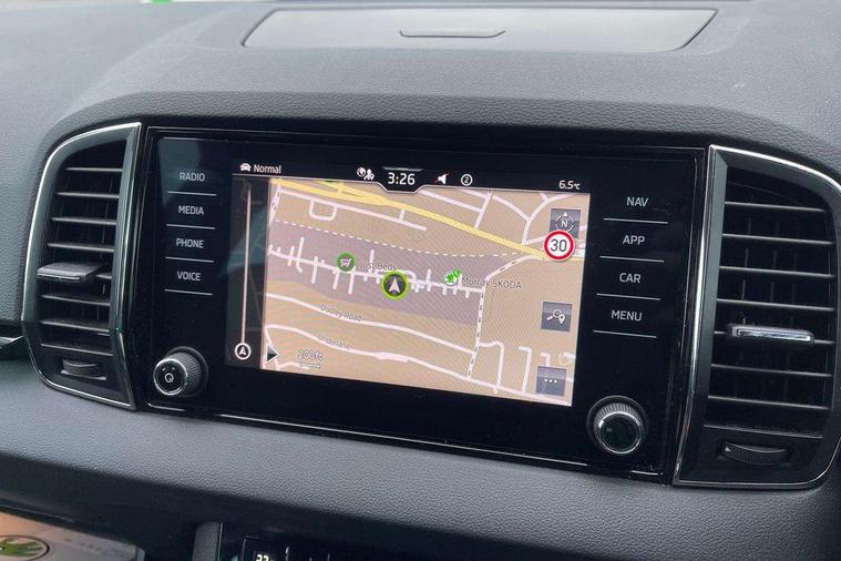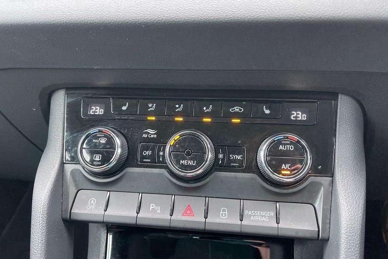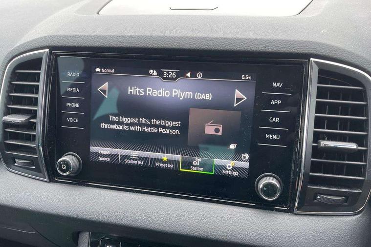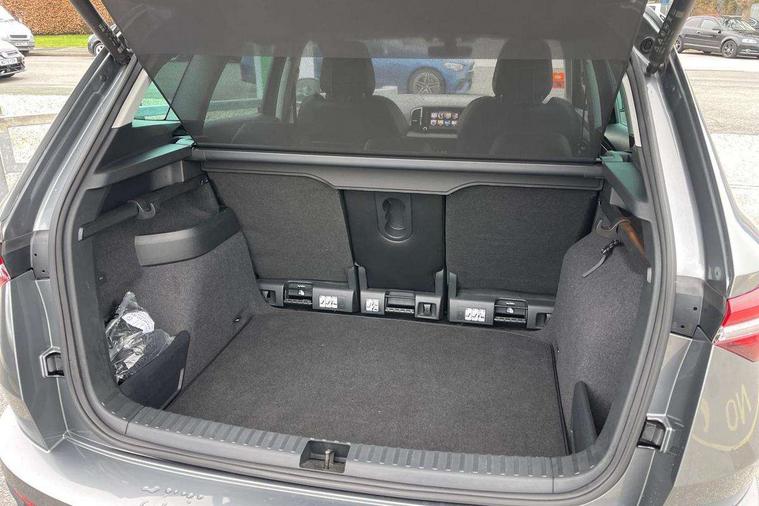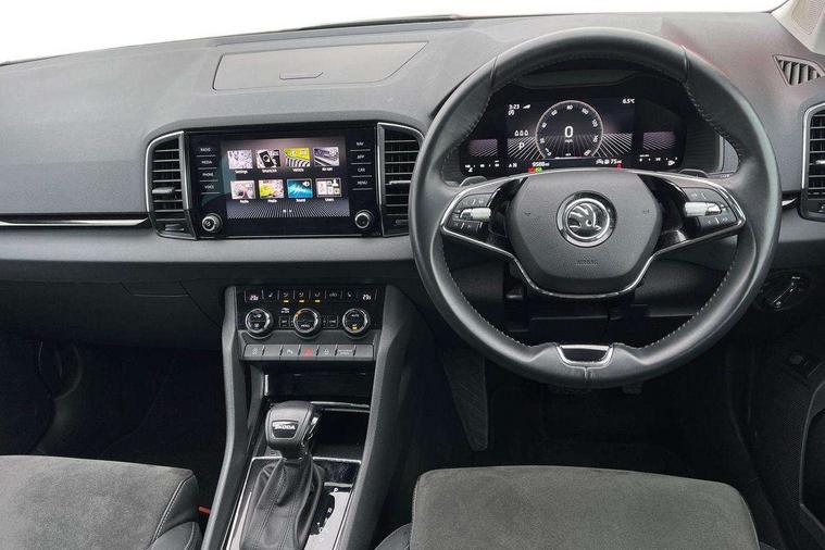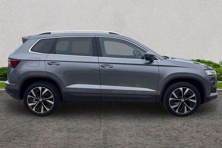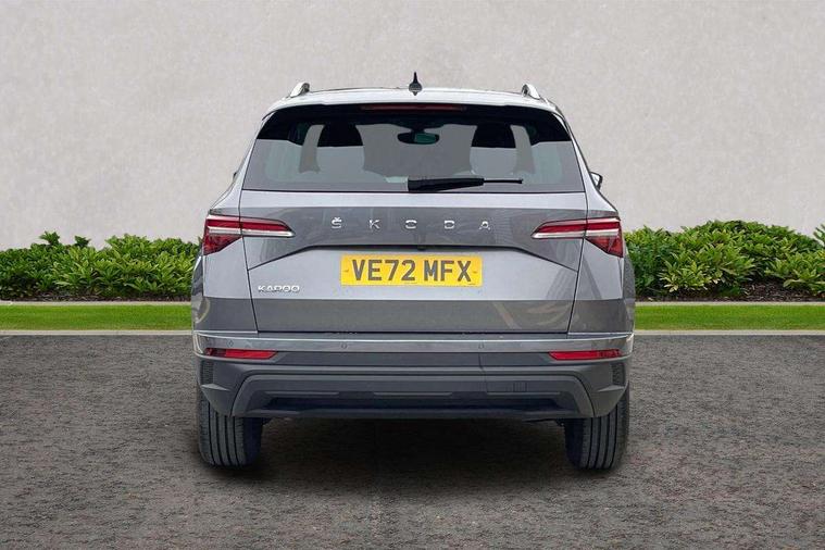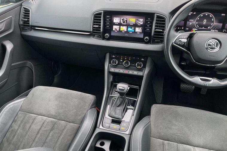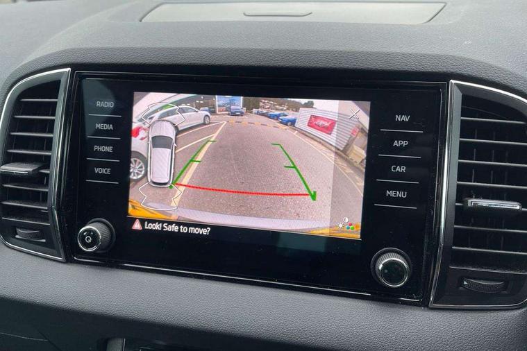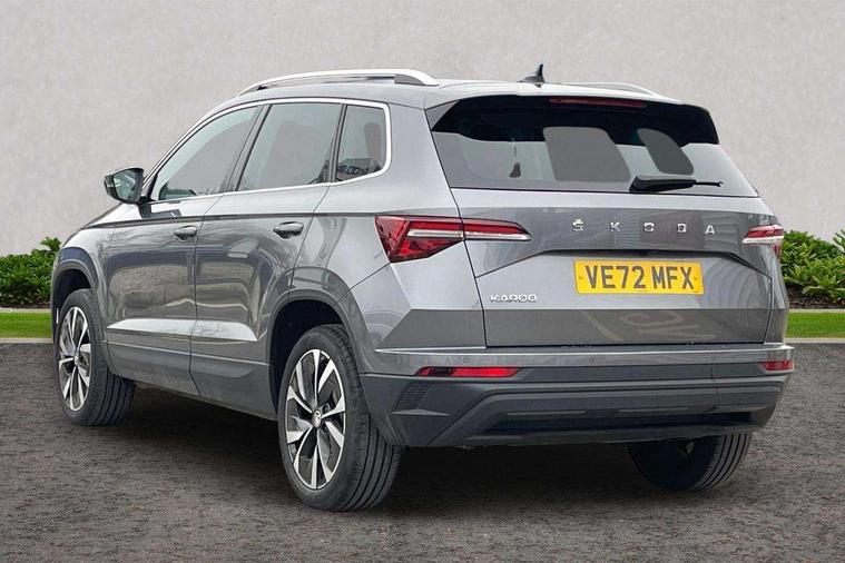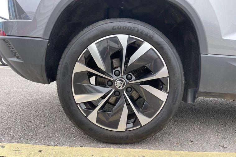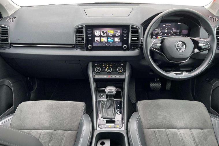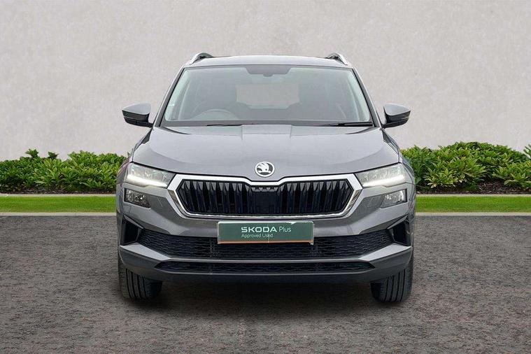 8" Digital display, Care connect, Driver fatigue sensor, Emergency services call system, Outside temperature gauge, Service interval indicator, SmartLink wireless for Apple and wired for Android, Start/stop system with regenerative braking, USB C Port x 2 in front centre console, 8 Speakers, DAB radio with Bluetooth, USB connection, Acoustic glass, Aero front windscreen wipers with intermittent function, Auto dimming rear view mirror with light and rain sensors, Black electric window control buttons, Body colour door mirrors and handles, Dynamic headlight range control with cornering light function, Electric front and rear windows with child proof lock, Heated rear windscreen, LED daytime running lights, LED rear lights with high functionality welcome effect and dynamic indicators, Light assistant (coming/leaving home/tunnel light), Plastic scuff plates, Privacy glass, Rear side wing doors, Rear spoiler, Rear window wiper with washer system and intermittent control, Safety reflectors on front doors, 1.5 litre bottle holders in driver and front passenger door panels, 12V socket in boot, 12v socket in front centre armrest with storage compartment and rear air vents, 2 Folding hooks and nets in boot, 2 spoke leather heated multifunction steering wheel with DSG paddles, 2 x Tablet holder, 3 rear height adjustable headrests, 3 seat bench in 2nd row, 4 foldable roof handles with rear coat hooks, Black floor carpet, Chrome inner door handles, Decorative door sills with KAROQ badging, Double sided boot floor, Foldable hooks in the boot, Front head restraints, Height adjustable front three point seats belts with tensioners, Height/reach adjust steering wheel, Ice scraper, Illuminated glovebox, Illuminated luggage compartment, Isofix child seat preparation for front passenger seat, Isofix child seat preparation outer rear, Manual lumbar support for front seats, Pen holder, Pollen filter, Rear boot cover, Rear reading lights, Rubbish bin door, Safety vest holder, Single front passenger seat, Storage box in upper central dashboard closed, Sunvisors with illuminated vanity mirrors, Textile floor mats, Ticket holder, VarioFlex seats with standard rear seat release, Chrome roof rails + chrome pack - Karoq, Parking pack - Karoq, Automatic door unlocking in case of crash, Automatic fuel cut off in case of crash, Child locks on rear doors, Driver airbag, Electronic parking brake with auto hold function, Emergency rear braking signal, ESC including ABS, MSR, ASR, EDS, HBA, DSR, RBS, MKB and traction control, Front side airbags, Hill hold control, Knee airbags, Passenger airbag with switch-off function, Pedestrian monitor, Seatbelt reminder signalisation and pretensioner for all seats, Three point seatbelts rear, Two tone horn, Tyre pressure display, Tyre pressure monitor, Alarm with interior monitoring, back up horn and tilt sensor with safe function, Electronic engine immobiliser, Keyless entry and start/stop, Remote central locking with 2 remote folding keys, Chrome framed air vents, 18" Procyon silver alloy wheels with anthracite aero inserts, Anti-theft wheel bolts protection, Storage on wheel cover, Tool kit,