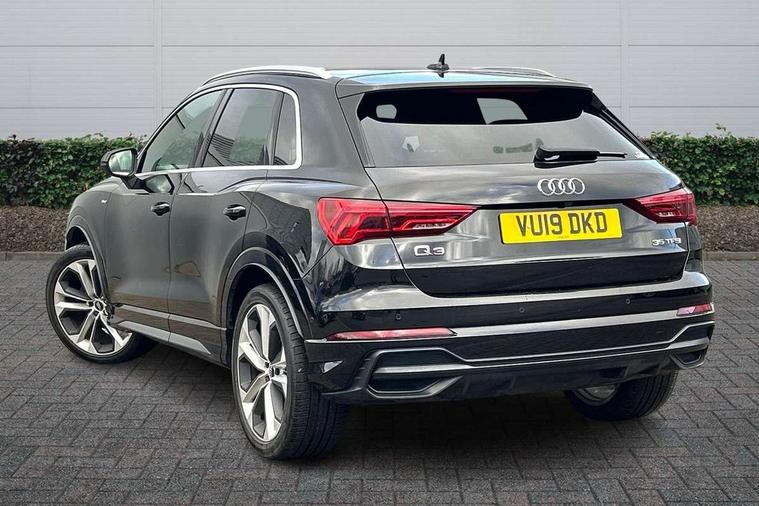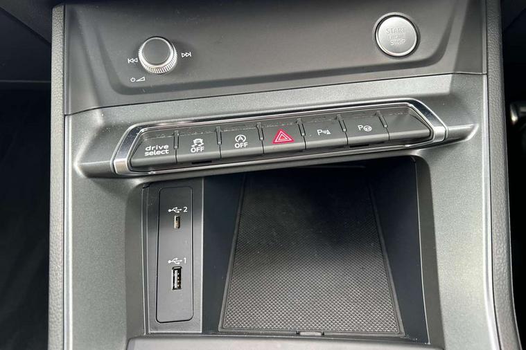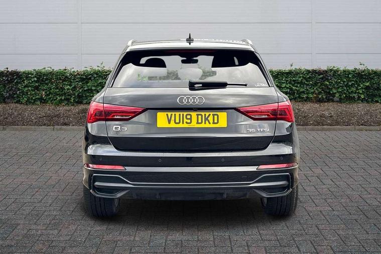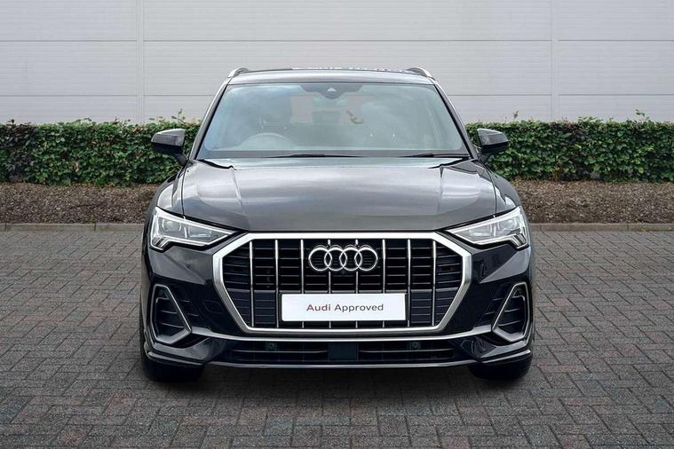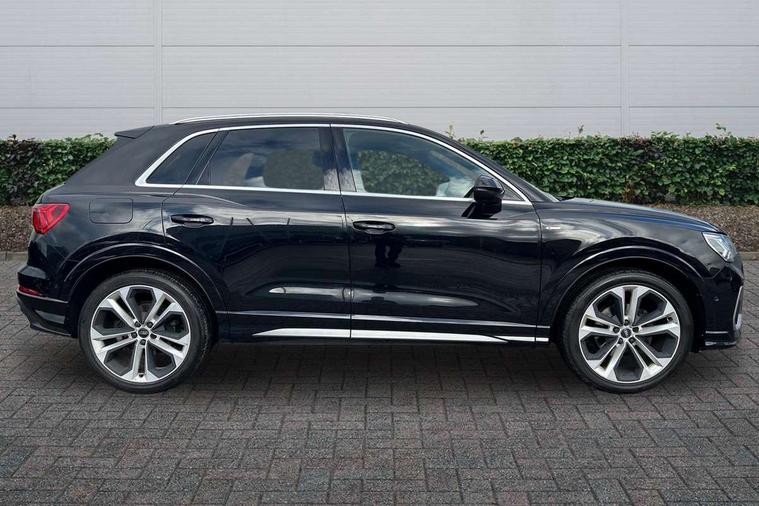 Audi connect safety and service (e-call), Audi drive select, Audi lane departure warning, Audi side assist, Audi smartphone interface, Audi Virtual Cockpit - 10.25" display, Bluetooth interface, MMI navigation plus with MMI touch, Power opening/closing tailgate, Progressive steering, Service interval indicator, Stop/start system, Voice control system, DAB digital radio module, Acoustic windscreen, Aluminium roof rails, Aluminium window trim, Auto dimming rear view mirror, Body colour door mirrors, Body coloured bumpers, Diffuser in matt Platinum grey, Electrically adjustable and heated door mirrors with integrated LED side indicators, Front and rear electric windows, Front fog lights, Front side air inlets in matt platinum grey, Front spoiler blade in matt platinum grey, Grille vertical bars in aluminium silver/Matt, High gloss black finish B and C pillars, Privacy glass, Rain and light sensors, Rear diffuser strip in selenite silver, S Line badge on wings, S Line front and rear bumpers, Side skirt insert in matt Platinium grey, Titanium black radiator grille, 12V socket in rear centre console, 40:20:40 split folding rear bench seat, Adjustable rear seat bench/backrest with centre armrest and cupholder, Aluminium door sill trims, Black cloth headlining, Dual zone climate control, Front and rear black floor mats with contrast stitching in rock grey, Front and rear headrests, Front centre armrest with storage compartment and angle adjustment, Illuminated door sill trims with S logo, ISOFIX child seat mounting and Top Tether with front passenger airbag deactivation, Perforated leather gearknob, Stainless steel luggage compartment sill finisher, Stainless steel pedals, Non smoking pack - Q3, 3x3 point rear seatbelts, 6 airbags - Driver, front passenger, curtain and side windows, Audi pre-sense front with pedestrain and cyclist recognition, Electronic stabilisation control including ABS, ASR and EDL, Hill hold assist, Pre sense basic, Seatbelt monitoring, Tyre pressure warning, Warning triangle and first aid kit, Anti theft alarm, Anti theft wheel bolts, Remote central locking, Dark matt brushed aluminium inlay, MMI touch colour display in gloss black with aluminium surround,