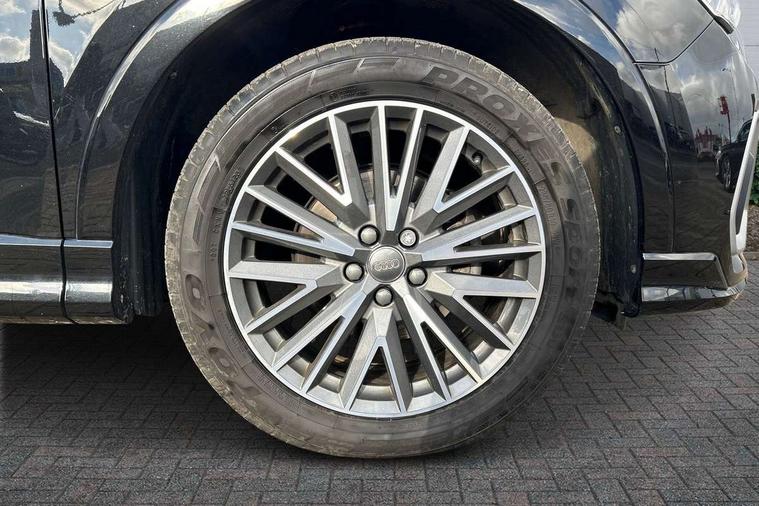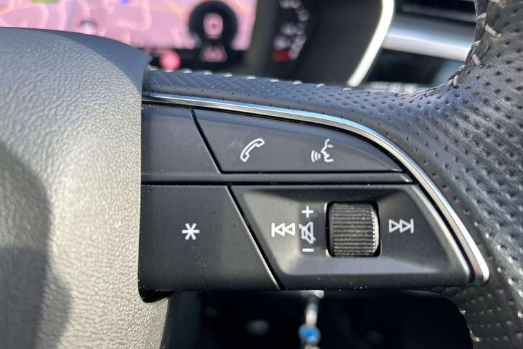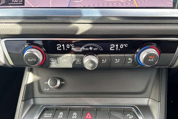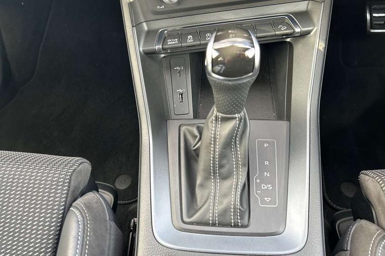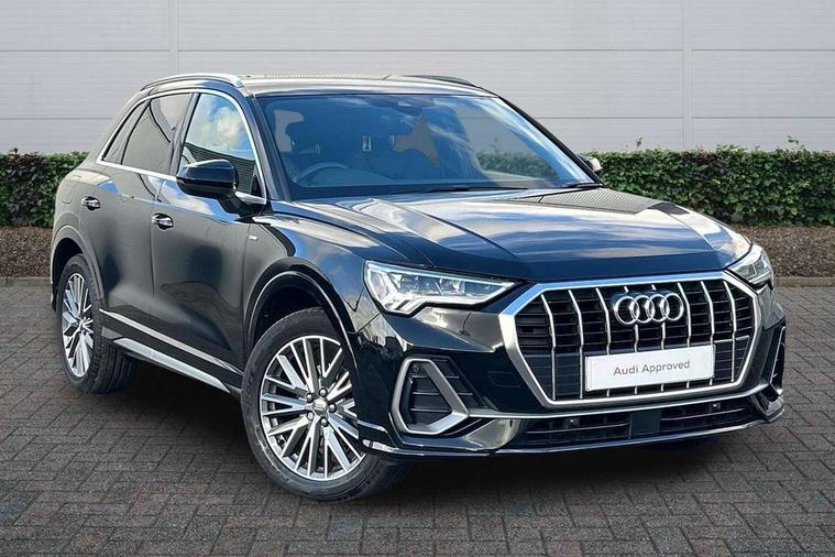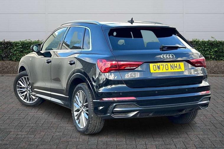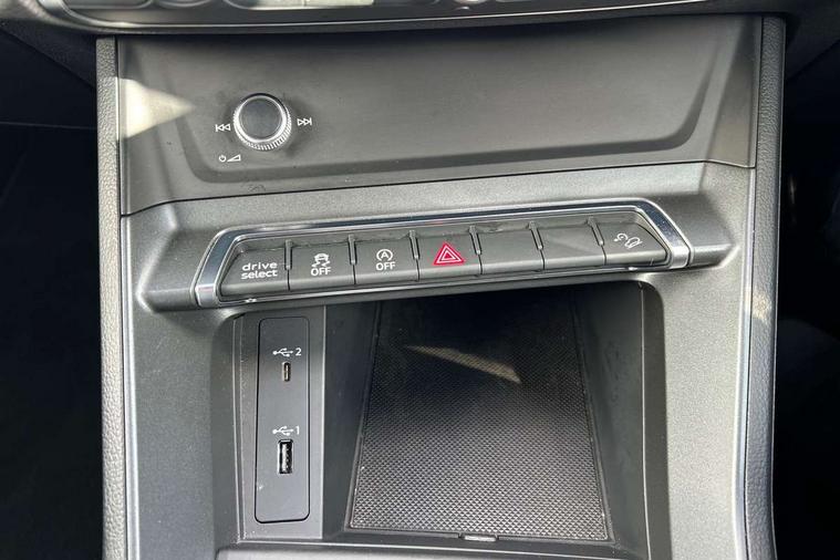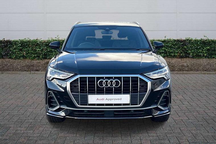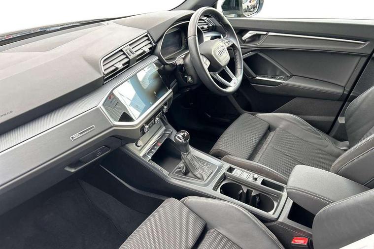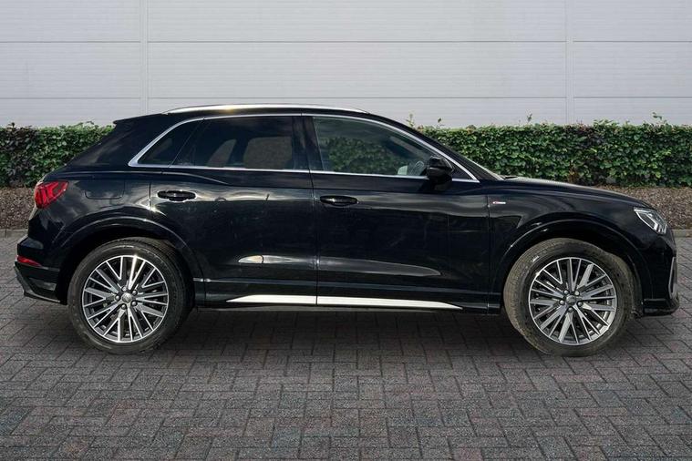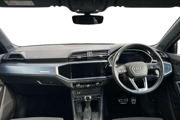 Audi connect safety and service (e-call), Audi drive select, Audi lane departure warning, Audi side assist, Audi Virtual Cockpit - 10.25" display, Bluetooth interface, Camera based traffic sign recognition, MMI Navigation Plus with high resolution 10.1 inch touchscreen colour display, Power operated tailgate, Progressive steering, Service interval indicator, Smartphone interface includes wireless Apple carplay/Android Auto, Start stop system with recuperation, Voice control system with natural language interaction, 48V Mild hybrid technology, Sports suspension, 1 x USB type C and 1 USB type A charging points, 6 passive loudspeakers, DAB digital radio module, Acoustic windscreen, Aluminium roof rails, Aluminium window trim, Auto dimming frameless rear view mirror, Body coloured bumpers, Electrically folding, adjustable and heated door mirrors with integrated LED side indicators and kerb view function for passenger side, Front and rear electric windows, Front fog lights, Front side air inlets in matt platinum grey, Front spoiler blade in matt platinum grey, Grille vertical bars in aluminium silver/Matt, High gloss black finish B and C pillars, LED headlights with LED daytime running lights and dynamic rear indicator, LED rear lights, Privacy glass dark tinted rear and rear-side windows (from B-pillar backwards), Rain and light sensors, Rear diffuser strip in matt titanium black, S line badges on front wings, S Line front and rear bumpers, Side skirt insert in matt Platinium grey, Silver chrome grille surround, Titanium black radiator grille, 12V socket in rear centre console, 40:20:40 folding with manual adjustment for 60:40 forwards/backwards position and backrest angle, Adjustable rear seat bench/backrest with centre armrest and cupholder, Black cloth headlining, Dual zone electronic climate control, Front and rear black floor mats with contrast stitching in rock grey, Front and rear headrests, Front and rear roof module including reading lights, Front centre armrest, Glove compartment lighting, Height and reach adjustable steering wheel, Illuminated door sill trims with S logo, ISOFIX child seat mounting for front passenger with airbag deactivation and outer rear seat including top tether attachment point for outer rear seats, Luggage compartment light, Manual front seats with height adjustment, Perforated leather gearknob, Stainless steel luggage compartment sill finisher, Stainless steel pedals, Non smoking pack - Q3, 3x3 point rear seatbelts, 6 airbags - Driver, front passenger, curtain and side windows, Audi pre-sense front with pedestrain and cyclist recognition, Electrically operated child locks on rear doors, Electromechanical parking brake, Electronic stabilisation control including ABS, ASR and EDL, Hill descent control, Hill hold assist, Pre sense basic, Seatbelt monitoring, Tyre pressure warning, Warning triangle and first aid kit, Anti theft alarm, Anti theft wheel bolts, Remote central locking, Dark matt brushed aluminium inlay, Detail dashboard around MMI touch colour display in glass look, black with surround in aluminium look, Leatherette door armrest, Tool kit, Tyre repair kit,