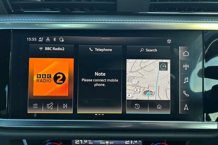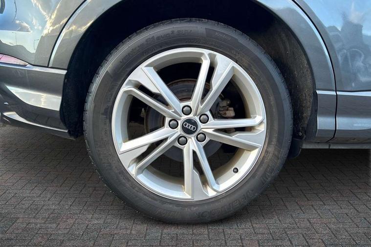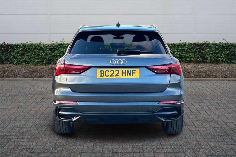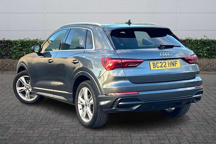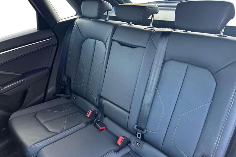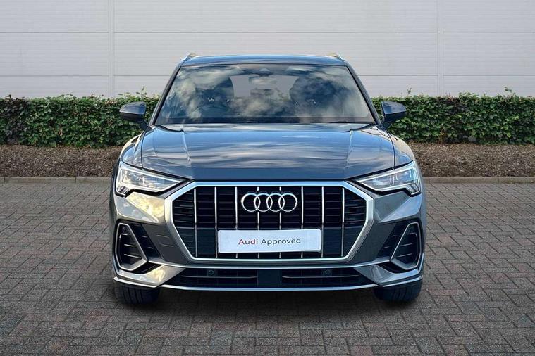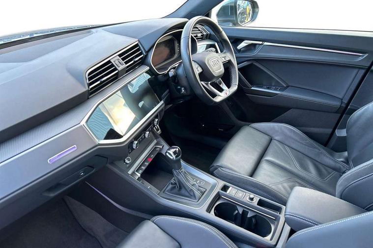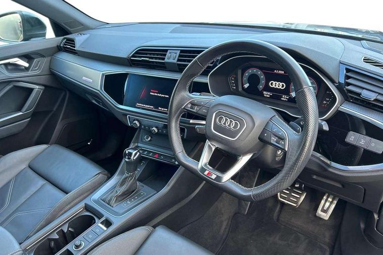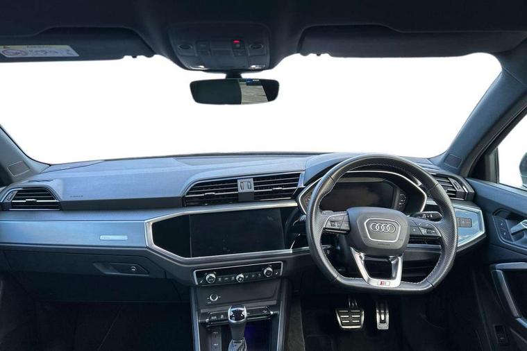 Amazon alexa Integration, Audi drive select, Audi lane departure warning, Audi Virtual Cockpit - 10.25" display, Bluetooth interface, Camera based traffic sign recognition, Legal emergency call, MMI Navigation Plus with high resolution 10.1 inch touchscreen colour display, Power operated tailgate, Progressive steering, Service interval indicator, Smartphone interface includes wireless Apple carplay/Android Auto, Start stop system with recuperation, Voice control system with natural language interaction, 48V Mild hybrid technology, Sports suspension, 2 USB-C ports with charge and data functions, 6 passive loudspeakers, DAB digital radio module, Acoustic windscreen, Aluminium roof rails, Aluminium window trim, Auto dimming frameless rear view mirror, Body coloured bumpers, Electrically folding, adjustable and heated door mirrors with integrated LED side indicators and kerb view function for passenger side, Front and rear electric windows, Front fog lights, Front side air inlets in matt platinum grey, Front spoiler blade in matt platinum grey, Grille vertical bars in aluminium silver/Matt, High gloss black finish B and C pillars, LED headlights with LED daytime running lights, LED rear lights, LED third brake light, Privacy glass dark tinted rear and rear-side windows (from B-pillar backwards), Rain and light sensors, Rear diffuser grille in grained matt black, Rear diffuser strip in matt titanium black, Rear side wing doors, Rear wiper, S line badges on front wings, S Line front and rear bumpers, Side skirt insert in matt Platinium grey, Titanium black radiator grille, Variable front intermittent wipers, 12V socket in rear centre console, 3 seat bench in 2nd row, 40:20:40 folding with manual adjustment for 60:40 forwards/backwards position and backrest angle, Adjustable rear seat bench/backrest with centre armrest and cupholder, Black cloth headlining, Dual zone electronic climate control, Front and rear black floor mats with contrast stitching in rock grey, Front and rear headrests, Front and rear roof module including reading lights, Front centre armrest, Glove compartment lighting, Height and reach adjustable steering wheel, Illuminated door sill trims with S logo, ISOFIX child seat mounting for front passenger with airbag deactivation and outer rear seat including top tether attachment point for outer rear seats, Luggage compartment light, Manual front seats with height adjustment, Perforated leather gearknob, Single front passenger seat, Stainless steel luggage compartment sill finisher, Stainless steel pedals, Non smoking pack - Q3, 3x3 point rear seatbelts, 6 airbags - Driver, front passenger, curtain and side windows, Audi pre-sense front with pedestrain and cyclist recognition, Electromechanical parking brake, Electronic stabilisation control including ABS, ASR and EDL, Front seatbelt reminder, Hill descent control, Hill hold assist, Manual child lock in rear doors, Pre sense basic, Seatbelt monitoring, Tyre pressure warning, Warning triangle and first aid kit, Anti theft alarm, Anti theft wheel bolts, Immobiliser, Remote central locking, Dark matt brushed aluminium inlay, Detail dashboard around MMI touch colour display in glass look, black with surround in aluminium look, Leatherette door armrest, Tool kit, Tyre repair kit,