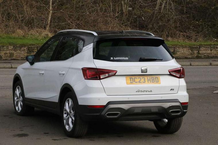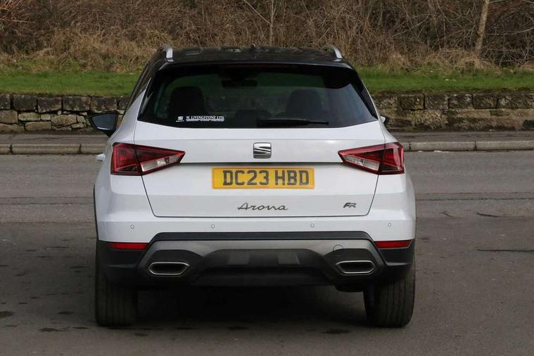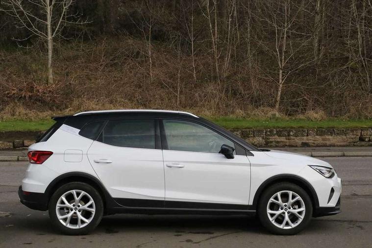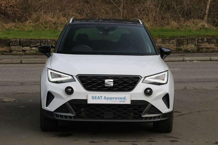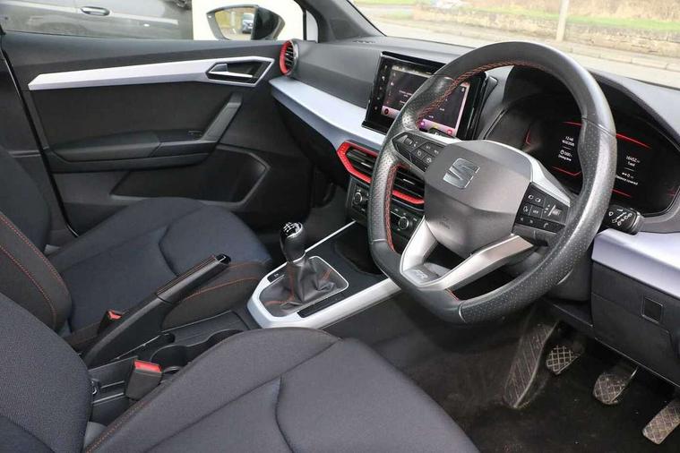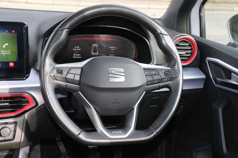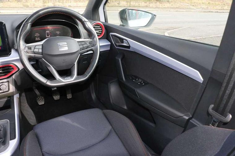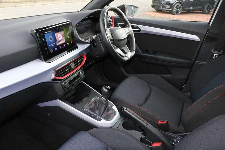 'Lights On' Reminder warning buzzer, 8" Digital cockpit, Digital clock, E-call, Electric speed sensitive power steering, Full Link Smartphone Integration with Mirror Link, Apple Car Play, Google Android Auto with USB Type C cable for Apple and Android compatibility, Lane keeping system, Low fuel warning light, Outside temperature display, Rear parking sensor, RPM counter, Seat connect with safety, service, remote and online, SEAT Drive profile - Four different models normal-sport-eco-individual, steering response, throttle response, Trip computer, Wireless phone charger, 9.2" colour touchscreen with navigation system, voice control and USB port (type c), Bluetooth interface for hands free and audio streaming, DAB digital radio and AM/FM radio, Steering wheel mounted audio controls, Anti theft roof antenna, Auto dimming interior rear view mirror, Automatic activation of hazard warning lights, Body coloured bumpers, Body coloured door handle inserts, Chrome roof rails and window surrounds, Dark tinted rear windows, Electric front/rear windows, Electrically adjustable, heated and folding door mirrors, Front fog lights with cornering function and rear fog light, FULL LED automatic headlights with dynamic headlight range control, coming and leaving home, LED daytime running lights, LED rear tail lights and licence plate lights, Protective side mouldings, Rain sensing wipers, Rear side wing doors, Rear spoiler, Rear window wash/wipe, Roof colour door mirrors, Third brake light, Twin exhaust pipe styling hidden exhaust pipe, Visible VIN plate, Windshield wiper with intermittent control and potentiometer, 2 cupholders, 3 seat bench in 2nd row, 60/40 split folding rear seat, Aircare filter, Black interior roof, Cloth upholstery, Double boot floor, Driver sunvisor with covered mirror + card holder, Dual zone climate control, Front courtesy light with front reading lights, Front sport seats, Gear shift indicator, Height adjustable front seats, Height/reach adjustable steering column, Illuminated boot, Instrument lighting with brightness control, Interior ambient lighting, Interior light in footwell, central console and door panel, ISOFIX points in outer rear seats with top tether anchorage points, Passenger sunvisor with vanity mirror, Perforated flat bottomed leather steering wheel/gear knob/handbrake with red stitching and FR logo, Single front passenger seat, Two front and three rear height adjustable headrests, Interior chrome pack - Arona, 3 point seatbelts on all rear seats, ABS, Active front headrests, Child locks on rear doors, Driver and front passenger airbags with front passenger airbag de activation, front side and curtain airbags, Electronic stability control, Emergency Brake Assist (EBA) and front assist, Front and rear seatbelt reminder, Hill hold control, Multi-Collision braking, Tiredness recognition system, Traction control, Tyre pressure monitoring system, Alarm with back-up horn, Electronic engine immobiliser, Locking wheel bolts, Remote central locking + deadlocks, Tow away protection, Titan black dashboard, 17" Dynamic alloy wheels,
