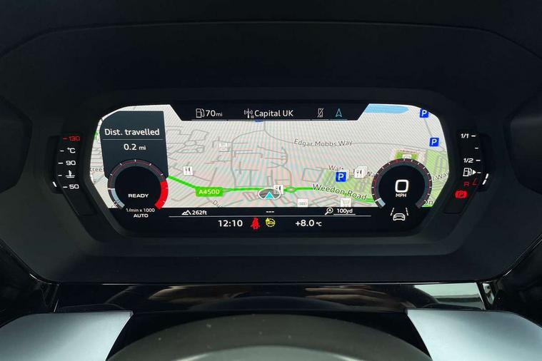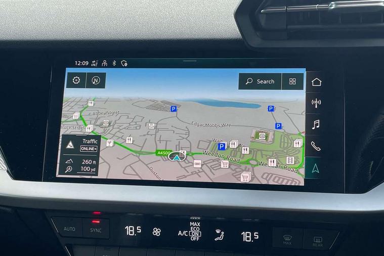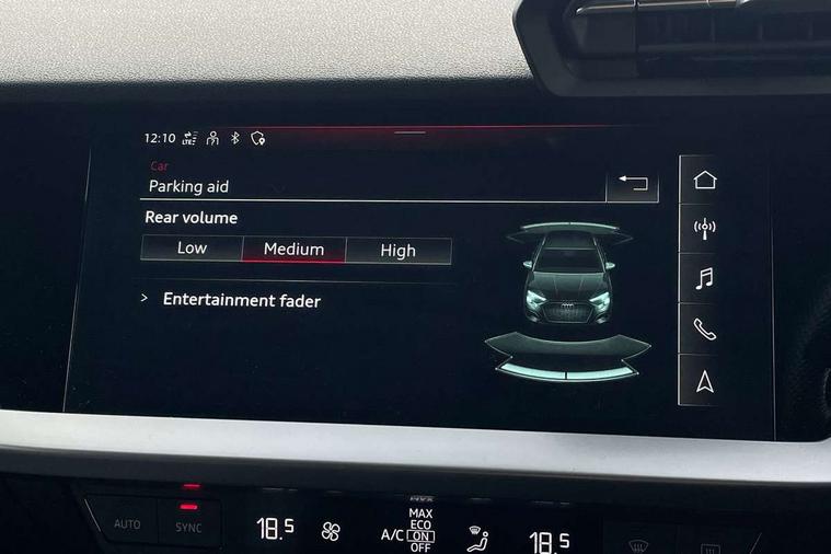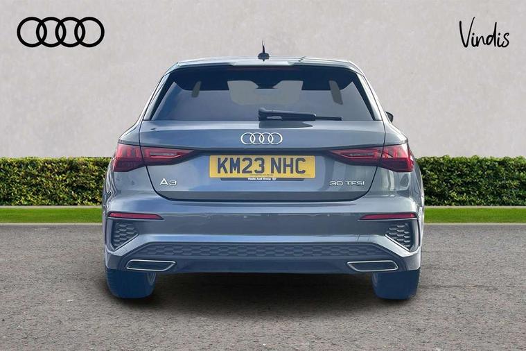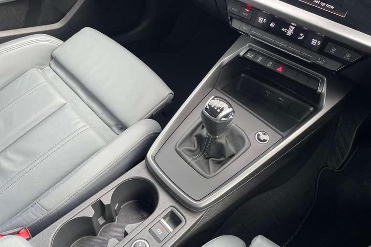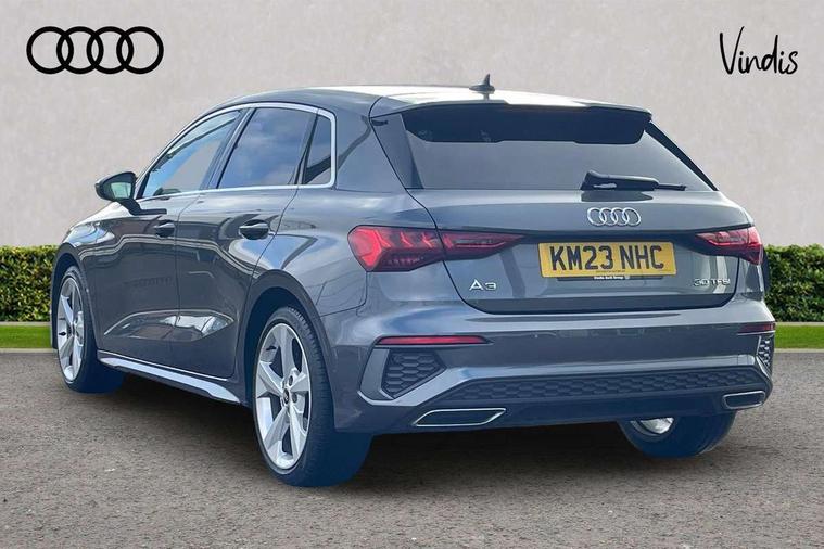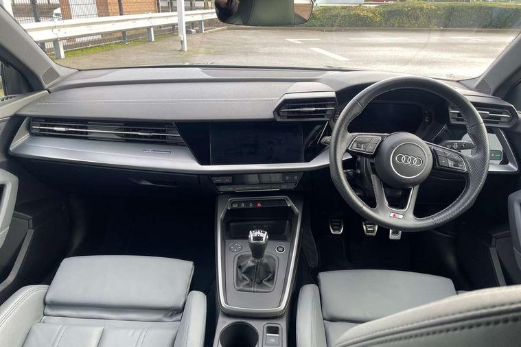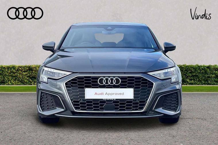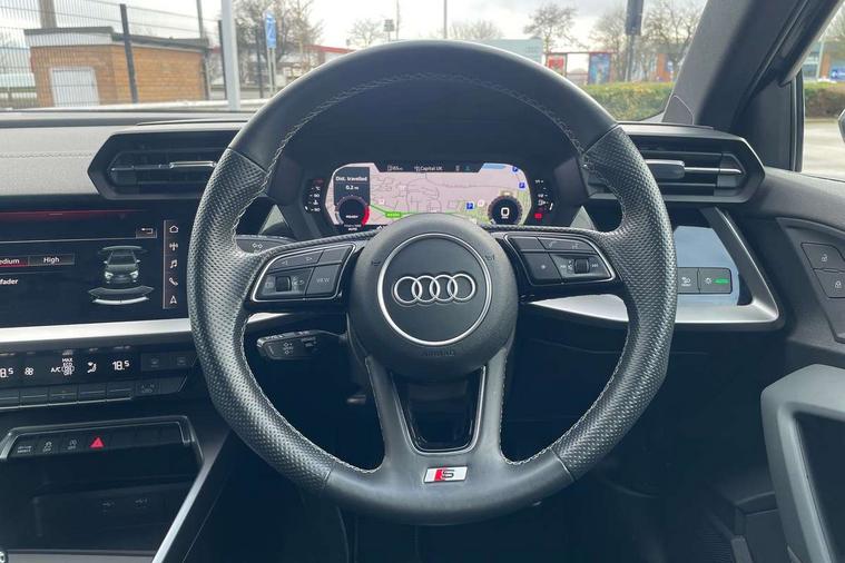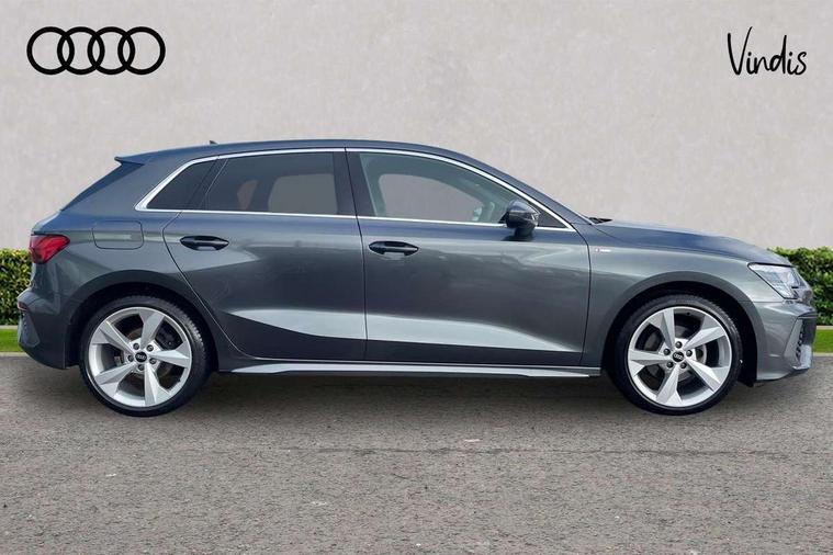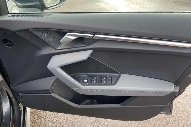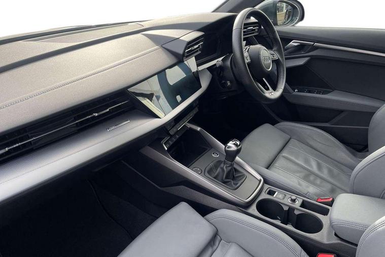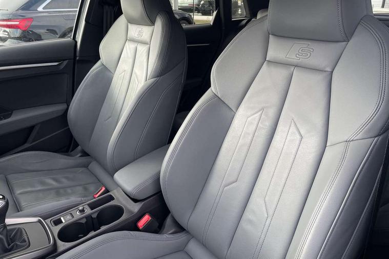 Audi drive select (Auto, Comfort, Dynamic and Individual), Audi smartphone interface, Audi Virtual Cockpit - 10.25" digital and colour instrument cluster, Automatic start/stop system with recuperation, Bluetooth interface, Camera based traffic sign recognition, Collision avoidance assistant, Cruise control, e-Call (emergency call), Electromechanical power speed sensitive steering, Lane departure warning system, MMI Navigation Plus with high resolution 10.1" colour touch screen display, Rear parking sensors, Service indicator, Trip computer, Voice control system with natural language interaction, Sports suspension, 2xUSB-C connection with data and charging functions, 6 passive loudspeakers, DAB Digital radio, 3rd brake light, Acoustic glass windscreen, Aluminium window trim, Auto dimming frameless rear view mirror, Body colour exterior mirrors, Electrically adjustable/heated/folding/auto dimming door mirrors with integrated LED indications + kerb view function for passenger side, Front electric windows, Illuminated aluminium inserts front door sills with S logo, LED daytime running lights, LED headlights with LED rear lights and dynamic rear indicators, Light and rain sensors, Privacy glass - dark tinted rear window, rear door and side windows, Rear electric windows, Rear side air outlets in grained matt black, Rear side wing doors, Rear wiper, S line bumpers, S roof spoiler, 12V socket and storage compartment in front centre console, 3 seat bench in 2nd row, 3 spoke leather multifunction steering wheel, 4 way electrically adjustable lumbar support for driver and front passenger, 60/40 split folding rear seat bench, Black cloth headlining, Dual zone electronic climate control, Front and rear centre armrest in leather, Front and rear headrests, Front/rear floor mats, Height and reach adjustable steering wheel, Interior lighting - glove compartment light and right hand side, Luggage compartment floor covering, Manual boot compartment lid, Manually adjustable front seats, Seat side bolsters, Single front passenger seat, Stainless steel pedals and front footrest in black, Twin leather upholstery with front sports seats S embossed logo, Aluminium interior elements pack - A3 Sportback, LED interior lighting pack - A3 Sportback, S line styling pack - A3 Sportback, 3x3 point rear seat belts, Driver and front passenger airbag with passenger airbag deactivation, Electronic Stabilisation Control (ESC) including ABS, ASR and EDL, First aid kit with warning triangle and 2 safety vests, Front side airbags with head airbags and interaction airbag, Pre-sense front with pedestrian and cyclist detection, Seatbelt monitoring, Tyre pressure loss indicator, Anti theft alarm, Anti-theft wheel bolts, Electronically operated child lock, Immobiliser, Remote control central locking, Dark spectrum aluminium inlays, accent surfaces in the dashboard and centre console in platinum grey silk effect paint finish,