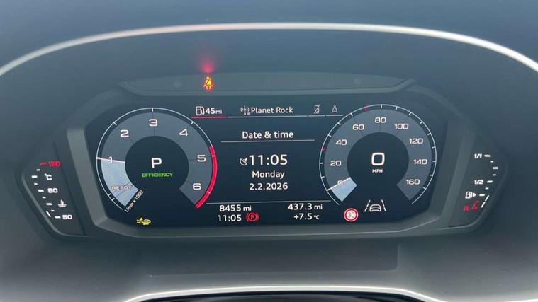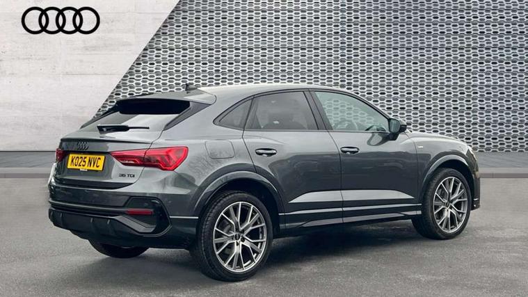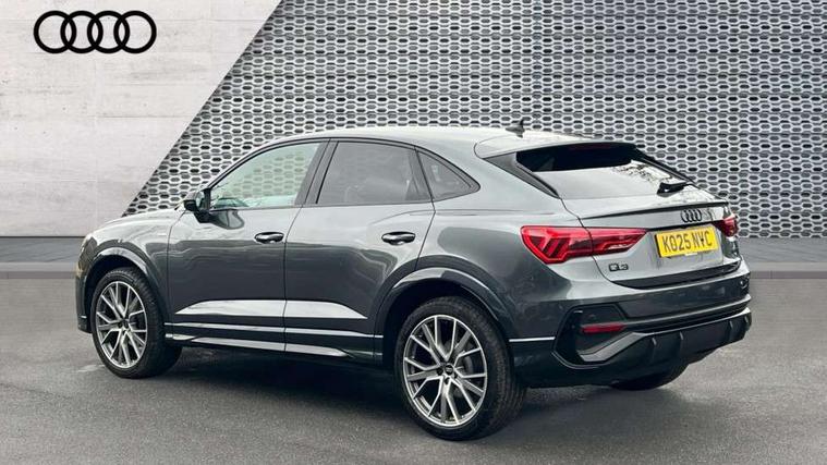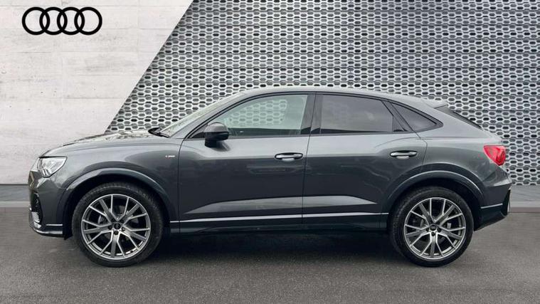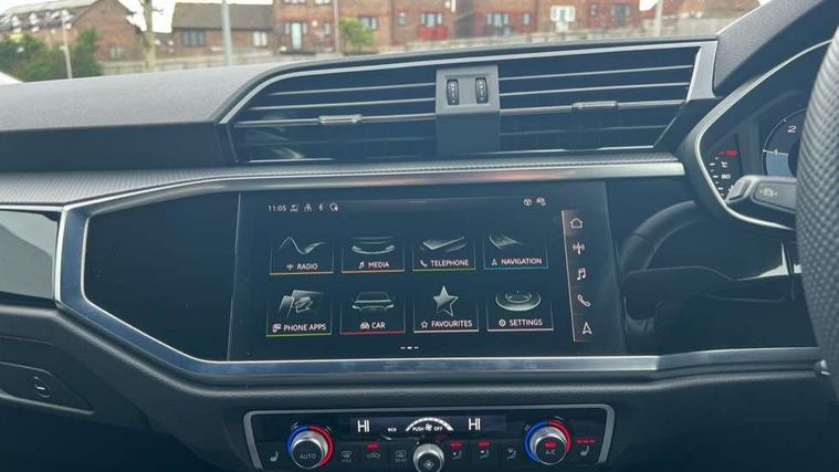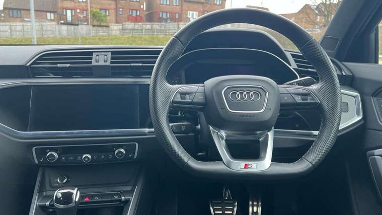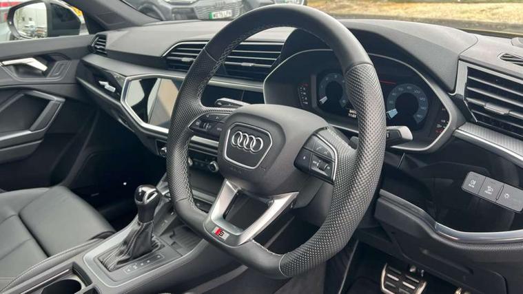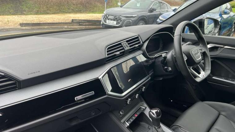 Audi connect safety and service, Audi drive select, Audi lane departure warning, Audi Virtual Cockpit - 10.25" display, Bluetooth interface, Camera based traffic sign recognition, Distraction and Fatigue warning, Legal emergency call, MMI Navigation Plus with high resolution 10.1 inch touchscreen colour display, Power operated tailgate, Progressive steering, Service interval indicator, Smartphone interface includes wireless Apple carplay/Android Auto, Start stop system with recuperation, Voice control system with natural language interaction, Diesel particulate filter, Sports suspension, 2 USB-C ports with charge and data functions, 6 passive loudspeakers, DAB digital radio module, Acoustic windscreen, Audi Beam uses LEDs to project the Audi logo onto the ground as you exit your Q3, Auto dimming door mirrors, Auto dimming frameless rear view mirror, Electrically folding, adjustable and heated door mirrors with integrated LED side indicators and kerb view function for passenger side, Front and rear electric windows, Front fog lights, Front underbody protection in manhattan grey paint finish, High gloss black finish B and C pillars, Honeycomb design radiator grille in matt anthracite black, LED Dynamic rear indicators, LED headlights with LED daytime running lights, LED rear lights, LED third brake light, Privacy glass dark tinted rear and rear-side windows (from B-pillar backwards), Rain and light sensors, Rear diffuser grille in grained matt black, Rear diffuser strip in matt anthracite black, Rear side wing doors, Rear underbody protection in matt black, Rear wiper, S line front and rear bumpers and side skirts in contrasting Manhattan grey paint finish, Variable front intermittent wipers, 12V socket in rear centre console, 3 seat bench in 2nd row, 40:20:40 folding with manual adjustment for 60:40 forwards/backwards position and backrest angle, Adjustable rear seat bench/backrest with centre armrest and cupholder, Black carpet mats, Black cloth headlining, Dual zone electronic climate control, Electric lumbar support, Front and rear black floor mats with contrast stitching in rock grey, Front and rear headrests, Front centre armrest, Height and reach adjustable steering wheel, Illuminated door sill trims with S logo, ISOFIX child seat mounting for front passenger with airbag deactivation and outer rear seat including top tether attachment point for outer rear seats, Luggage compartment sill protection in stainless steel, Manual front seats with height adjustment, Perforated leather gearknob, Single front passenger seat, Stainless steel pedals, Twin leather upholstery with front sport seats + S embossing, Black styling pack - Q3, Non smoking pack - Q3, 3x3 point rear seatbelts, 6 airbags - Driver, front passenger, curtain and side windows, Audi pre-sense front with pedestrain and cyclist recognition, Electrically operated child locks on rear doors, Electromechanical parking brake, Electronic stabilisation control including ABS, ASR and EDL, Front seatbelt reminder, Hill descent control, Hill hold assist, Pre sense basic, Seatbelt monitoring, Tyre pressure warning, Warning triangle and first aid kit, Anti theft wheel bolts, Immobiliser, Remote central locking, Thatcham approved category 1 anti theft alarm, Aluminium look interior elements, Detail dashboard around MMI touch colour display in glass look, black with surround in aluminium look, Leatherette door armrest, Piano black inlay,