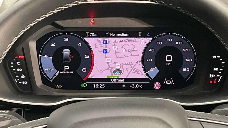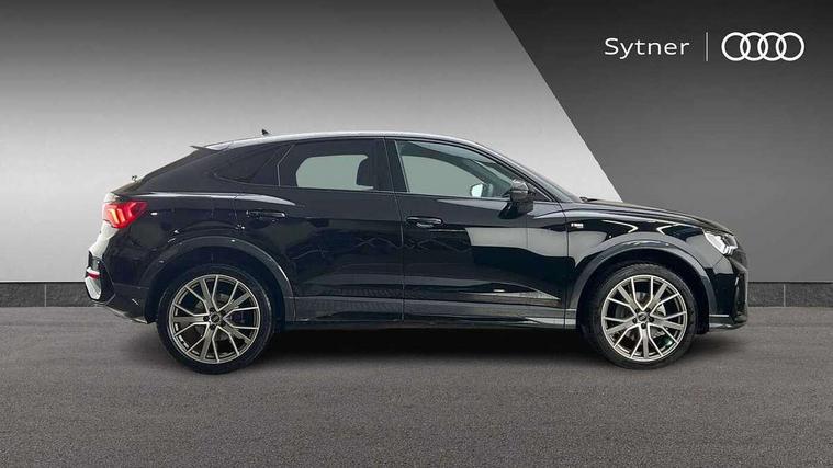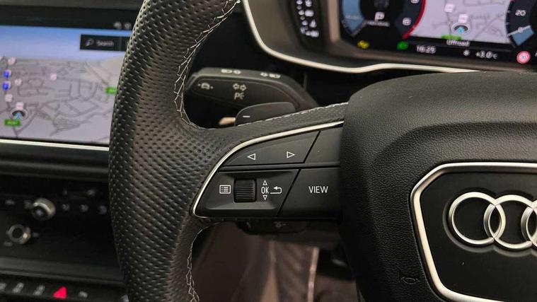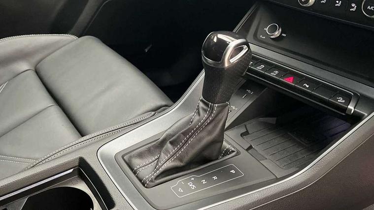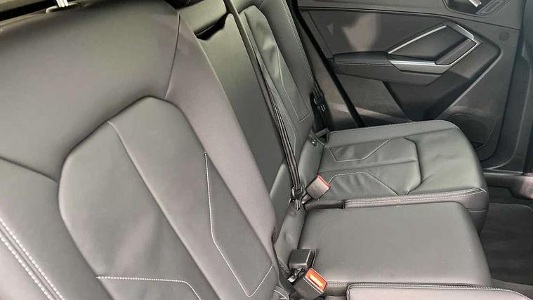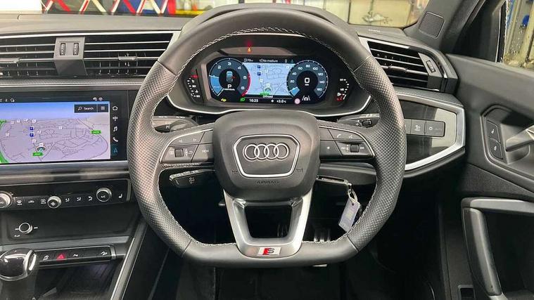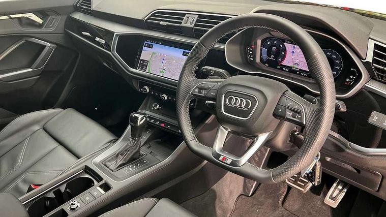 Audi connect safety and service, Audi drive select, Audi lane departure warning, Audi Virtual Cockpit - 10.25" display, Bluetooth interface, Camera based traffic sign recognition, Distraction and Fatigue warning, Legal emergency call, MMI Navigation Plus with high resolution 10.1 inch touchscreen colour display, Power operated tailgate, Progressive steering, Service interval indicator, Smartphone interface includes wireless Apple carplay/Android Auto, Start stop system with recuperation, Voice control system with natural language interaction, Diesel particulate filter, Sports suspension, 2 USB-C ports with charge and data functions, 6 passive loudspeakers, DAB digital radio module, Acoustic windscreen, Audi Beam uses LEDs to project the Audi logo onto the ground as you exit your Q3, Auto dimming door mirrors, Auto dimming frameless rear view mirror, Electrically folding, adjustable and heated door mirrors with integrated LED side indicators and kerb view function for passenger side, Front and rear electric windows, Front fog lights, Front underbody protection in manhattan grey paint finish, High gloss black finish B and C pillars, Honeycomb design radiator grille in matt anthracite black, LED Dynamic rear indicators, LED headlights with LED daytime running lights, LED rear lights, LED third brake light, Privacy glass dark tinted rear and rear-side windows (from B-pillar backwards), Rain and light sensors, Rear diffuser grille in grained matt black, Rear diffuser strip in matt anthracite black, Rear side wing doors, Rear underbody protection in matt black, Rear wiper, S line front and rear bumpers and side skirts in contrasting Manhattan grey paint finish, Variable front intermittent wipers, 12V socket in rear centre console, 3 seat bench in 2nd row, 40:20:40 folding with manual adjustment for 60:40 forwards/backwards position and backrest angle, Adjustable rear seat bench/backrest with centre armrest and cupholder, Black carpet mats, Black cloth headlining, Dual zone electronic climate control, Electric lumbar support, Front and rear black floor mats with contrast stitching in rock grey, Front and rear headrests, Front centre armrest, Height and reach adjustable steering wheel, Illuminated door sill trims with S logo, ISOFIX child seat mounting for front passenger with airbag deactivation and outer rear seat including top tether attachment point for outer rear seats, Luggage compartment sill protection in stainless steel, Manual front seats with height adjustment, Perforated leather gearknob, Single front passenger seat, Stainless steel pedals, Twin leather upholstery with front sport seats + S embossing, Black styling pack - Q3, Non smoking pack - Q3, 3x3 point rear seatbelts, 6 airbags - Driver, front passenger, curtain and side windows, Audi pre-sense front with pedestrain and cyclist recognition, Electrically operated child locks on rear doors, Electromechanical parking brake, Electronic stabilisation control including ABS, ASR and EDL, Front seatbelt reminder, Hill descent control, Hill hold assist, Pre sense basic, Seatbelt monitoring, Tyre pressure warning, Warning triangle and first aid kit, Anti theft wheel bolts, Immobiliser, Remote central locking, Thatcham approved category 1 anti theft alarm, Aluminium look interior elements, Detail dashboard around MMI touch colour display in glass look, black with surround in aluminium look, Leatherette door armrest, Piano black inlay,