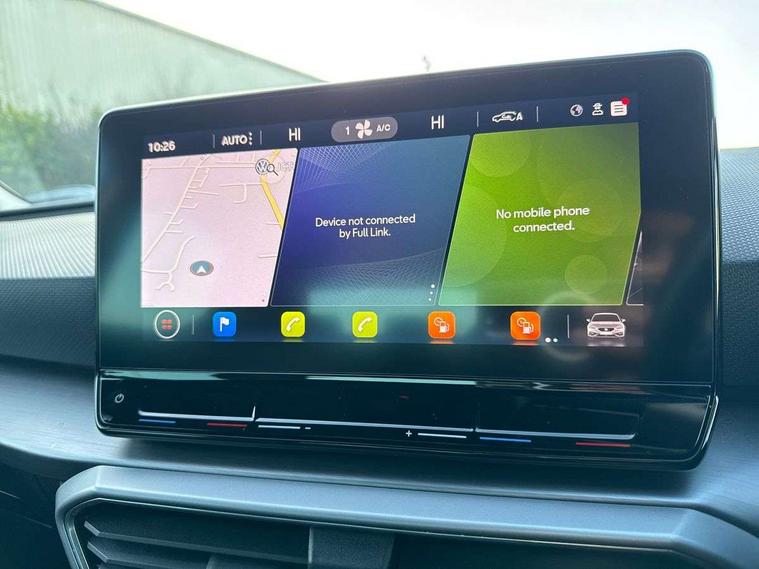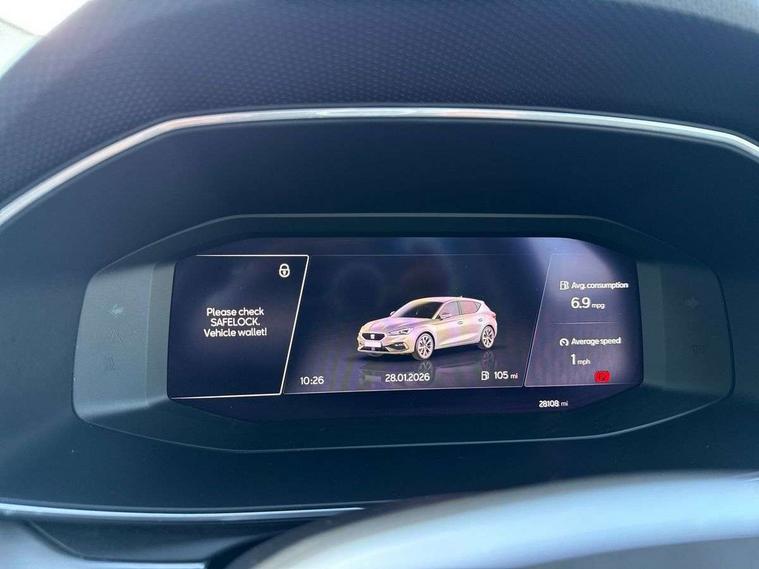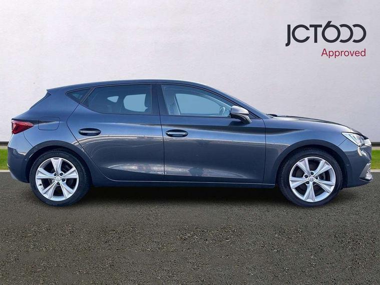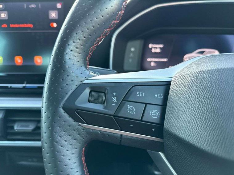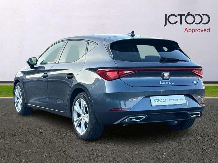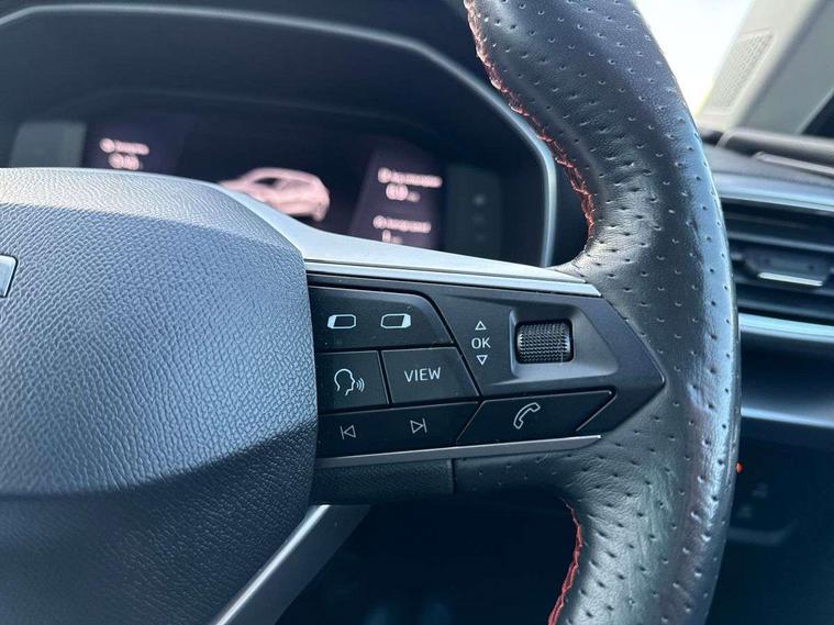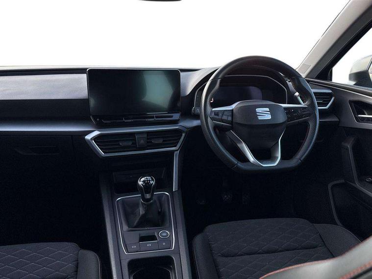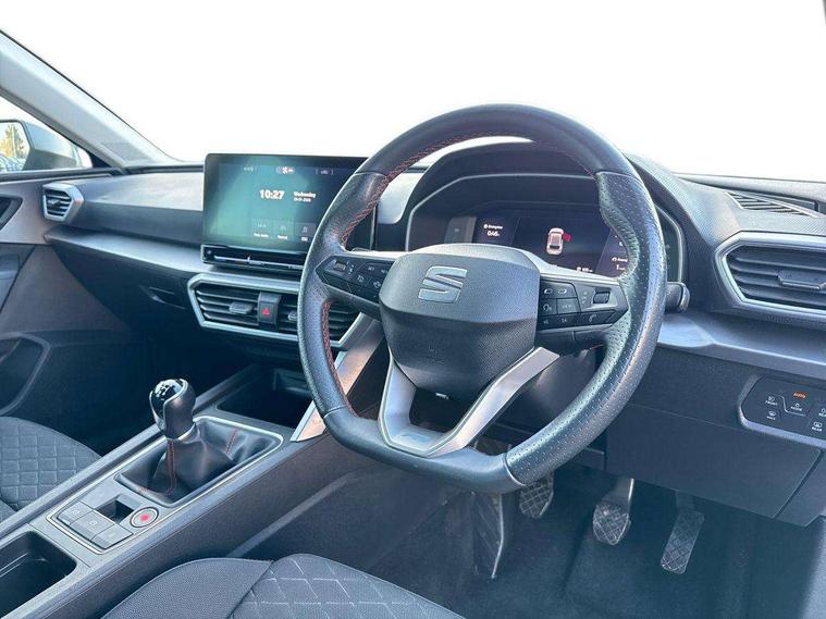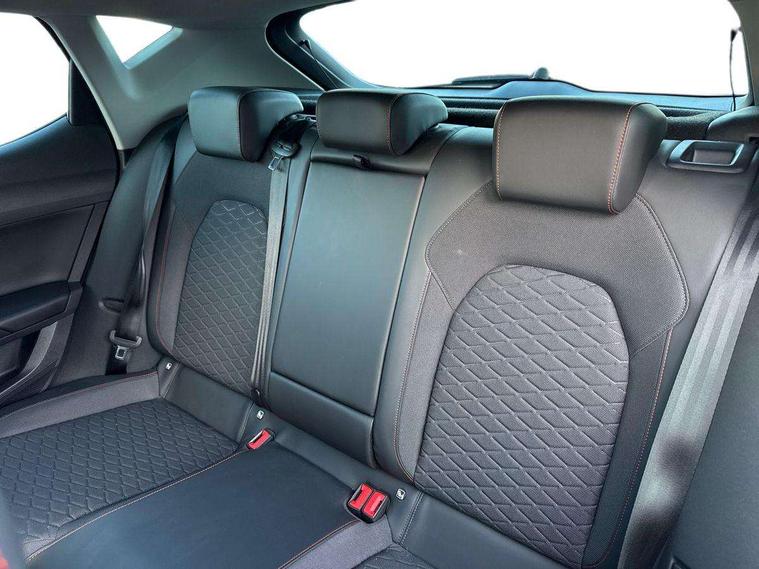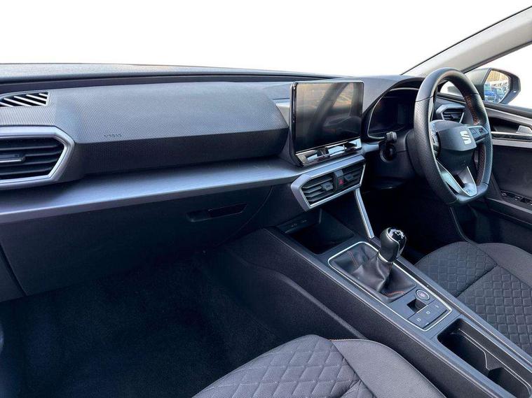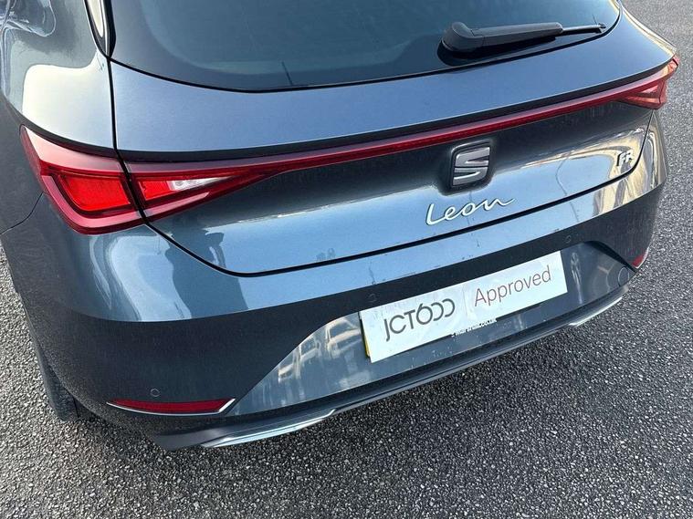 Digital cockpit, Front assist with forward collision warning braking reaction to vehicles, pedestrians and cyclists, Full link smartphone integration with Mirror Link, wireless Apple CarPlay and wired Google Android Auto, Lane assist, Lockable tailgate, Park assist (inc front/rear parking sensors), Power assisted speed sensitive electro-mechanical steering, RPM, trip computer, outside temp gauge, instrument light brightness, low fuel warning light, lights on reminder, gearshift indicator, SEAT drive profile with 4 modes (Eco/Normal/Sport/Individual), throttle response, Service interval indicator, Start/stop system with regenerative braking, Sports suspension, XDS electronic differential lock and dynamic traction support, 7 speakers, Auxiliary input socket, Auto dimming rear view mirror, Body colour door handles, Body coloured bumpers, Cosmo grey exterior mirrors with integrated LED indicators, Dark tinted rear windows, Electric front/rear windows, Electrically adjustable, heated and folding door mirrors, FR sports bumper, Illuminated front door sill, LED front fog lamps with cornering function, LED headlights and tail lights with dynamic turn signals, welcome light silhouette from exterior mirrors and dynamic headlight range control, LED rear fog lamp, Rain sensing wipers, Rear wash/wipe, Separate daytime running light with automatic headlight control and coming home feature, 12v power point in centre console, 60/40 split rear bench seat with armrest, Ambient lighting with glovebox, footwell and single monocolour, Cloth upholstery, Driver/passenger manual seat height adjustment, Dust/pollen filter, Flat bottomed perforated leather steering wheel with red stitching and FR logo and leather gear stick, Folding boot cover, Four x USB Type C ports, Front and rear height adjustable headrests, Front and rear reading lights X 4, Front centre armrest, Front seatback storage pockets, Height/reach adjust steering wheel, ISOFIX points in outer rear seats with top tether anchorage points, Luggage tie-down hooks, Lumbar adjustment for front seats, Sunvisors with covered illuminated mirror, Three zone climate control, Media system plus with navigation - Leon, 3 point seatbelts on all rear seats, ABS, Brake control system - ESC and brake booster, Child proof door locks, Driver and front passenger airbags with front passenger airbag de-activation, front side and curtain airbags, Electronic parking brake, Extended safety system - seat belt tensioner, window closure and hazard lights, Hill hold control, Rear disc brakes, Seat belt reminder for front and rear seats, Tiredness recognition system, driver alert system, Tyre pressure monitoring system, Anti theft alarm system with interior monitoring in cab, backup horn and towing protection, KESSY Go (Keyless start), Locking wheel bolts, Wireless phone charging, Chrome interior detailing, 17" Dynamic Bi-spoke alloy wheels with 91W tyres, Tool kit,