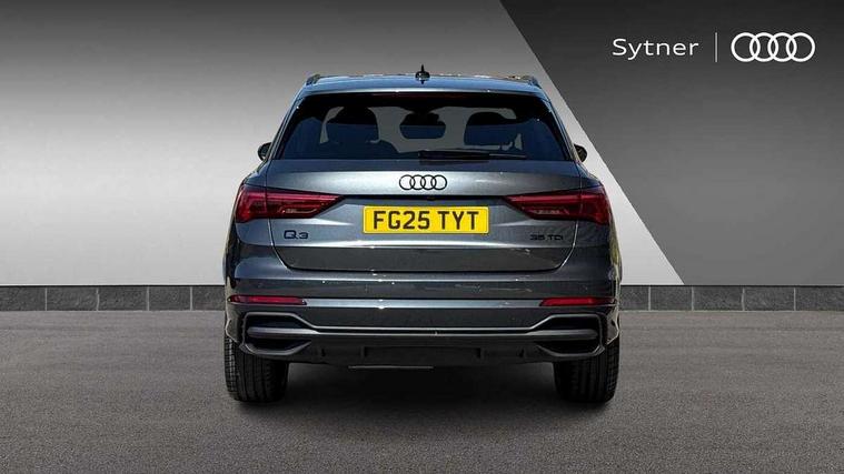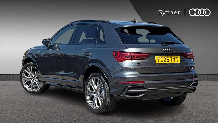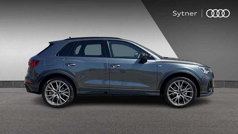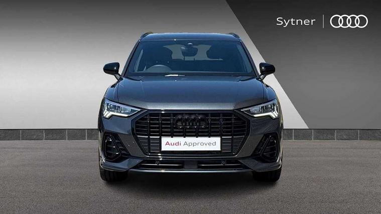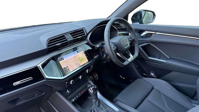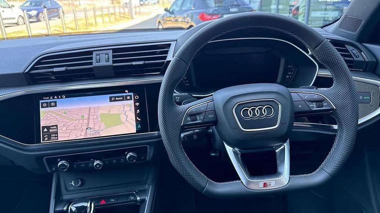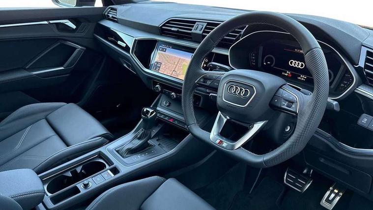 Amazon alexa Integration, Audi connect safety and service, Audi drive select, Audi lane departure warning, Audi Virtual Cockpit - 10.25" display, Bluetooth interface, Camera based traffic sign recognition, Distraction and Fatigue warning, Legal emergency call, MMI Navigation Plus with high resolution 10.1 inch touchscreen colour display, Power operated tailgate, Progressive steering, Service interval indicator, Smartphone interface includes wireless Apple carplay/Android Auto, Start stop system with recuperation, Voice control system with natural language interaction, Diesel particulate filter, Sports suspension, 2 USB-C ports with charge and data functions, 6 passive loudspeakers, DAB digital radio module, Acoustic windscreen, Anthracite black radiator grille, Audi Beam uses LEDs to project the Audi logo onto the ground as you exit your Q3, Auto dimming door mirrors, Auto dimming frameless rear view mirror, Black roof rails, Electrically folding, adjustable and heated door mirrors with integrated LED side indicators and kerb view function for passenger side, Front and rear electric windows, Front fog lights, Grille vertical bars in aluminium silver/Matt, High gloss black finish B and C pillars, LED Dynamic rear indicators, LED headlights with LED daytime running lights, LED rear lights, LED third brake light, Privacy glass dark tinted rear and rear-side windows (from B-pillar backwards), Rain and light sensors, Rear diffuser grille in grained matt black, Rear diffuser strip in matt anthracite black, Rear side wing doors, Rear wiper, S line bumpers in contrasting Manhattan grey, Variable front intermittent wipers, 12V socket in rear centre console, 3 seat bench in 2nd row, 40:20:40 folding with manual adjustment for 60:40 forwards/backwards position and backrest angle, Adjustable rear seat bench/backrest with centre armrest and cupholder, Black carpet mats, Black cloth headlining, Dual zone electronic climate control, Electric lumbar support, Front and rear black floor mats with contrast stitching in rock grey, Front and rear headrests, Front centre armrest, Height and reach adjustable steering wheel, Illuminated door sill trims with S logo, ISOFIX child seat mounting for front passenger with airbag deactivation and outer rear seat including top tether attachment point for outer rear seats, Luggage compartment sill protection in stainless steel, Manual front seats with height adjustment, Perforated leather gearknob, Single front passenger seat, Stainless steel pedals, Twin leather upholstery with front sport seats + S embossing, Black styling pack - Q3, Non smoking pack - Q3, 3x3 point rear seatbelts, 6 airbags - Driver, front passenger, curtain and side windows, Audi pre-sense front with pedestrain and cyclist recognition, Electrically operated child locks on rear doors, Electromechanical parking brake, Electronic stabilisation control including ABS, ASR and EDL, Front seatbelt reminder, Hill descent control, Hill hold assist, Pre sense basic, Seatbelt monitoring, Tyre pressure warning, Warning triangle and first aid kit, Anti theft wheel bolts, Immobiliser, Remote central locking, Thatcham approved category 1 anti theft alarm, Aluminium look interior elements, Detail dashboard around MMI touch colour display in glass look, black with surround in aluminium look, Leatherette door armrest, Piano black inlay,