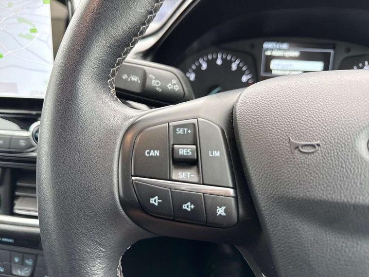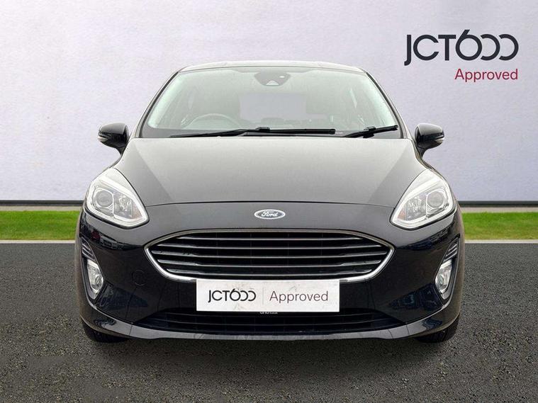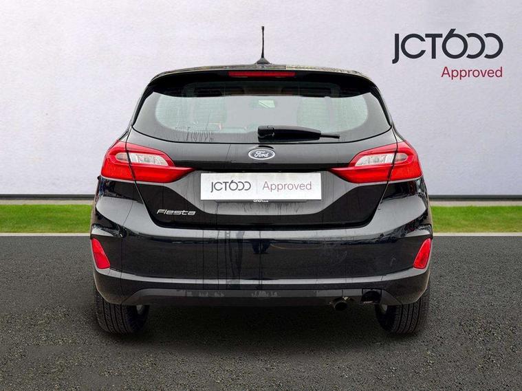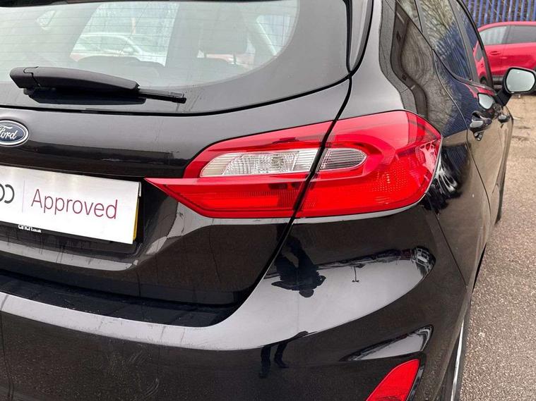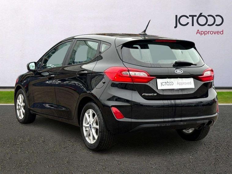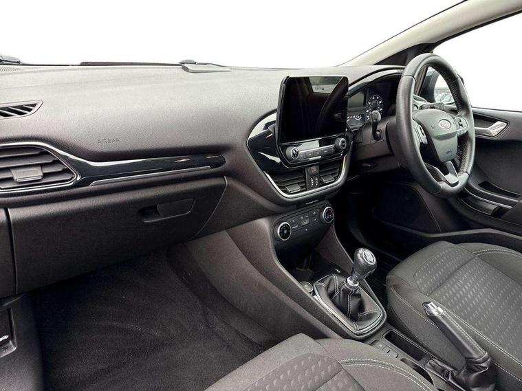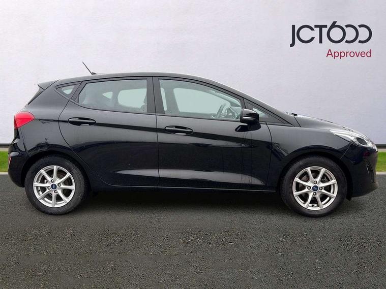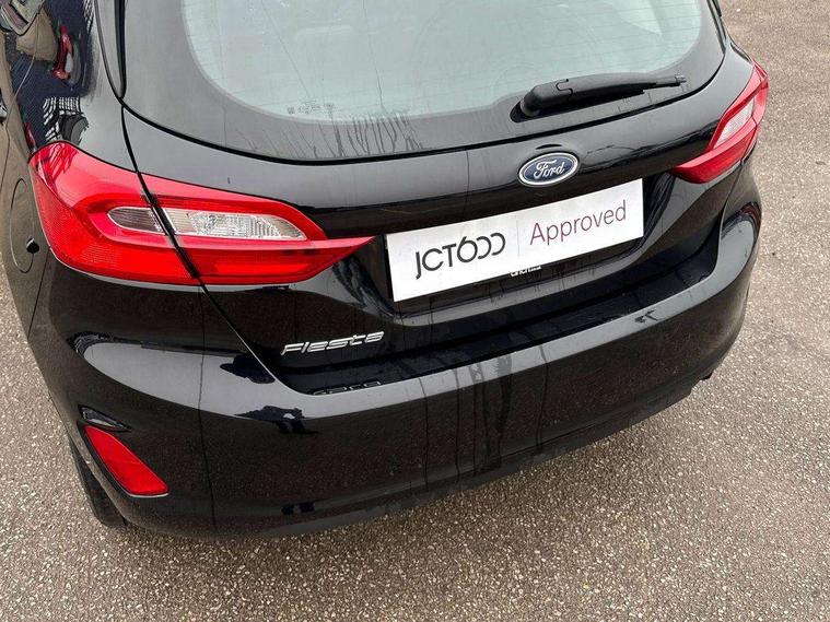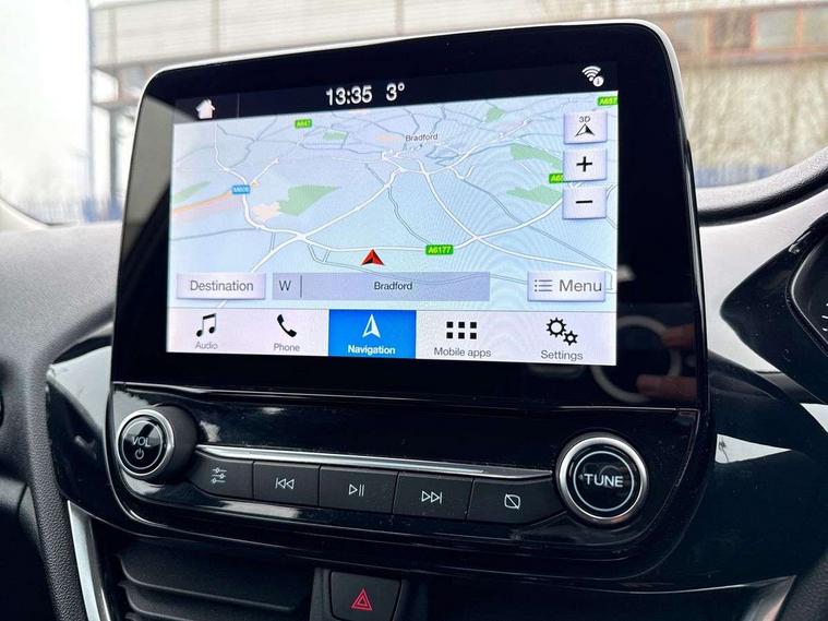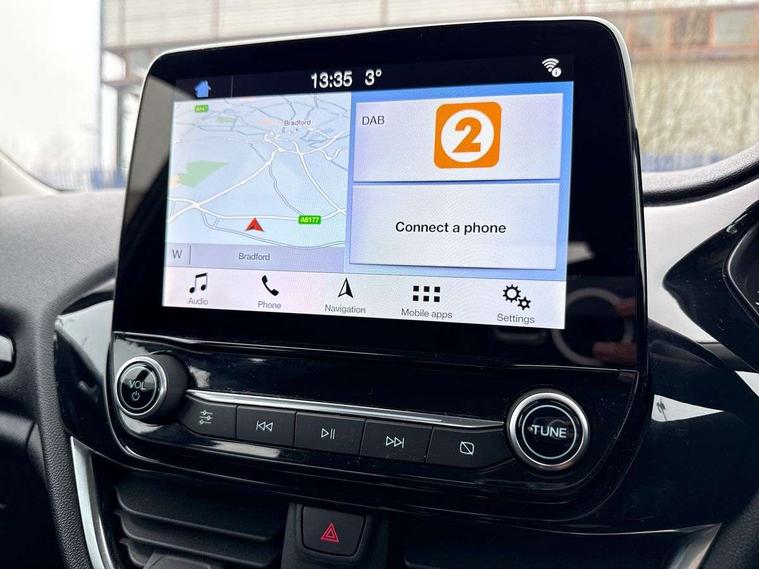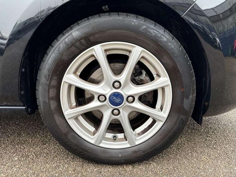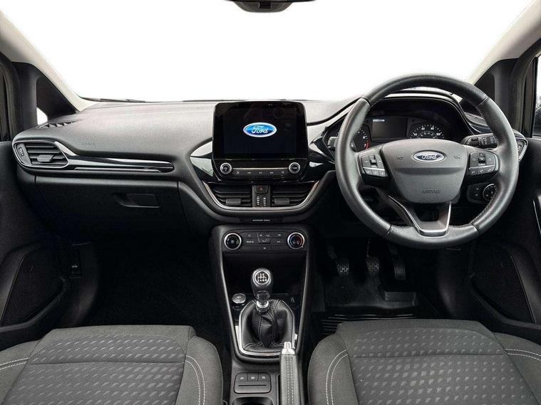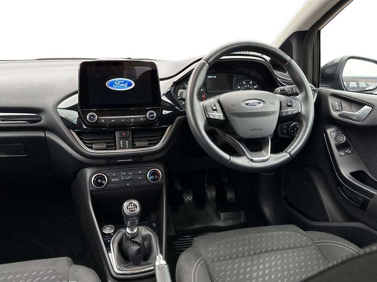 Bluetooth system, Electric power steering, Ford easy fuel, Trip computer, 2 USB ports, Auxiliary input socket, DAB Digital radio, Steering wheel mounted controls, Automatic headlights, Body colour bumpers, Body colour door handles, Body colour electric adjustable heated door mirrors with integral indicators, Body colour rear spoiler, Chrome beltline trim, Cornering front fog lights, Electric front windows/one touch facility, Halogen projector style headlights with static cornering lights + LED daytime running lights, Quickclear heated windscreen, Rear wiper, Tinted glass, Upper front grille chrome surround, 12V Accessory socket in centre console, 3 spoke leather trimmed steering wheel with audio control, 60/40 split folding rear seat, Adjustable head restraints, Boot carpet, Chrome inner door handles, Cloth upholstery, Footwell illumination, Front map reading lights, Front seat and rear pockets, Height adjustable driver's seat, Illuminated glovebox, Leather gear knob, Leather trimmed handbrake handle, Load area light, Luxury woven headliner, Manual air conditioning, Overhead console with sunglasses holder, Pollen filter, Rake/reach adjustable steering wheel, Rear centre head restraint, NCAP Pack - Fiesta, 3 point seatbelts on all rear seats, ABS+EBA, Curtain airbags, Driver and passenger airbags, Drivers knee airbag, Electronic stability control with hill start assist, Front passenger airbag deactivation, Front side airbags, Seatbelt warning, Tyre pressure monitoring system, MyKey system, Remote central locking & engine immobiliser, Thatcham Cat.1 alarm,