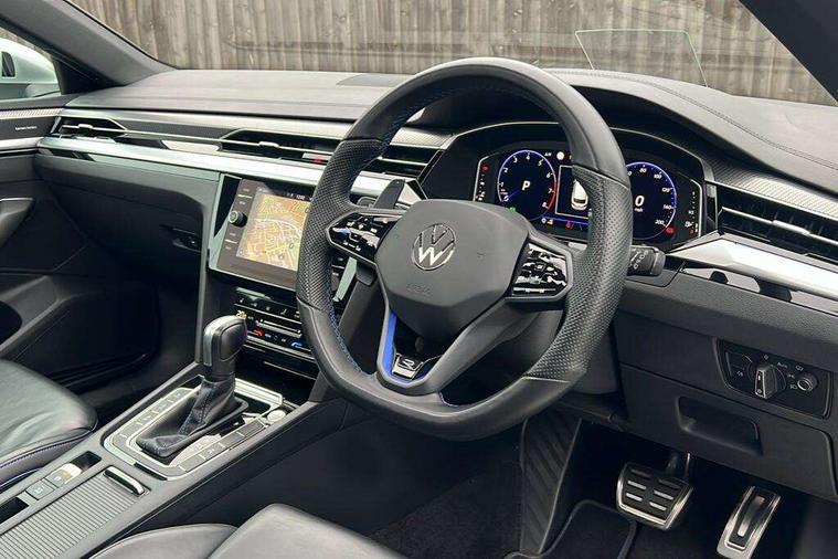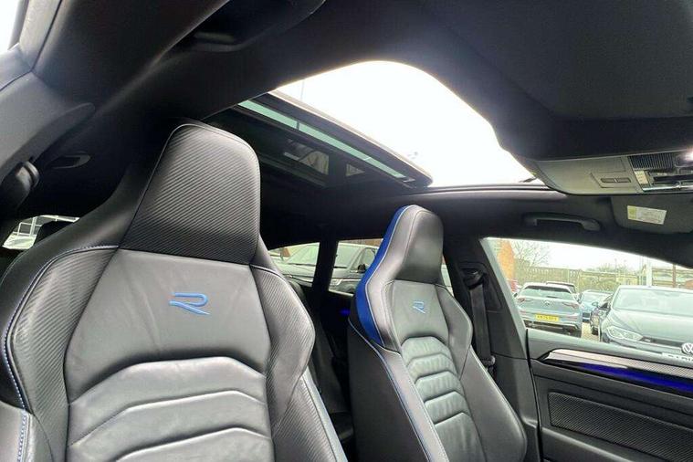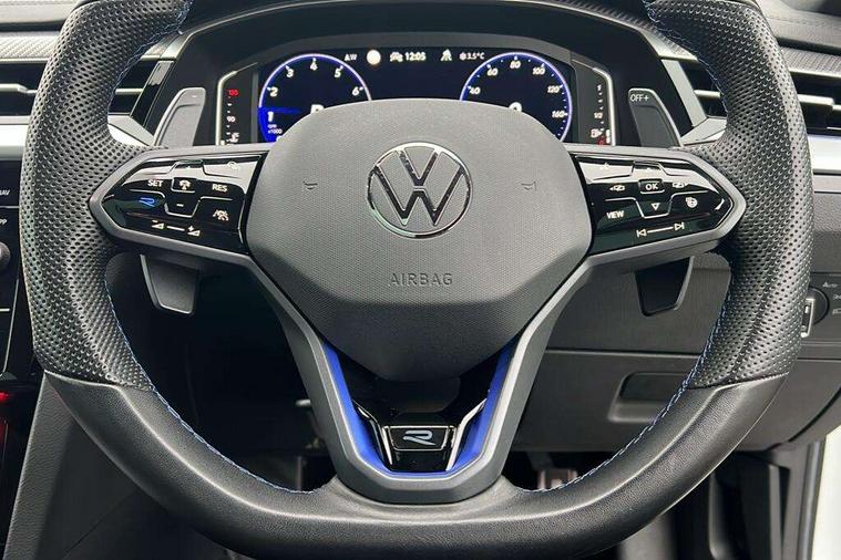 Adaptive cruise control (ACC) with speed limiter, front assist (reacting vehicles pedestrian and cyclists) and follow to stop, App connect including wireless Apple CarPlay, Camera for warning system, Digital cockpit with 10.25" high resolution TFT display screen with customisable menus and information, Driver alert system with fatigue detection, Driver profile selection including ECO function, Dynamic road sign display, eCall - Emergency call service for SOS calls to emergency response, Emergency assist, Hands free boot opening, Press and drive key, Progressive steering, R driving mode button on steering wheel, Side scan lane change assist including rear cross traffic alert, Speedo and rev counter, electronic odometer, trip, service interval display and exterior temperature gauge, Tailgate, Travel assist - Lane keeping assist and traffic jam assist, Voice activation for telephone and navigation, All wheel drive - 4Motion, Start/stop function with battery regeneration, XDS electronic differential lock, External, USB type C data sockets with increased charging performance front (45 Watt), Premium USB cable in choice of either Apple or Android smartphone compatibility, Auto dimming interior rear view mirror, Automatic headlights, Body colour door handles, Body colour side skirt, Body coloured top and matt black lower door mirrors with integrated indicators, Chrome side window surrounds, Dynamic headlight range control, Electric folding door mirror, adjustable, heated with front passenger exterior mirror lowering function, Front and rear electric windows, Front and rear stainless steel door sill protection, Front windscreen washers and wipers with 4x interval delay, Heat insulating side and rear windows, Heated rear windscreen, Heated windscreen washer jets, LED 3rd brake light, LED rear combination lamp with dynamic indicators, LED rear number plate lights, Left and right chrome effect twin trapezoid exhaust tailpipe surrounds, Panoramic sunroof with tilting and sliding including integrated roller blind, R Line design body coloured bumpers, R logo light projection, R logo on radiator grille, side panels and rear, R specific radiator grille, R specific rear bumper and R specific diffusor in black, Rain sensor, Rear fog lamp on one side and reversing lamp on both sides, Rear side wing doors, Rear tinted glass from B pillar backwards, approx 65% tinted, Rear windscreen washer and wiper with interval delay, Roof spoiler, 12V socket in front centre console, 12V socket on rear of front centre armrest, 14way electric adj front seats with lumbar + ergoComfort driver seat with memory/massage, comfort entry, integrated front headrest + door mirror memory, 3 rear head restraints, 3 seat bench in 2nd row, 30 colours interior ambient lighting, 60:40 split folding rear seat backrests with centre armrest, Air care climatronic 3 Zone electronic air conditioning with automatic air recirculation, Black roof lining, Chrome trim on upper and lower air vents extending across cockpit, Driver and front passenger sunvisor with vanity mirror, Front cupholders x 2, Front footwell illumination, Glovebox, Heated front seats, Height/reach adjust steering wheel, Isofix child seat preparation easy fit for two outer rear seats, Luggage compartment lighting, Nappa leather upholstery with side bolster and headrest, Pedals and footrest in stainless steel, Premium sports seats with R-logo, R performance leather wrapped heated multi-function sports steering wheel with touch controls and larger shifting paddles, blue stitching and R-logo, R specific floor mats with R-logo and stitching, Removable luggage compartment cover, Single front passenger seat, Split folding front seat backrest with front centre armrest, Two LED front reading light, 18" performance brakes, 3 rear three point seatbelts, ABS+EBD+Brake assist, Child locks on rear doors, Driver airbag and front passenger airbags with deactivation switch including driver knee airbags, Electronic parking brake, Electronic stability control (ESC) and Electromechanical brake booster, Front disc brakes, Front side airbags with curtain airbags, Hill start assist, Pro active occupant protection to detect critical situations with elevated accident potential from the front, R performance torque vectoring, R specific blue brake calipers, Rear disc brakes, Rear precrash preventive occupant protection, Three point height adjust front seatbelts + pretensioners, Two tone horn, Tyre pressure loss indicator, Tyre pressure monitor, Warning buzzer for seatbelts if unfastened, Warning triangle, Alarm with interior protection with deactivation via infotainment system, Electronic engine immobiliser, Keyless entry system including start/stop button on centre console, Remote central locking, Aluminium decorative inserts, Chrome trim on lower doors in front and rear, Leatherette insert on door and side trim panel in foam film, Piano black decorative inserts in centre console, R specific decor inlay aluminium black carbon,