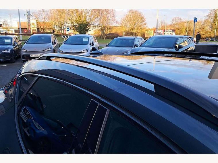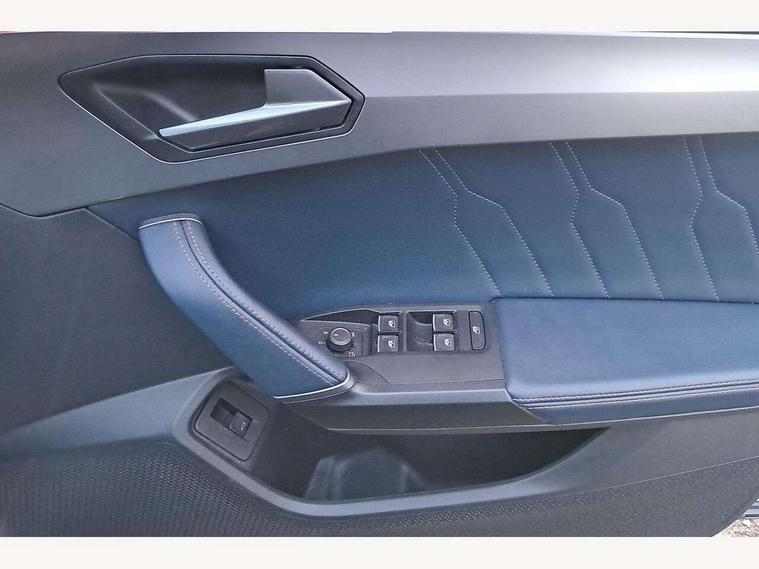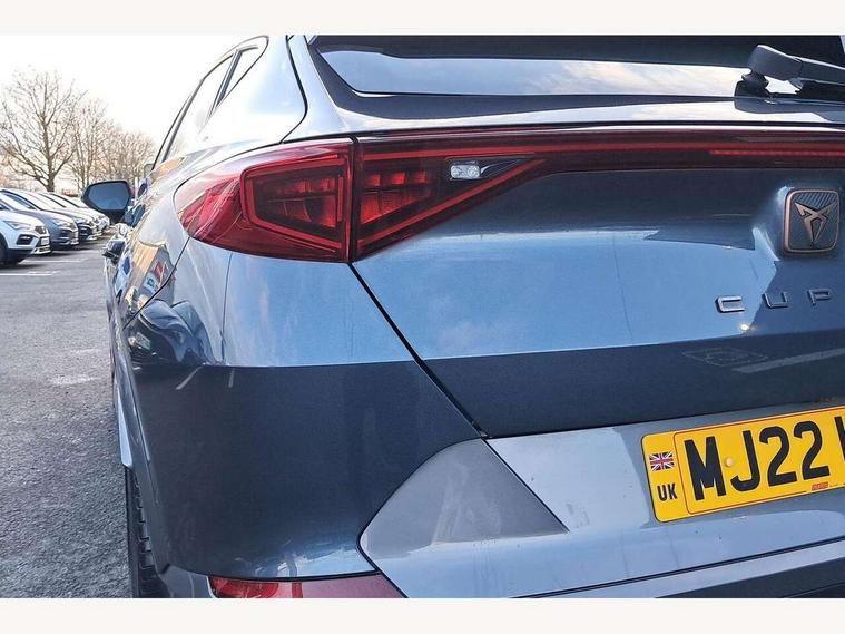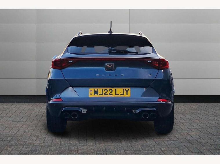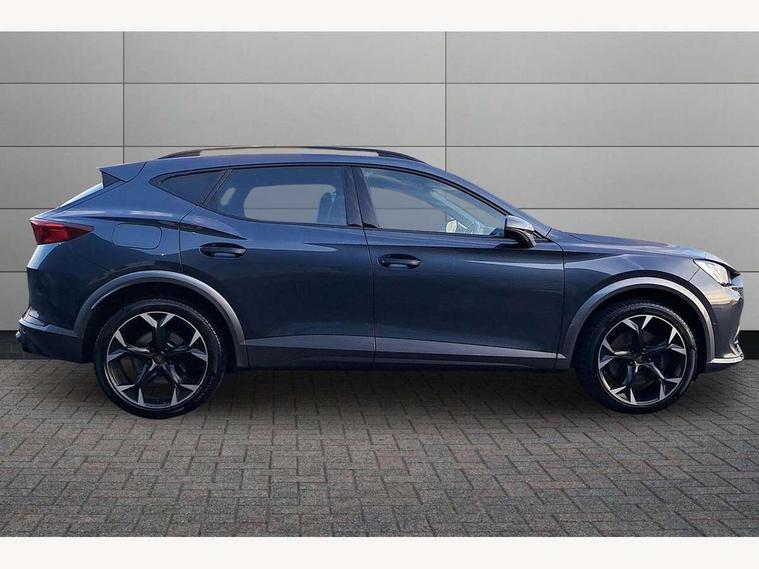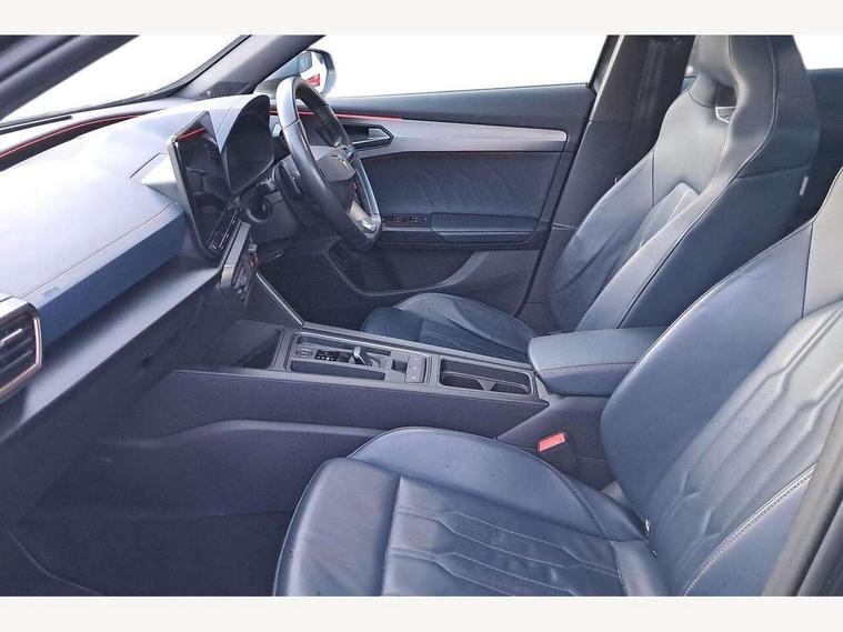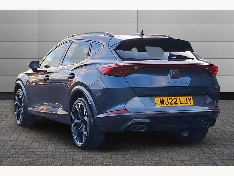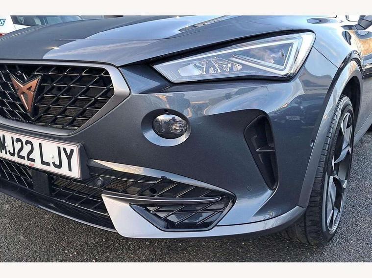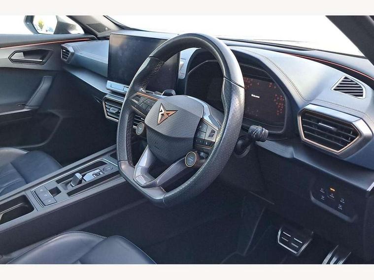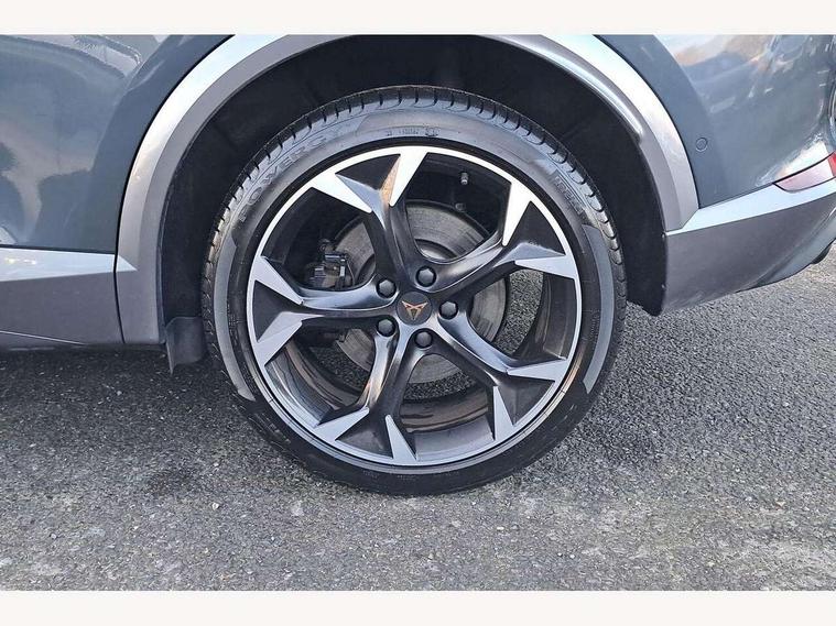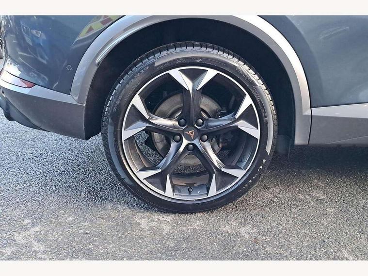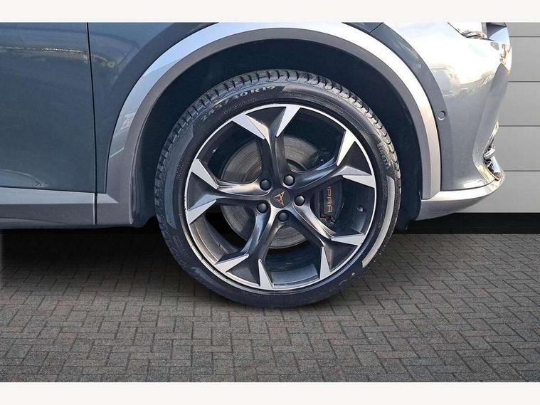 Digital cockpit and configurable dashboard, Driver alert system, Dynamic chassis control with driving profile selection (Comfort, Sport, CUPRA, Individual), E-call, Forward collision warning with automatic braking, Lane assist, Park assist (inc front/rear parking sensors), Predictive adaptive cruise control with speed limiter, RPM, trip computer, outside temp gauge, instrument light brightness, low fuel warning light, lights on reminder, gearshift indicator, Service interval indicator, Speed sensitive power steering, Start/stop system with regenerative braking, Virtual pedal and electric tailgate, Wireless apple carplay, Wireless phone charger, Electronic locking differential and dynamic traction support, Sports suspension with front shock absoption, 2 front and 2 rear USB type C sockets, Auxiliary input socket, DAB radio, Auto dimming rear view mirror, Body colour door handles, Body coloured bumpers, Dark grey wing mirror, Daytime running light with automatic headlight control and coming home feature, Dynamic headlight range control, Electric front/rear windows, Electrically adjustable heated and folding door mirrors with memory function, Front fog lamps with cornering function, Gloss black roof rails and window surrounds, LED Headlights, LED Taillights with dynamic indicator, Rain sensing wipers, Rear diffuser with twin exhaust pipe on each side, Rear side wing doors, Rear wash/wipe, Sports bumpers, Third brake light, Tinted rear windows, VZ logo rear badging, Welcome lights, 12v power supply in centre console, 12V socket, 12v socket in loadspace, 2 front and 2 rear reading lights, 230V socket, 3 seat bench in 2nd row, 60/40 split rear bench seat with armrest and mechanical seat release, Black headlining, Cupra sports pedals, Dust/pollen filter, Front and rear head restraints, Front centre armrest, Height/reach adjust steering wheel, Illuminated interior front door sills, Illuminated sunvisor with mirror, Isofix, Leather heated multi-function sports steering wheel with start stop, CUPRA mode button and gear shift paddles, Luggage tie-down hooks, Single front passenger seat, Three zone climate control with control panel in rear, Variable luggage/load compartment floor, Wraparound lighting, Genuine Nappa leather Pack - Cupra, Navigation system pack - Formentor, Safety and driving pack (XL) - Formentor, 3 point seatbelts on all rear seats, ABS, Brake control system - ESC and brake booster, Child proof door locks, Driver and front passenger airbags with front passenger airbag de-activation, Electronic parking brake, Front and rear disc brakes, Front side curtain airbags, Hill hold control, Seat belt reminder for front and rear seats, Tyre pressure monitoring system, Anti theft alarm system, Keyless entry and start system (KESSY), Locking wheel bolts, Copper and aluminium interior detailing, 19" 'Exclusive' machined sport matte black and silver alloy wheels, Space saver spare wheel,