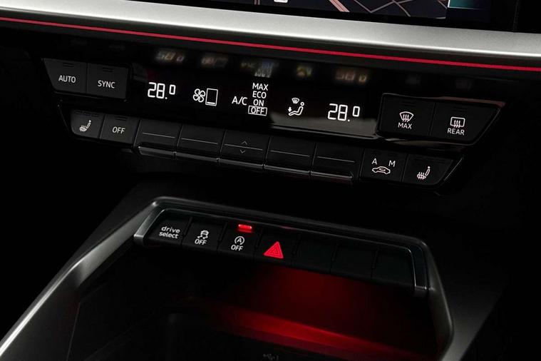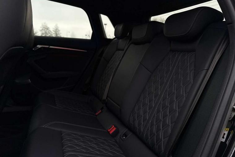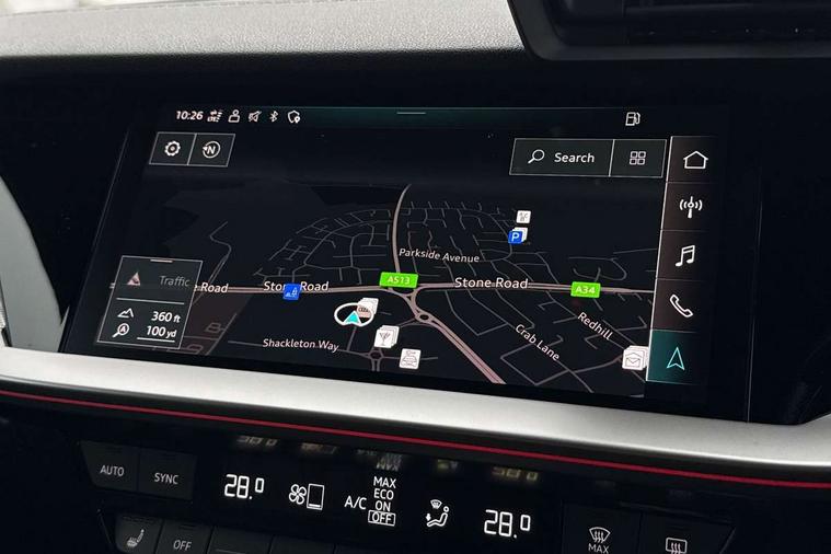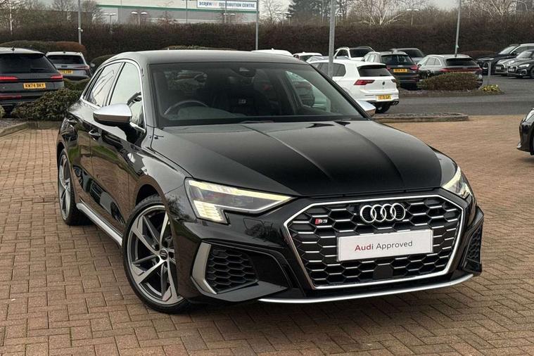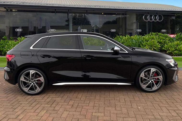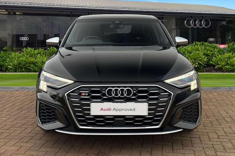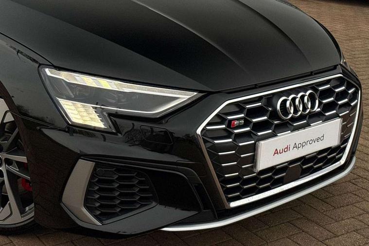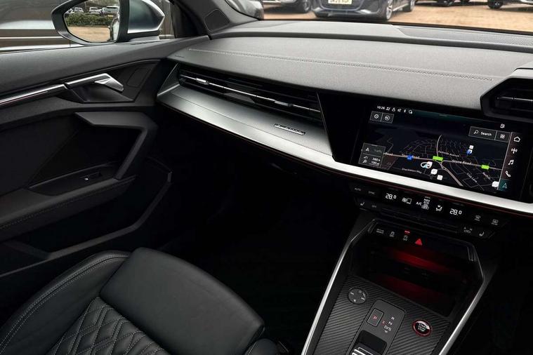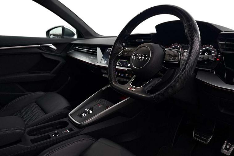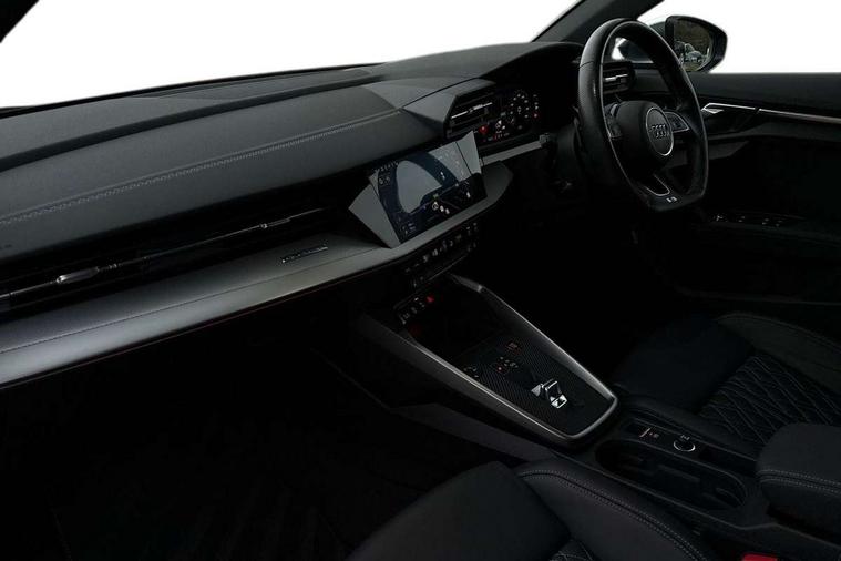 Audi connect emergency call and service, Audi drive select (Auto, Comfort, Dynamic, Efficiency and Individual), Audi smartphone interface, Audi Virtual Cockpit - 10.25" digital and colour instrument cluster, Automatic start/stop system with recuperation, Bluetooth interface, Collision avoidance assistant, Lane departure warning system, MMI Navigation Plus with high resolution 10.1" colour touch screen display, Progressive steering, Service indicator, Trip computer, Voice control system with natural language interaction, Quattro permanent all wheel drive, S sports suspension, 2xUSB-C connection with data and charging functions, 6 passive loudspeakers, DAB Digital radio, Acoustic glass windscreen, Aluminium window trim, Audi Beam uses LEDs to project the Audi S3 logo, Auto dimming frameless rear view mirror, Dual branch oval twin tailpipes in chrome plated finish, Exterior mirror with aluminium look housing, Front electric windows, Illuminated aluminium inserts front door sills with S logo, LED daytime running lights, Light and rain sensors, Privacy glass - dark tinted rear window, rear door and side windows, Rear electric windows, Rear side air outlets in grained matt black, Rear wiper, 12V socket and storage compartment in front centre console, 3 spoke flat bottomed multifunction plus sports contour leather wrapped steering wheel with shift paddles, 40/20/40 split folding rear seat bench with cupholder, Black cloth headlining, Dual zone electronic climate control, Front and rear centre armrest in leather, Front and rear headrests, Front/rear floor mats, Heated front seats, Height and reach adjustable steering wheel, Interior lighting - glove compartment light and right hand side, Luggage compartment floor covering, Seat side bolsters, Stainless steel pedals and front footrest, Aluminium interior elements pack - A3 Sportback, Design body styling - A3 Sportback, Storage pack - A3 Sportback, 3x3 point rear seat belts, Driver and front passenger airbag with passenger airbag deactivation, Electronic Stabilisation Control (ESC) including ABS, ASR and EDL, First aid kit with warning triangle and 2 safety vests, Front side airbags with head airbags and interaction airbag, Hill hold assist, Pre-sense front with pedestrian and cyclist detection, Seatbelt monitoring, Tyre pressure loss indicator, Anti theft alarm, Anti-theft wheel bolts, Electronically operated child lock, Immobiliser, Remote control central locking, Accent surfaces in the dashboard and centre console in platinum grey silk effect paint finish, Dark spectrum aluminium inlays,