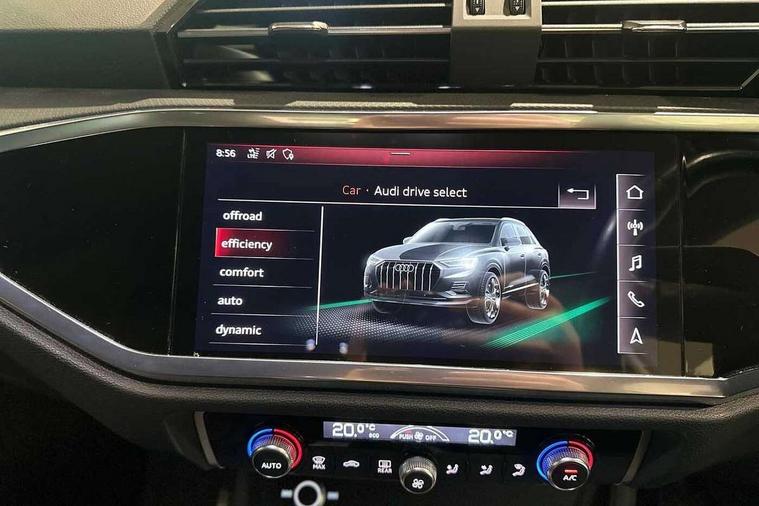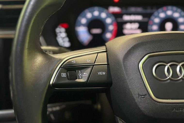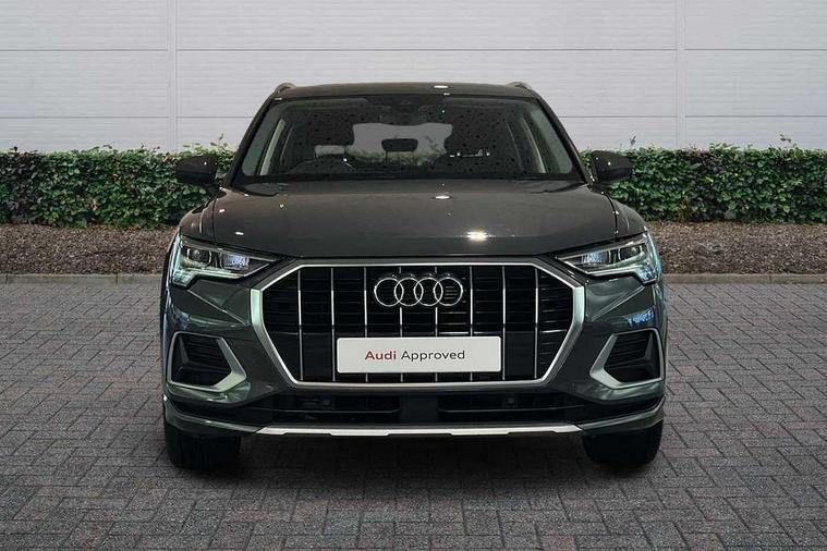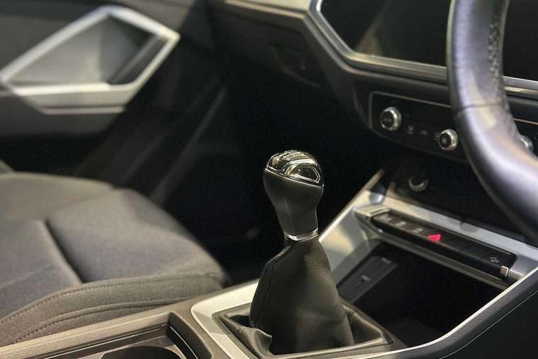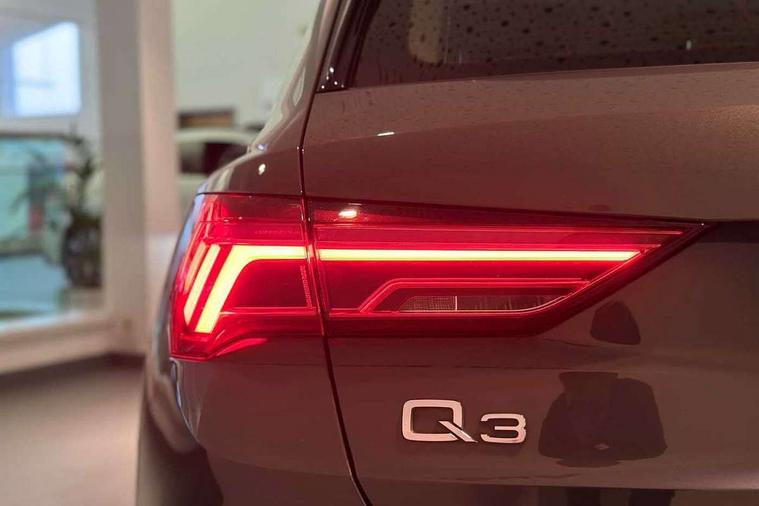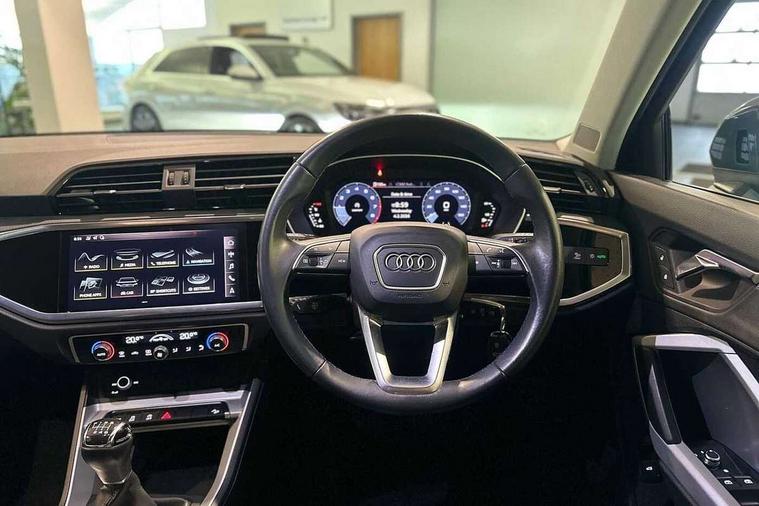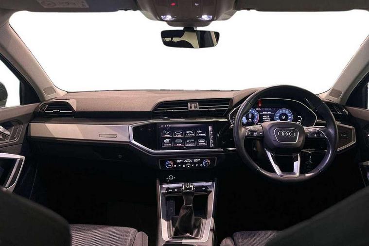 Micrometallic silver inlay, MMI touch colour display in glass look, black with surround in aluminium look, Non smoking pack - Q3, Anti theft alarm, Anti theft wheel bolts, Audi pre-sense front with pedestrain and cyclist recognition, Remote central locking, 1 x USB type C and 1 USB type A charging points, 6 passive loudspeakers, DAB digital radio module, 3x3 point rear seatbelts, 6 airbags - Driver, front passenger, curtain and side windows, Electrically operated child locks on rear doors, Electromechanical parking brake, Electronic stabilisation control including ABS, ASR and EDL, Hill descent control, Hill hold assist, Pre sense basic, Seatbelt monitoring, Tyre pressure warning, Warning triangle and first aid kit, Acoustic windscreen, Aluminium window trim, Auto dimming frameless rear view mirror, Bumpers and underbody protection in contrasting manhattan grey paint finish, Diffuser grille in grained matt black, Diffuser trim in manhattan grey metallic, Door sill trims with illuminated aluminium inlay, Electrically folding, adjustable and heated door mirrors with integrated LED side indicators and kerb view function for passenger side, Front and rear electric windows, Front fog lights, Front side air inlets in Manhattan grey metallic, Grille surround in aluminium silver matt, High gloss black finish B and C pillars, Honeycomb design radiator grille in matt titanium black, LED headlights with LED daytime running lights and dynamic rear indicator, LED rear lights, Rain and light sensors, 12V socket in rear centre console, 40:20:40 folding with manual adjustment for 60:40 forwards/backwards position and backrest angle, Adjustable rear seat bench/backrest, Dual zone electronic climate control, Front and rear floor mats, Front and rear headrests, Front and rear roof module including reading lights, Front centre armrest, Glove compartment lighting, Height and reach adjustable steering wheel, ISOFIX child seat mounting for front passenger with airbag deactivation and outer rear seat including top tether attachment point for outer rear seats, Luggage compartment light, Lunar silver cloth headlining, Manual front seats with height adjustment, Stainless steel luggage compartment sill finisher, Audi connect safety and service (e-call), Audi drive select, Audi lane departure warning, Audi side assist, Audi smartphone interface includes wireless Apple carplay/Android Auto, Audi Virtual Cockpit - 10.25" display, Bluetooth interface, Camera based traffic sign recognition, Cruise control + speed limiter, MMI Navigation Plus with high resolution 10.1 inch touchscreen colour display, Power operated tailgate, Progressive steering, Rear parking sensors, Service interval indicator, Start stop system with recuperation, Voice control system with natural language interaction, Sports suspension,