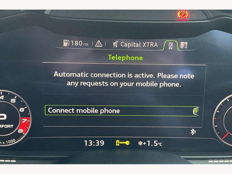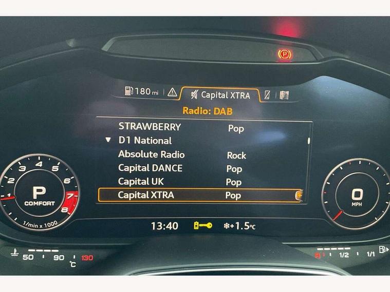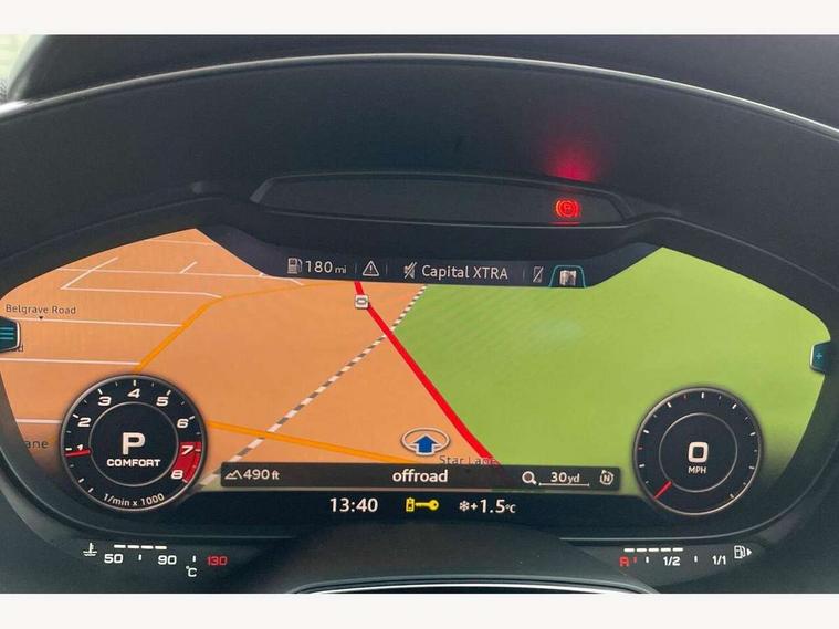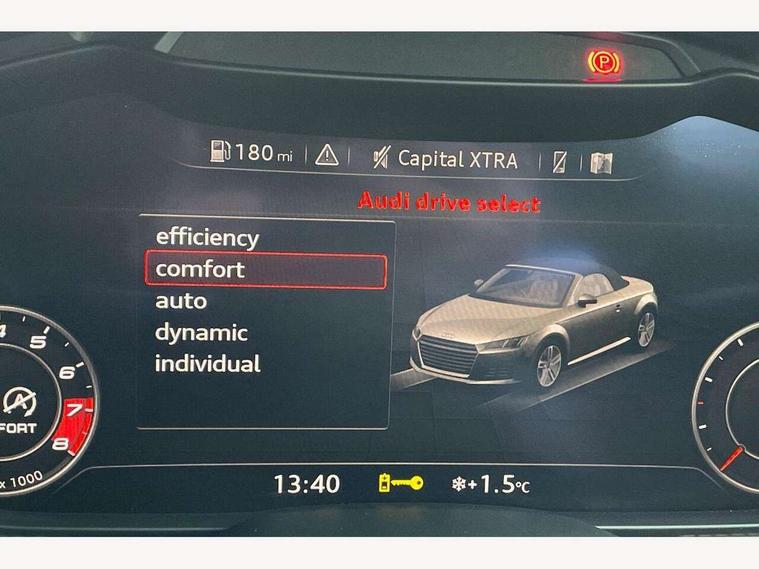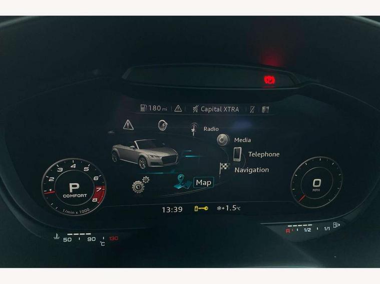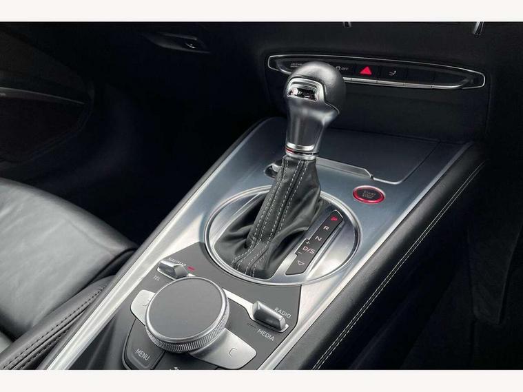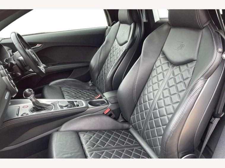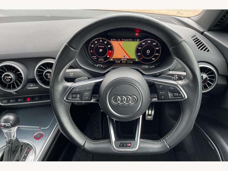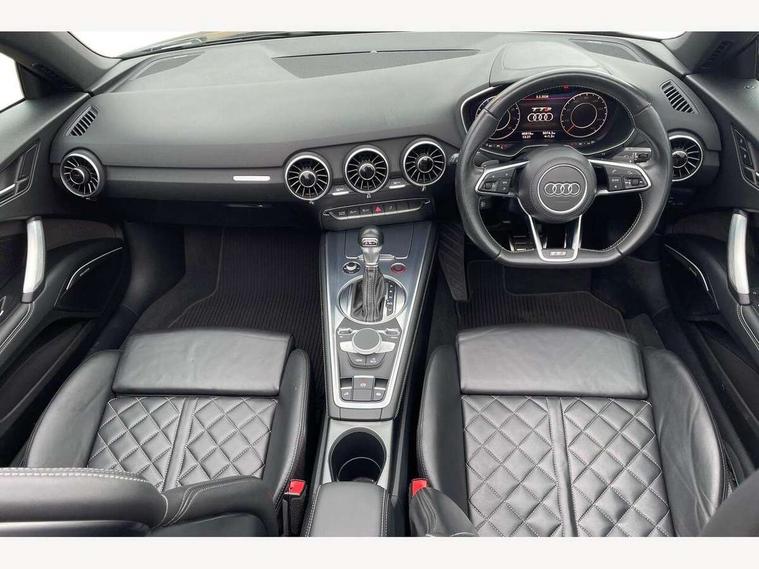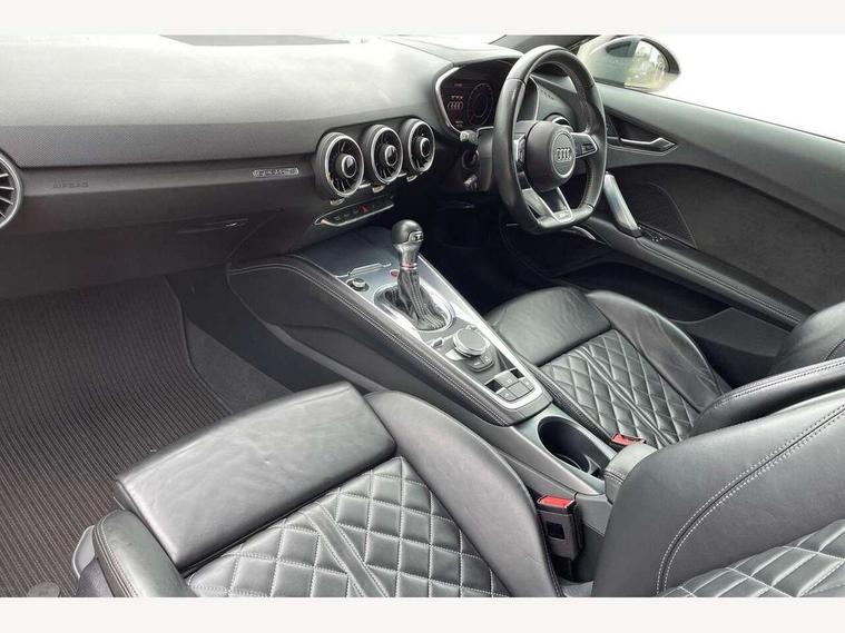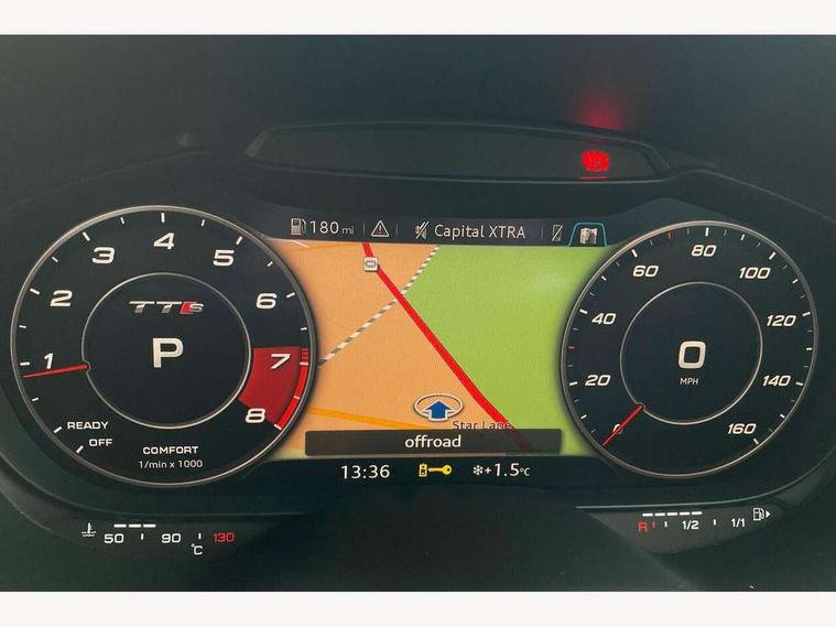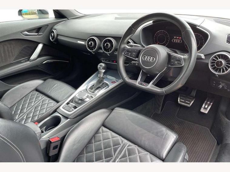 Audi active lane assist, Audi drive select, Audi virtual cockpit - 12.3" high-resolution LCD display with fully customisable instrument cluster, Cruise control + speed limiter, MMI touch panel, Mobile phone preparation with bluetooth interface, Progressive power assisted steering, Seat belt microphone, Service interval indicator, Audi magnetic ride, TTS suspension, Audi music interface, Auxiliary input socket, Bang + Olufsen advanced sound system, Bluetooth audio streaming, DAB Digital radio, MMI Radio with CD player and SD/XC card slot, Air intake grilles in high gloss black, Audi Beam uses LEDs to project the Audi Sport logo, Auto headlight range control, Black door mirrors, Body colour bumpers, Electric front windows, Fabric hood - Black, Fully automatic acoustic hood, Green tinted heat insulating glass, High gloss black radiator grille, LED daytime running lights, Matt black radiator grille and number plate holder, Rear diffuser, Retractable rear boot spoiler, S body styling, Sunband for windscreen, Wind deflector, 3 spoke flat bottomed high multi-function leather sport steering wheel with gearshift paddles, Aluminium door sill trims, Black headlining, Electric lumbar support, Extended aluminium look with stainless steel pedals, Front centre armrest, Front head restraints, Front passenger seat isofix location point, Heated front seats, Height/reach adjust steering wheel, ISOFIX on outer rear seats, Top tether anchor plate for isofix child seat, Auto dimming rear view mirror with light and rain sensors pack - TT, High gloss black pack - TT, LED interior light pack - TT/TT RS, Non smoking pack - TT/TT RS, 3 point front seat belts, ABS, ASR traction control, Curtain airbags, Driver/Front Passenger airbags, EDL traction control, Electromechanical parking brake, ESP, First aid kit, Front passenger airbag deactivation, Front side airbags, Head airbags, Hill hold assist, Roll over bars, Seatbelt warning, Tyre pressure warning, Warning triangle, Anti theft alarm, Immobiliser, Keyless start, Locking wheel bolts, Remote central locking, Matt brushed aluminium inlays, Tyre repair kit,