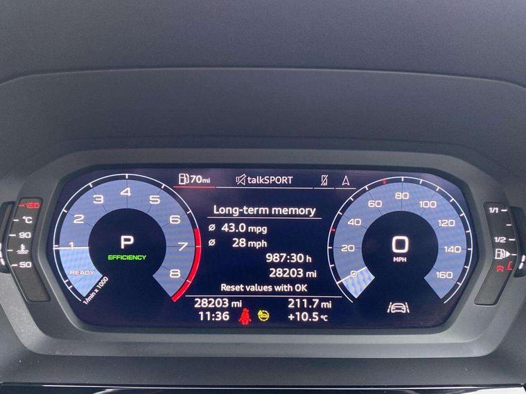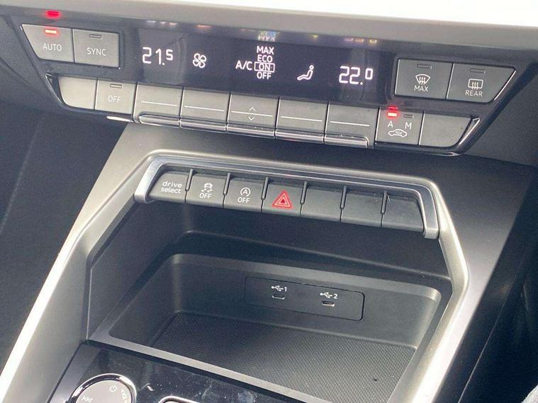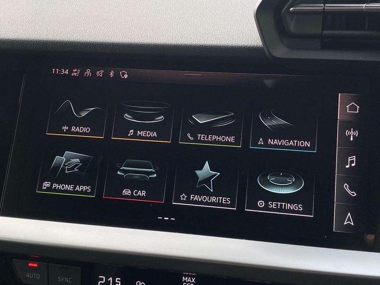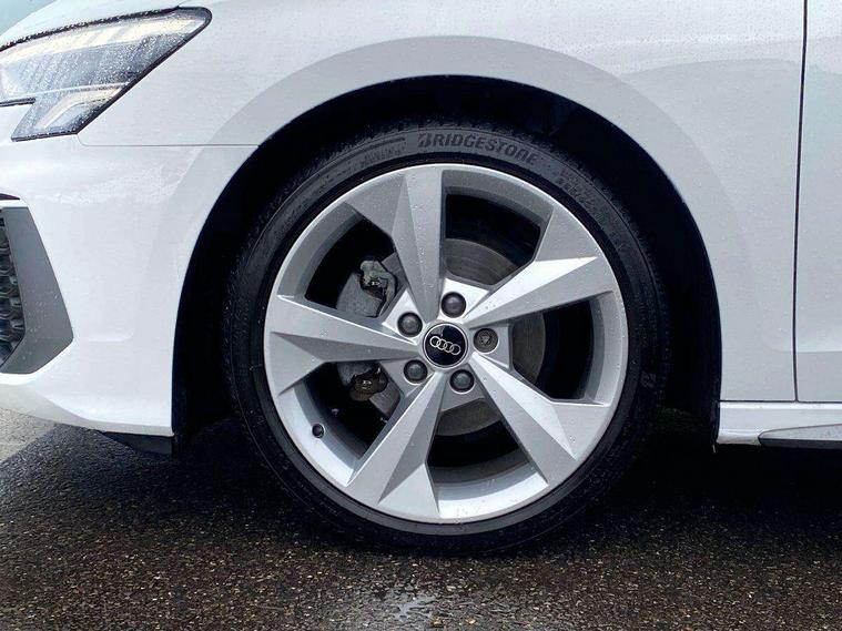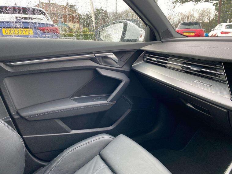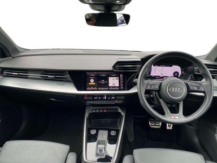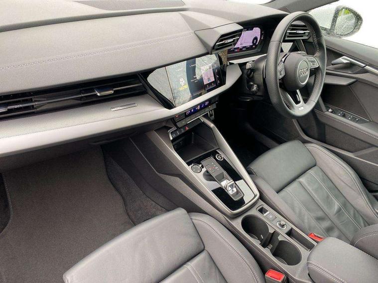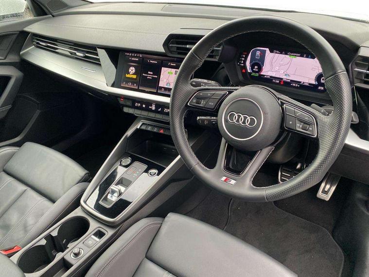 Audi connect emergency call and service, Audi drive select (Auto, Comfort, Dynamic, Efficiency and Individual), Audi smartphone interface, Audi Virtual Cockpit - 10.25" digital and colour instrument cluster, Automatic start/stop system with recuperation, Bluetooth interface, Collision avoidance assistant, Electromechanical power speed sensitive steering, Lane departure warning system, MMI Navigation Plus with high resolution 10.1" colour touch screen display, Service indicator, Voice control system with natural language interaction, 2x USB Type C ports (for charging and data transfer), 6 passive loudspeakers, CD player, DAB Digital radio, 3rd brake light, Acoustic glass windscreen, Aluminium window trim, Auto dimming frameless rear view mirror, Electrically adjustable/heated/folding/dimming door mirrors with kerb view includes integrated LED indications + kerb view function for passenger side, Front electric windows, Illuminated door sills with aluminium inserts at the front with S logo, LED daytime running lights, LED headlights with LED rear lights and dynamic rear indicators, Light and rain sensors, Model and engine designation badges at rear, Privacy glass - dark tinted rear window, rear door and side windows, Rear boot, Rear electric windows, Rear side wing doors, S line bumpers, S roof spoiler, 12V socket and storage compartment in front centre console, 3 seat bench in 2nd row, 40/20/40 split folding rear seat bench with cupholder, Black cloth headlining, Dual zone electronic climate control, Electronically operated child locks, Front and rear centre armrest in leather, Front and rear headrests, Front/rear floor mats, Height and reach adjustable steering wheel, Illuminated vanity mirror, Interior lighting - glove compartment light and right hand side, Luggage compartment floor covering, Manual boot compartment lid, Manually adjustable front sport seats, Seat side bolsters, Single front passenger seat, Stainless steel pedals and front footrest in black, Twin leather upholstery with front sports seats S embossed logo, Aluminium interior elements pack - A3 Saloon, LED interior lighting pack - A3 Saloon, S line styling pack - A3 Saloon, 3x3 point rear seat belts, Driver and front passenger airbag with passenger airbag deactivation, Electronic Stabilisation Control (ESC) including ABS, ASR and EDL, First aid kit with warning triangle and 2 safety vests, Front side airbags with head airbags and interaction airbag, Hill hold assist, Pre-sense front with pedestrian and cyclist detection, Seatbelt monitoring, Tyre pressure loss indicator, Anti theft alarm, Anti-theft wheel bolts, Immobiliser, Remote control central locking, Aluminium air vent surrounds, Aluminium trim elements, Dark spectrum aluminium inlays, accent surfaces in the dashboard and centre console in platinum grey silk effect paint finish,