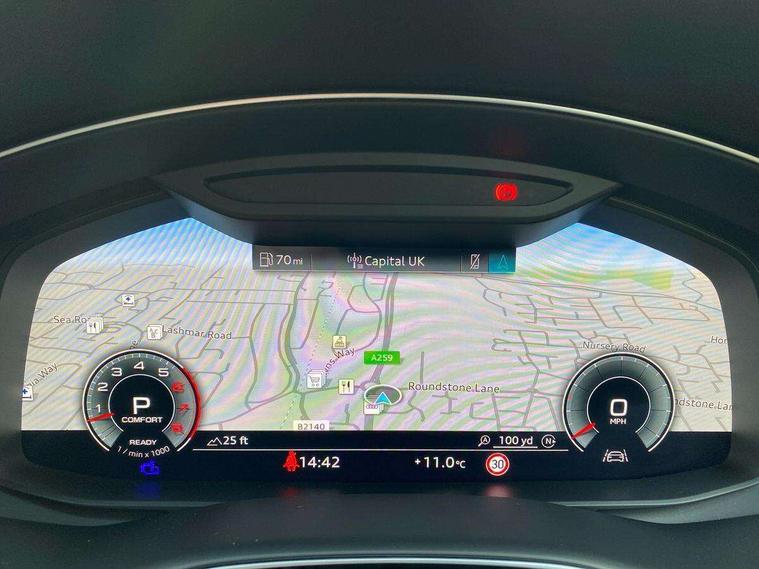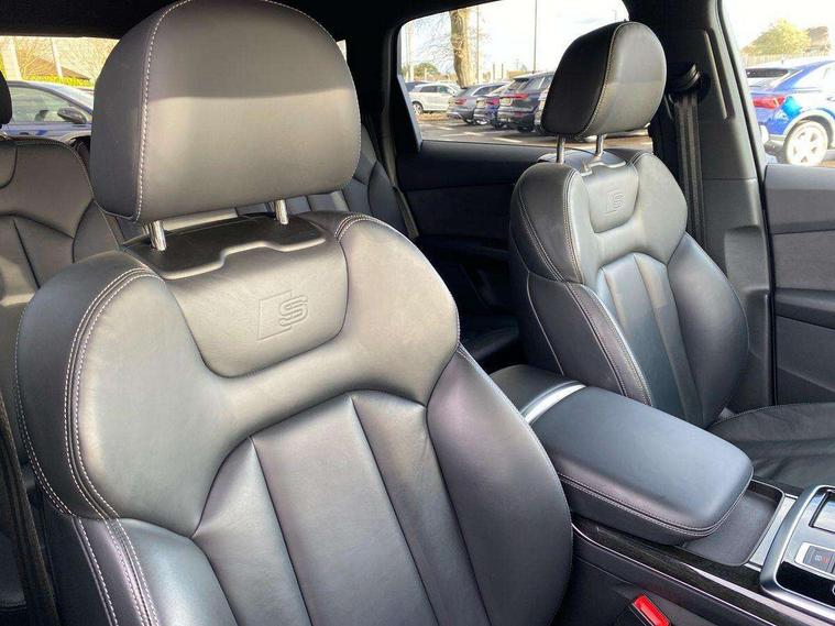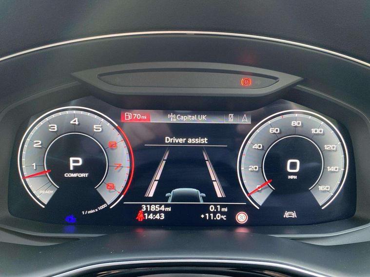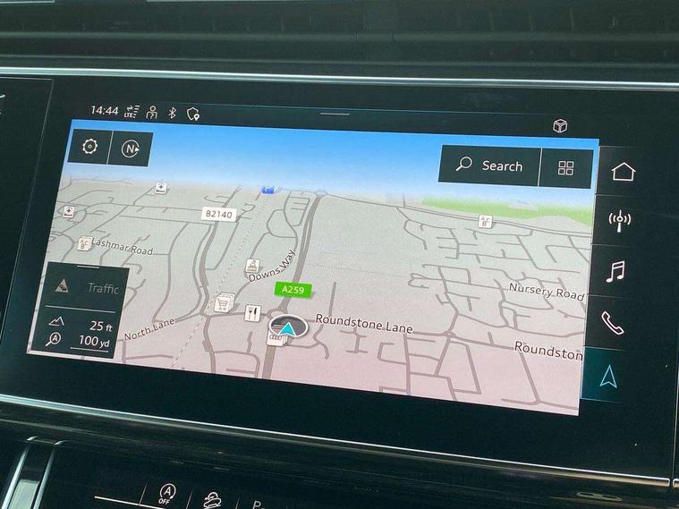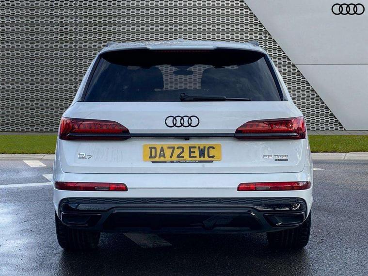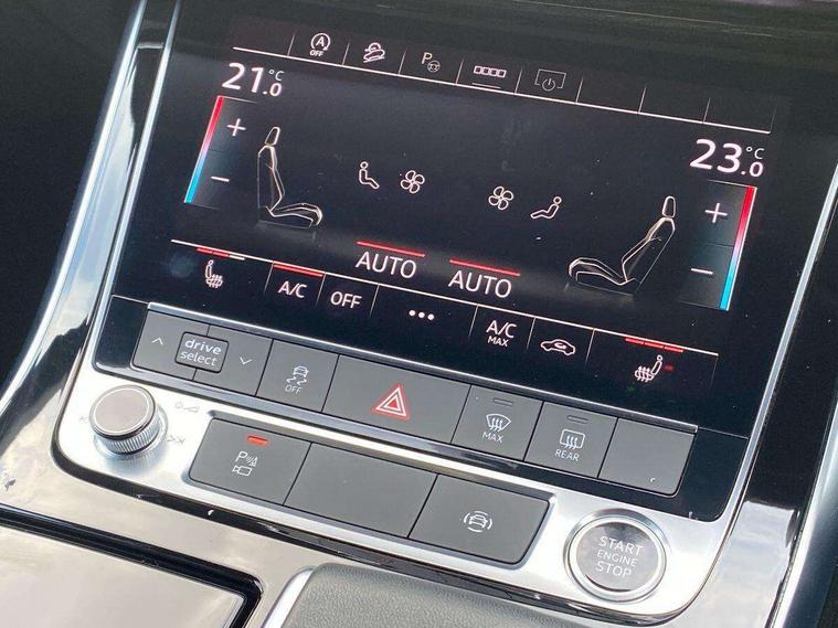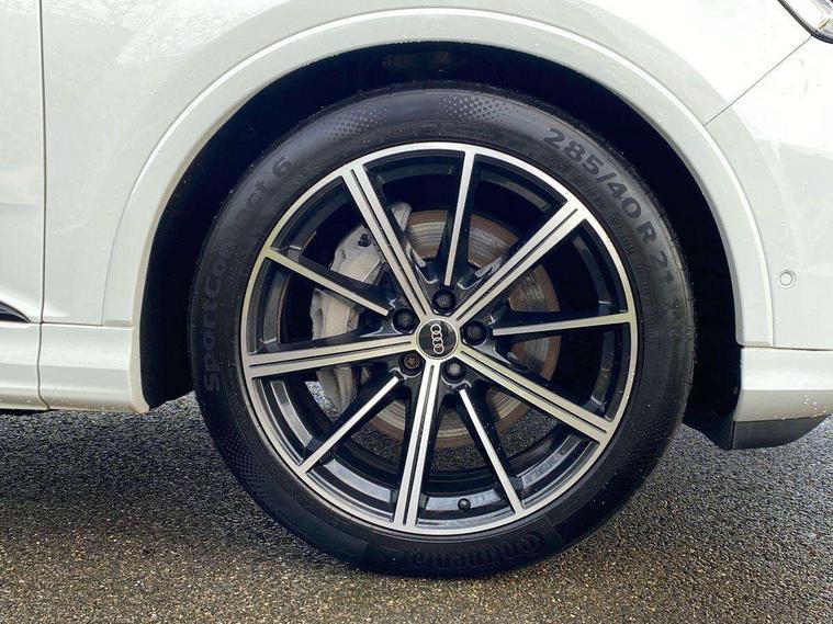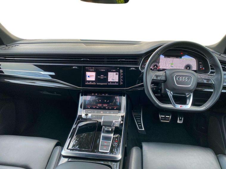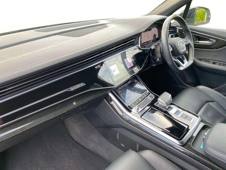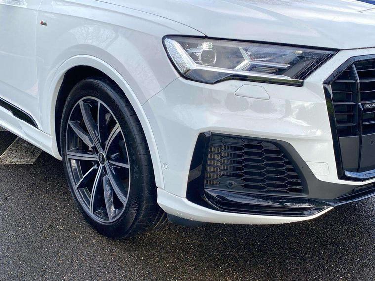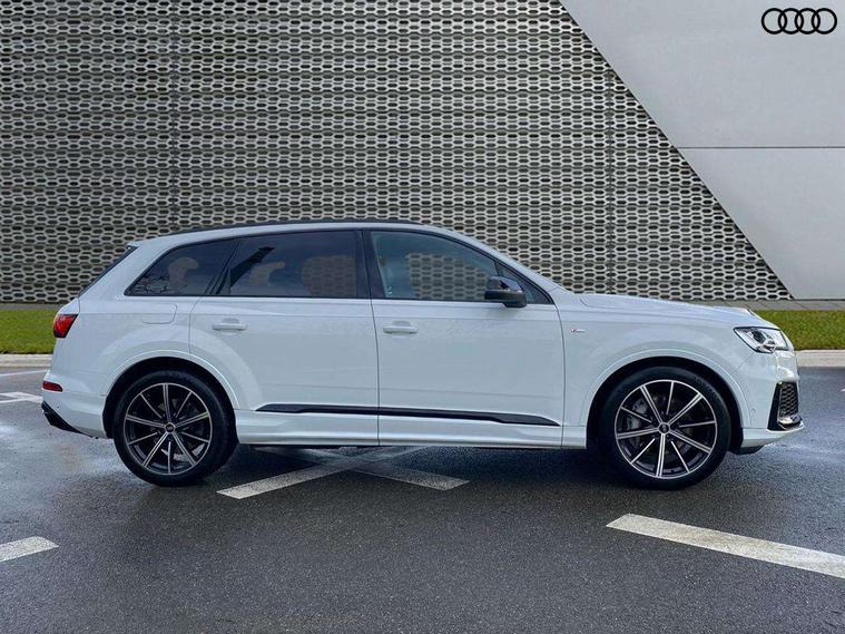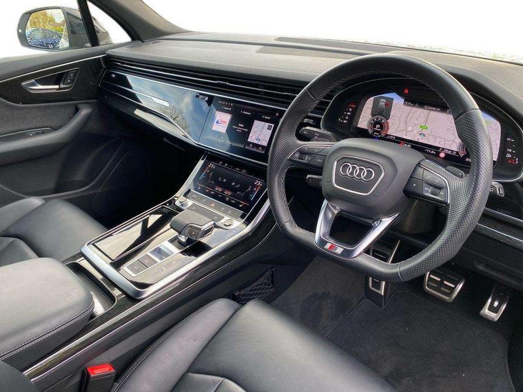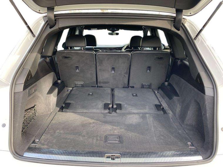 Audi connect safety and service (e-call), Audi connect with Amazon Alexa Integration, Audi drive select (Auto, Comfort, Dynamic, Efficiency, Individual, Off-road and All road), Bluetooth interface, Camera based traffic sign recognition, Electromechanical steering, MMI navigation plus with MMI touch screens includes 10.1" and 8.6" screens with haptic feedback, Natural voice recognition, Parking system plus with 360 degree display (front, rear and side sensors) - acoustic and visual park assist system, Power operated tailgate, Rear view camera, Smartphone interface includes wireless Apple carplay/Android Auto, Start/stop system, 48V Mild hybrid technology, 85 litre fuel tank, Adaptive air sports suspension, Quattro all wheel drive with self locking centre differential, Audi music interface - front 2 USB-C ports with charger and data functions, Audi sound system with 6 channel amplifier, 180 watt amplifying capacity and 10 loudspeakers including subwoofer, DAB digital radio module, 3rd brake light, Audi matrix LED headlights with dynamic front and rear indicators, Auto dimming frameless rear view mirror, Black roof rails, Bumpers in contrast paint scandium grey finish includes door trim and wheel arch trim strips, inlays in door strip contain quattro embossing, Electrically adj heated/folding + automatically dimming exterior mirrors with memory + automatic kerb side function for passenger side exterior mirror, Heat insulating glass in windshield, Integrated LED indications in door mirrors, LED daytime running lights, LED rear tail lights, Privacy glass - dark tinted rear and rear side windows from B-pillar backwards, Rear side wing doors, Rear wiper, 2 seat bench in 3rd row, 3 seat bench in 2nd row, 4 zone deluxe automatic climate control, 7 seat layout with ISOFIX points for the front passenger seat and rear passenger seat, Black cloth headlining, Comfort front centre armrest, Electric adjustable front seat with 4 way lumbar support, driver memory functionality, Folding rear seats, Front head restraints, Front/rear floor mats, Heated front seats, Illuminated door sill trims with S logo, LED interior ambient lighting, Luggage compartment cover, Luggage compartment sill protection in stainless steel, Rear head restraints, Single front passenger seat, Stainless steel pedals, Sunvisors with illuminated vanity mirrors, Titanium black styling pack - Q7/SQ7, 3 point seatbelts on all rear seats, Audi pre sense front, Child locks on rear doors, Driver and front passenger, front side and curtain airbags, Electromechanical parking brake, Electronic Stabilisation Control (ESC) including ABS, ASR and EDL, Extended pedestrian protection measures, Hill hold assist, Seatbelt monitoring, Tyre pressure loss indicator, Warning triangle and first aid kit, Anti theft alarm, Anti-theft wheel bolts and wheel loosening detection, Keyless Go, Remote central locking, Polished oak trim with grey finish inlay, Tool kit, Tyre repair kit,