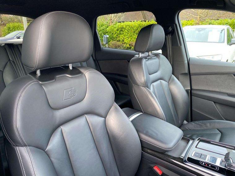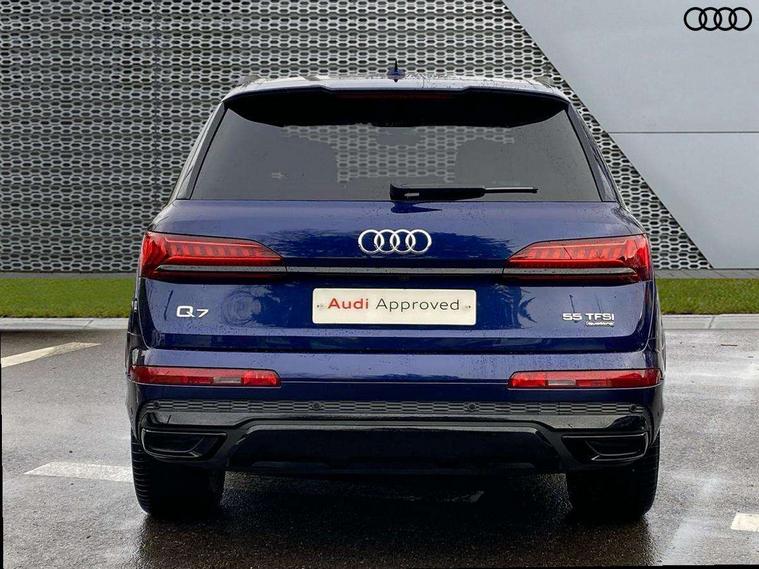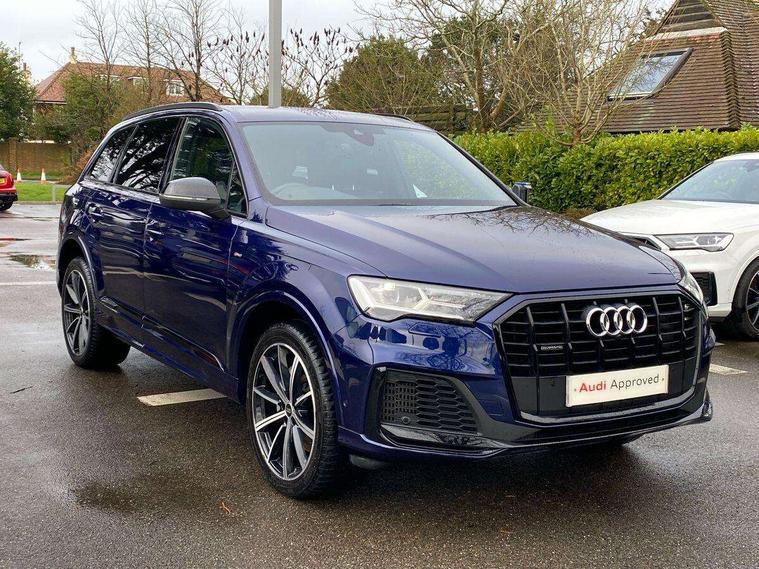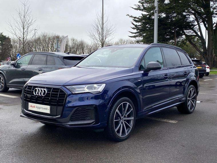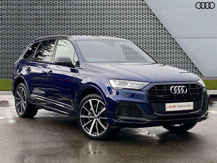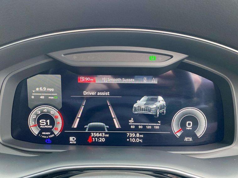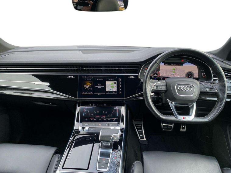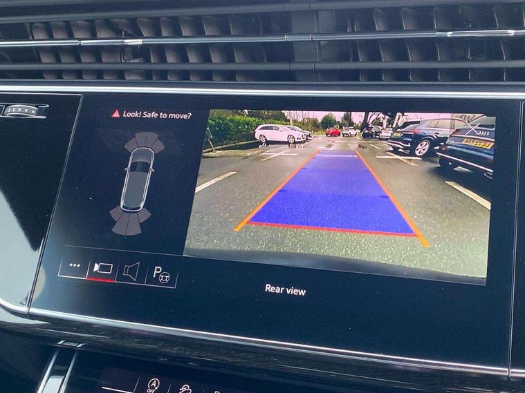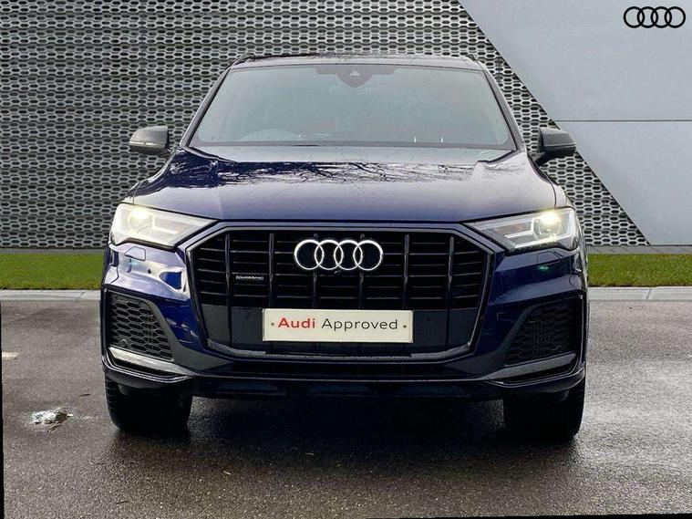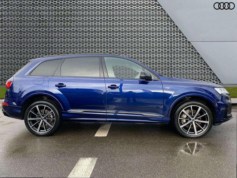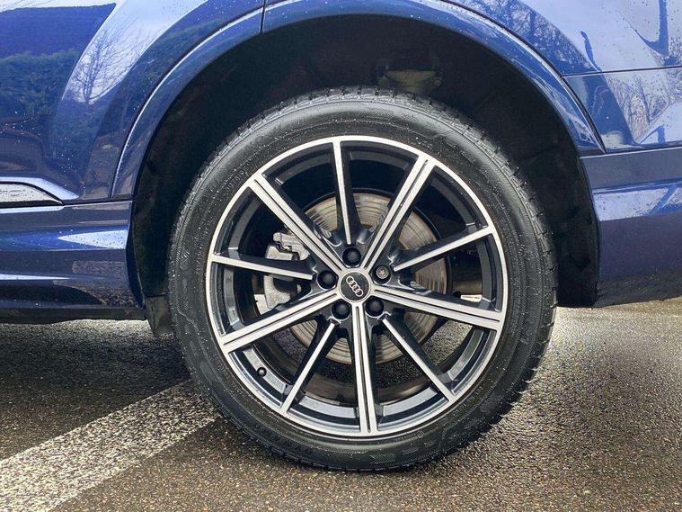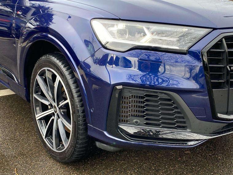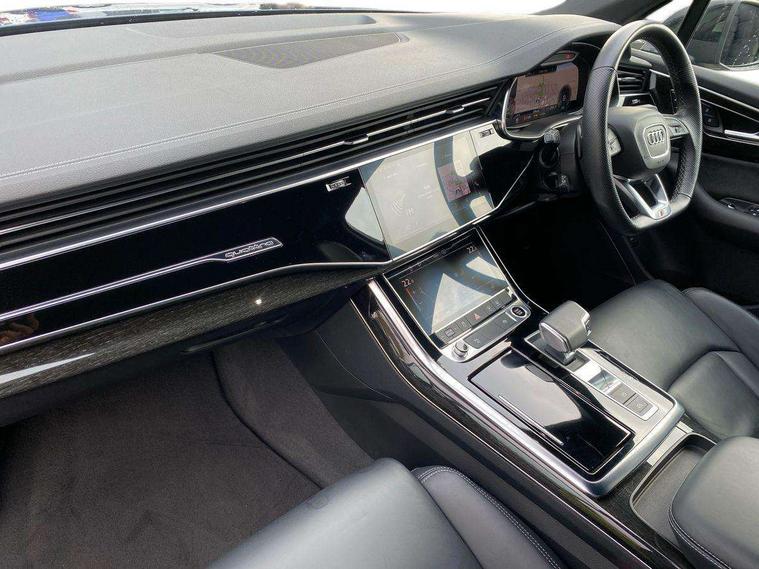 Audi connect safety and service (e-call), Audi connect with Amazon Alexa Integration, Audi drive select (Auto, Comfort, Dynamic, Efficiency, Individual, Off-road and All road), Bluetooth interface, Camera based traffic sign recognition, Electromechanical steering, MMI navigation plus with MMI touch screens includes 10.1" and 8.6" screens with haptic feedback, Natural voice recognition, Parking system plus with 360 degree display (front, rear and side sensors) - acoustic and visual park assist system, Power operated tailgate, Rear view camera, Smartphone interface includes wireless Apple carplay/Android Auto, Start/stop system, 48V Mild hybrid technology, 85 litre fuel tank, Adaptive air sports suspension, Quattro all wheel drive with self locking centre differential, Audi music interface - front 2 USB-C ports with charger and data functions, Audi sound system with 6 channel amplifier, 180 watt amplifying capacity and 10 loudspeakers including subwoofer, DAB digital radio module, 3rd brake light, Audi matrix LED headlights with dynamic front and rear indicators, Auto dimming frameless rear view mirror, Black roof rails, Bumpers in contrast paint scandium grey finish includes door trim and wheel arch trim strips, inlays in door strip contain quattro embossing, Electrically adj heated/folding + automatically dimming exterior mirrors with memory + automatic kerb side function for passenger side exterior mirror, Heat insulating glass in windshield, Integrated LED indications in door mirrors, LED daytime running lights, LED rear tail lights, Privacy glass - dark tinted rear and rear side windows from B-pillar backwards, Rear side wing doors, Rear wiper, 2 seat bench in 3rd row, 3 seat bench in 2nd row, 4 zone deluxe automatic climate control, 7 seat layout with ISOFIX points for the front passenger seat and rear passenger seat, Black cloth headlining, Comfort front centre armrest, Electric adjustable front seat with 4 way lumbar support, driver memory functionality, Folding rear seats, Front head restraints, Front/rear floor mats, Heated front seats, Illuminated door sill trims with S logo, LED interior ambient lighting, Luggage compartment cover, Luggage compartment sill protection in stainless steel, Rear head restraints, Single front passenger seat, Stainless steel pedals, Sunvisors with illuminated vanity mirrors, Titanium black styling pack - Q7/SQ7, 3 point seatbelts on all rear seats, Audi pre sense front, Child locks on rear doors, Driver and front passenger, front side and curtain airbags, Electromechanical parking brake, Electronic Stabilisation Control (ESC) including ABS, ASR and EDL, Extended pedestrian protection measures, Hill hold assist, Seatbelt monitoring, Tyre pressure loss indicator, Warning triangle and first aid kit, Anti theft alarm, Anti-theft wheel bolts and wheel loosening detection, Keyless Go, Remote central locking, Polished oak trim with grey finish inlay, Tool kit, Tyre repair kit,