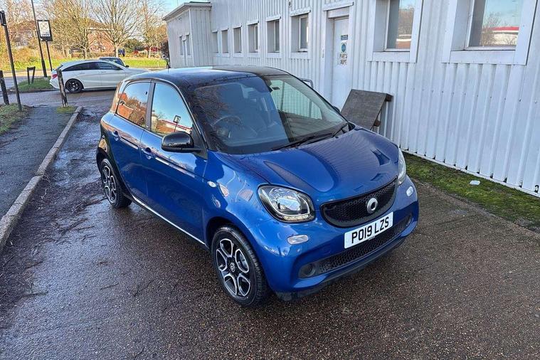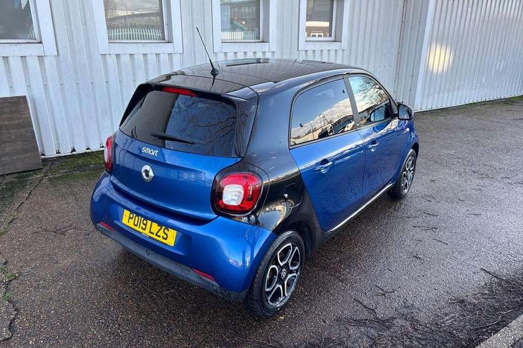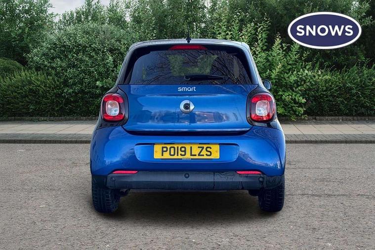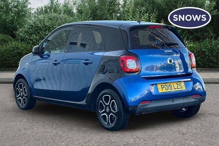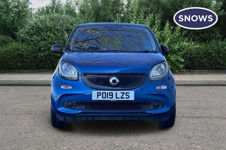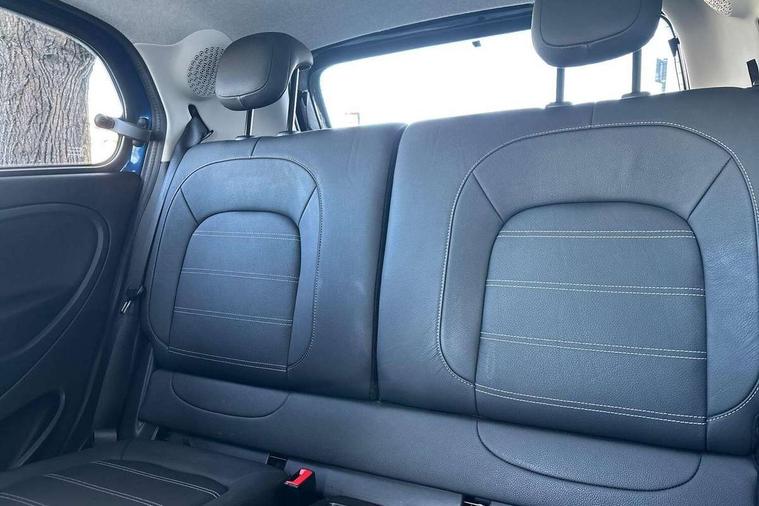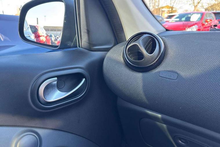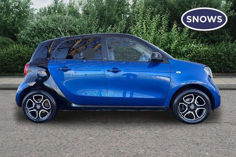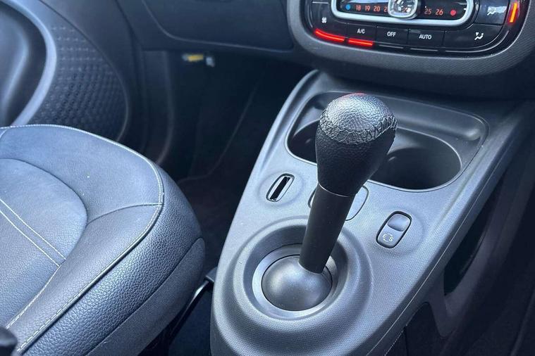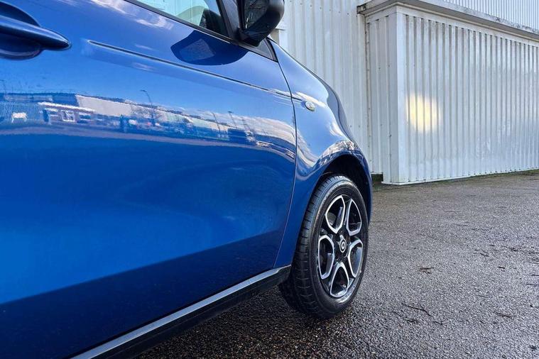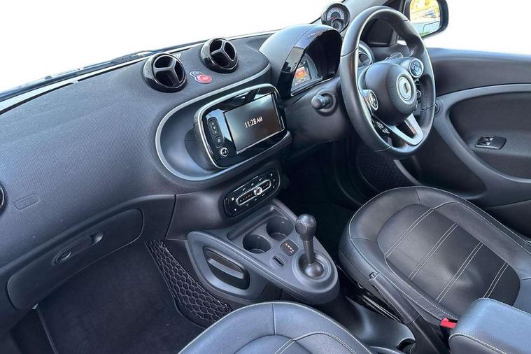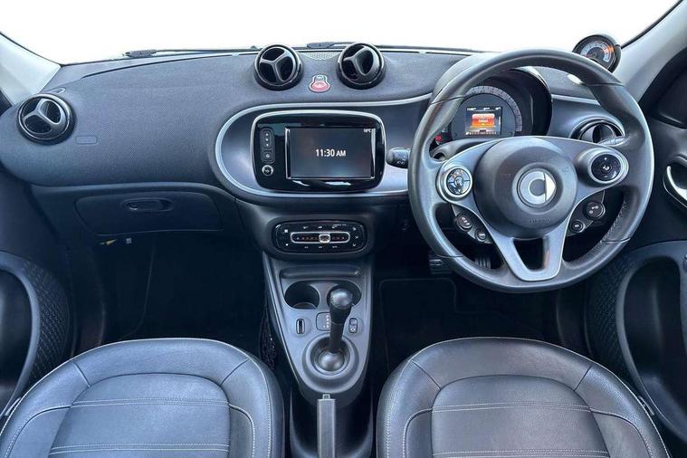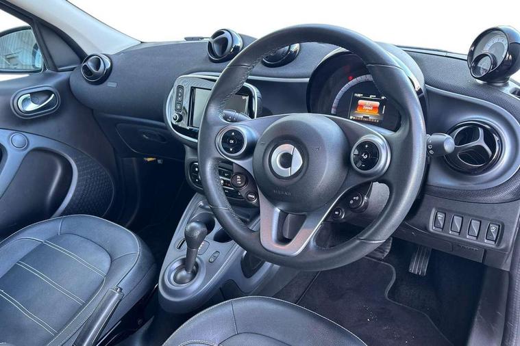 Breakdown kit with compressor, Crosswind Assist, Cruise control with speedtronic variable speed limiter, Dashboard instruments with cockpit clock and rev counter, Electric power steering, Instrument cluster with multifunctional 3.5 inch colour display, Mirrorlink compatible smartphone andriod apps on the 7" TFT display, On board computer, Outside temperature display with frost warning, Rear parking sensors, Service interval indicator, Voice recognition for smartphones, Twinamic 6-speed dual clutch automatic transmission, Smart media system - smartphone, 7" display, FM/AM tuner, AUX/USB, voice control, bluetooth hands free, audio streaming, 3D navigation and 2 speakers, 85 degree opening rear doors, Body colour door handles, Body coloured bumpers, Door mirror with aspherically curved mirror glass on the driver's side, Driving mirrors in tridion colour, Electric windows, Halogen headlights, Heated glass rear windscreen + timer control, LED daytime running lights, Lockable service bonnet, Panoramic glass roof with sunblind, Radiator trim in black, Rear windscreen wiper with intermittent wiper control and automatic wipe/wash function, Tail lights, Third brake light, White side indicators, 12V socket with cover, 2 rear head restraints, 3 Spoke leather multi function steering wheel, 50/50 split folding rear seat backrest, Automatic climate control, Centre console with pull out tray and double cup holder, Dashboard and door centre panel in black fabric, Driver/passenger sunvisors with ticket holders + vanity mirrors, Drivers/passenger heated seats, Front head restraints, Front passenger grab handle, Handbag holder, Interior door opener in matt chrome, Interior lighting incl. reading light for driver and passenger, Isofix attachments on outer rear seats, Leather trimmed gearshift, Leather upholstery, Load lashing eyes in luggage compartment, Luggage compartment cover, Luggage compartment lighting, Passenger seat with through load function, Ready space seats at rear with removable cargo box, Storage compartment in front doors, Sunglasses holder, Comfort pack - ForFour/ForTwo, Stowage space package - ForFour, Airbags - kneebag for driver, Airbags - sidebags for driver and front passenger (combined head/thorax airbags), Anti-lock braking system (ABS), Crash sensor for activation of hazard warning lights, Driver and passenger airbags, Electronic brake force distribution, Electronic Stability Programme, Hill start assist, Pedestrian impact protection front and side, Seat belts - Three-point, with seat belt tensioners and belt force limiters, Seatbelt reminder for driver and front passenger, Traction control, Tyre pressure monitoring system, Central locking with radio remote control and visual locking verification signal, Drive lock - Doors locked automatically when vehicle is on the move, Folding key, Immobiliser, Remote locking fuel filler flap, 15" 5 twin spoke alloy wheels painted in black with high sheen finish, Tyre repair kit,