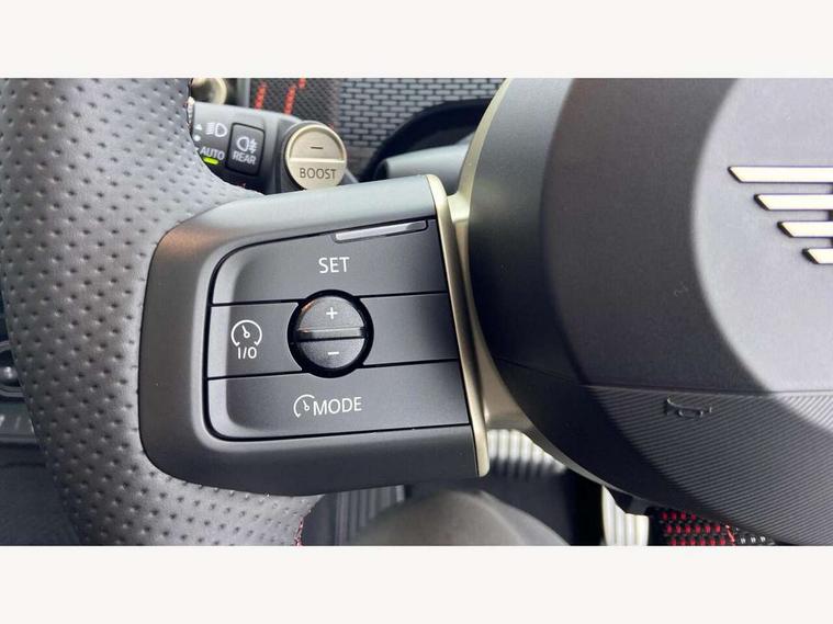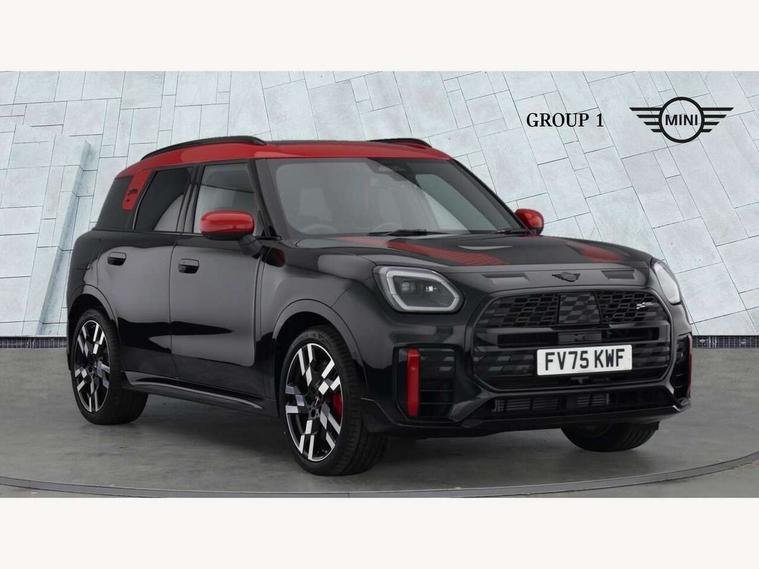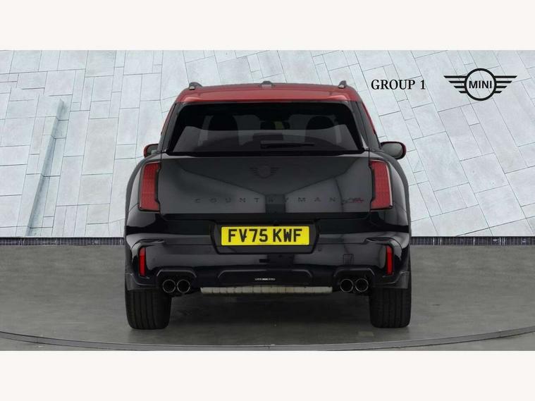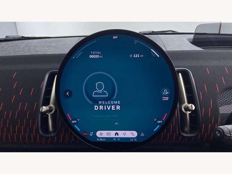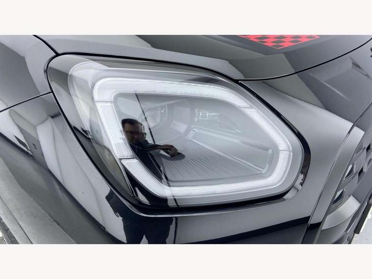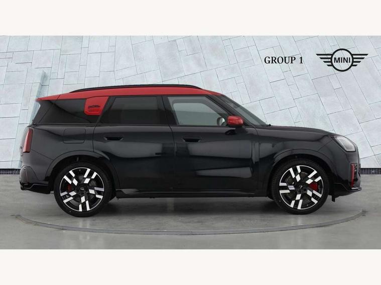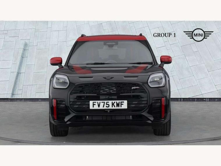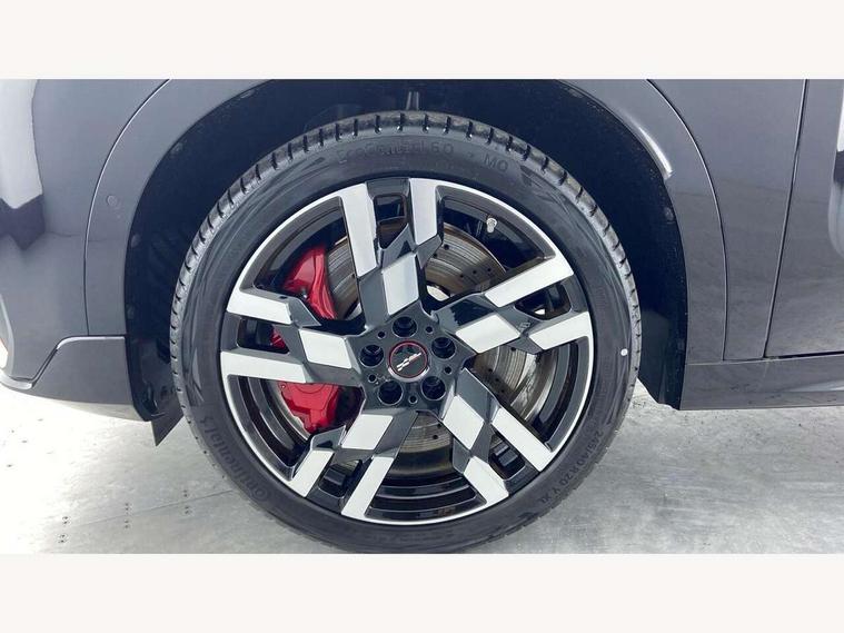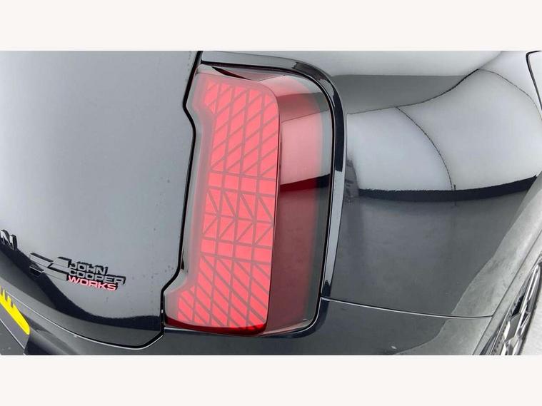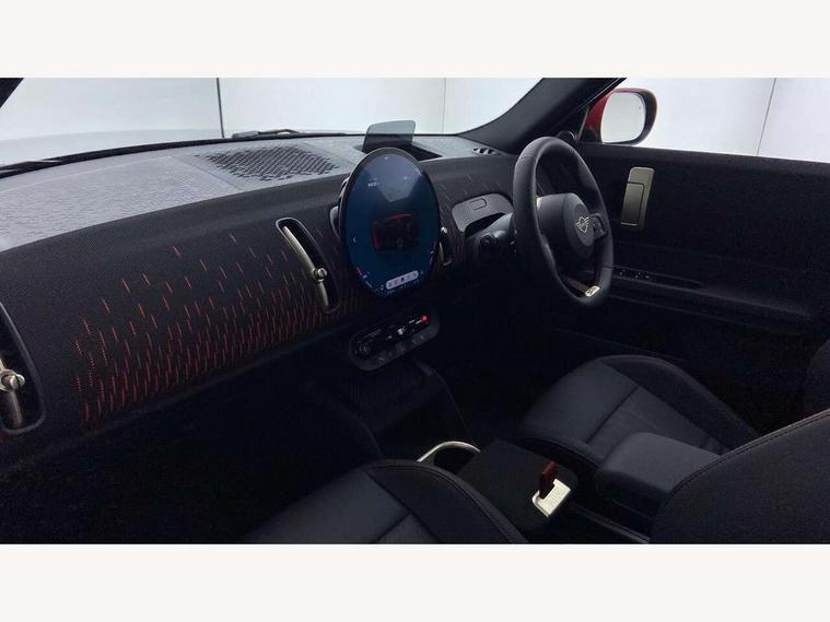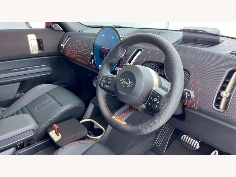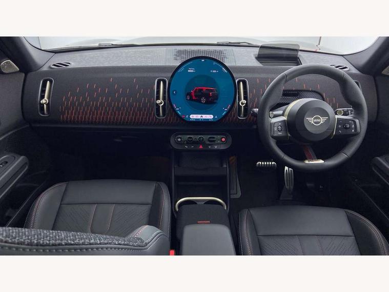 Bluetooth connection, Circular OLED Screen, Compatible mobile phone bluetooth with audio streaming, Cruise Control (DCC), Digital dashboard display, Driving assistant, Driving Assistant Plus Preparation, E-call, Electro-mechanical speed dependant steering assistance, MINI Experience Modes, MINI Head up display, Mini navigation system, MINI TeleServices, Parking assistant in camera and ultrasound based assistance system, rear view camera, parking aid and distance control, Adaptive suspension, Double clutch sports transmission, Larger capacity fuel tank, Quad exhaust system, DAB Digital radio, Harman Kardon surround sound system, Personal eSim, Auto tailgate, Electric adjustable heated door mirrors, Front and rear apron, Front and rear electric windows, Heated rear window, High beam assistant, High gloss hexagonal patterned grille surround, Interior rear-view mirror with automatic anti-dazzle function, LED daytime running lights, LED headlights with extended contents including Adaptable light signatures, LED rear lights, LED third brake light, Rain sensor with auto headlights, Rear roof spoiler with airblades, Rear side wing doors, Rear window wiper, Roof rails, 3 seat bench in 2nd row, 60/40 split rear bench seat, Anthracite headliner, Auto air conditioning, Driver and front passenger seat heating, Floor mats, Front armrest, Front headrests, Heated steering wheel, Height and length steering column adjustment, JCW Front sports seats, Lidded storage box in Black/Red knit, Luggage compartment separating net, Perforated Vescin steering wheel, Rear headrests, Seat adjustment for rear seats, Single front passenger seat, Sunvisors with vanity mirrors, Wireless charging tray, Interior and exterior mirror package - Mini Countryman, 3x3 point rear seat belts, 6 Airbags - front, side, head and seat belt tensioners, ABS, DSC - Dynamic Stability Control, Electronic handbrake, Electronic Stability Programme (ESP), Front ISOFIX (iSize), Hill descent control, Hill hold assist, Hill start assist, JCW logo in brake calipers, JCW Sport brakes with Chilli Red calipers, Manual rear child locks, Traction control, Tyre pressure monitoring system, Warning triangle, Alarm system with tilt sensor, monitoring doors, bonnet interior and tailgate, Auto drive away locking, Comfort access system, Deadlocking function, Electronic vehicle immobiliser, Locking wheel bolts, Remote control locking, Start/stop toggle with keyless go, 19" JCW Runway Spoke Black alloy wheels, Tyre repair kit plus,