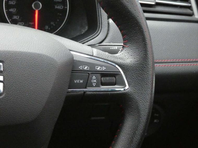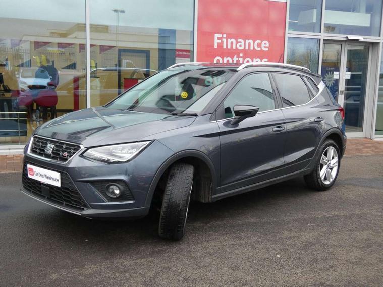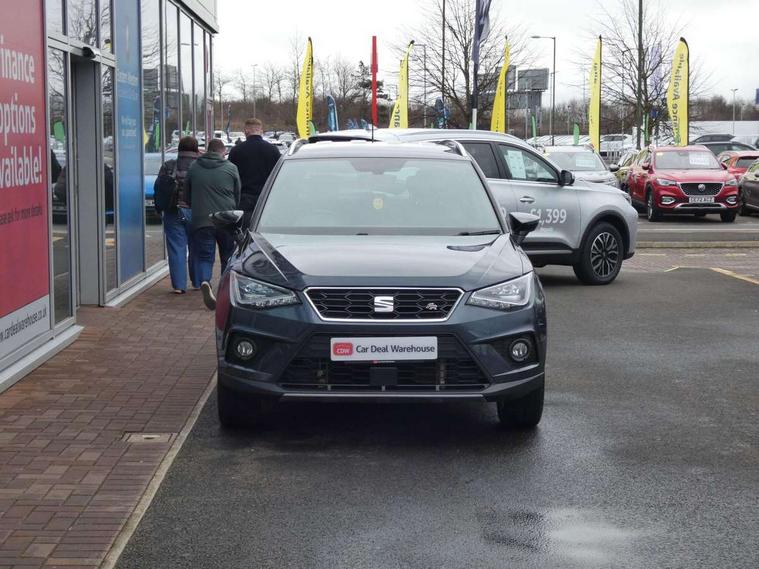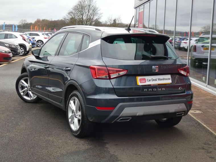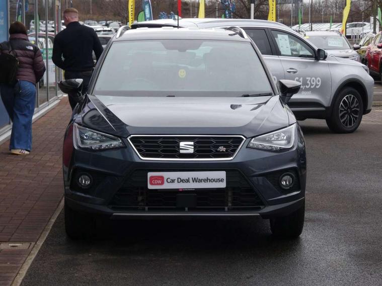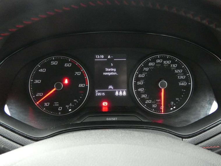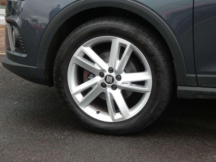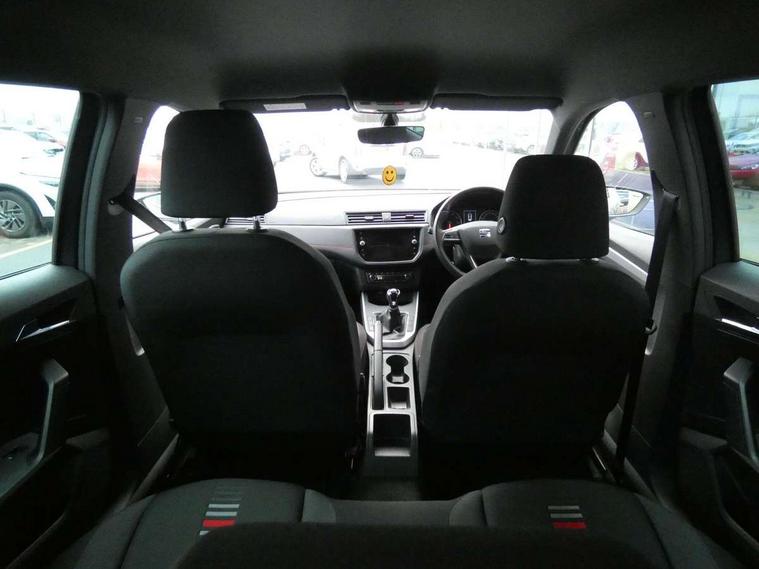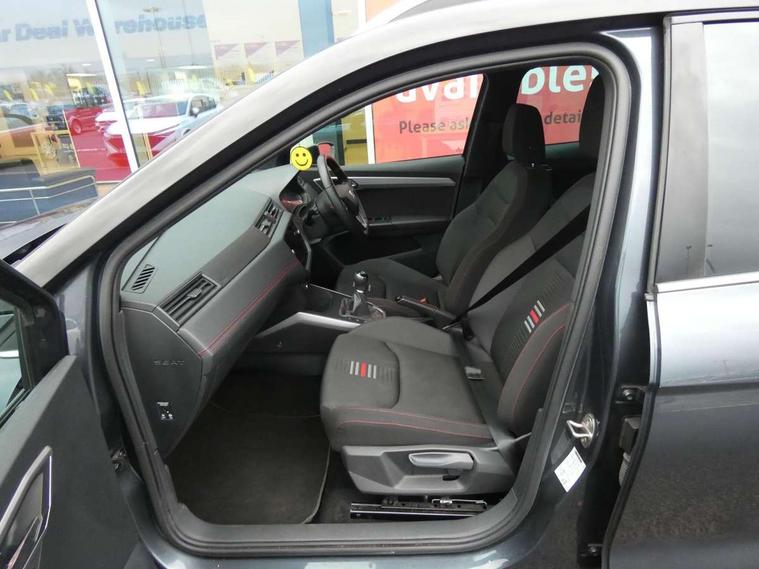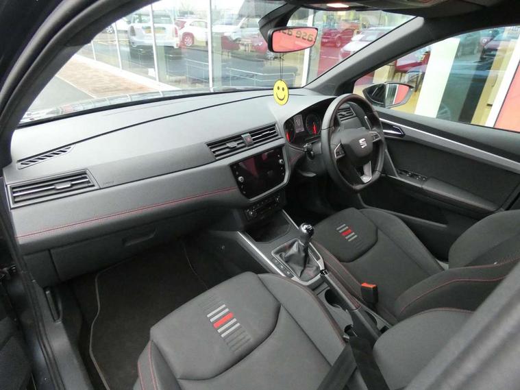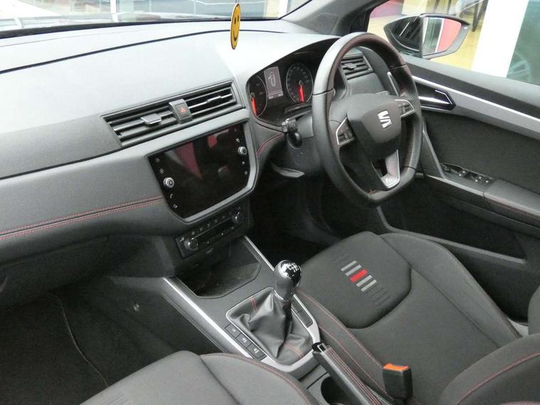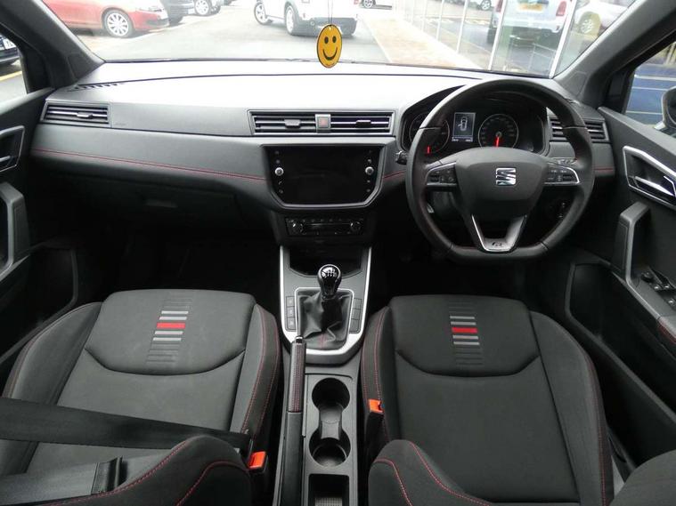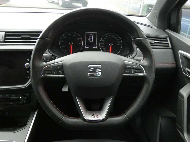 'Lights On' Reminder warning buzzer, Cruise control and speed limiter, Digital clock, Electric speed sensitive power steering, Full Link Smartphone Integration with Mirror Link, Apple Car Play, Google Android Auto with USB Type C cable for Apple and Android compatibility, Low fuel warning light, Outside temperature display, Rear parking sensor, RPM counter, Seat connect with safety, service, remote and online, SEAT Drive profile - Four different models normal-sport-eco-individual, steering response, throttle response, Trip computer, Sports suspension, Bluetooth interface for hands free and audio streaming, DAB digital radio and AM/FM radio, Steering wheel mounted audio controls, Anti theft roof antenna, Auto dimming interior rear view mirror, Automatic activation of hazard warning lights, Automatic headlights, Body coloured bumpers, Body coloured door handle inserts, Chrome front grille frame, Chrome roof rails, Chrome window trim, Coming/leaving home lighting function, Dark tinted rear windows, Electric front/rear windows with one touch/auto up/down, Electrically adjustable, heated and folding door mirrors, Full LED headlights dipped and mainbeam + front and rear fog lights, LED daytime running lights, LED rear tail lights and licence plate lights, Protective side mouldings, Rain sensing wipers, Rear window wash/wipe, Roof colour door mirrors, Twin exhaust pipe styling hidden exhaust pipe, Visible VIN plate, Windshield wiper with intermittent control and potentiometer, 2 cupholders, 60/40 split folding rear seat, Aircare filter, Black interior roof, Double boot floor, Driver sunvisor with covered mirror + card holder, Dual zone climate control, Front courtesy light with front reading lights, Front sport seats, Gear shift indicator, Height adjustable front seats, Height/reach adjustable steering column, Illuminated boot, Instrument lighting with brightness control, Interior light in footwell, central console and door panel, ISOFIX points in outer rear seats with top tether anchorage points, Multi-colour ambient interior lighting, Nora cloth upholstery, Passenger sunvisor with vanity mirror, Perforated flat bottomed leather steering wheel/gear knob/handbrake with red stitching and FR logo, Two front and three rear height adjustable headrests, Connectivity pack plus - Arona, Interior chrome pack - Arona, 3 point seatbelts on all rear seats, ABS, Active front headrests, Child locks on rear doors, Driver and front passenger airbags with front passenger airbag de activation, front side and curtain airbags, Electronic stability control, Emergency Brake Assist (EBA) and front assist, Front and rear seatbelt reminder, Hill hold control, Multi-Collision braking, Tiredness recognition system, Traction control, Tyre pressure monitoring system, 2 folding remote keys with window open/close function, Alarm with back-up horn, Electronic engine immobiliser, Locking wheel bolts, Remote central locking + deadlocks, Tow away protection, Interior chrome line trim, Leatherette dashboard, 17" Dynamic alloy wheels,