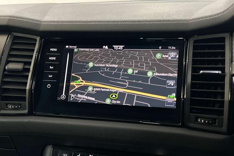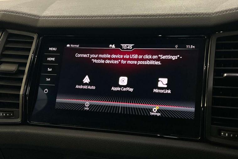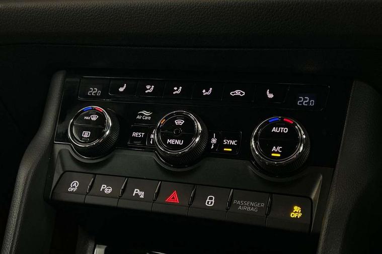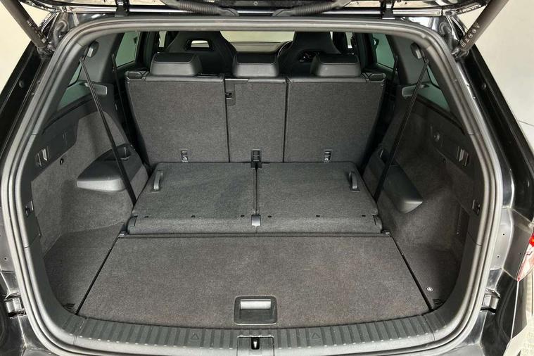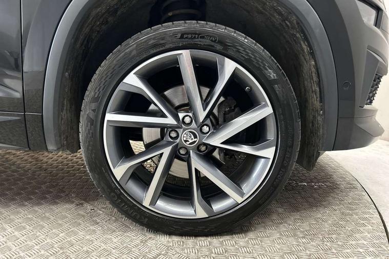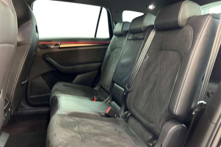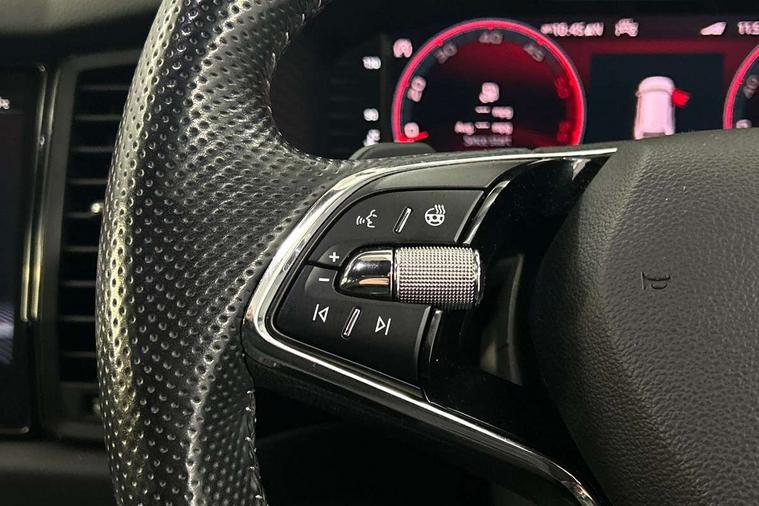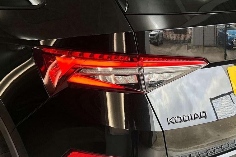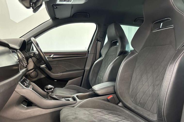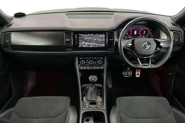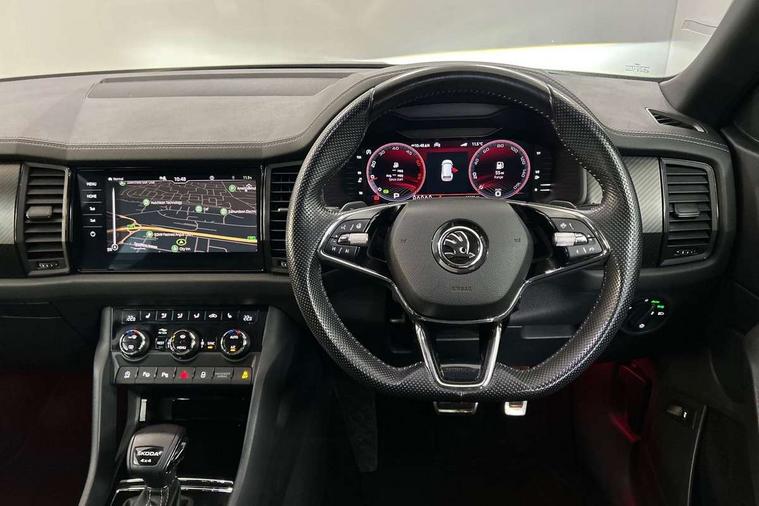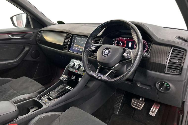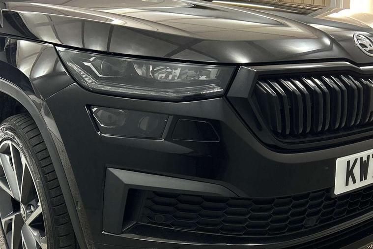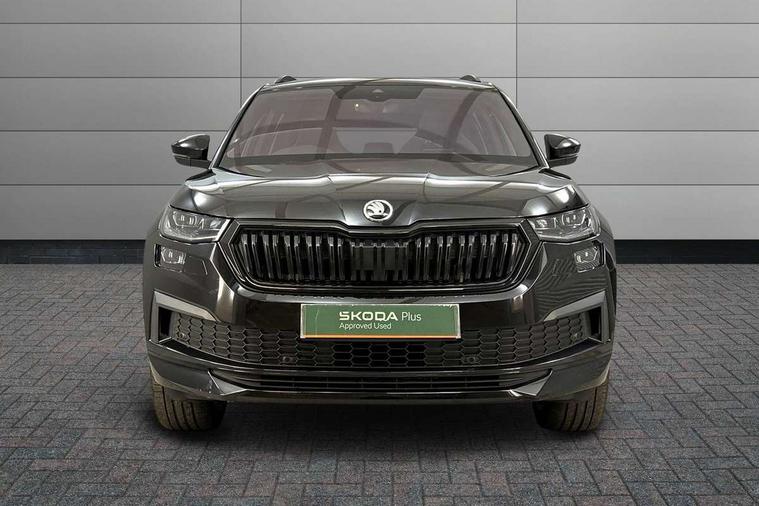 Bluetooth system, Columbus satellite navigation with 9.2" touchscreen, integrated Wi-Fi, web radio, Digital voice enhancement, e call+, ECO Stop/start function, Exterior temperature indicator, Progressive steering, Rear view camera, Smartlink wireless for apple carplay and wired for android auto, Speed limiter, Tailgate unlocking from outside, USB C Port x 2 in front centre console, Virtual Cockpit - 10.25" digital display with additional sports design, Wireless charging, 8 Speakers, DAB Digital radio, Aero front windscreen wipers with intermittent function, Aero rear window wiper, Auto dimming rear view mirror, Black roof rails, Black sports styling including front grille and window surrounds, Black wheel arch surrounds, Body colour bumpers, Body colour door handles, Electric adjustable/heated/folding door mirrors, driver side auto dimming with boarding sports and memory function, Electric front and rear windows, Extended rear spoiler with finlets in gloss black, Front fog lights, Full LED matrix headlights with AFS (adaptive front light system), cornering function and AWL (all weather lighting system), Gloss black door mirrors, Headlight washers, Heated rear window, Invisible tailpipe, LED daytime running lights, LED rear fog light, LED third brake light in rear spoiler, Light assistant (coming/leaving home/tunnel light), Off-road style lower front bumper element, Privacy glass, Rain and light sensors, Rear diffuser, Rear LED lights (high functionality) with welcome effect and dynamic indicators, Rear side wing doors, Safety reflectors on front and rear doors, Sportline badge on front fender, Sports front and rear bumpers including lower rear chrome strip, Tailgate lettering in Black, Window control switches with black trim, Without engine designation, 12V socket in boot, 2 rails with 2 hooks, 2 seat bench in 3rd row, 3 seat bench in 2nd row, 3 spoke leather multifunction sports steering wheel with DSG paddles, 4 foldable roof handles with rear coat hooks, 60:40 foldable rear seat with sliding adjustment and backrest angle adjustment, Aluminium pedals, Black roof headlining, Bottle holders in door panel in the 1.5 litre front and 1 litre rear, Cargo storage compartments, Chrome headlight control button, Chrome interior door handles, Coat hooks on B pillar, Covered storage compartment on driver side, Decorative door sill covers, Front and rear door armrest with black adductor trim, Front centre armrest with storage compartment, cup holder and 12V socket, Front courtesy lights, Gear shift lever with chrome frame and black gloss insert, Grey stitching in front and rear armrests and door armrests + door inserts, Height adjustable front headrests, Illuminated glovebox, Illuminated luggage compartment, Isofix child seat fittings in outer rear seats with top tether, Manually adjustable steering column, Microsuede door panels, Net programme in boot (1x horizontal Net, 2x vertical Nets), Overhead glasses storage compartment, Pollen filter, Rear centre armrest with cupholders, Single front passenger seat, Sliding trunk cover, Small Bags on the inner sides of the front backrests, Sports seats, Sunvisors with illuminated vanity mirrors, Three rear height adjustable headrests, Ticket holder on A Pillar, Umbrella in door panel, Variable boot floor, LED Interior light pack - Kodiaq, Auto door release and activation of warning lights in the event of an accident, Driver and front passenger airbag with knee airbag and front passenger airbag deactivation, Electronic parking brake with hill start assist, Emergency rear braking signal, ESC (incl. ABS+MSR+ASR+EDS+HBA+DSR+RBS+MKB), Front assist with autonomous emergency braking, Front side airbags with curtain airbags, Fuel cut off safety device, Height adjustable front 3 point seatbelts + pretensioners, Hill hold control, Rear disc brakes, Safety vest holder in door, Seat belt reminder for all seats, Three point rear seat belts, Two tone horn, Tyre pressure monitor, Alarm with interior monitoring and tilt sensor with safe function, Anti-theft wheel bolts, Immobiliser, Keyless entry and start system (KESSY), Remote central locking with 2 keys, Black air vent surround, Carbon finish dashboard and door inserts, Grey stitching in dashboard, 20" Vega Anthracite alloy wheels, Temporary spare wheel (space saver),
