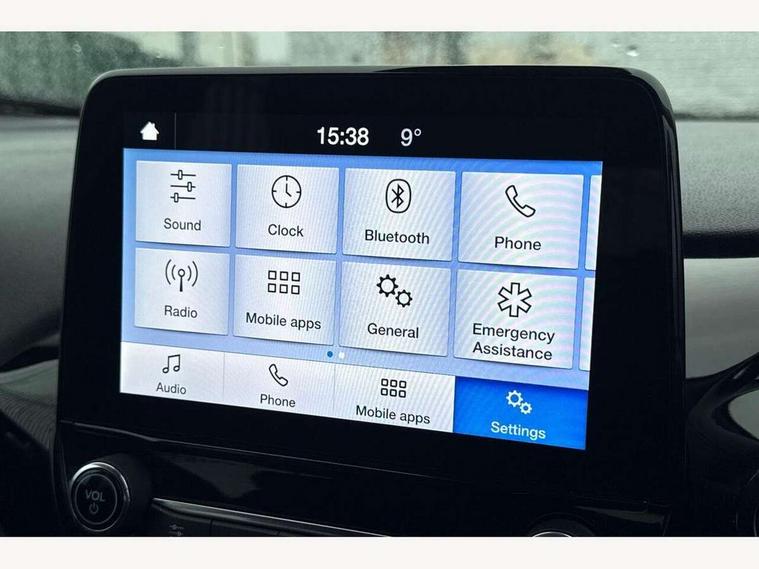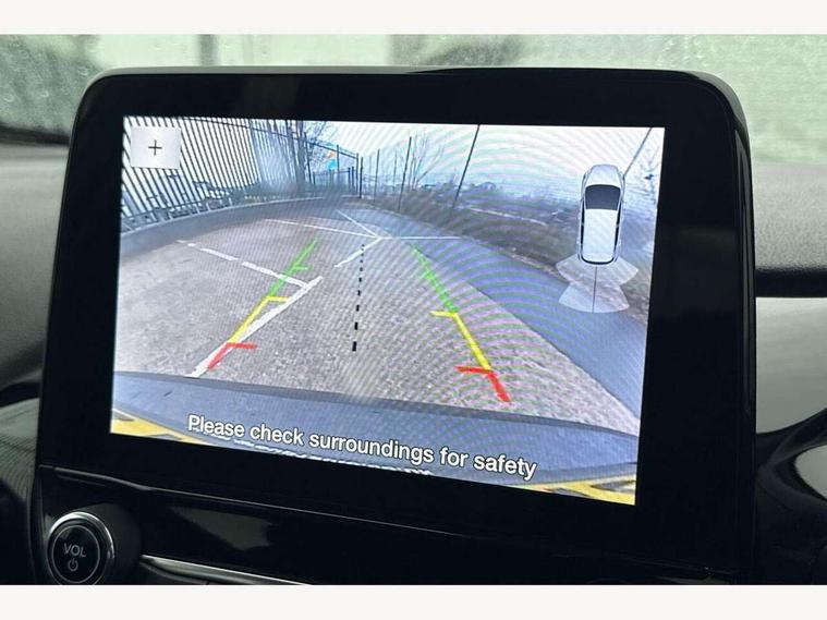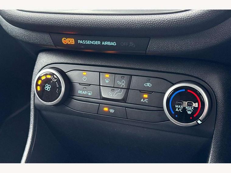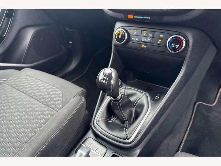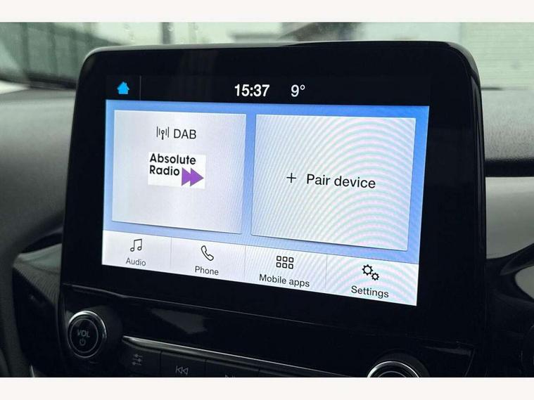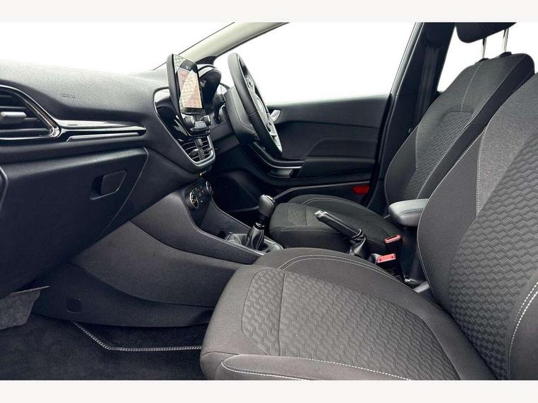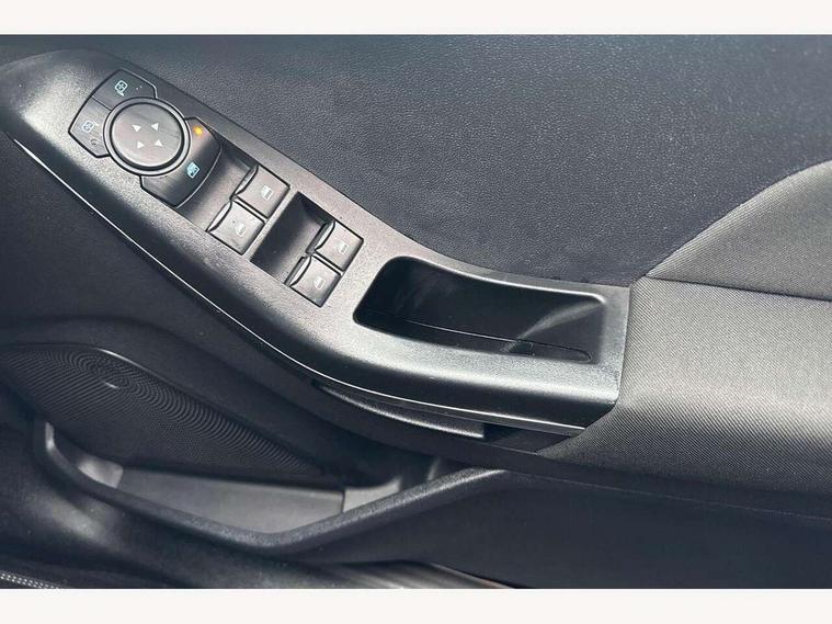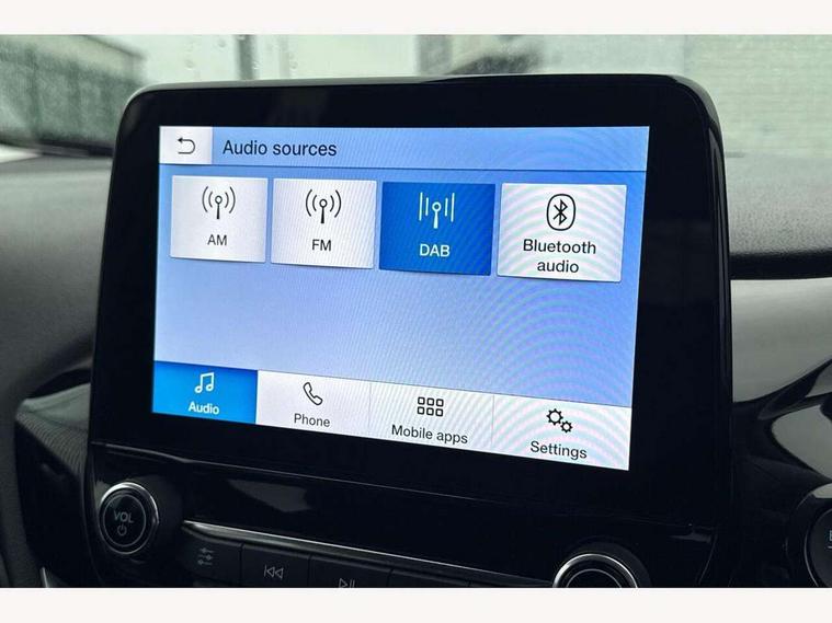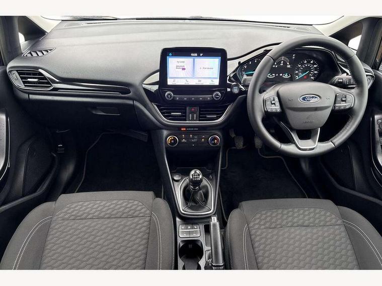 Bluetooth system, Electric power steering, Ford easy fuel, Ford SYNC 3 Navigation system incl 8" touchscreen, 7 speakers, FordPass connect, Apple carplay, android auto, voice control and emergency assistance, Rear parking distance sensors, Selectable drive modes (Normal, Sport, Track), Trip computer, 2 USB ports, Auxiliary input socket, DAB Digital radio, Steering wheel mounted controls, Body colour bumpers, Body colour door handles, Body colour rear spoiler, Body coloured electrically operated and heated door mirrors with side indicators, Chrome beltline trim, Chrome front grille, Chrome lower window surround, Cornering front fog lights, Electric front windows/one touch facility, Electric rear windows, Quickclear heated windscreen, Rain sensing wipers and auto dimming rear view mirror, Rear privacy glass, Rear wiper, 3 spoke leather trimmed steering wheel with audio control, 60/40 split folding rear seat, Adjustable head restraints, Boot carpet, Centre console with opening armrest, 2x cupholders, 12v and USB, Chrome inner door handles, Cloth upholstery, Footwell illumination, Front floor mats in velour, Front map reading lights, Front seat and rear pockets, Illuminated glovebox, Leather gaiter, Load area light, Luxury woven headliner, Manual 2 way passenger seat adjust, Manual 4-way driver seat adjust, Manual air conditioning, Overhead console with sunglasses holder, Pollen filter, Rake/reach adjustable steering wheel, Sensico wrapped steering wheel, NCAP Pack - Fiesta, 3 point seatbelts on all rear seats, ABS+EBA, Curtain airbags, Driver and passenger airbags, Drivers knee airbag, Electronic stability control with hill start assist, Front passenger airbag deactivation, Front side airbags, Seatbelt warning, Two tone horn, Tyre pressure monitoring system, Keyless start with 'Ford Power' starter button, MyKey system, Remote central locking & engine immobiliser, Thatcham Cat.1 alarm, 16" 10 spoke alloy wheels,