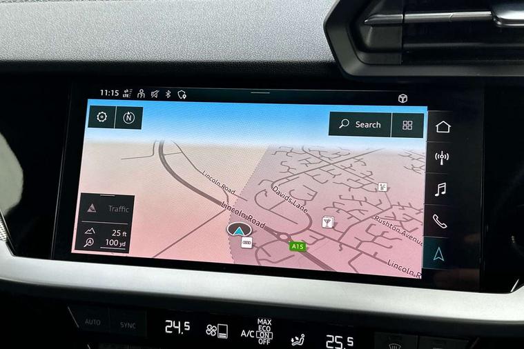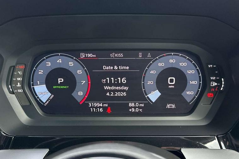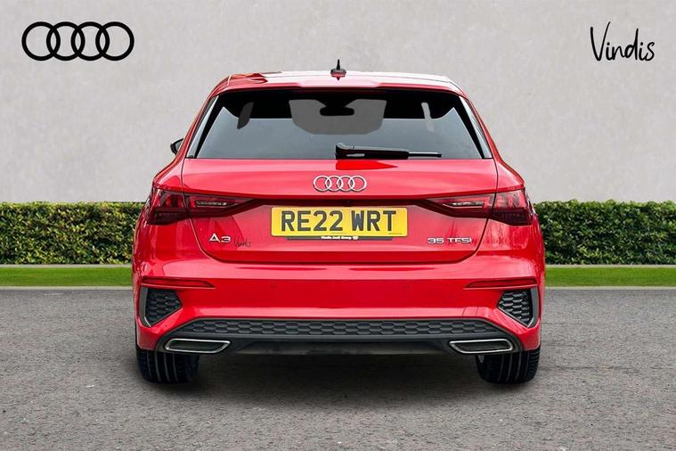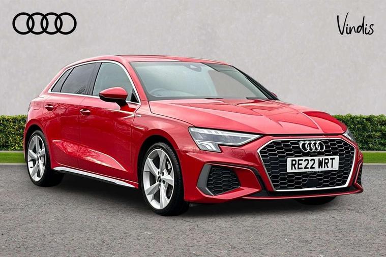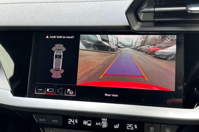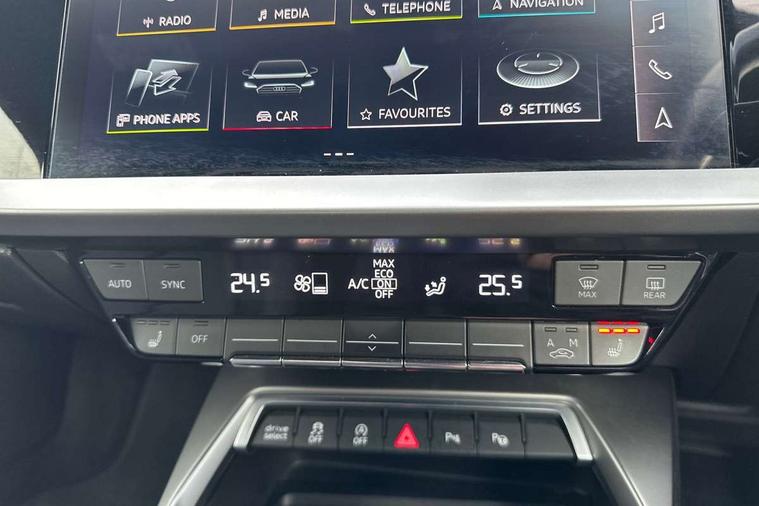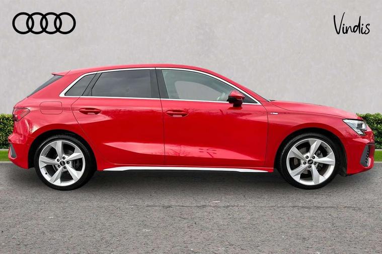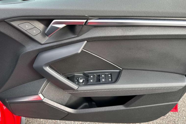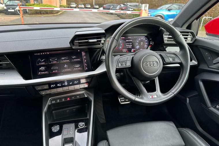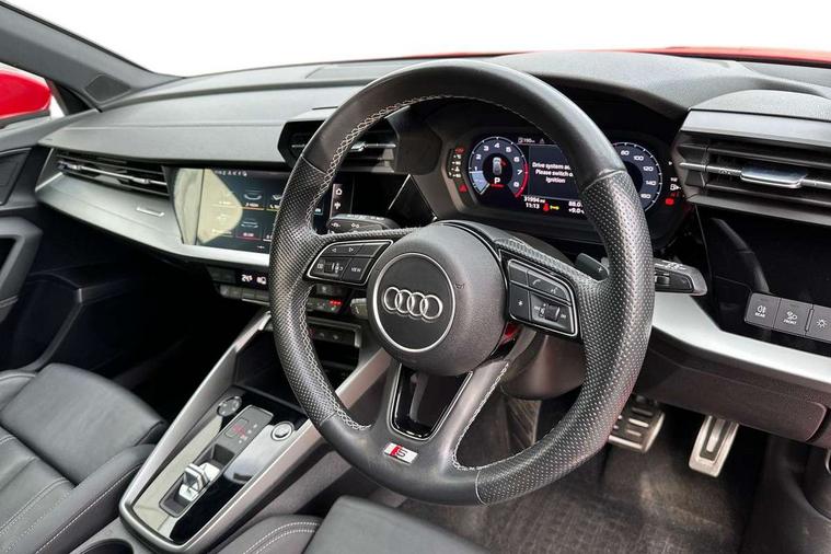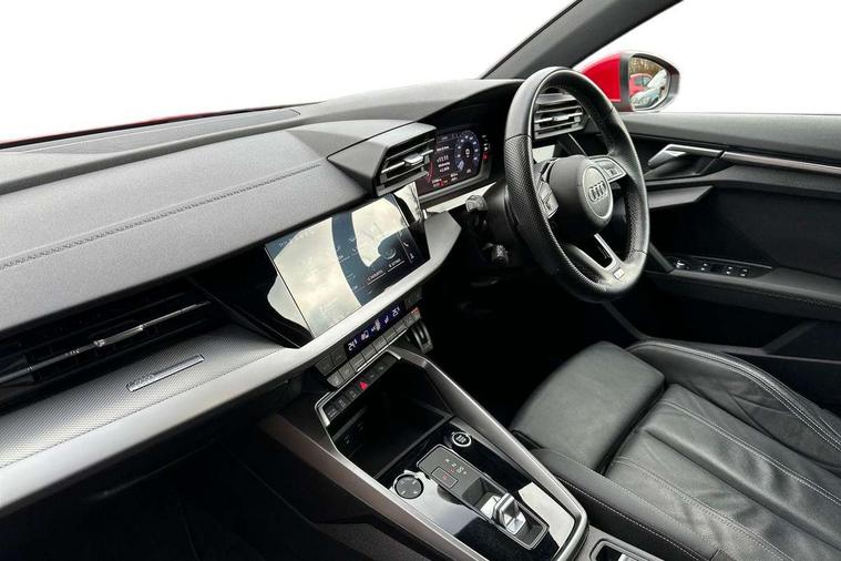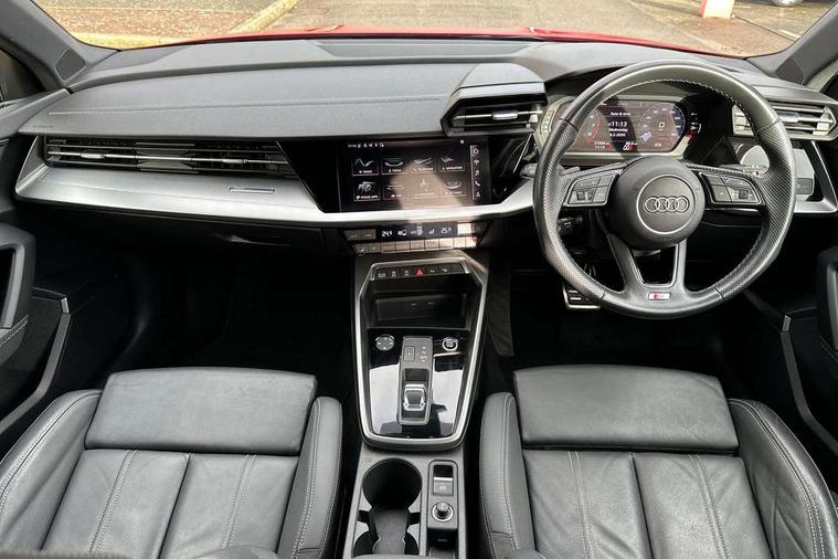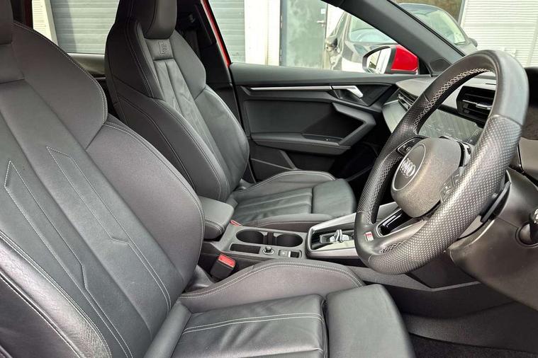 Audi drive select (Auto, Comfort, Dynamic, Efficiency and Individual), Audi smartphone interface, Audi Virtual Cockpit - 10.25" digital and colour instrument cluster, Automatic start/stop system with recuperation, Bluetooth interface, Collision avoidance assistant, e-Call (emergency call), Electromechanical power speed sensitive steering, Lane departure warning system, MMI Navigation Plus with high resolution 10.1" colour touch screen display, Service indicator, Trip computer, Voice control system with natural language interaction, 2xUSB-C connection with data and charging functions, 6 passive loudspeakers, DAB Digital radio, 3rd brake light, Acoustic glass windscreen, Aluminium window trim, Auto dimming frameless rear view mirror, Electrically adjustable/heated/folding/dimming door mirrors with kerb view includes integrated LED indications + kerb view function for passenger side, Front electric windows, Illuminated aluminium inserts front door sills with S logo, LED daytime running lights, LED headlights with LED rear lights and dynamic rear indicators, Light and rain sensors, Privacy glass - dark tinted rear window, rear door and side windows, Rear electric windows, Rear side air outlets in grained matt black, Rear side wing doors, Rear wiper, S line bumpers, S roof spoiler, 12V socket and storage compartment in front centre console, 3 seat bench in 2nd row, 40/20/40 split folding rear seat bench with cupholder, Black cloth headlining, Dual zone electronic climate control, Front and rear centre armrest in leather, Front and rear headrests, Front/rear floor mats, Height and reach adjustable steering wheel, Illuminated vanity mirror, Interior lighting - glove compartment light and right hand side, Luggage compartment floor covering, Manual boot compartment lid, Manually adjustable front seats, Seat side bolsters, Single front passenger seat, Stainless steel pedals and front footrest in black, Twin leather upholstery with front sports seats S embossed logo, Aluminium interior elements pack - A3 Sportback, S line styling pack - A3 Sportback, 3x3 point rear seat belts, Audi pre sense front, Driver and front passenger airbag with passenger airbag deactivation, Electronic Stabilisation Control (ESC) including ABS, ASR and EDL, First aid kit with warning triangle and 2 safety vests, Front side airbags with head airbags and interaction airbag, Pre-sense front with pedestrian and cyclist detection, Seatbelt monitoring, Tyre pressure loss indicator, Anti theft alarm, Anti-theft wheel bolts, Immobiliser, Manual child locks, Remote control central locking, Accent surfaces in the dashboard and centre console in platinum grey silk effect paint finish, Dark spectrum aluminium inlays,