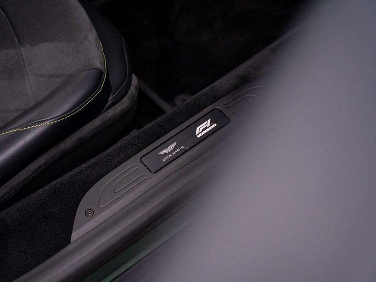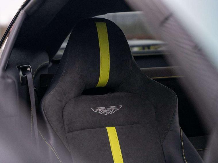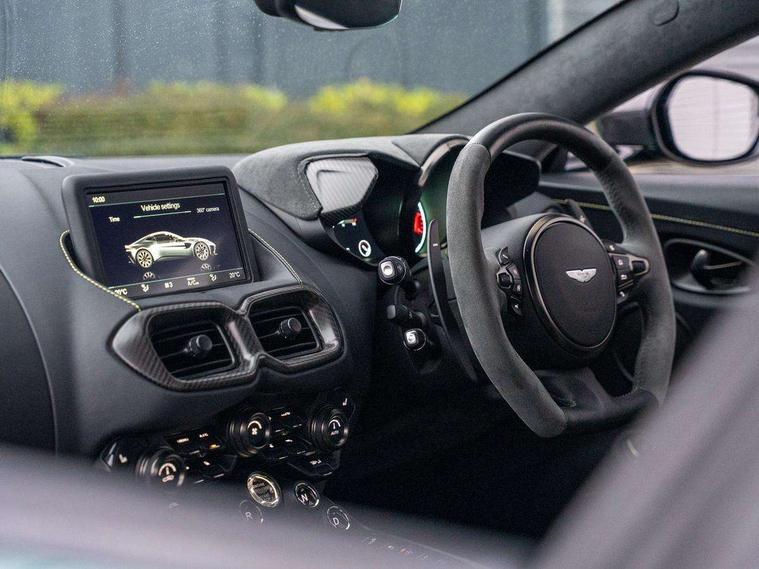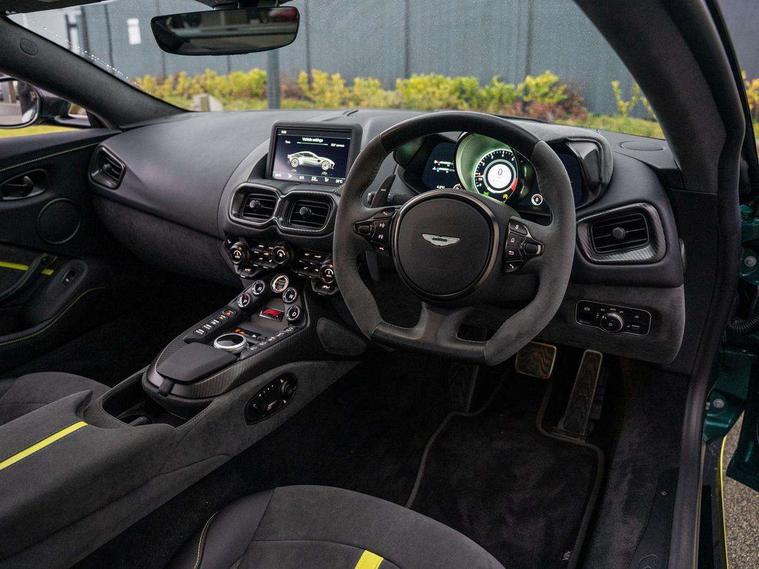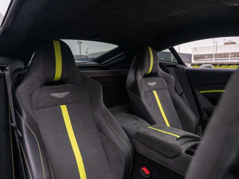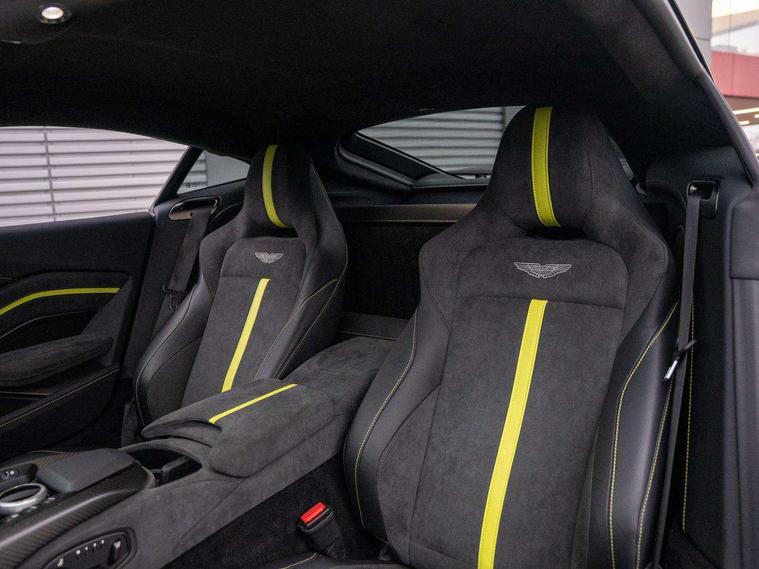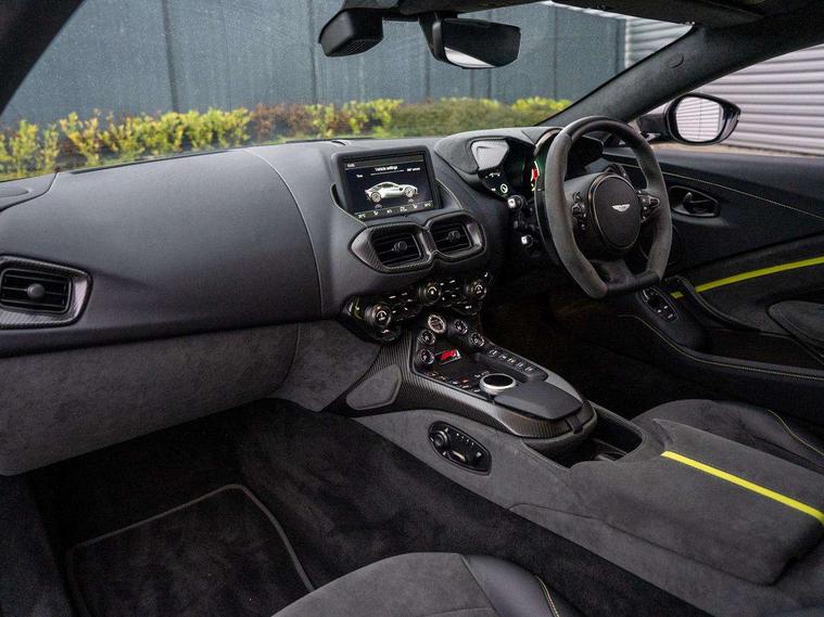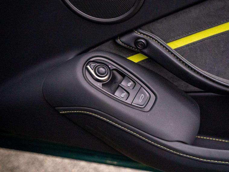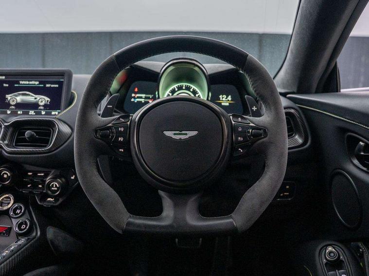 Emergency services call system, Park assist, Rotary dials, Servotronic speed sensitive power steering, Trip computer, Auxiliary input socket, DAB Digital radio, iPod connection, USB connection, 3rd brake light, Body colour door handles, Full width LED tail lights signature with stop tail and dynamic indicator functions, Gloss 2x2 twill carbon fibre roof, Gloss black aerokit, Gloss black window surround, LED daytime running lights, LED high and low beam headlamps with integrated directional indicator, LED lock/unlock graphic theatre lights, LED position lamp, Paint protection film, Quad matte black exhaust tailpipe finisher, Rear boot, Satin Q paint, Smoked tail lights, Special edition graphics, Black loadspace carpet, Centre console armrest with closed storage, Floor mats, Front head restraints, Heated front seats, Interior accent stripe and stitching in lime green, Primary cabin carpet colour, Primary leather upholstery, Single front passenger seat, Sport seats plus, Sports leather/alcantara steering wheel, Interior jewellery pack - Vantage - Satin dark chrome, Service pack - Vantage, Technology pack - Vantage, Upper pack - Vantage - 2x2 twill carbon fibre, ABS + EBD + EBA, Black seatbelts, DSC - Dynamic Stability Control, Front side airbags, Hill hold assist, Hydraulic Brake Assist (HBA), Traction control, Tyre pressure monitoring system, Alarm, Immobiliser, Remote central locking + boot release, Glass switches, Tyre repair kit,