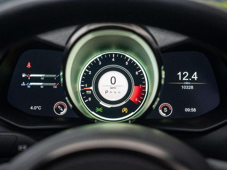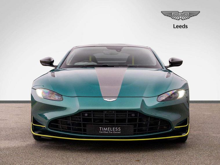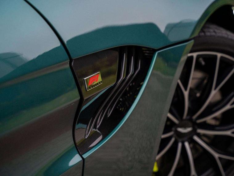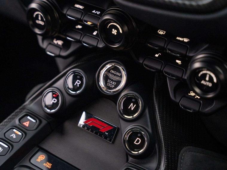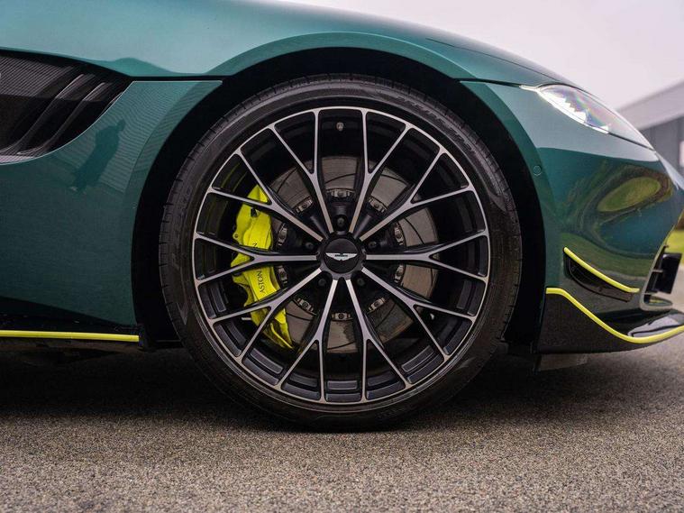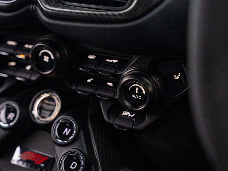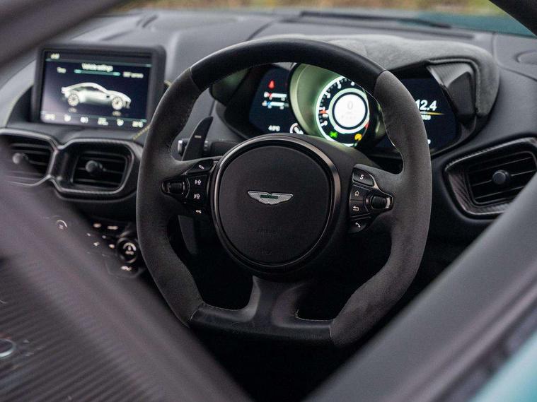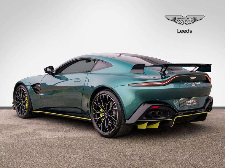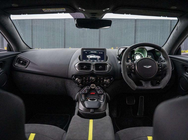 Emergency services call system, Park assist, Rotary dials, Servotronic speed sensitive power steering, Trip computer, Auxiliary input socket, DAB Digital radio, iPod connection, USB connection, 3rd brake light, Body colour door handles, Full width LED tail lights signature with stop tail and dynamic indicator functions, Gloss 2x2 twill carbon fibre roof, Gloss black aerokit, Gloss black window surround, LED daytime running lights, LED high and low beam headlamps with integrated directional indicator, LED lock/unlock graphic theatre lights, LED position lamp, Paint protection film, Quad matte black exhaust tailpipe finisher, Rear boot, Satin Q paint, Smoked tail lights, Special edition graphics, Black loadspace carpet, Centre console armrest with closed storage, Floor mats, Front head restraints, Heated front seats, Interior accent stripe and stitching in lime green, Primary cabin carpet colour, Primary leather upholstery, Single front passenger seat, Sport seats plus, Sports leather/alcantara steering wheel, Interior jewellery pack - Vantage - Satin dark chrome, Service pack - Vantage, Technology pack - Vantage, Upper pack - Vantage - 2x2 twill carbon fibre, ABS + EBD + EBA, Black seatbelts, DSC - Dynamic Stability Control, Front side airbags, Hill hold assist, Hydraulic Brake Assist (HBA), Traction control, Tyre pressure monitoring system, Alarm, Immobiliser, Remote central locking + boot release, Glass switches, Tyre repair kit,
