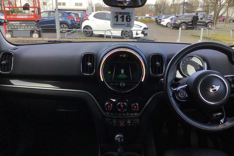 Active Guard incl speed limiting and lane departure functions with auto steering, and front collision warning with brake intervention, Automatic start/stop function with brake energy recuperation, Electro-mechanical speed dependant steering assistance, Instrument cluster, Mini E-call, MINI TeleServices, On board computer, Rear parking distance control, Double Vanos system, Fully variable valve control, High precision injection, FM tuner and DAB digital radio, Body colour fuel filler cap, Chrome line exterior, Day time driving lights, Door sill strips, Dynamic brake lights, Electric windows, Heated rear window, Heated windscreen washer jets, Left exhaust tailpipe with chrome finisher, Model logo, Model logo on Tailgate, Radiator grille, Rain sensor with auto headlights, Rear fog lights, Rear window wiper, Side scuttle panel with integrated indicator, Split rear doors, Sun/heat protection glass, White indicator lenses, 12V Accessory socket in centre console, 360L luggage compartment capacity, 4 lashing eyes in luggage compartment, 40:20:40 split folding rear seats, Chrome interior highlights, Cupholders, English handbook, Front headrests, Glove compartment, Height and length steering column adjustment, Interior lighting with 12 basic colours selectable via toggle switch in roof, Isofix rear child seat preparation, Leather gearshift lever and handbrake gaiters, LED reading lights, vanity mirror lights, front foot well light and spotlight on front seats, Manual air conditioning, Mechanical seat adjustment, driver seat height adjust, forward/back and front seats backrest, MINI Yours fine walk nappa leather steering wheel with contrast stitching in silver and MINI Yours badge, Multifunction steering wheel, Passenger seat height adjuster, Rear headrests, Storage compartments in doors, Sunvisors with vanity mirrors, Excitement pack - Countryman, Navigation pack - Countryman, 2 tone horn, 3 point seatbelts on all seats, 6 Airbags - front, side, head and seat belt tensioners, Anti-lock braking system (ABS), DSC - Dynamic Stability Control, Electronic handbrake, Front and rear disc brakes, Hill start assist, Tyre pressure monitoring system, Alarm system with tilt sensor, monitoring doors, bonnet interior and tailgate, Auto drive away locking, Deadlocking function, Electronic vehicle immobiliser, Locking wheel bolts, Start/stop toggle with keyless go, Chrome line interior, Tool kit,