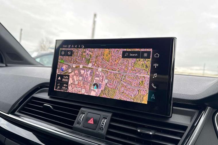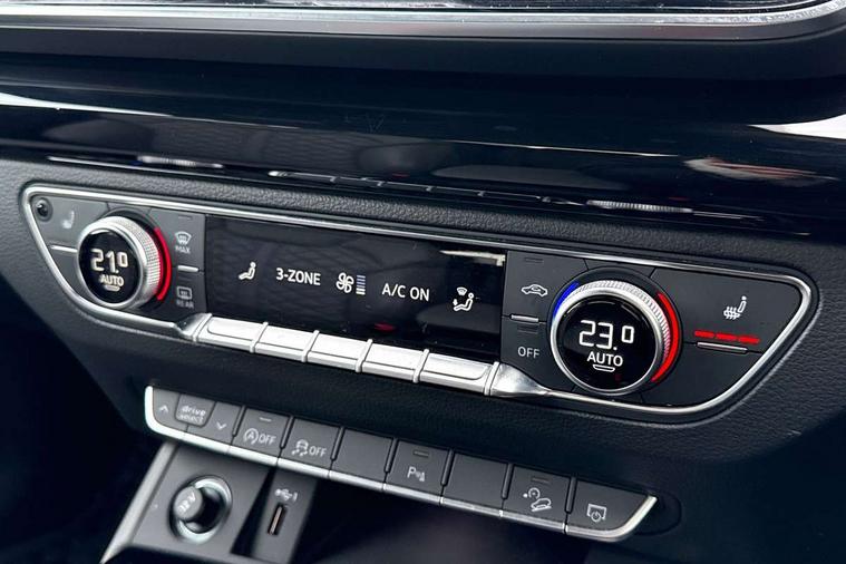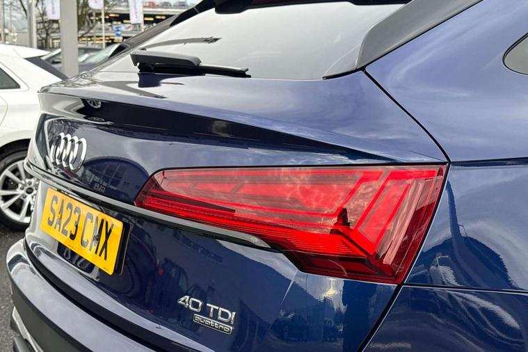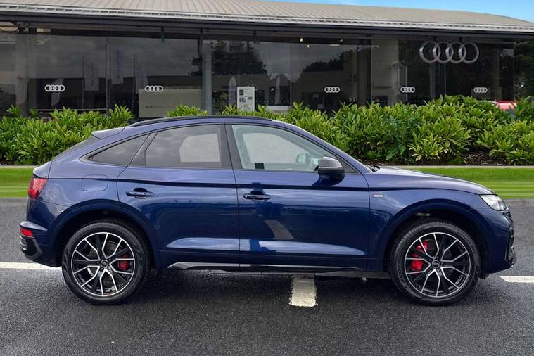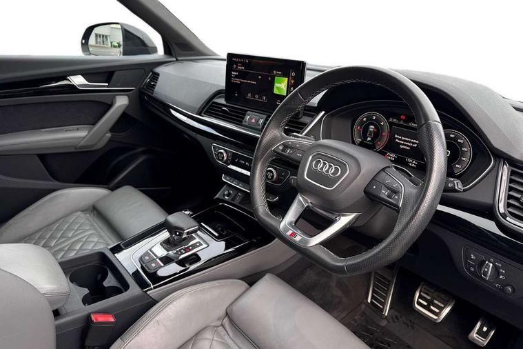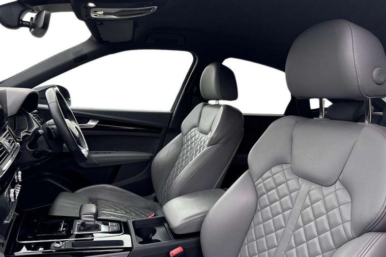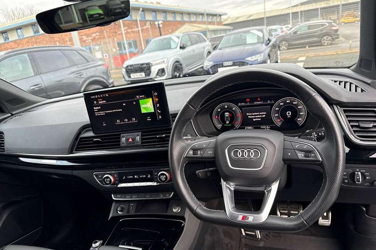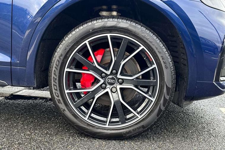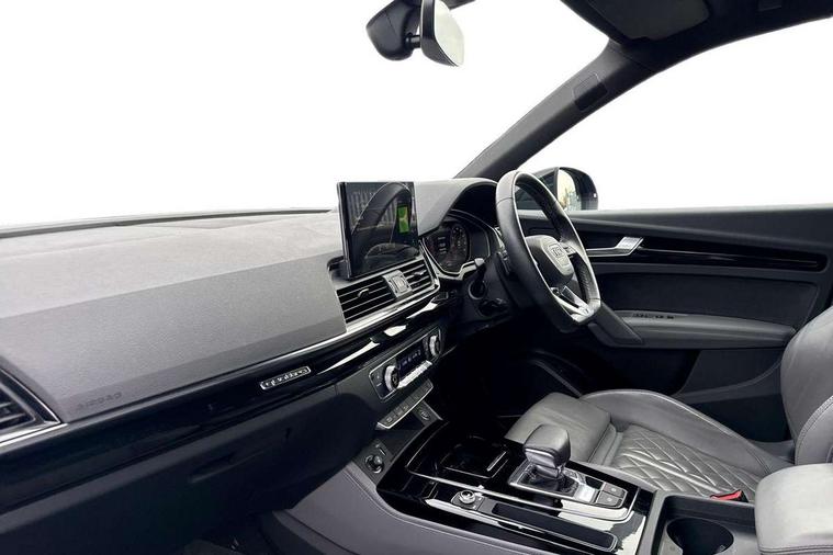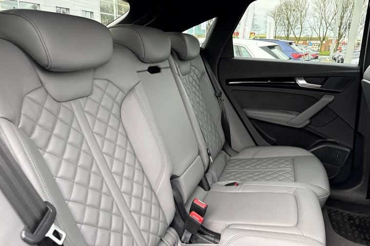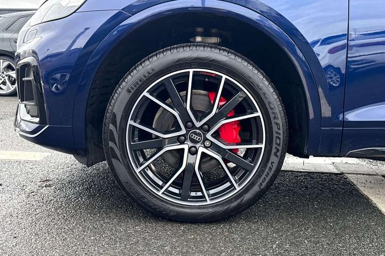 Acoustic front and rear parking sensor, Audi connect safety and service (e-call), Audi connect with Amazon Alexa Integration, Audi drive select, Audi virtual cockpit plus with 12.3" screen and three different layout designs, Audi wireless smartphone interface, Automatic start-stop system with coasting functionality and efficiency programme, Bluetooth interface, Electro - mechanical power assisted steering, MMI navigation plus with 10.1" touch screen, Power tailgate, Reversing camera, Service interval indicator, Voice control system with Audi hotword activation "Hey Audi", Diesel particulate filter, Quattro on demand, S line sports suspension, 2 x USB charging port with aux input socket, 8 loudspeakers, DAB Digital radio, Acoustic windscreen, Audi beam with Audi rings logo, Audi matrix LED headlights with dynamic front and rear indicators, Audi rings at front and rear in black, Audi rings decal on rear doors, Auto dimming door mirrors, Auto dimming frameless rear view mirror, Automatic headlight adjustment, Automatic headlights and windscreen wipers, Black roof rails, Body colour underbody protection, Chrome plated exhaust trims, Daytime running lights, Door sills in Selenite silver, Electric adjustable/heated/folding door mirrors, Front air inlet surrounds in anthracite black, Front and rear electric windows, Headlight washers, High gloss black B pillar trims and triangular rear door trim, High level LED brake light, Rear chrome trim strip below lights, Rear privacy glass and rear side windows, Rear side wing doors, Rear spoiler, Rear wiper, Roof bars, Without model and engine badging at rear, 3 rear headrests, 4 way electric lumbar support for driver and front passenger, 40:20:40 split folding 3 rear bench seat in 2nd row with rear centre armrest, Black cloth headlining, Comfort front centre armrest, Contrast stitching on seats, steering wheel and gear lever gaiter, Deluxe 3 zone electronic climate control, Electrically adjustable front seats, Fine Nappa leather upholstery with diamond pattern contrast stitching + front sport seats with S embossed logo, Front head restraints, Front/rear floor mats, Gear lever in black leather, Heated front seats, Height/reach adjustable steering column, Illuminated door sill trims with S logo, Rear seat bench plus-adjust for forwards/backwards position/backrest angle, cupholders in the armrest, load through hatch and remote backrest release, Removable luggage compartment floor, Single front passenger seat, Stainless steel pedals, Sunvisors with vanity mirrors, Trunk roller cover, Black styling package - Q5 Edition 1, Extended LED Interior multi coloured Lighting Pack - Q5, 3 point seatbelts on all seats, 6 airbags - Driver, front passenger, curtain and side airbags, Electrically operated child locks on rear doors, Electromechanical parking brake, Electronic stabilisation control including ABS, ASR and EDL, First aid kit with warning triangle and vests, Front and rear brake calipers painted in red, Front passenger airbag deactivation, Hill descent control, Hill hold assist, ISOFIX child seat mounting for front passenger seat and ISOFIX child seat mounting with Top Tether for outer rear seats, Multi collision brake assist, Pop-up bonnet for pedestrian protection, Pre sense city, Seat belt force limiter, Seatbelt monitoring, Tyre pressure warning, Anti theft alarm, Anti-theft wheel bolts, Keyless Go access/ignition system, Remote central locking, Air vents inserts and centre console in gloss black, Piano black finish inlay,