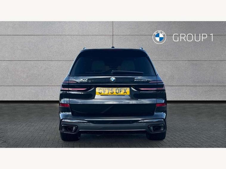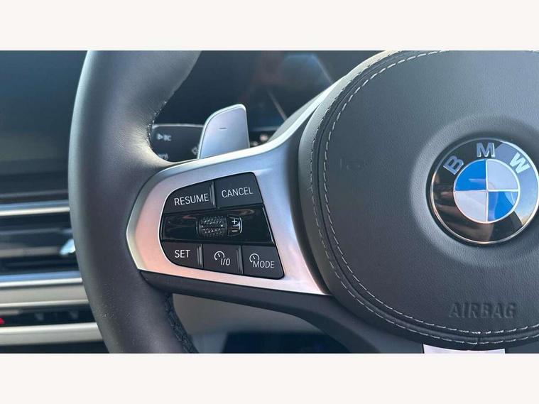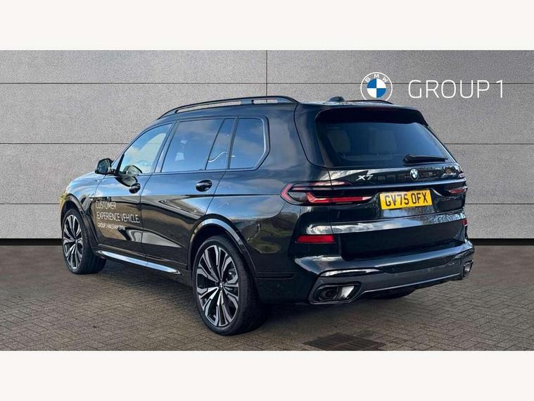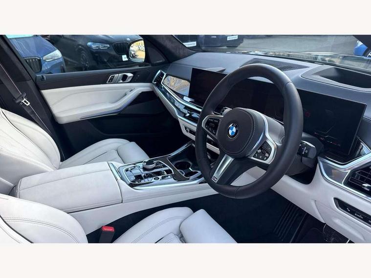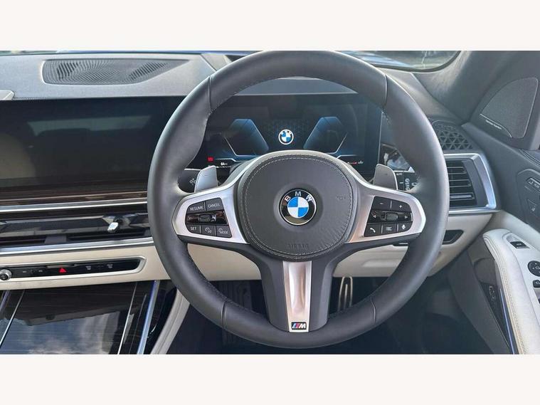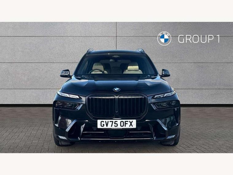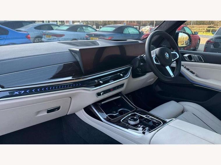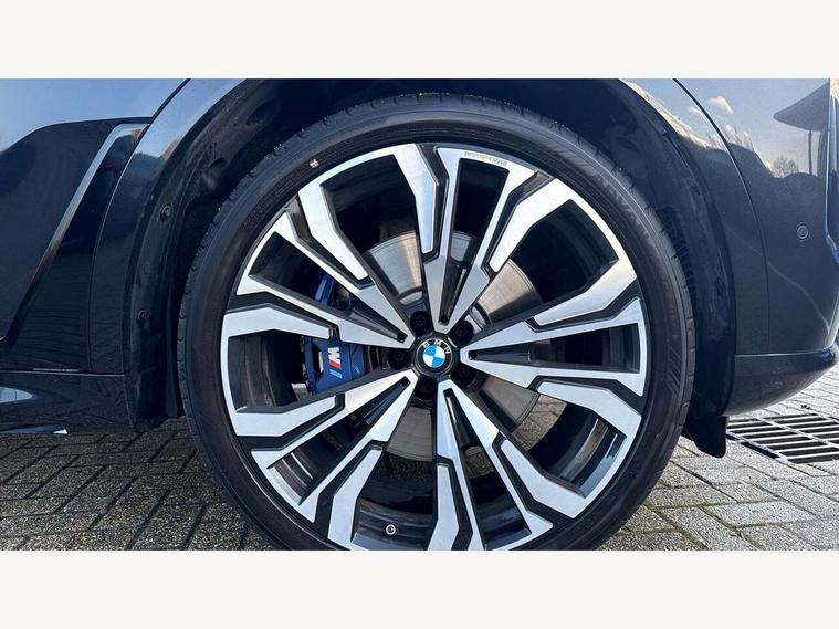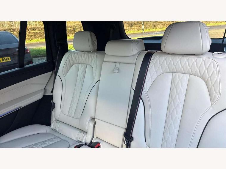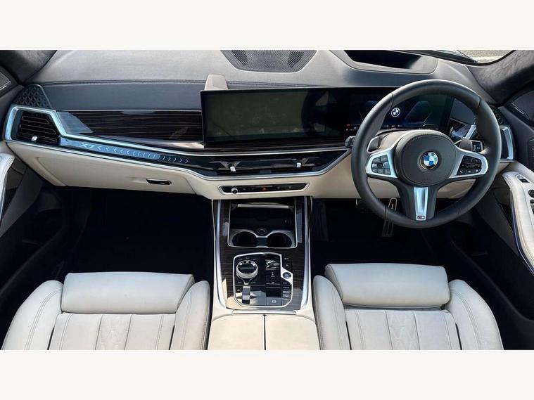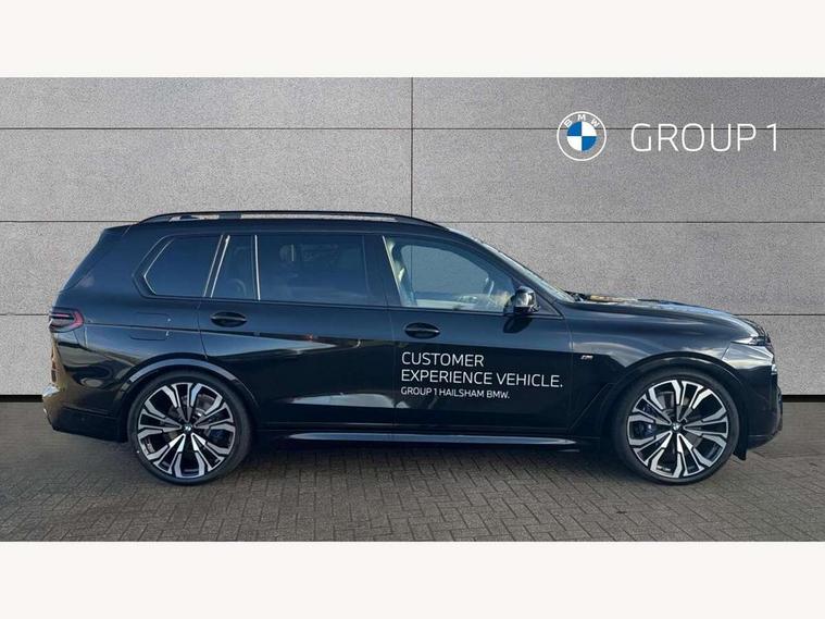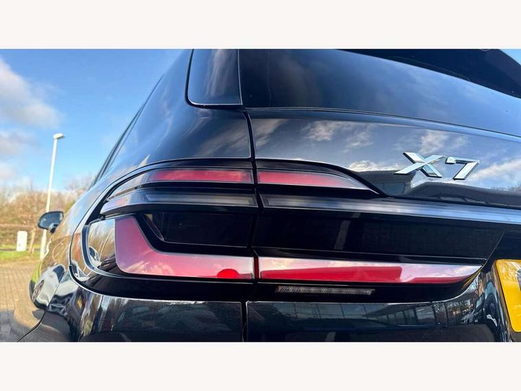 2 rear USB-C ports, Attentiveness assist, Automatic start/stop function, Automatic tailgate operation, BMW ConnectedDrive online services, BMW Drive recorder, BMW gesture control, BMW Teleservices, Brake pad wear indicator in front and rear, Condition based service, Integrated owner's handbook, Live Cockpit Professional with head up display including 12.3" instrument cluster and 14.9" central display, Parking assistant pro including reversing assistant, PDC, lateral parking aid, reversing assist camera, parking drive off monitoring, 48V Mild hybrid technology, 8 speed automatic with steptronic transmission including automatic hold function and gearshift paddles on the steering wheel, Drive experience switch with comfort mode + ECO PRO + sport mode, Permanent all wheel drive, 2x Front USB (1x USB-C, 1x USB-A), DAB radio, Personal eSim, Acoustic glazing, Adaptive air flap control bars in high gloss black, Air breather and door claddings in high gloss chrome, Body coloured wheel arches, Dynamic brake lights with LED technology, Electrically adjustable and heated aspheric folding side mirrors with auto dimming, electric fold in function, automatic parking function, Exterior and central air inlets in front bumper painted pearl chrome, Follow me home headlight function, Frameless interior mirror, Front and rear electric windows, Heated windscreen washer nozzles, High beam assist, High gloss black shadow line roof rails, High gloss black shadowline trim in side/window frame, window recess cover, window guide, B and C pillar, mirror triangle, mirror base, mirror frame, Integrated turn indicators (door), LED daytime running lights, LED rear lights, LED third brake light in rear spoiler, Rain sensor with automatic headlight activation and windscreen wiper control, Rear side wing doors, Sump guard front and rear painted in silver, Trailer stabilisation logic, 12V - Power sockets with 2x centre console and 1x luggage compartment, 2 seat bench in 3rd row, 2x cupholders in front, rear centre armrest and two in third row seats, 3 seat bench in 2nd row, 3 spoke M leather multifunction steering wheel, 40:20:40 split folding rear seat backrests, Ambient lighting strip in the instrument panel with illuminated, Armrest in front centre console, Compartment in front of cupholder, Driver and front passenger sunvisors with illuminated vanity mirrors and ticket holder, Electrical steering column with adjustable height and length with activation and control on the steering column, Entry sills with illuminated M inscription, Fold down flush into floor of luggage compartment 50:50, Front and rear colour co-ordinated with all standard carpet colours, Front and rear door pockets, Front and rear side armrests integrated into door trim, Front seat back pockets, Grab handles, Height adjustable front headrests, Height adjustable rear headrests, Lockable glove compartment, Nano filter, Single front passenger seat, Soft close doors, Storage tray and compartment with lid in centre console, Wireless charging tray, Additional storage compartment pack - X7, Ambient light interior pack - X7, Connected Package Professional - X7, Interior lighting pack - X7, Luggage compartment pack - X7, M aerodynamics pack - X7, M Sport pack - X7, 3 point seatbelts on all seats, front pyrotechnic belt tensioners, stopper and belt force limiters, front and outer rear seats, Acoustic protection for pedestrians, Active protection, Airbag - Front driver and passenger, side airbags and Head airbags, Anti lock braking system (ABS) with cornering brake control, BMW emergency call, Child seat ISOFIX attachment rear outer seats in 2nd row and both seats in 3rd row includes top tether, Comfort access system with digital key plus, Comfort cushion seats for outer seats in 2nd row, Crash sensor inclu activation of airbags, interior light, safety battery terminal clamp, hazard warn flasher, unlock doors, deactivation of fuel pump, DSC - Dynamic Stability Control, Dynamic Traction Control - DTC, Electromechanical parking brake with automatic drive away release and auto hold function, Front and rear brake discs with interior ventilation, Hill descent control, Integrated braking system, Manual child lock in rear doors, PC iBrake PostCrash approach control warning with light braking function, Tyre pressure monitoring system, Tyre pressure sensors, Variable torque distribution, Warning triangle and first aid kit, Alarm, Central locking including 2 vehicle keys with integrated emergency key, Engine immobiliser, Locking wheel bolts, Galvanic embellisher for controls,