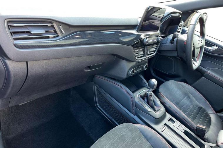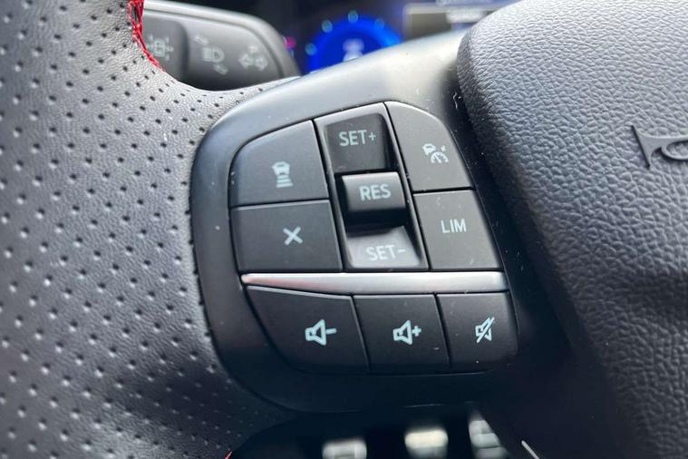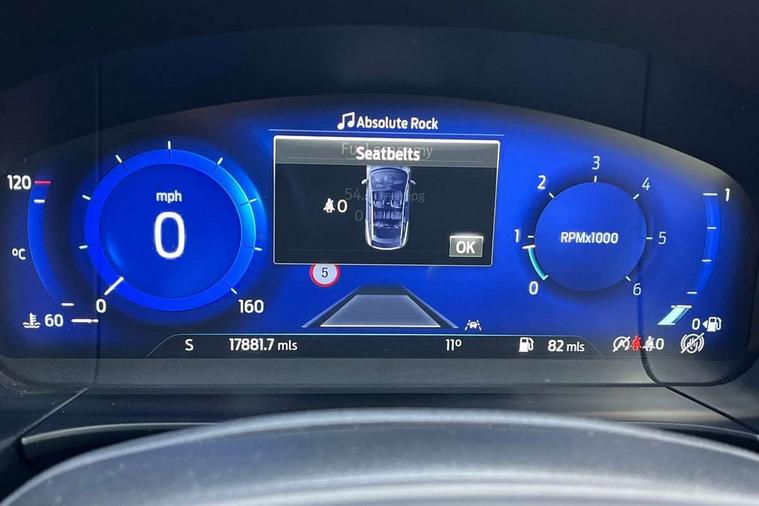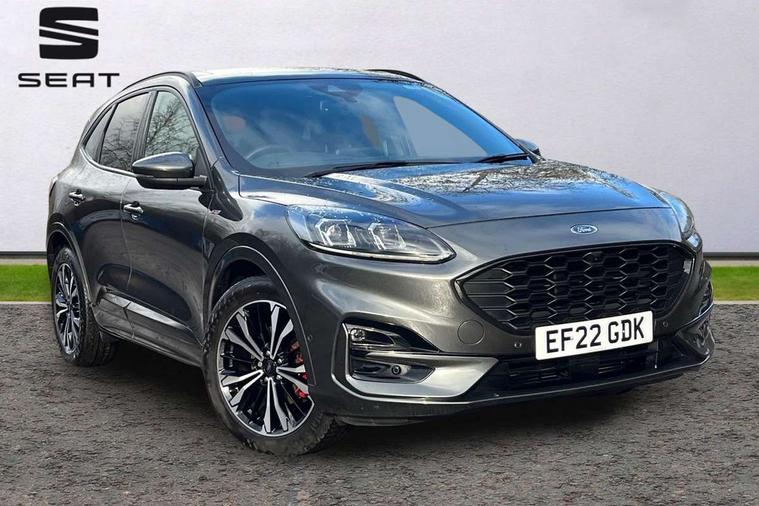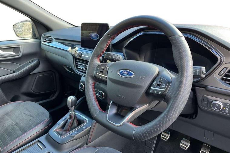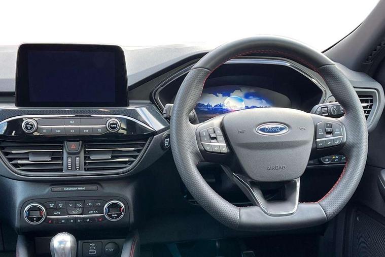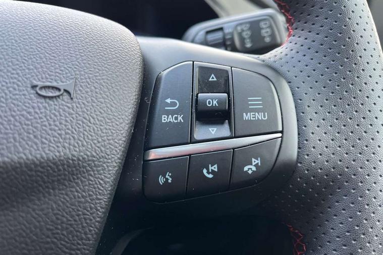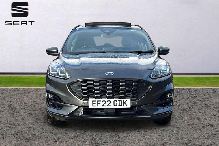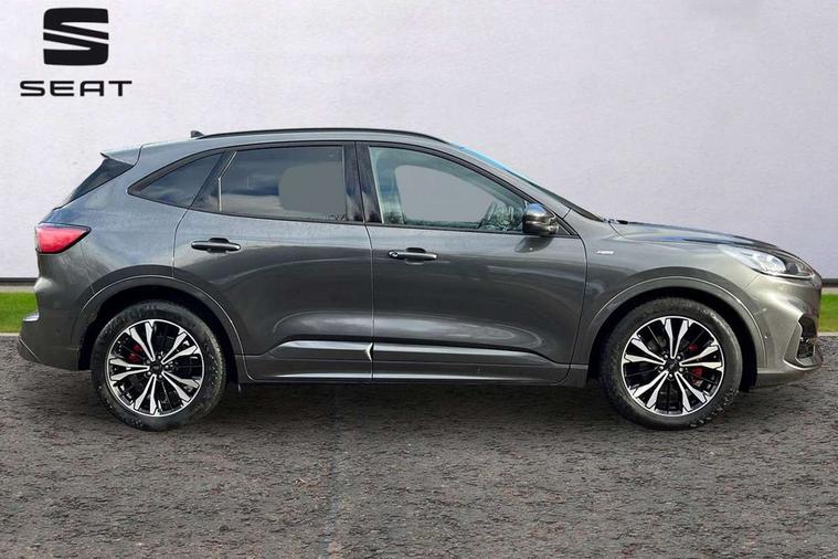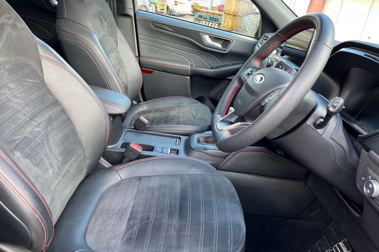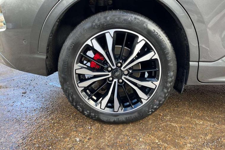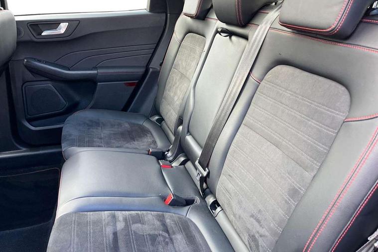 Driver impairment monitor, Ford easy fuel, Ford SYNC 3 with 8" colour touchscreen, App Link, andriod auto/apple carPlay and navigation with Ford pass connect, Front and rear parking sensors, Hands free power tailgate, Intelligent speed assist, Lane keeping aid with lane departure warning, Mobile phone wireless charging pad, Power assist steering, Selectable drive modes, Sports suspension, Auto dimming rear view mirror, Auto headlamps with high and low beam, Auto wipers, Black roof rails, Front LED fog lights with cornering function, Full LED headlamps, Large rear spoiler, LED daytime running lights, LED rear lights, Power folding heated door mirrors with puddle lights, Power front/rear windows with global close, Power opening panoramic roof, Privacy glass, Quickclear heated windscreen, ST Line body styling kit with unique front and rear fascia and bumper, rear painted diffuser, front painted skid plates, dark mesh upper grille, ST Line front scuff plates, Twin exhausts, 10 way power adjustable drivers seat, 2nd row sliding seats, 8 way manual passenger seat including lumbar support and height adjust, Alloy pedals, Ambient lighting, Centre console with electronic parking brake, Dark headlining and pillars, Dual electronic automatic temperature control, Flat bottomed leather steering wheel in sensico with red stitching, Front and rear head restraints, Heated passenger and driver seats, Rear charging point, Sensico partial premium leather upholstery, Sports seats, ST Line front and rear floor mats, Unique ST Line leather gear knob, B&O with large instrument cluster pack - Kuga, 3x3 point rear seatbelts, Airbags - front driver/passenger, front and rear curtain, Drivers knee airbag, Electronic stability control (ESC) and ABS, Ford MyKey Gen 2 safety system, Post collision braking, Powered child proof rear door locks, Pre collision assist with autonomous emergency braking, Red brake calipers, Tyre pressure monitoring system, Engine immobiliser, Keyless entry, Keyless start with 'Ford Power' starter button, Locking wheel nuts, Remote powered central double locking doors, Thatcham category 1 alarm,