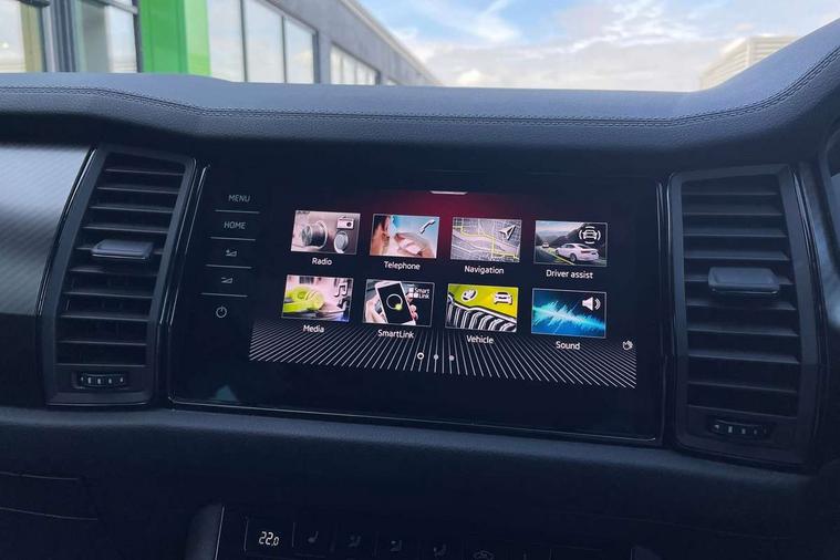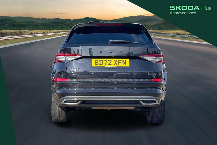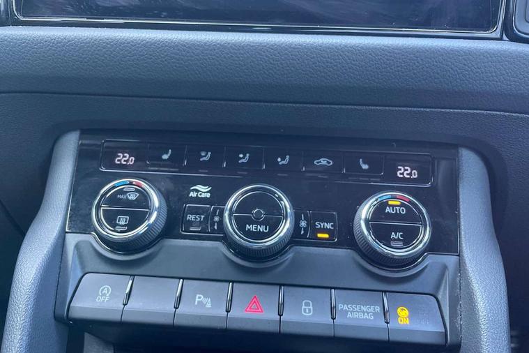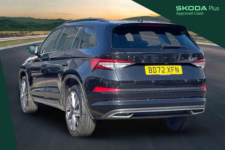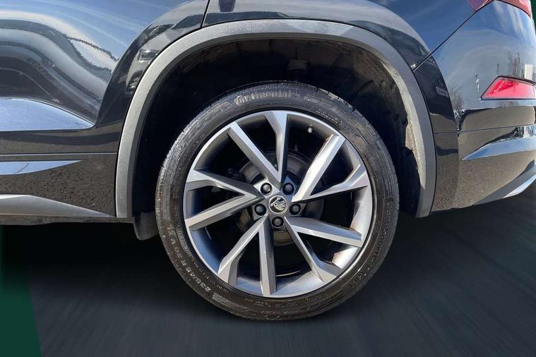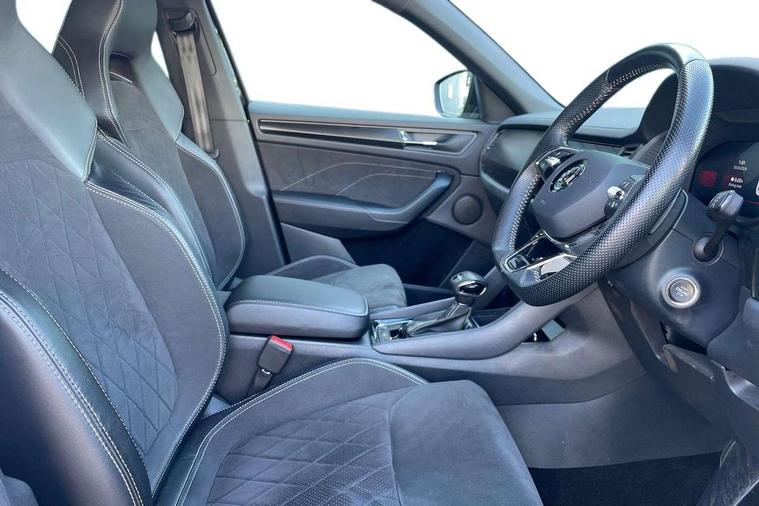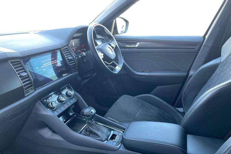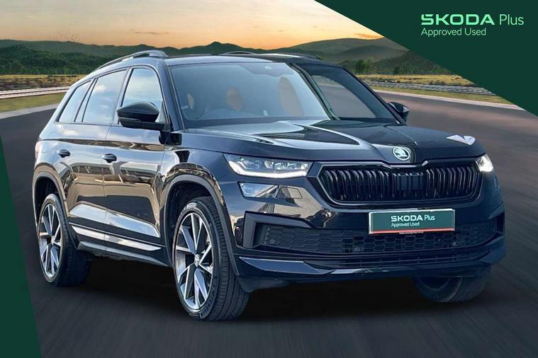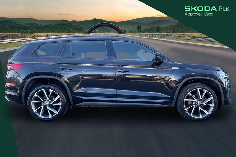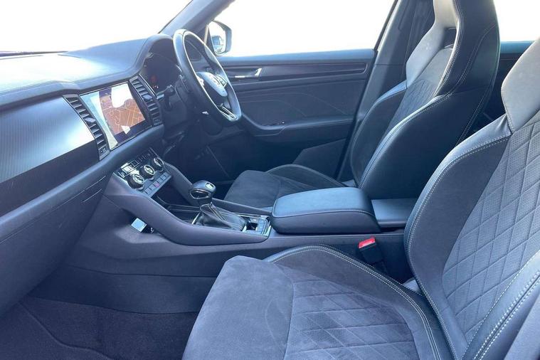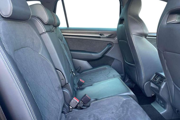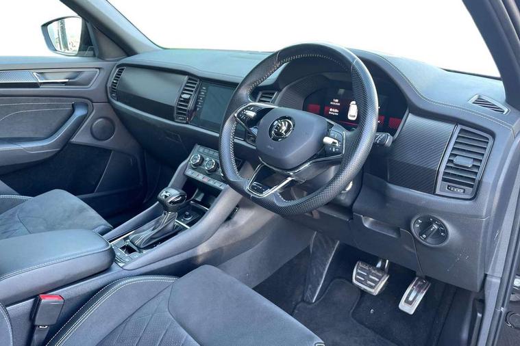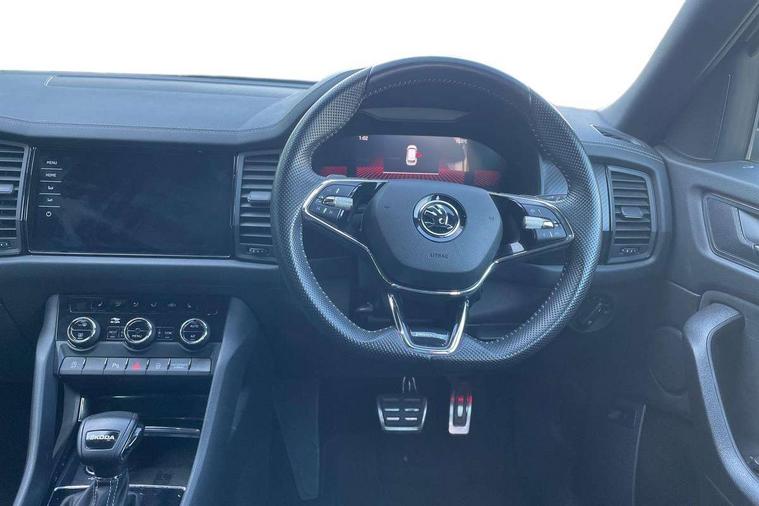Bluetooth system, Columbus satellite navigation with 9.2" touchscreen, integrated Wi-Fi, web radio, Digital voice enhancement, e call+, ECO Stop/start function, Exterior temperature indicator, Progressive steering, Rear view camera, Smartlink wireless for apple carplay and wired for android auto, Speed limiter, Tailgate unlocking from outside, USB C Port x 2 in front centre console, Wireless charging, 8 Speakers, DAB Digital radio, Aero front windscreen wipers with intermittent function, Aero rear window wiper, Auto dimming rear view mirror, Black roof rails, Black sports styling including front grille and window surrounds, Black wheel arch surrounds, Body colour bumpers, Body colour door handles, Electric adjustable/heated/folding door mirrors, driver side auto dimming with boarding sports and memory function, Electric front and rear windows, Extended rear spoiler with finlets in gloss black, Front fog lights, Full LED matrix headlights with AFS (adaptive front light system), cornering function and AWL (all weather lighting system), Gloss black door mirrors, Headlight washers, Heated rear window, Invisible tailpipe, LED daytime running lights, LED rear fog light, LED third brake light in rear spoiler, Light assistant (coming/leaving home/tunnel light), Off-road style lower front bumper element, Privacy glass, Rain and light sensors, Rear diffuser, Rear LED lights (high functionality) with welcome effect and dynamic indicators, Rear side wing doors, Safety reflectors on front and rear doors, Sportline badge on front fender, Sports front and rear bumpers including lower rear chrome strip, Tailgate lettering in Black, Window control switches with black trim, 12V socket in boot, 2 rails with 2 hooks, 2 seat bench in 3rd row, 3 seat bench in 2nd row, 4 foldable roof handles with rear coat hooks, 60:40 foldable rear seat with sliding adjustment and backrest angle adjustment, Aluminium pedals, Black roof headlining, Bottle holders in door panel in the 1.5 litre front and 1 litre rear, Cargo storage compartments, Chrome headlight control button, Chrome interior door handles, Coat hooks on B pillar, Covered storage compartment on driver side, Decorative door sill covers, Front centre armrest with storage compartment, cup holder and 12V socket, Front courtesy lights, Gear shift lever with chrome frame and black gloss insert, Grey stitching in front and rear armrests and door armrests + door inserts, Height adjustable front headrests, Illuminated and cooled glovebox, Illuminated luggage compartment, Isofix child seat fittings in outer rear seats with top tether, Manually adjustable steering column, Microsuede door panels, Net programme in boot (1x horizontal Net, 2x vertical Nets), Overhead glasses storage compartment, Pollen filter, Rear centre armrest with cupholders, Single front passenger seat, Sliding trunk cover, Small Bags on the inner sides of the front backrests, Sports seats, Sunvisors with illuminated vanity mirrors, Three rear height adjustable headrests, Ticket holder on A Pillar, Umbrella in door panel, Variable boot floor, LED Interior light pack - Kodiaq, Auto door release and activation of warning lights in the event of an accident, Child locks on rear doors, Driver and front passenger airbag with knee airbag and front passenger airbag deactivation, Electronic parking brake with hill start assist, Emergency rear braking signal, ESC (incl. ABS+MSR+ASR+EDS+HBA+DSR+RBS+MKB), Front assist with autonomous emergency braking, Front side airbags with curtain airbags, Fuel cut off safety device, Height adjustable front 3 point seatbelts + pretensioners, Hill hold control, Rear disc brakes, Safety vest holder in door, Seat belt reminder for all seats, Three point rear seat belts, Two tone horn, Tyre pressure monitor, Alarm with interior monitoring and tilt sensor with safe function, Anti-theft wheel bolts, Immobiliser, Keyless entry and start system (KESSY), Remote central locking with 2 keys, Black air vent surround, Carbon finish dashboard and door inserts, Grey stitching in dashboard, 20" Vega Anthracite alloy wheels, Temporary spare wheel (space saver),