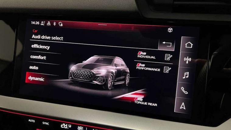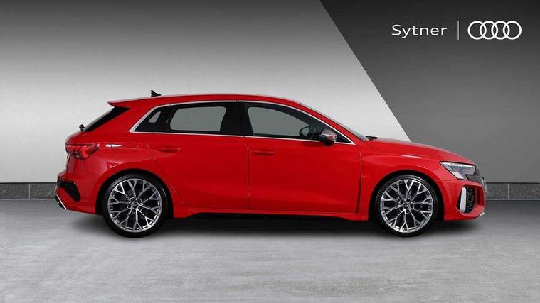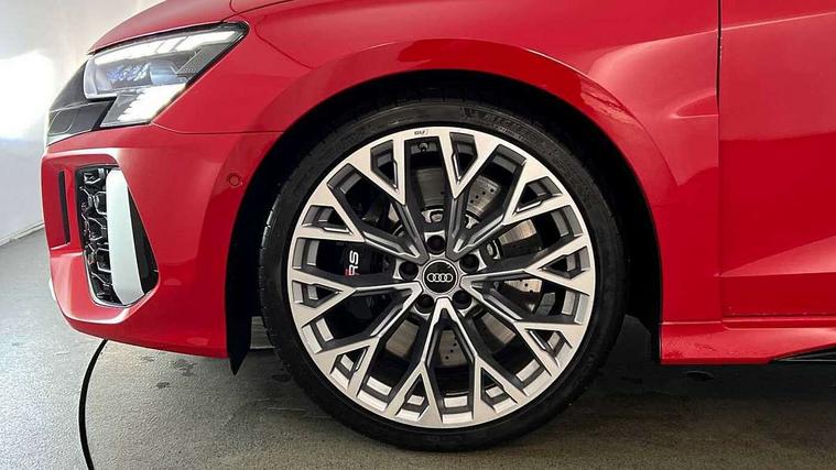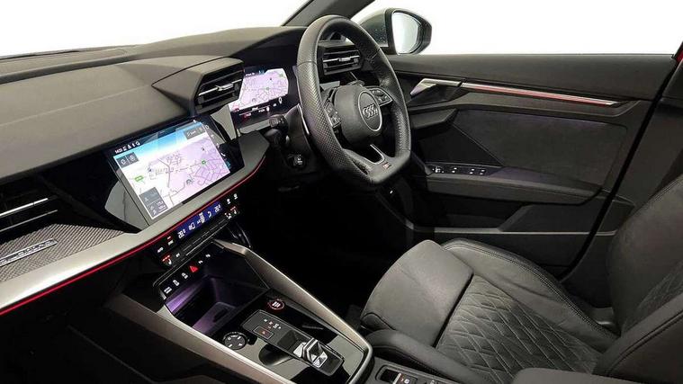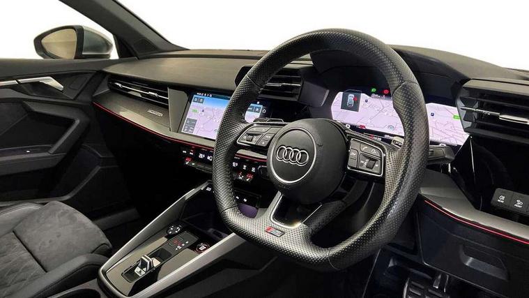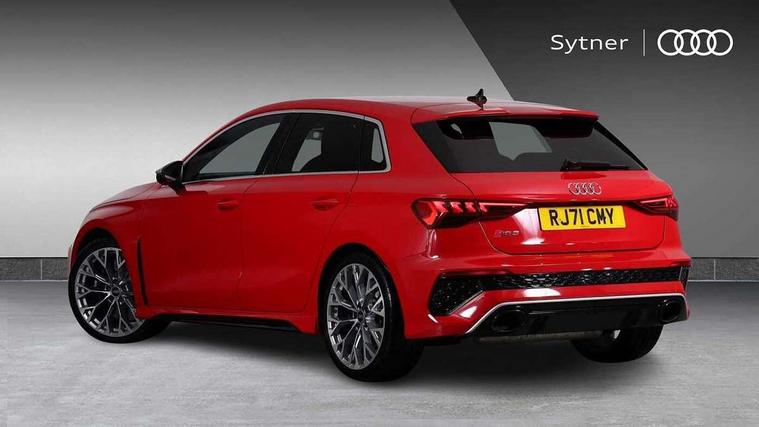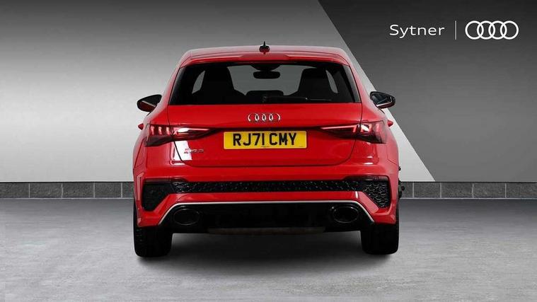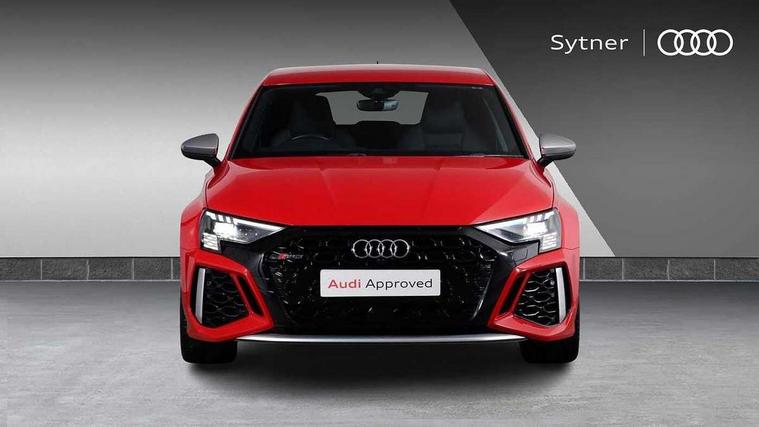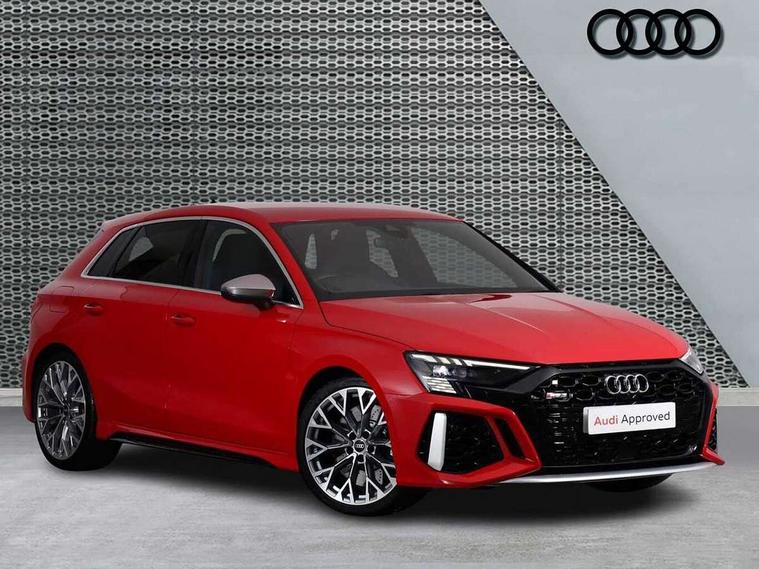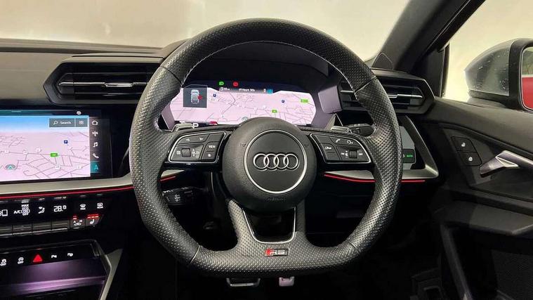 Audi connect emergency call and service, Audi smartphone interface, Audi virtual cockpit with RS specific display 12.3" full colour digital instrument cluster, Automatic start/stop system with recuperation, Bluetooth interface, Collision avoidance assistant, Lane departure warning system, Legal emergency call, Manual boot opening, Parking assist with parking system plus, Progressive power assisted steering, Quattro permanent four wheel drive, Rear suspension, Audi sound system impressive sound with 10 loudspeakers including centre speaker and subwoofer, 6-channel amplifier with a total output of 180 watts, DAB Digital radio, 3rd brake light, Acoustic glass windscreen, Audi beam uses LEDs to project the Audi sport logo onto the ground as you exit your RS 3, Auto dimming rear view mirror, Black side skirts, Body colour roof, Door mirrors - electrically adjustable, heated, folding and auto dimming on both sides, Headlight washers, LED headlights with LED rear lights + dynamic rear indicators, Light and rain sensors, Matt aluminium door mirrors, Matt aluminium window trims, Privacy glass - dark tinted rear and rear side windows from B-pillar backwards, Rear window wiper and washer system, 40/20/40 split folding rear seat bench, Black cloth headlining, Dual zone electronic climate control, Front and rear headrests, Front centre armrest, Front sports seats RS embossed logo, Front/rear floor mats, Heated front seats, Honeycomb stitching and RS embossing, Illuminated door sill trims inlays in aluminium with RS 3 logo, Manually adjustable front seats, RS emblems, Stainless steel pedals and front footrest in black, Tool kit, Aluminium interior elements pack - RS3, Ambient lighting pack - RS3, MMI navigation plus with MMI touch - RS3, RS bodystyling - RS3, Storage Pack - RS3, 3x3 point rear seat belts, ABS/EBD, ASR, Audi pre sense front, Driver/Front Passenger airbags, EDL, ESC - Electronic Stability Control + traction control, Front passenger airbag deactivation, Front side airbags with head airbags and interaction airbag, Hill hold assist, Seat belt reminder with passenger presence detection in rear, Tyre pressure loss indicator, Warning triangle and first aid kit, Anti theft alarm, Anti-theft wheel bolts, Electronically operated child lock, Remote control central locking, Carbon inlays, accent surfaces in the dashboard and centre console in platinum grey silk effect paint finish, 19" 10 Y spoke platinum grey, gloss turned finish alloy wheels, Tyre repair kit,