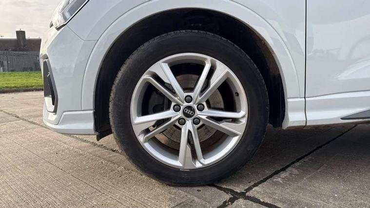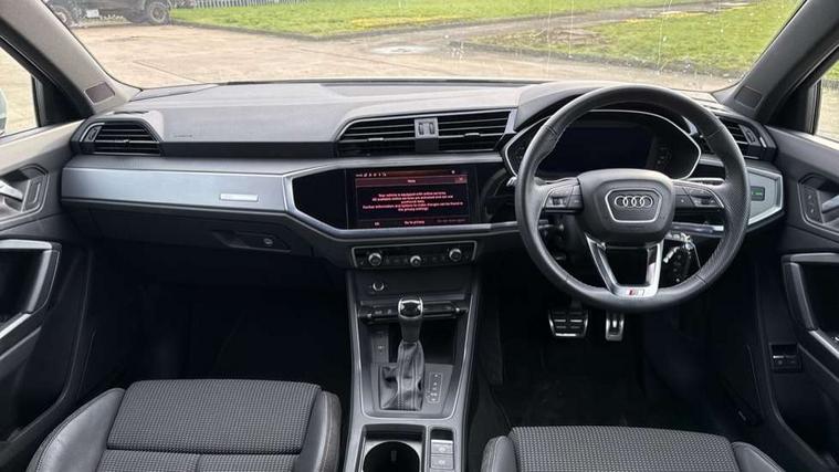 Amazon alexa Integration, Audi connect safety and service (e-call), Audi drive select, Audi lane departure warning, Audi Virtual Cockpit - 10.25" display, Bluetooth interface, Camera based traffic sign recognition, MMI Navigation Plus with high resolution 10.1 inch touchscreen colour display, Power operated tailgate, Progressive steering, Service interval indicator, Smartphone interface includes wireless Apple carplay/Android Auto, Start stop system with recuperation, Voice control system with natural language interaction, 3 pin 10 amp domestic charging cable, Type 2 mode 3 32 amp charging cable, Type 2 socket for AC charging, 2 USB-C ports with charge and data functions, 6 passive loudspeakers, DAB digital radio module, Acoustic windscreen, Aluminium roof rails, Aluminium window trim, Auto dimming frameless rear view mirror, Body coloured bumpers, Electrically folding, adjustable and heated door mirrors with integrated LED side indicators and kerb view function for passenger side, Front and rear electric windows, Front fog lights, Front side air inlets in matt platinum grey, Front spoiler blade in matt platinum grey, Grille vertical bars in aluminium silver/Matt, High gloss black finish B and C pillars, LED headlights with LED daytime running lights and dynamic rear indicator, LED rear lights, Privacy glass dark tinted rear and rear-side windows (from B-pillar backwards), Rain and light sensors, Rear diffuser strip in matt titanium black, Rear side wing doors, Rear wiper, S line badges on front wings, S Line front and rear bumpers, Side skirt insert in matt Platinium grey, Silver chrome grille surround, Third brake light, Tinted rear windows, Titanium black radiator grille, Variable front intermittent wipers, 12V socket in rear centre console, 3 seat bench in 2nd row, 40:20:40 folding with manual adjustment for 60:40 forwards/backwards position and backrest angle, Adjustable rear seat bench/backrest with centre armrest and cupholder, Black cloth headlining, Dual zone electronic climate control, Front and rear black floor mats with contrast stitching in rock grey, Front and rear headrests, Front and rear roof module including reading lights, Front centre armrest, Glove compartment lighting, Height and reach adjustable steering wheel, Illuminated door sill trims with S logo, ISOFIX child seat mounting for front passenger with airbag deactivation and outer rear seat including top tether attachment point for outer rear seats, Luggage compartment light, Manual front seats with height adjustment, Perforated leather gearknob, Single front passenger seat, Stainless steel luggage compartment sill finisher, Stainless steel pedals, Non smoking pack - Q3, 3x3 point rear seatbelts, 6 airbags - Driver, front passenger, curtain and side windows, Audi pre-sense front with pedestrain and cyclist recognition, Electrically operated child locks on rear doors, Electromechanical parking brake, Electronic stabilisation control including ABS, ASR and EDL, Front seatbelt reminder, Hill descent control, Hill hold assist, Pre sense basic, Seatbelt monitoring, Tyre pressure warning, Warning triangle and first aid kit, Anti theft alarm, Anti theft wheel bolts, Immobiliser, Remote central locking, Dark matt brushed aluminium inlay, Detail dashboard around MMI touch colour display in glass look, black with surround in aluminium look, Leatherette door armrest, Tool kit, Tyre repair kit,