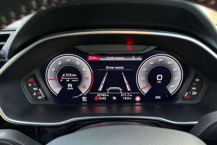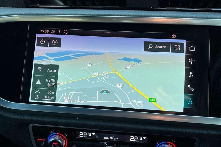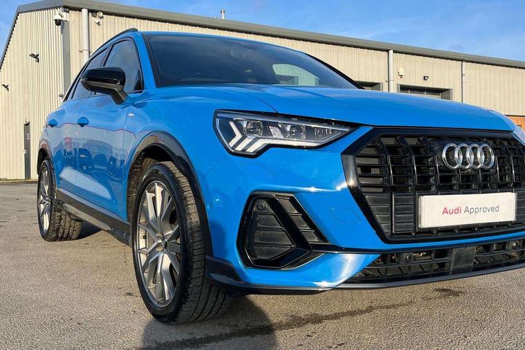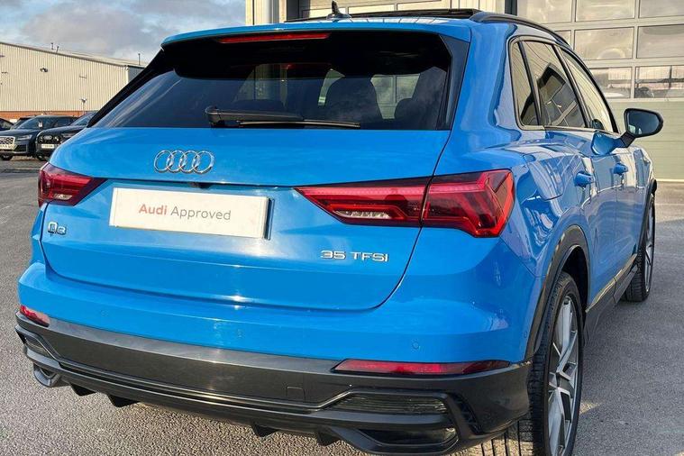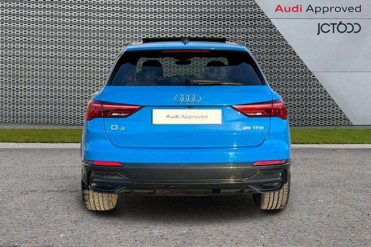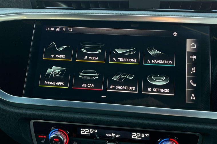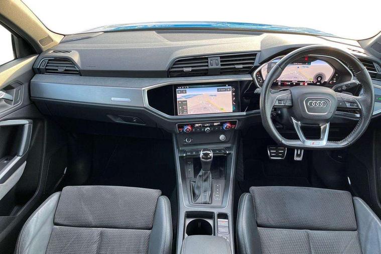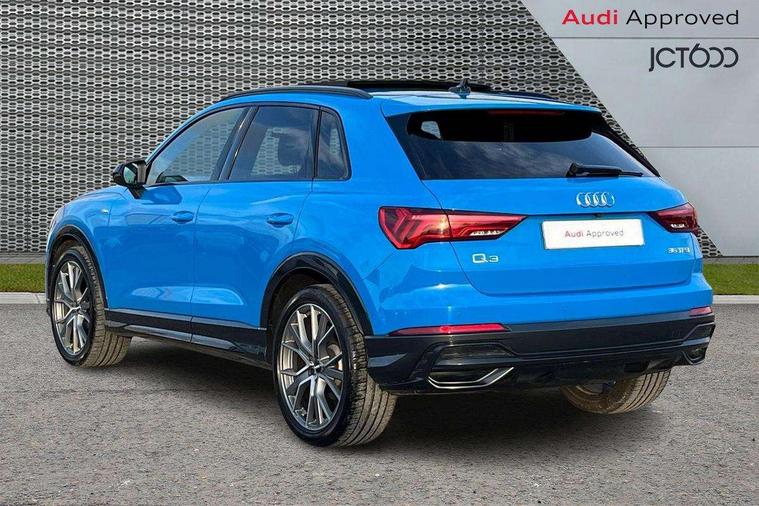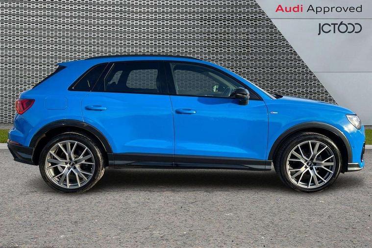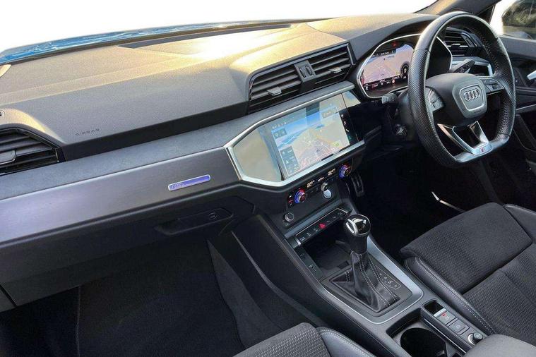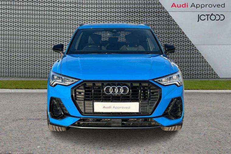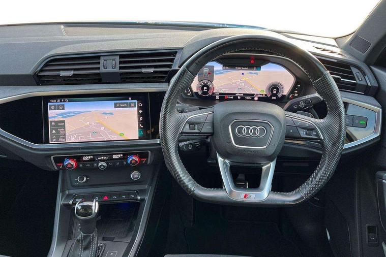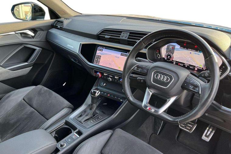 360 degree parking camera, Apple CarPlay, Audi connect safety and service (e-call), Audi drive select, Audi lane departure warning, Audi phone box with wireless charging, Audi side assist, Audi smartphone interface, Audi virtual cockpit plus, Bluetooth interface, Camera based traffic sign recognition, MMI Navigation Plus with high resolution 10.1 inch touchscreen colour display, Power opening/closing tailgate, Progressive steering, Rear cross traffic alert, Service interval indicator, Start stop system with recuperation, Voice control system with natural language interaction, 48V Mild hybrid technology, Adaptive suspension with damping control, 1 x USB type C and 1 USB type A charging points, Bang & Olufsen 3D Premium Sound System, DAB digital radio module, Acoustic windscreen, Audi Beam uses LEDs to project the Audi Sport logo, Auto dimming door mirrors, Auto dimming frameless rear view mirror, Black roof rails, Electrically folding, adjustable and heated door mirrors with integrated LED side indicators and kerb view function for passenger side, Front and rear electric windows, Front fog lights, Front spoiler blade in matt platinum grey, Headlight washers, High gloss black finish B and C pillars, Matrix LED headlights with LED rear lights and dynamic front and rear indicator, Panoramic opening glass sunroof, Privacy glass, Rain and light sensors, Rear diffuser strip in matt titanium black, S line bumpers in contrasting Manhattan grey, 12V socket in rear centre console, 3 spoke flat bottomed high multi-function leather sport steering wheel with gearshift paddles, 4 way electric lumbar support for driver and front passenger, 40:20:40 split folding rear bench seat, 60:40 forwards/backwards position and backrest angle, Adjustable rear seat bench/backrest with centre armrest and cupholder, Aluminium door sill trims, Black cloth headlining, Dual zone electronic climate control, Electrically adjustable front seats, Front and rear black floor mats with contrast stitching in rock grey, Front and rear headrests, Front and rear roof module including reading lights, Front centre armrest with storage compartment and angle adjustment, Glove compartment lighting, Heated front seats, Height and reach adjustable steering wheel, Illuminated door sill trims with S logo, ISOFIX child seat mounting and Top Tether with front passenger airbag deactivation, Luggage compartment light, Perforated leather gearknob, Stainless steel luggage compartment sill finisher, Stainless steel pedals, Black styling pack - Q3, Driver Assistance Pack - Q3, Multi coloured extended ambient interior lighting pack - Q3, Non smoking pack - Q3, 3x3 point rear seatbelts, 6 airbags - Driver, front passenger, curtain and side windows, Audi pre-sense front with pedestrain and cyclist recognition, Electrically operated child locks on rear doors, Electromechanical parking brake, Electronic stabilisation control including ABS, ASR and EDL, Hill descent control, Hill hold assist, Pre sense basic, Seatbelt monitoring, Tyre pressure warning, Warning triangle and first aid kit, Advanced key, Anti theft alarm, Anti theft wheel bolts, Remote central locking, Dark matt brushed aluminium inlay, Leatherette door armrest, MMI touch colour display in gloss black with aluminium surround, Tool kit, Tyre repair kit,