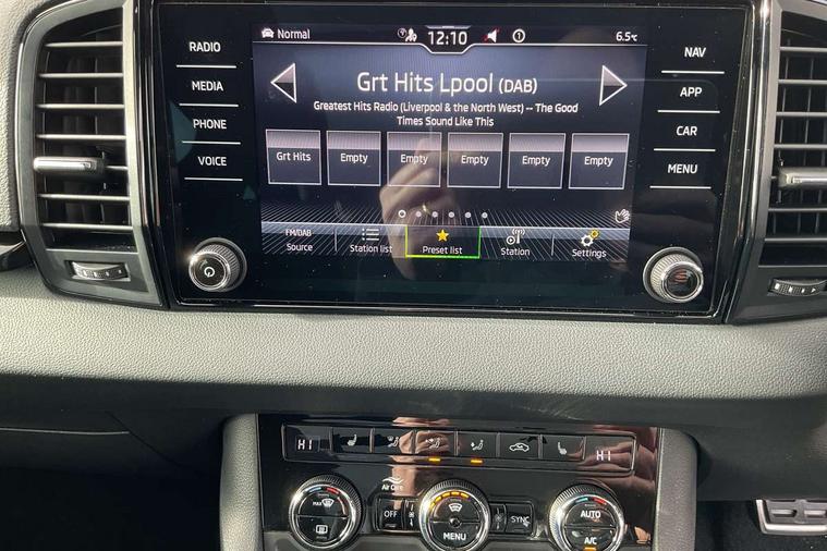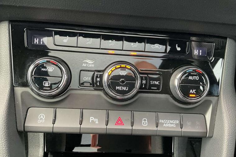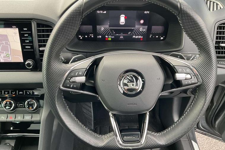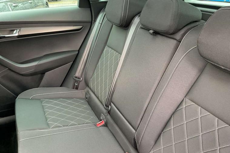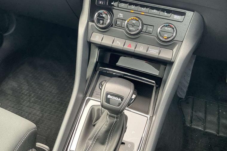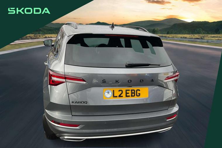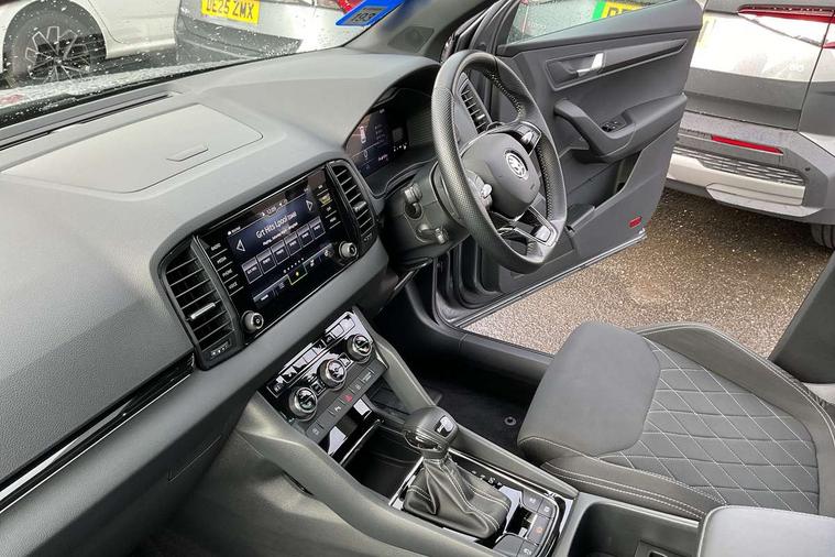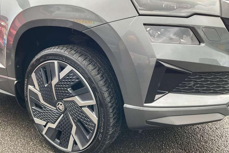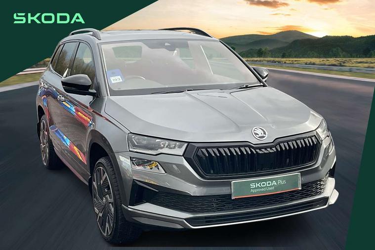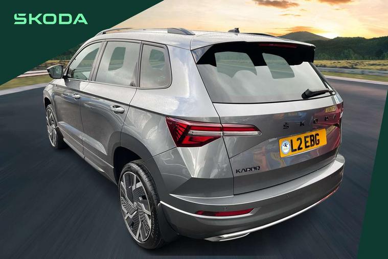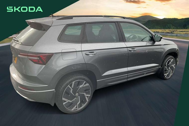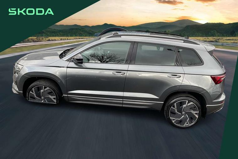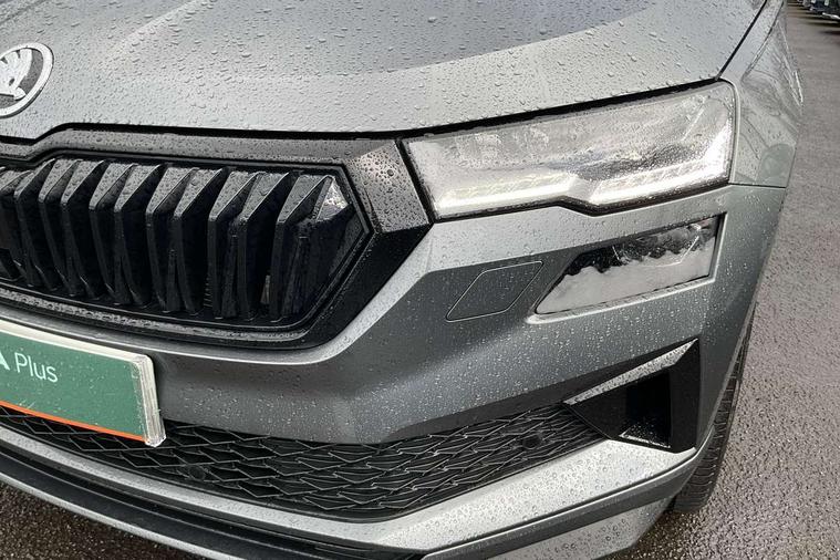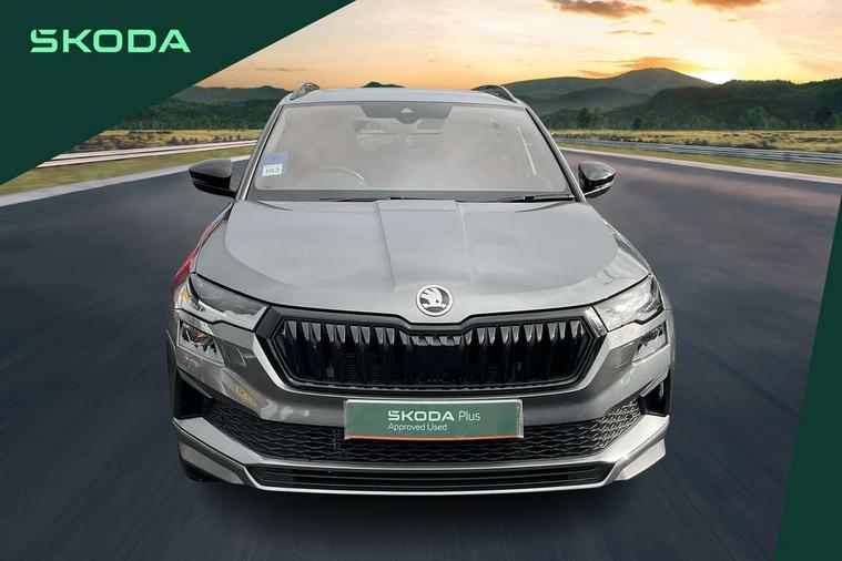 8" Digital display, Care connect, Driver fatigue sensor, Emergency services call system, Outside temperature gauge, Service interval indicator, SmartLink wireless for Apple and wired for Android, Start/stop system with regenerative braking, USB C Port x 2 in front centre console, Virtual pedal with electrically operated boot door, 8 Speakers, DAB radio with Bluetooth, USB connection, Acoustic glass, Aero front windscreen wipers with intermittent function, Auto dimming rear view mirror with light and rain sensors, Black door mirrors, Black electric window control buttons, Black radiator grille, Black roof rails, Body colour door handles, Dynamic headlight range control with cornering light function, Electric front and rear windows with child proof lock, Front door steps with SportLine logo, Heated rear windscreen, LED daytime running lights, LED rear lights with high functionality welcome effect and dynamic indicators, Light assistant (coming/leaving home/tunnel light), Panoramic sliding sunroof, Plastic scuff plates, Privacy glass, Protective door side sills in body colour, Rear diffuser, Rear side wing doors, Rear spoiler, Rear window wiper with washer system and intermittent control, Safety reflectors on front doors, Skoda lettering on tailgate in black, Sportline badge on front fender, Sportline decorative inserts with badging, Sports front and rear bumpers, 1.5 litre bottle holders in driver and front passenger door panels, 12V socket in boot, 12v socket in front centre armrest with storage compartment and rear air vents, 2 Folding hooks and nets in boot, 3 rear height adjustable headrests, 3 seat bench in 2nd row, 3 spoke leather sports multifunction steering wheel and silver stitching with gear shift paddles, 4 foldable roof handles with rear coat hooks, Black floor carpet, Black roof headlining, Chrome inner door handles, Double sided boot floor, Foldable hooks in the boot, Front head restraints, Height adjustable front three point seats belts with tensioners, Height/reach adjust steering wheel, Ice scraper, Illuminated glovebox, Illuminated luggage compartment, Isofix child seat preparation outer rear, Manual lumbar support for front seats, Pen holder, Pollen filter, Rear boot cover, Rear reading lights, Rear seats fixed folding and divided 60:40, Rubbish bin door, Safety vest holder, Single front passenger seat, Storage box in upper central dashboard closed, Sunvisors with illuminated vanity mirrors, Textile floor mats, Ticket holder, Titan black interior ceiling, Welcome animation with sportline logo, Light Pack - Karoq, Parking pack - Karoq, Automatic door unlocking in case of crash, Automatic fuel cut off in case of crash, Child locks on rear doors, Driver airbag, Electronic parking brake with auto hold function, Emergency rear braking signal, ESC including ABS, MSR, ASR, EDS, HBA, DSR, RBS, MKB and traction control, Front side airbags, Hill hold control, Knee airbags, Passenger airbag with switch-off function, Pedestrian monitor, Seatbelt reminder signalisation and pretensioner for all seats, Three point seatbelts rear, Two tone horn, Tyre pressure display, Tyre pressure monitor, Alarm with interior monitoring, back up horn and tilt sensor with safe function, Electronic engine immobiliser, Keyless entry and start/stop, Remote central locking with 2 remote folding keys, Black air vent surround, Black centre console, Satin black dashboard, Satin black door trim, 19" Vega black polished alloy wheels, Anti-theft wheel bolts protection, Matt black aero hub caps, Storage on wheel cover, Tool kit,