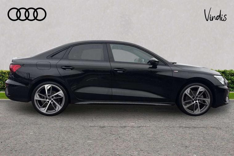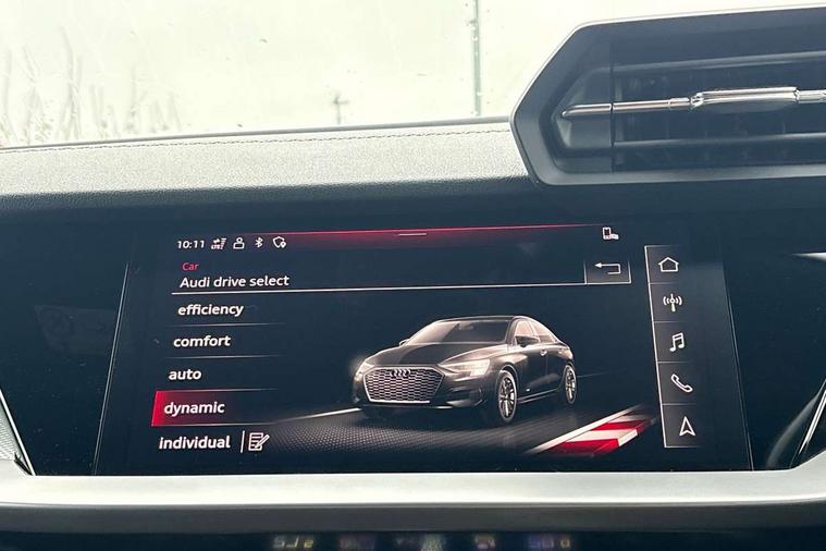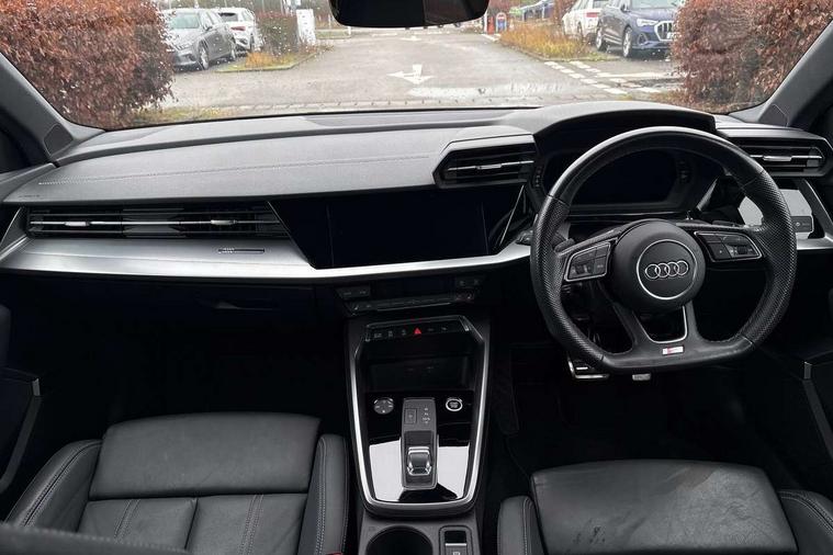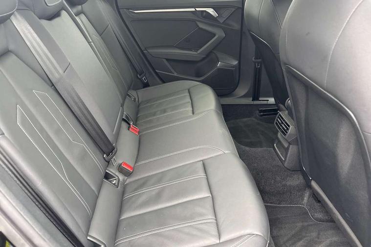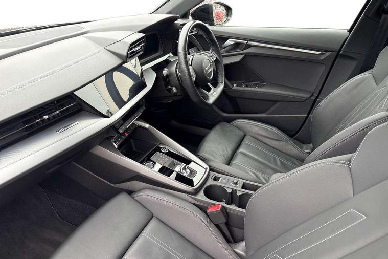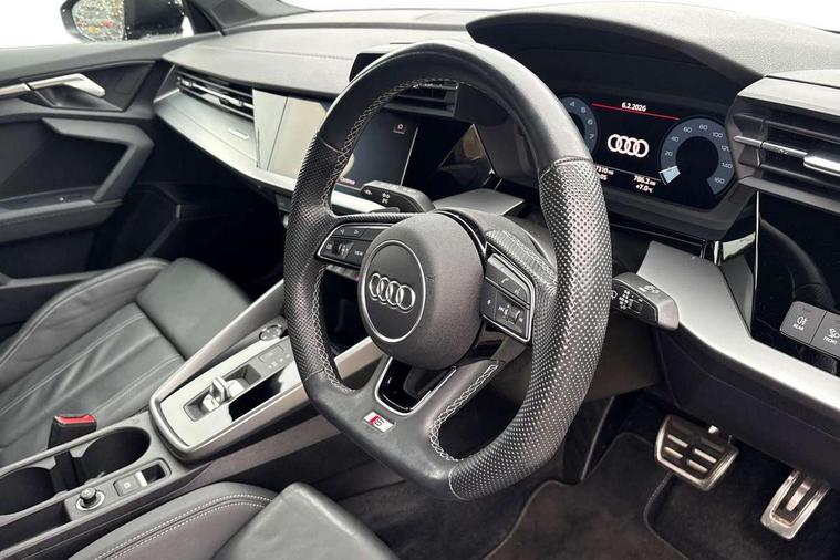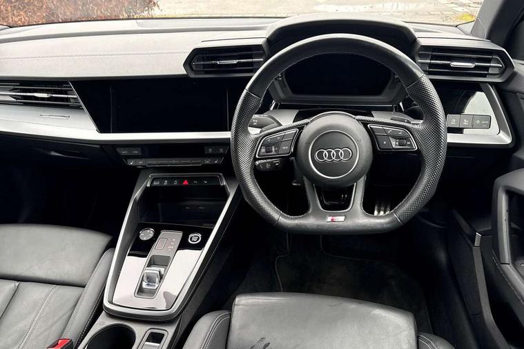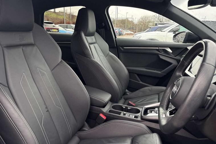 Audi drive select (Auto, Comfort, Dynamic, Efficiency and Individual), Audi smartphone interface, Audi Virtual Cockpit - 10.25" digital and colour instrument cluster, Automatic start/stop system with recuperation, Bluetooth interface, Camera based traffic sign recognition, Collision avoidance assistant, e-Call (emergency call), Electromechanical power speed sensitive steering, Lane departure warning system, MMI Navigation Plus with high resolution 10.1" colour touch screen display, Service indicator, Trip computer, Voice control system with natural language interaction, Sports suspension, 2xUSB-C connection with data and charging functions, 6 passive loudspeakers, CD player, DAB Digital radio, 3rd brake light, Acoustic glass windscreen, Audi beam uses LEDs to project the Audi logo onto the ground as you exit your A3, Auto dimming frameless rear view mirror, Electrically adjustable/heated/folding/auto dimming door mirrors with integrated LED indications + kerb view function for passenger side, Front electric windows, Illuminated door sills with aluminium inserts at the front with S logo, LED daytime running lights, LED headlights with LED rear lights and dynamic rear indicators, Light and rain sensors, Model and engine designation badges at rear, Privacy glass - dark tinted rear window, rear door and side windows, Rear boot, Rear electric windows, Rear side wing doors, S roof spoiler, 12V socket and storage compartment in front centre console, 3 seat bench in 2nd row, 3 spoke flat bottomed leather multifunction sport steering wheel with gear shift paddles, 4 way electrically adjustable lumbar support for driver and front passenger, 60/40 split folding rear seat bench, Black cloth headlining, Dual zone electronic climate control, Front and rear centre armrest in artificial leather, Front and rear headrests, Front/rear floor mats, Height and reach adjustable steering wheel, Interior lighting - glove compartment light and right hand side, Luggage compartment floor covering, Manual boot compartment lid, Single front passenger seat, Stainless steel pedals and front footrest in black, Twin leather upholstery with front sports seats S embossed logo, Aluminium interior elements pack - A3, Black styling pack - A3 Saloon/Black edition, LED interior lighting pack - A3 Saloon, 3x3 point rear seat belts, Driver and front passenger airbag with passenger airbag deactivation, Electronic Stabilisation Control (ESC) including ABS, ASR and EDL, First aid kit with warning triangle and 2 safety vests, Front side airbags with head airbags and interaction airbag, Pre-sense front with pedestrian and cyclist detection, Seatbelt monitoring, Tyre pressure loss indicator, Anti theft alarm, Anti-theft wheel bolts, Electronically operated child locks, Immobiliser, Remote control central locking, Aluminium air vent surrounds, Dark spectrum aluminium inlays, accent surfaces in the dashboard and centre console in platinum grey silk effect paint finish, 19" 5 arm trapezoid design alloy wheels in matt grey with diamond cut finish,