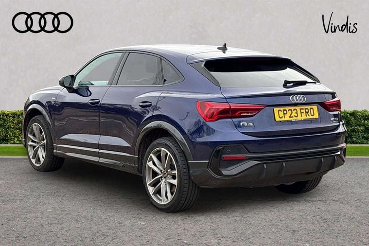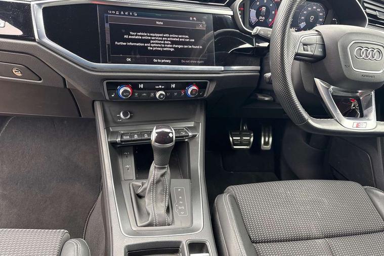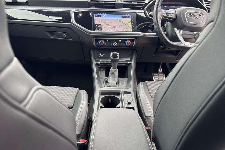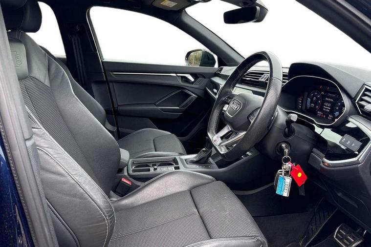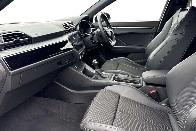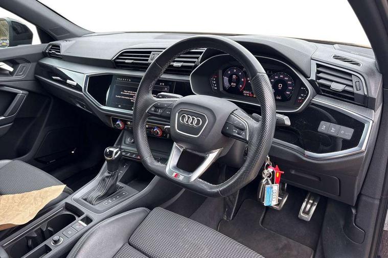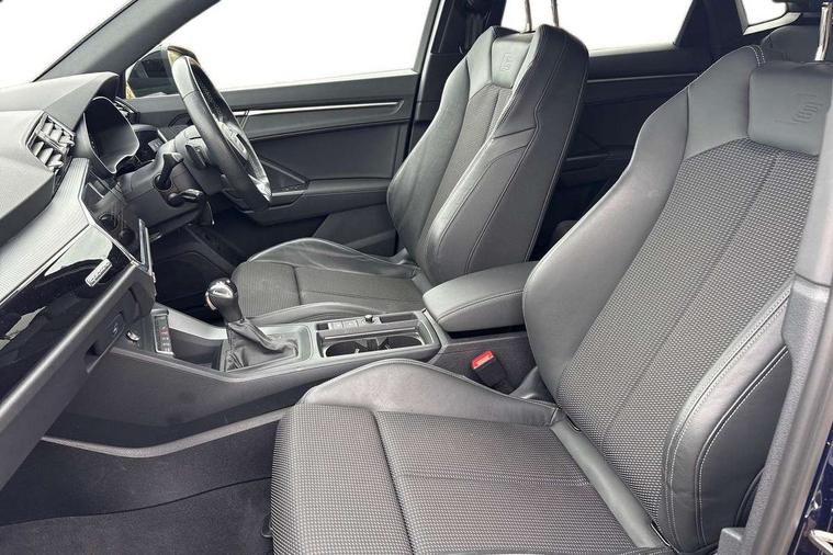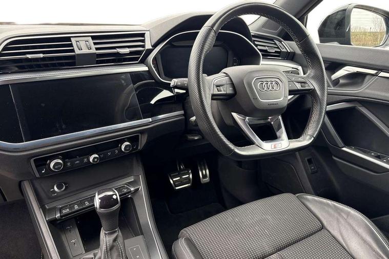 Audi drive select, Audi lane departure warning, Audi Virtual Cockpit - 10.25" display, Bluetooth interface, Camera based traffic sign recognition, Legal emergency call, MMI Navigation Plus with high resolution 10.1 inch touchscreen colour display, Power operated tailgate, Progressive steering, Service interval indicator, Smartphone interface includes wireless Apple carplay/Android Auto, Start stop system with recuperation, Voice control system with natural language interaction, Diesel particulate filter, Sports suspension, 2 USB-C ports with charge and data functions, 6 passive loudspeakers, DAB digital radio module, Acoustic windscreen, Auto dimming frameless rear view mirror, Diffuser grille in grained matt black, Diffuser trim in selenite silver, Electrically folding, adjustable and heated door mirrors with integrated LED side indicators and kerb view function for passenger side, Front and rear electric windows, Front fog lights, Front underbody protection in manhattan grey paint finish, High gloss black finish B and C pillars, LED Dynamic rear indicators, LED headlights with LED daytime running lights, LED rear lights, LED third brake light, Privacy glass dark tinted rear and rear-side windows (from B-pillar backwards), Rain and light sensors, Rear side wing doors, Rear underbody protection in matt black, Rear wiper, Variable front intermittent wipers, 12V socket in rear centre console, 3 seat bench in 2nd row, 40:20:40 folding with manual adjustment for 60:40 forwards/backwards position and backrest angle, Adjustable rear seat bench/backrest with centre armrest and cupholder, Black cloth headlining, Dual zone electronic climate control, Front and rear black floor mats with contrast stitching, Front and rear headrests, Front and rear roof module including reading lights, Front centre armrest, Glove compartment lighting, Height and reach adjustable steering wheel, Illuminated door sill trims with S logo, ISOFIX child seat mounting for front passenger with airbag deactivation and outer rear seat including top tether attachment point for outer rear seats, Luggage compartment light right in white, Luggage compartment sill protection in stainless steel, Manual front seats with height adjustment, Perforated leather gearknob, Single front passenger seat, Stainless steel pedals, Ambient lighting pack - Q3, Black styling pack - Q3, Non smoking pack - Q3, 3x3 point rear seatbelts, 6 airbags - Driver, front passenger, curtain and side windows, Audi pre-sense front with pedestrain and cyclist recognition, Electrically operated child locks on rear doors, Electromechanical parking brake, Electronic stabilisation control including ABS, ASR and EDL, Front seatbelt reminder, Hill descent control, Hill hold assist, Pre sense basic, Seatbelt monitoring, Tyre pressure warning, Warning triangle and first aid kit, Anti theft alarm, Anti theft wheel bolts, Immobiliser, Remote central locking, Aluminium look interior elements, Black dashboard, Detail dashboard around MMI touch colour display in glass look, black with surround in aluminium look, Leatherette door armrest, Piano black inlay, 19" 5 twin arm design diamond cut audi sport alloy wheels in matt grey look,