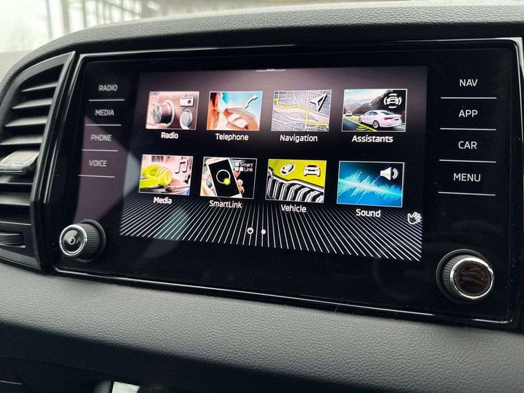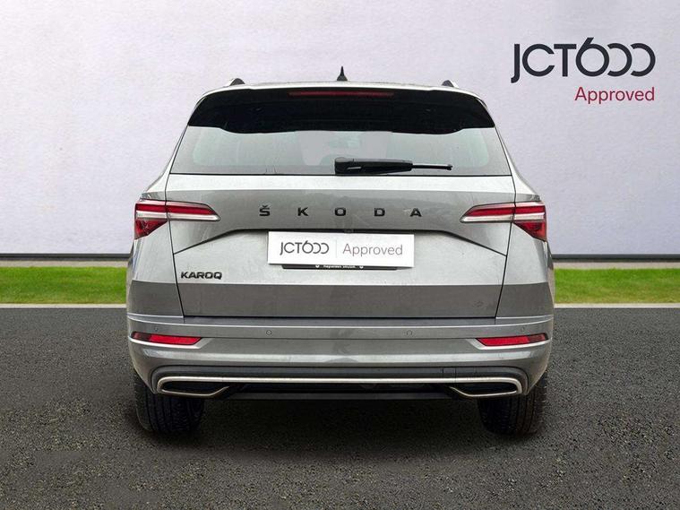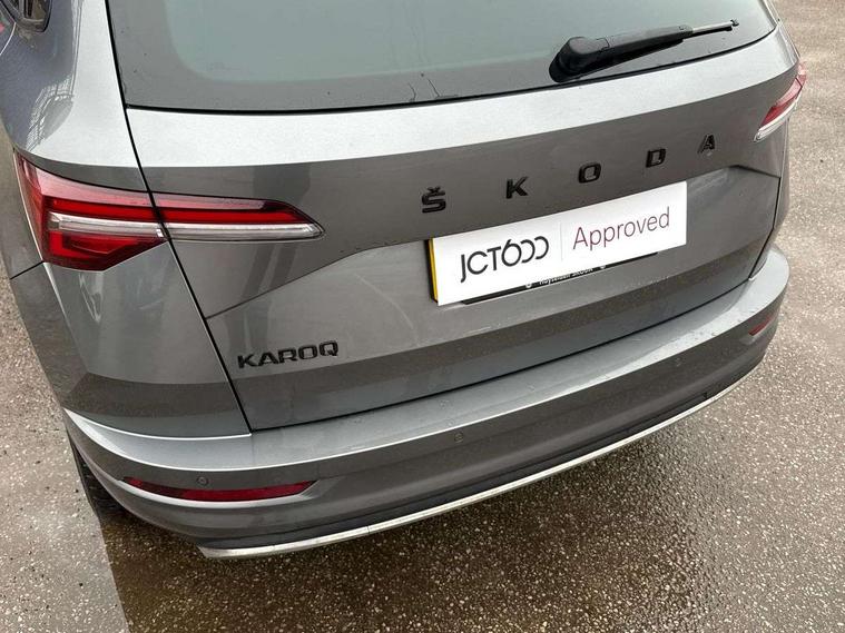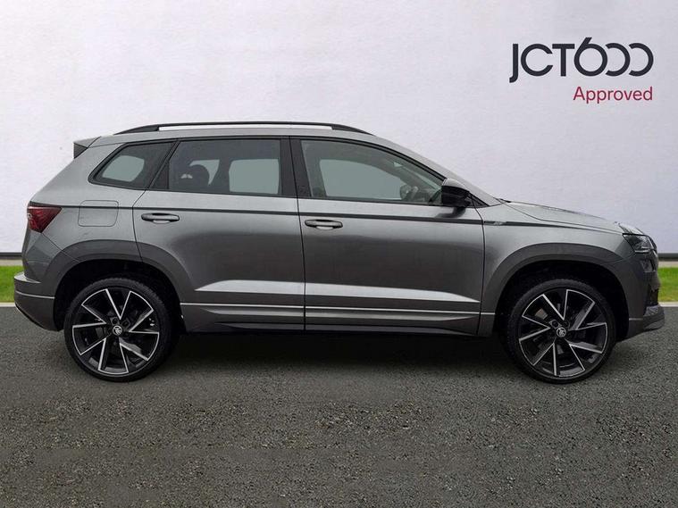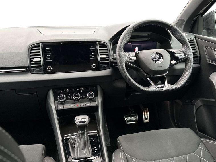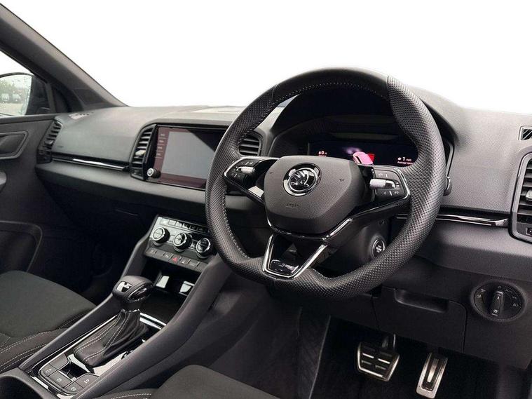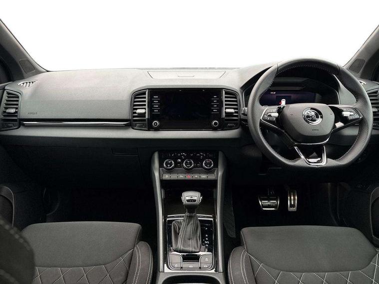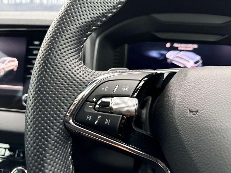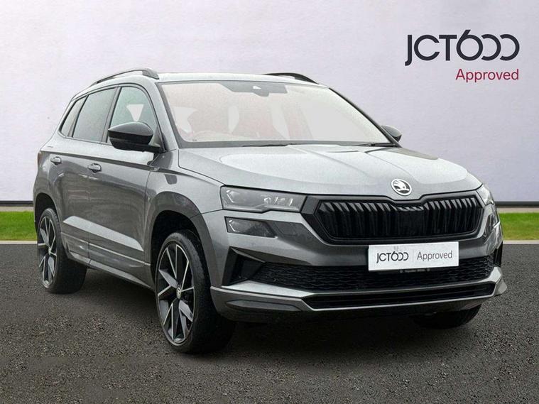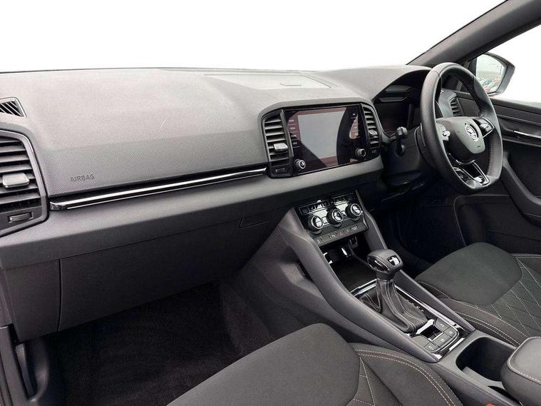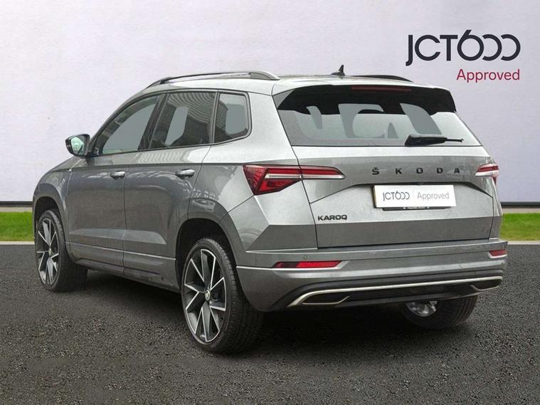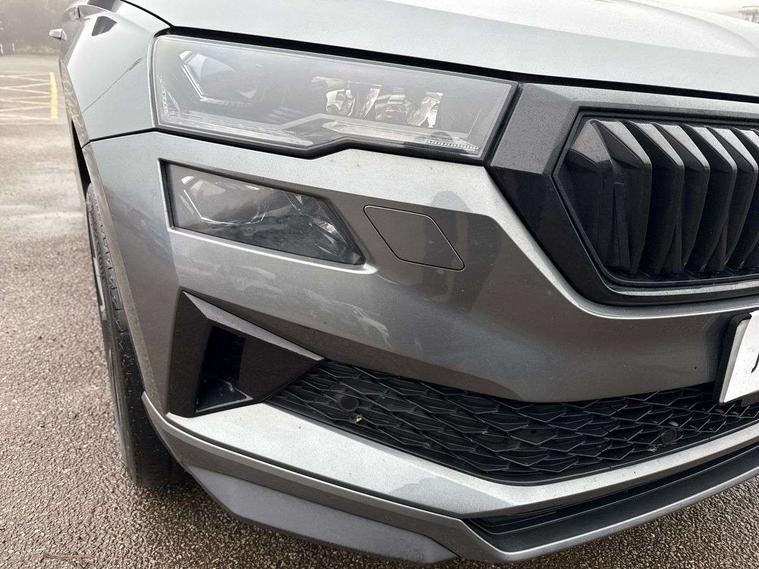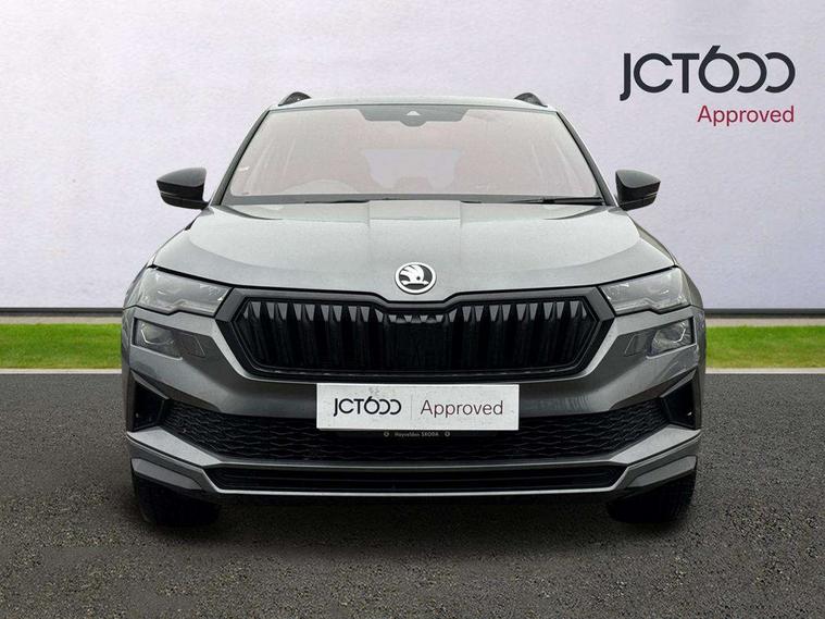 8" Digital display, Care connect, Driver fatigue sensor, Emergency services call system, Outside temperature gauge, Service interval indicator, SmartLink wireless for Apple and wired for Android, Start/stop system with regenerative braking, USB C Port x 2 in front centre console, Virtual cockpit, Virtual pedal with electrically operated boot door, 8 Speakers, DAB radio with Bluetooth, USB connection, Wireless charging without wireless aerial connection, Acoustic glass, Aero front windscreen wipers with intermittent function, Auto dimming rear view mirror with light and rain sensors, Black door mirrors, Black electric window control buttons, Black radiator grille, Black roof rails, Body colour door handles, Dynamic headlight range control with cornering light function, Electric front and rear windows with child proof lock, Front door steps with SportLine logo, Heated rear windscreen, LED daytime running lights, LED rear lights with high functionality welcome effect and dynamic indicators, Light assistant (coming/leaving home/tunnel light), Panoramic sliding sunroof, Plastic scuff plates, Privacy glass, Protective door side sills in body colour, Rear diffuser, Rear side wing doors, Rear spoiler, Rear window wiper with washer system and intermittent control, Safety reflectors on front doors, Skoda lettering on tailgate in black, Sportline badge on front fender, Sportline decorative inserts with badging, Sports front and rear bumpers, 1.5 litre bottle holders in driver and front passenger door panels, 12V socket in boot, 12v socket in front centre armrest with storage compartment and rear air vents, 3 rear height adjustable headrests, 3 seat bench in 2nd row, 3 spoke leather sports multifunction steering wheel and silver stitching with gear shift paddles, 4 foldable roof handles with rear coat hooks, Black floor carpet, Black roof headlining, Chrome inner door handles, Double sided boot floor, Foldable hooks in the boot, Front head restraints, Height adjustable front three point seats belts with tensioners, Height/reach adjust steering wheel, Ice scraper, Illuminated glovebox, Illuminated luggage compartment, Isofix child seat preparation outer rear, Manual lumbar support for front seats, Pen holder, Pollen filter, Rear boot cover, Rear reading lights, Rear seats fixed folding and divided 60:40, Rubbish bin door, Safety vest holder, Single front passenger seat, Storage box in upper central dashboard closed, Sunvisors with illuminated vanity mirrors, Textile floor mats, Ticket holder, Titan black interior ceiling, Welcome animation with sportline logo, Boot pack - Karoq, Light Pack - Karoq, Parking pack - Karoq, Automatic door unlocking in case of crash, Automatic fuel cut off in case of crash, Child locks on rear doors, Driver airbag, Electronic parking brake with auto hold function, Emergency rear braking signal, ESC including ABS, MSR, ASR, EDS, HBA, DSR, RBS, MKB and traction control, Front side airbags, Hill hold control, Knee airbags, Passenger airbag with switch-off function, Pedestrian monitor, Seatbelt reminder signalisation and pretensioner for all seats, Three point seatbelts rear, Two tone horn, Tyre pressure display, Tyre pressure monitor, Alarm with interior monitoring, back up horn and tilt sensor with safe function, Electronic engine immobiliser, Keyless entry and start/stop, Remote central locking with 2 remote folding keys, Black air vent surround, Black centre console, Satin black dashboard, Satin black door trim, 19" Vega black polished alloy wheels, Anti-theft wheel bolts protection, Matt black aero hub caps, Storage on wheel cover, Tool kit,