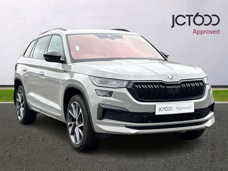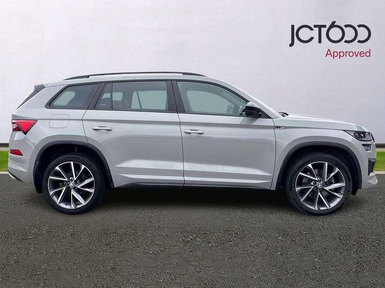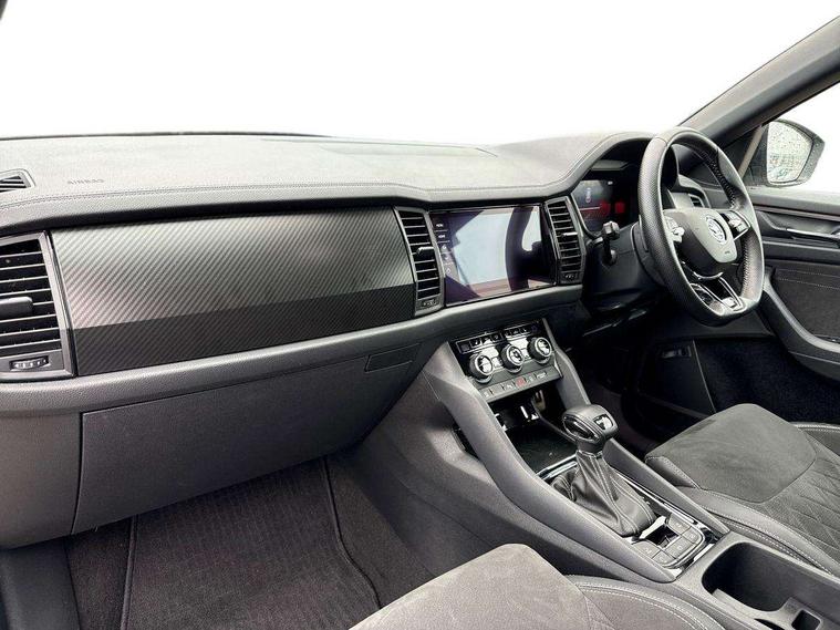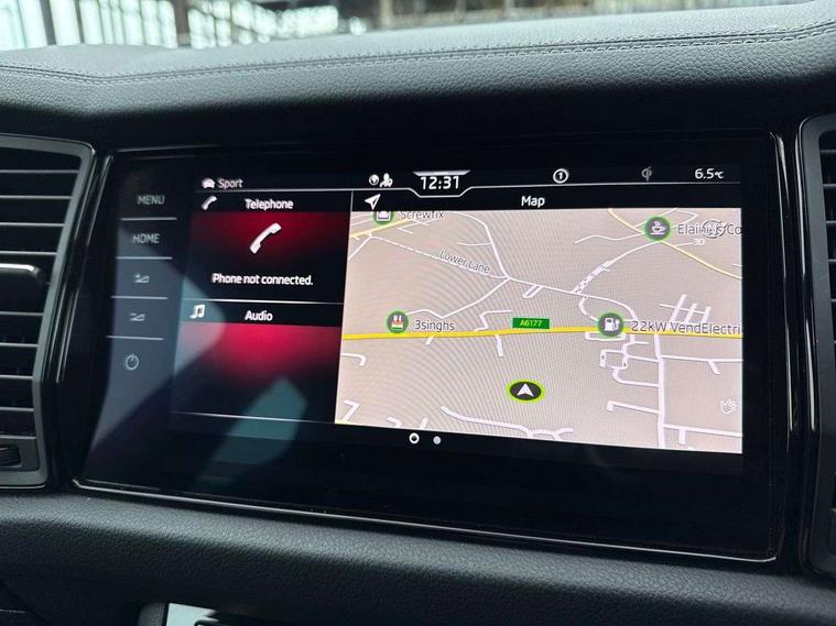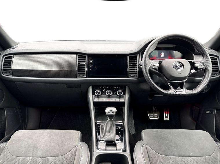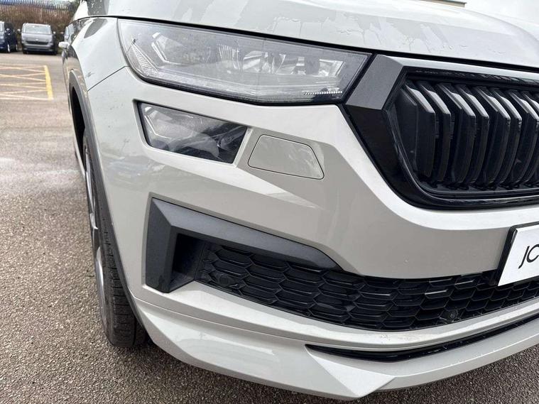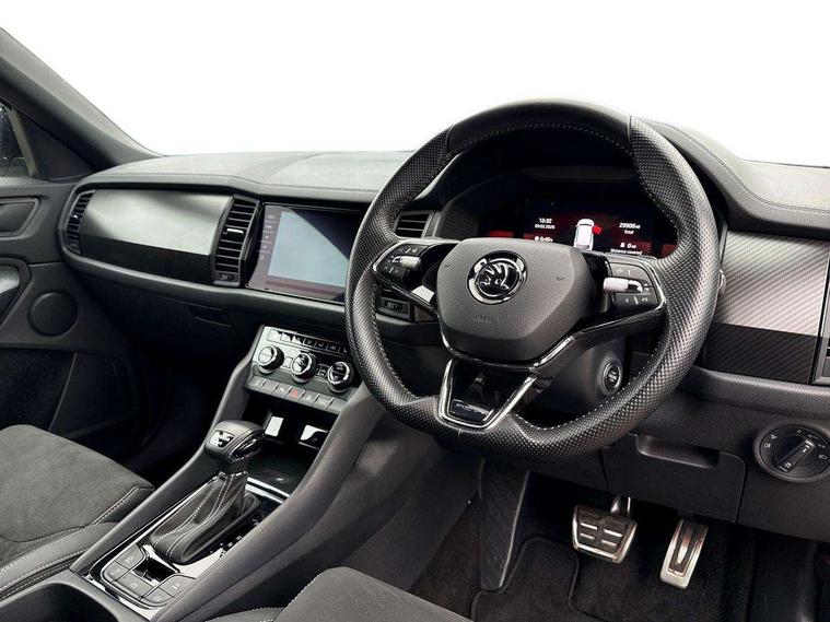 Bluetooth system, Columbus satellite navigation with 9.2" touchscreen, integrated Wi-Fi, web radio, Digital voice enhancement, E-call, ECO Stop/start function, Exterior temperature indicator, Progressive steering, Rear view camera, Smartlink wireless for apple carplay and wired for android auto, Speed limiter, Tailgate unlocking from outside, USB C Port x 2 in front centre console, Wireless charging, 8 Speakers, DAB Digital radio, Aero front windscreen wipers with intermittent function, Aero rear window wiper, Auto dimming rear view mirror, Black roof rails, Black sports styling including front grille and window surrounds, Black wheel arch surrounds, Body colour bumpers, Body colour door handles, Electric adjustable/heated/folding door mirrors, driver side auto dimming with boarding sports and memory function, Electric front and rear windows, Extended rear spoiler with finlets in gloss black, Front fog lights, Full LED matrix headlights with AFS (adaptive front light system), cornering function and AWL (all weather lighting system), Gloss black door mirrors, Headlight washers, Heated rear window, Invisible tailpipe, LED daytime running lights, LED rear fog light, LED third brake light in rear spoiler, Light assistant (coming/leaving home/tunnel light), Off-road style lower front bumper element, Privacy glass, Rain and light sensors, Rear diffuser, Rear LED lights (high functionality) with welcome effect and dynamic indicators, Rear side wing doors, Safety reflectors on front and rear doors, Sportline badge on front fender, Sports front and rear bumpers including lower rear chrome strip, Tailgate lettering in Black, Window control switches with black trim, Without engine designation, 12V socket in boot, 2 rails with 2 hooks, 2 seat bench in 3rd row, 3 seat bench in 2nd row, 4 foldable roof handles with rear coat hooks, 60:40 foldable rear seat with sliding adjustment and backrest angle adjustment, Aluminium pedals, Black roof headlining, Bottle holders in door panel in the 1.5 litre front and 1 litre rear, Cargo storage compartments, Chrome headlight control button, Chrome interior door handles, Coat hooks on B pillar, Covered storage compartment on driver side, Front centre armrest with storage compartment, cup holder and 12V socket, Front courtesy lights, Gear shift lever with chrome frame and black gloss insert, Grey stitching in front and rear armrests and door armrests + door inserts, Height adjustable front headrests, Illuminated and cooled glovebox, Illuminated luggage compartment, Isofix child seat fittings in outer rear seats with top tether, Manually adjustable steering column, Microsuede door panels, Net programme in boot (1x horizontal Net, 2x vertical Nets), Overhead glasses storage compartment, Pollen filter, Rear centre armrest with cupholders, Single front passenger seat, Sliding trunk cover, Small Bags on the inner sides of the front backrests, Sports seats, Sunvisors with illuminated vanity mirrors, Three rear height adjustable headrests, Ticket holder on A Pillar, Umbrella in door panel, Variable boot floor, LED Interior light pack - Kodiaq, Auto door release and activation of warning lights in the event of an accident, Child locks on rear doors, Driver and front passenger airbag with knee airbag and front passenger airbag deactivation, Electronic parking brake with hill start assist, Emergency rear braking signal, ESC (incl. ABS+MSR+ASR+EDS+HBA+DSR+RBS+MKB), Front assist with autonomous emergency braking, Front side airbags with curtain airbags, Fuel cut off safety device, Height adjustable front 3 point seatbelts + pretensioners, Hill hold control, Rear disc brakes, Safety vest holder in door, Seat belt reminder for all seats, Three point rear seat belts, Two tone horn, Tyre pressure monitor, Alarm with interior monitoring and tilt sensor with safe function, Anti-theft wheel bolts, Immobiliser, Keyless entry and start system (KESSY), Remote central locking with 2 keys, Black air vent surround, Carbon finish dashboard and door inserts, Grey stitching in dashboard, 20" Vega Anthracite alloy wheels, Temporary spare wheel (space saver),